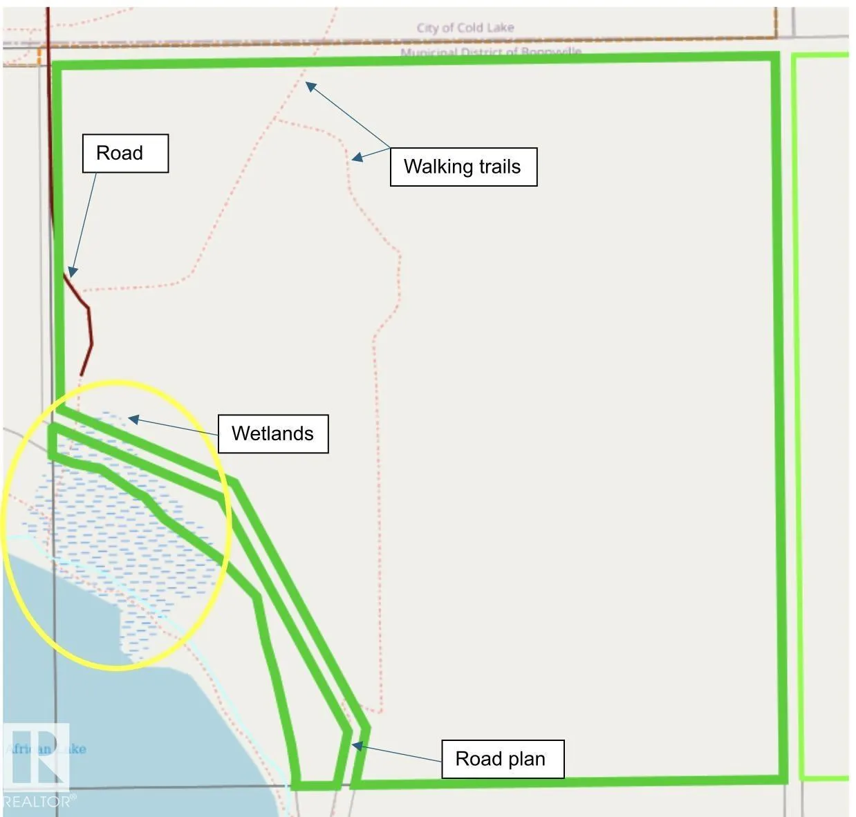 This rare piece of property bordering the African Lake between the North and South Cold Lake. Just outside Cold Lake City limits and a sought after recreation/walking space for residents all year long. 137 acres of predominantly farmland with the option to make this something spectacular! There is a road allowance to the north and east sides of the property and a road plan on the southwest and west side of the property. FYI: There is no drivable access to the property. (id:27476)