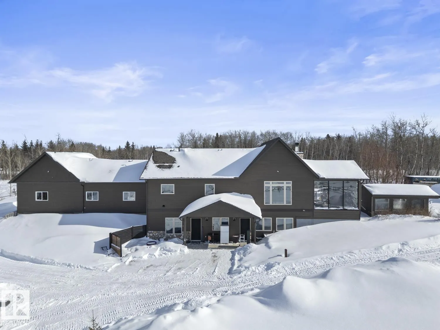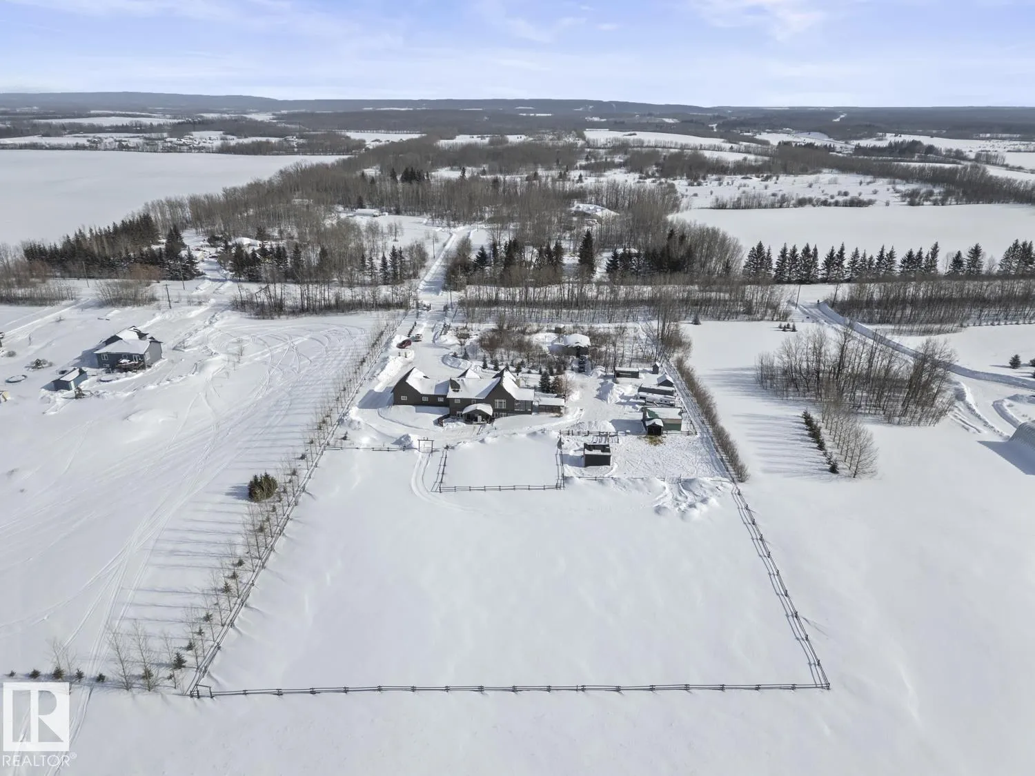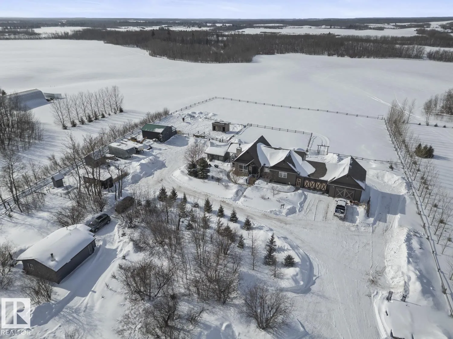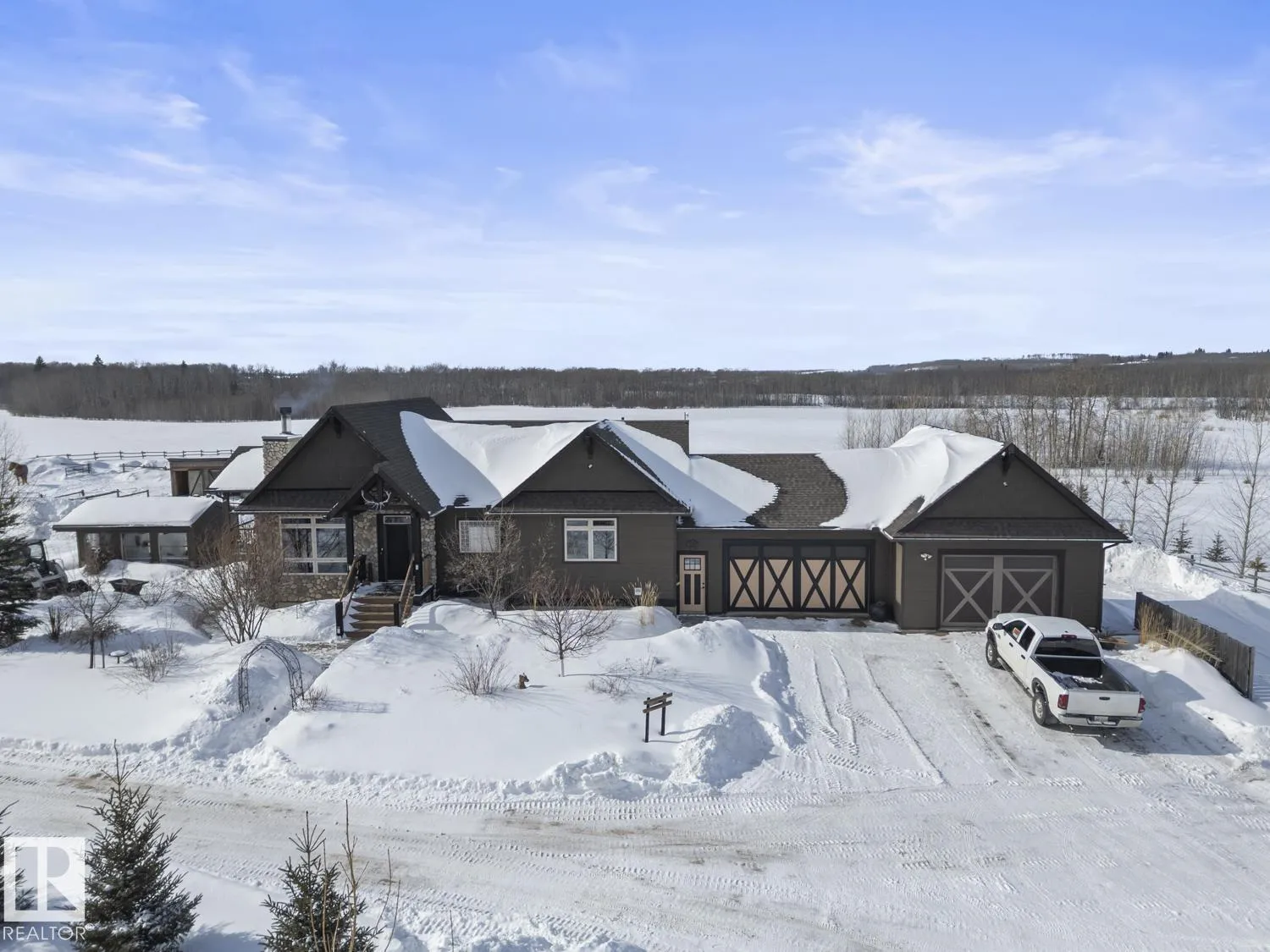 Ranch style Executive home located minutes from Cold Lake. Pride of ownership is evident in the build and care of this upgraded bungalow. Main floor features 16' vaulted ceiling with exposed beams in living room & a natural wood burning fireplace, river rock wall, custom mantle & engineered hardwood. Dining room has access to covered patio, which overlooks pond, firepit, greenhouse & low maintenance gardens & out buildings. All hard surface designer flooring. Custom kitchen has two-toned cabinetry with granite countertops, large island, backsplash & farm sink. Primary suite on main level has spa-inspired ensuite with walk-in closet. Fully finished walkout basement has inslab heat & features electric fireplace with rock accent, 2 bedrooms, An inlaw suite and 2 - 4pc bathrooms. The exterior features triple heated garage, Hardie Board siding & rock accents. Barn, cabin & a paddock with shelter for horses. The property is fenced, cross fenced & custom gated - a peaceful retreat and defn One of A Kind. (id:27476)