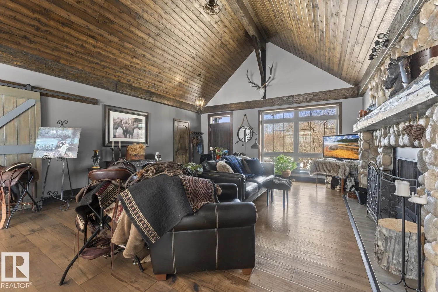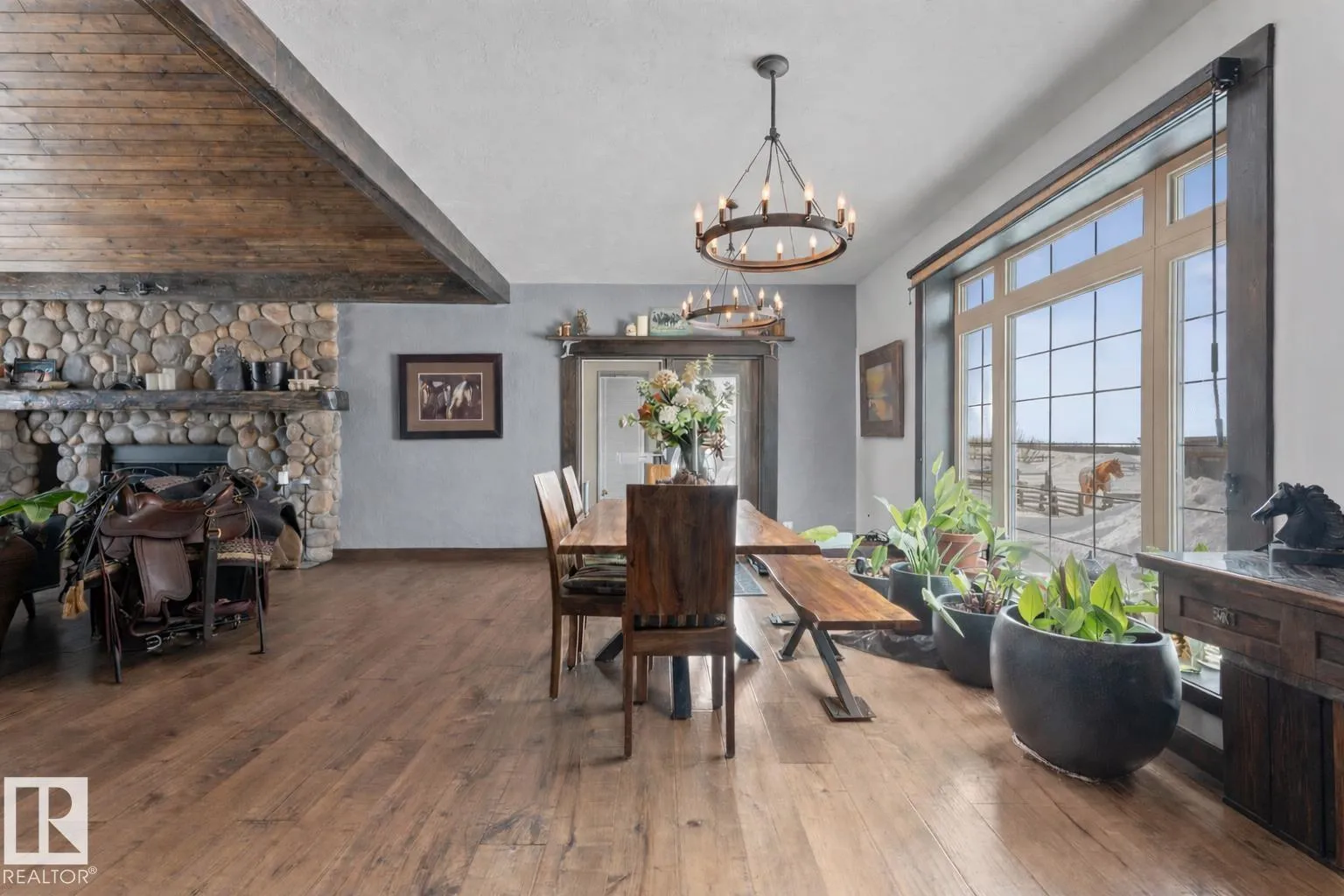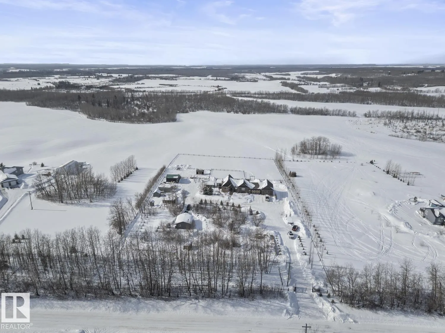 Ranch style Executive home located minutes from Cold Lake. Pride of ownership is evident in the build and care of this upgraded bungalow. Main floor features 16' vaulted ceiling with exposed beams in living room & a natural wood burning fireplace, river rock wall, custom mantle & engineered hardwood. Dining room has access to covered patio, which overlooks pond, firepit, greenhouse & low maintenance gardens & out buildings. All hard surface designer flooring. Custom kitchen has two-toned cabinetry with granite countertops, large island, backsplash & farm sink. Primary suite on main level has spa-inspired ensuite with walk-in closet. Fully finished walkout basement has inslab heat & features electric fireplace with rock accent, 2 bedrooms, An inlaw suite and 2 - 4pc bathrooms. The exterior features triple heated garage, Hardie Board siding & rock accents. Barn, cabin & a paddock with shelter for horses. The property is fenced, cross fenced & custom gated - a peaceful retreat and defn One of A Kind. (id:27476)