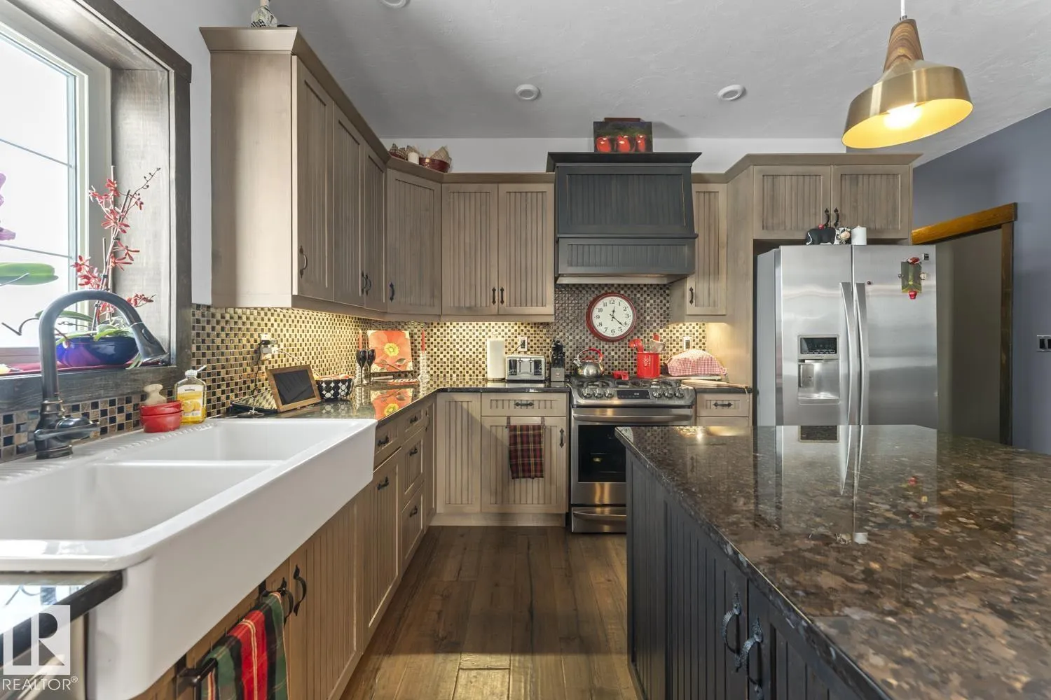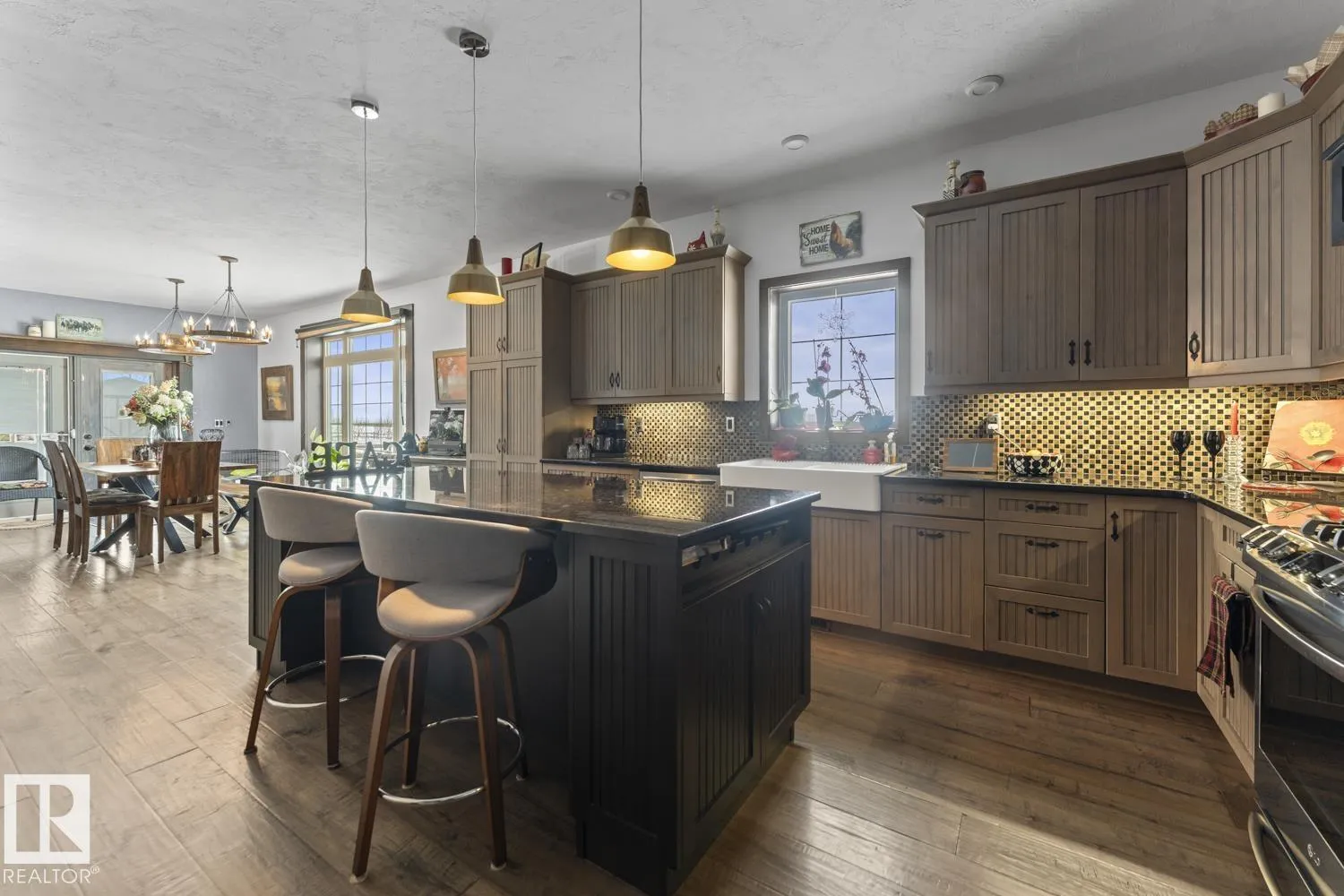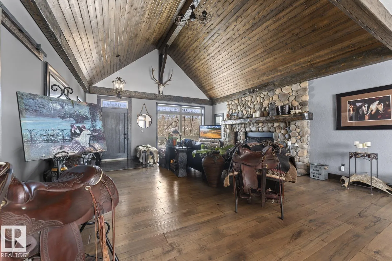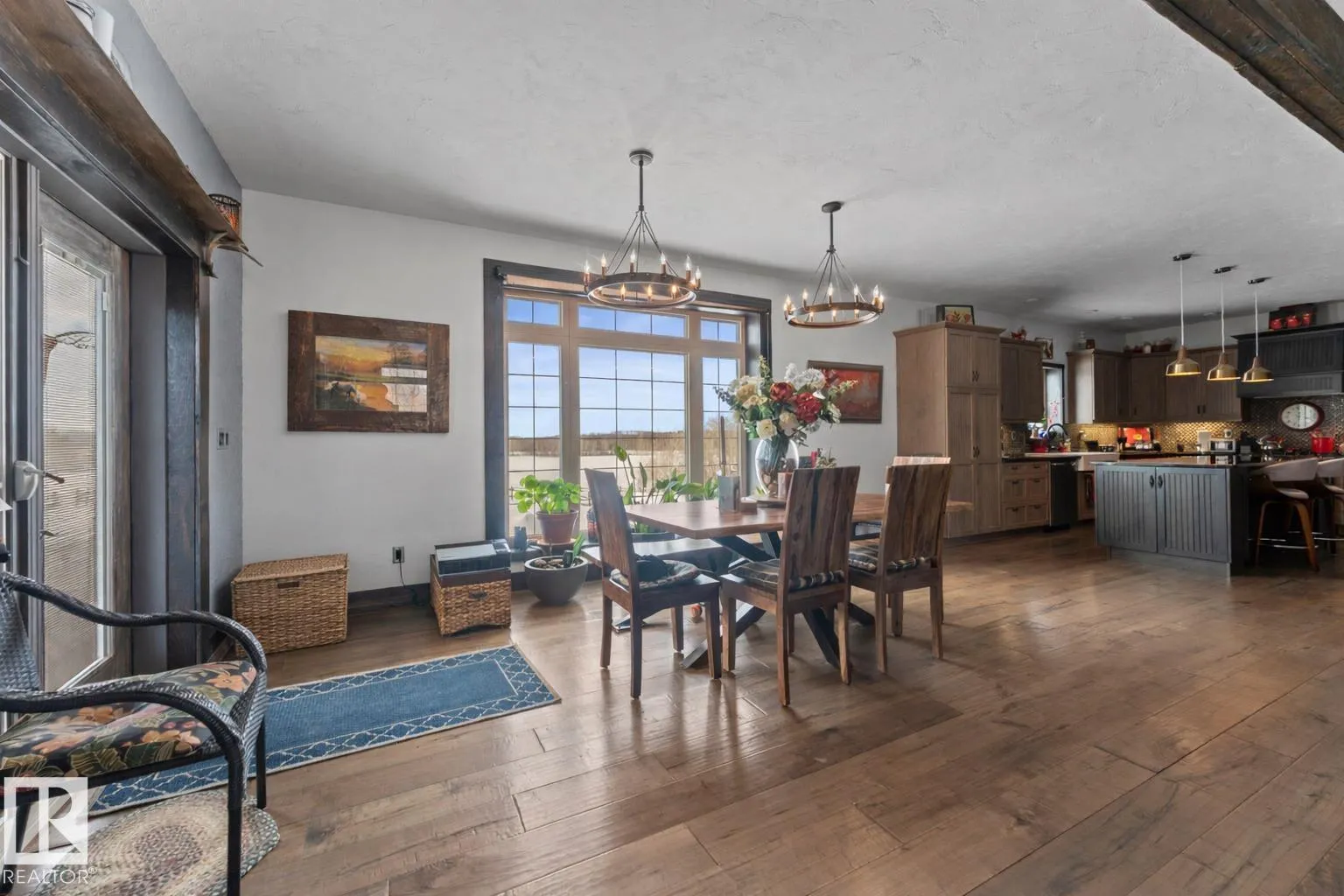 Ranch style Executive home located minutes from Cold Lake. Pride of ownership is evident in the build and care of this upgraded bungalow. Main floor features 16' vaulted ceiling with exposed beams in living room & a natural wood burning fireplace, river rock wall, custom mantle & engineered hardwood. Dining room has access to covered patio, which overlooks pond, firepit, greenhouse & low maintenance gardens & out buildings. All hard surface designer flooring. Custom kitchen has two-toned cabinetry with granite countertops, large island, backsplash & farm sink. Primary suite on main level has spa-inspired ensuite with walk-in closet. Fully finished walkout basement has inslab heat & features electric fireplace with rock accent, 2 bedrooms, An inlaw suite and 2 - 4pc bathrooms. The exterior features triple heated garage, Hardie Board siding & rock accents. Barn, cabin & a paddock with shelter for horses. The property is fenced, cross fenced & custom gated - a peaceful retreat and defn One of A Kind. (id:27476)