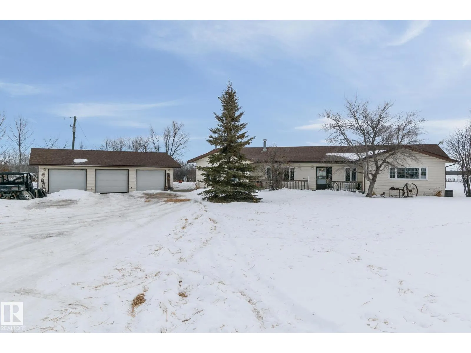 Welcome to this well-maintained 2100 sq ft ranch-style bungalow set on a beautiful 66-acre parcel less than 5 minutes from town on paved roadsâoffering the perfect balance of rural living and convenience. This spacious home features 4 bedrooms and 1.5 bathrooms, providing plenty of room for family living. The functional layout includes a bright kitchen with ample cabinetry and a breakfast bar, flowing into a generous dining and living area with warm wood flooring and a cozy fireplaceâideal for entertaining or relaxing evenings at home. Central air conditioning ensures comfort through the summer months. Outside, the property is perfectly suited for hobby farming or livestock with open land and a livestock waterer already in place. A triple detached garage provides abundant space for vehicles, equipment, or workshop needs. Enjoy wide-open views, privacy, and room to grow while still being just minutes from town amenities. For those looking to expand their land base, an additional 69 acres is also available. (id:27476)