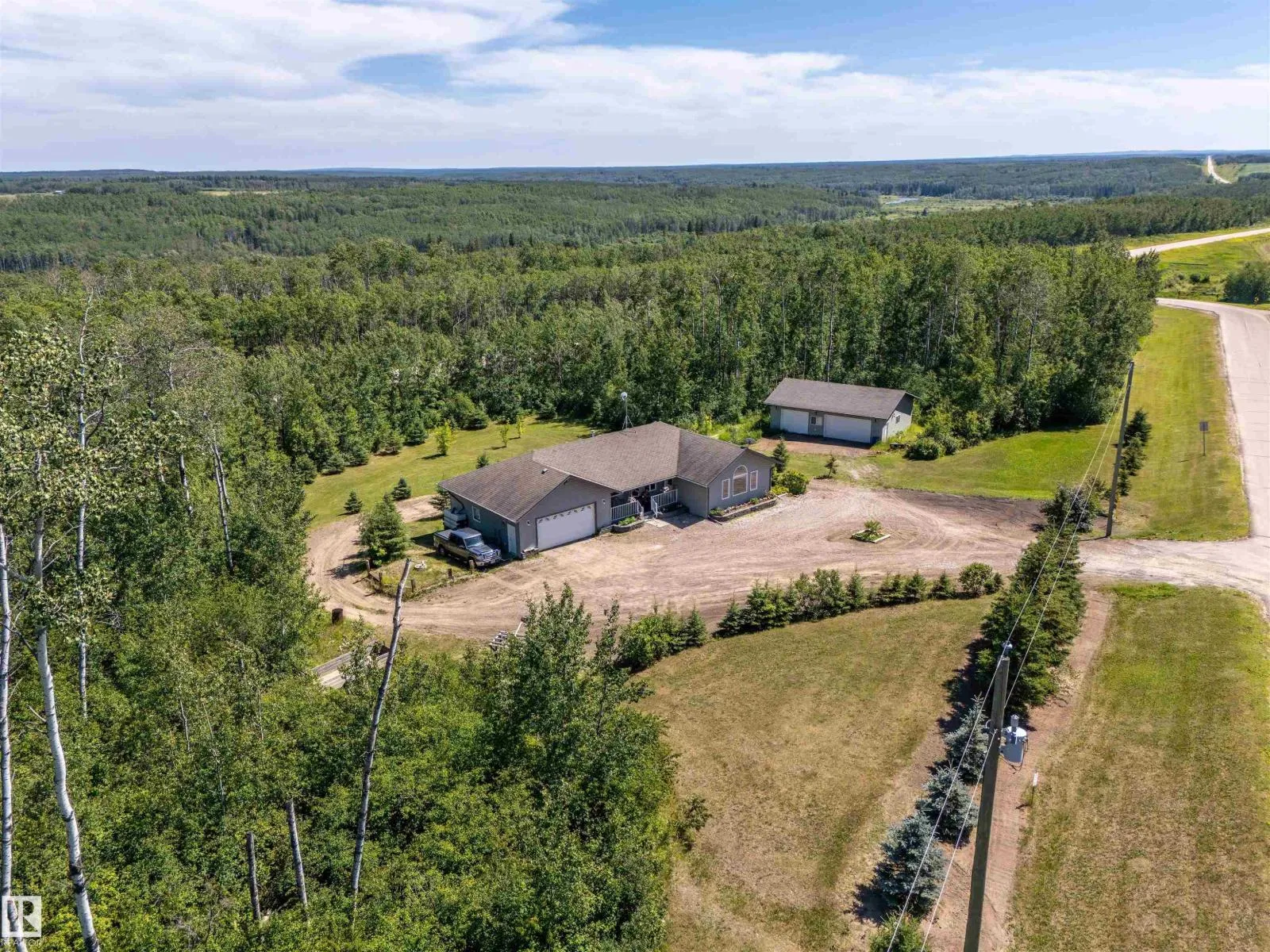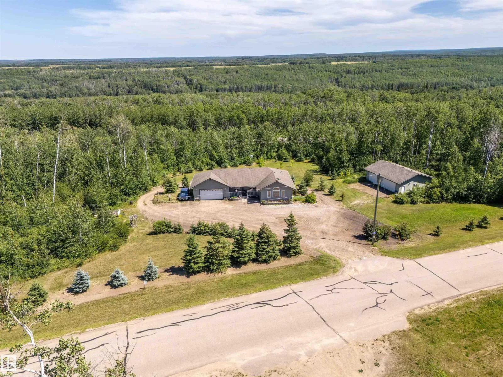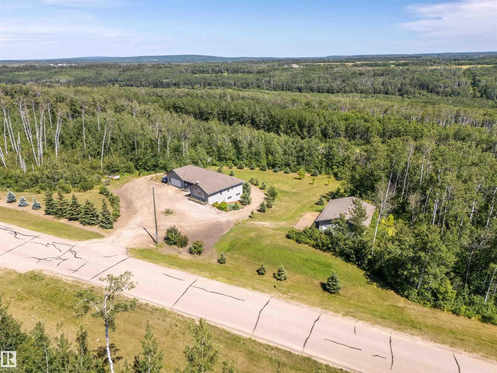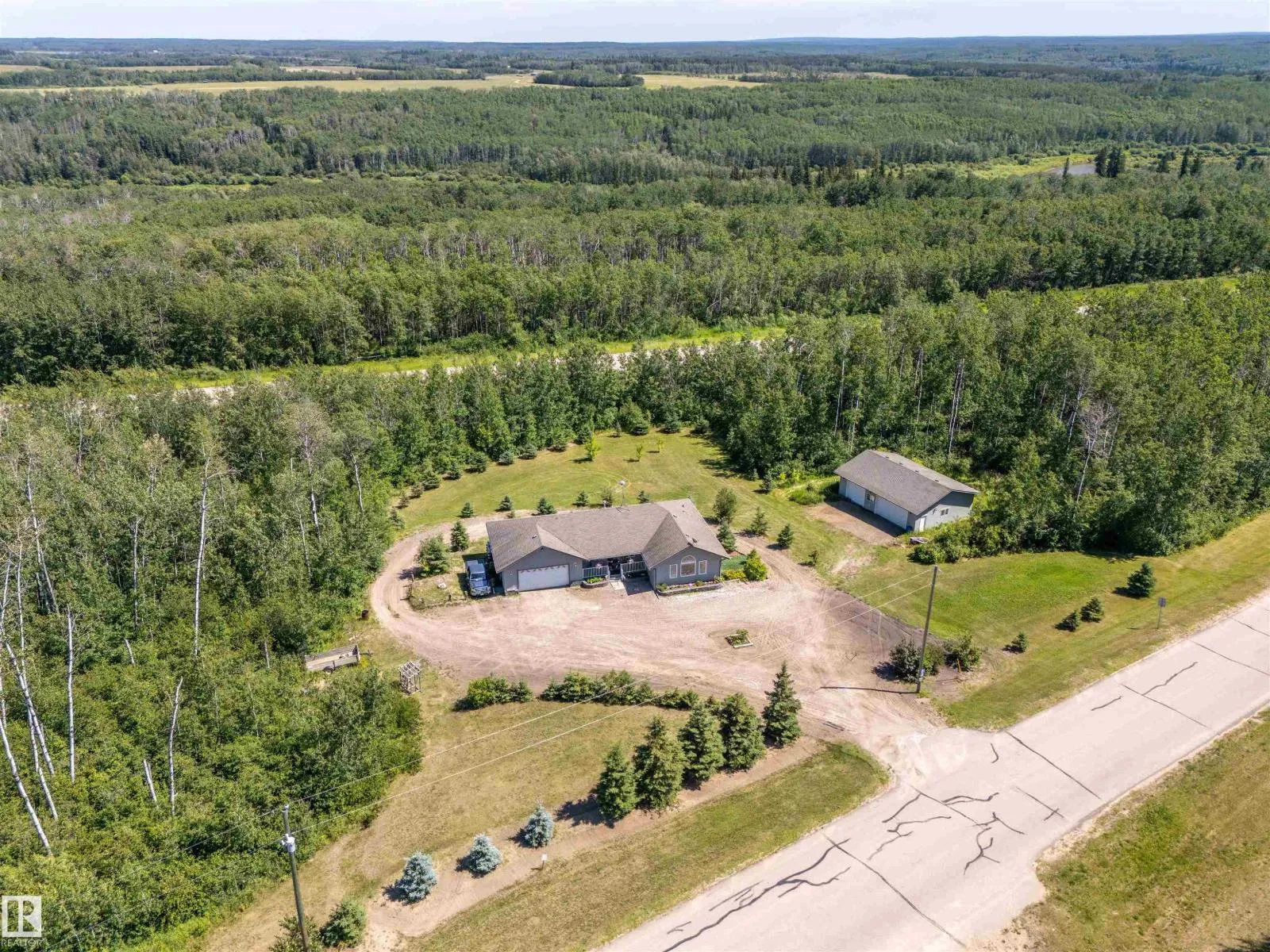A custom-built original owner home, ideally located on 3.6 acres just a 10-minute drive from Cold Lake. As you enter, you have inviting hardwood floors that flow through the main level. The spacious living room features vaulted ceilings while seamlessly connecting to the open-concept dining and kitchen area. The kitchen showcases hickory cabinets and eat up area. The main floor provides practical living with three comfortable bedrooms, including a primary suite with a 4-piece ensuite, plus a second 4-piece bathroom. The walkout basement is a bright and welcoming space, offering a second kitchen, an additional bedroom, a dedicated office, a 3-piece bathroom, and a laundry area. There's in-floor heating throughout the basement, along with central air conditioning and efficient double-pane windows for the entire home. There's also an attached heated two-car garage, complemented by a detached triple-car garage (power but no heat) (id:27476)