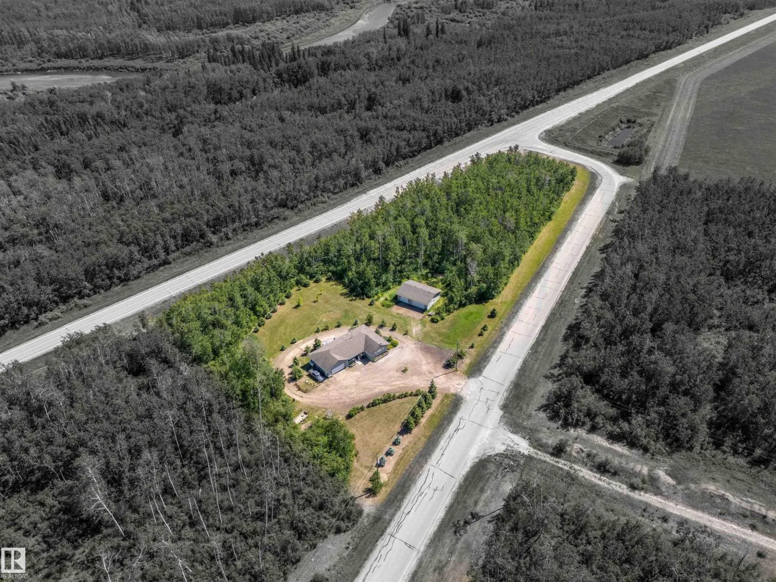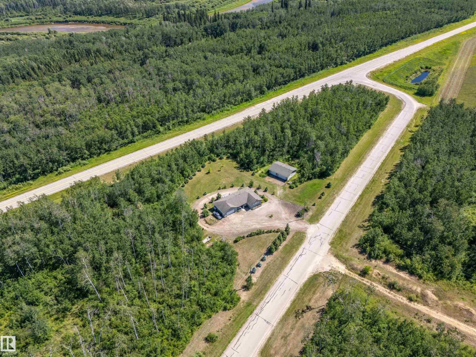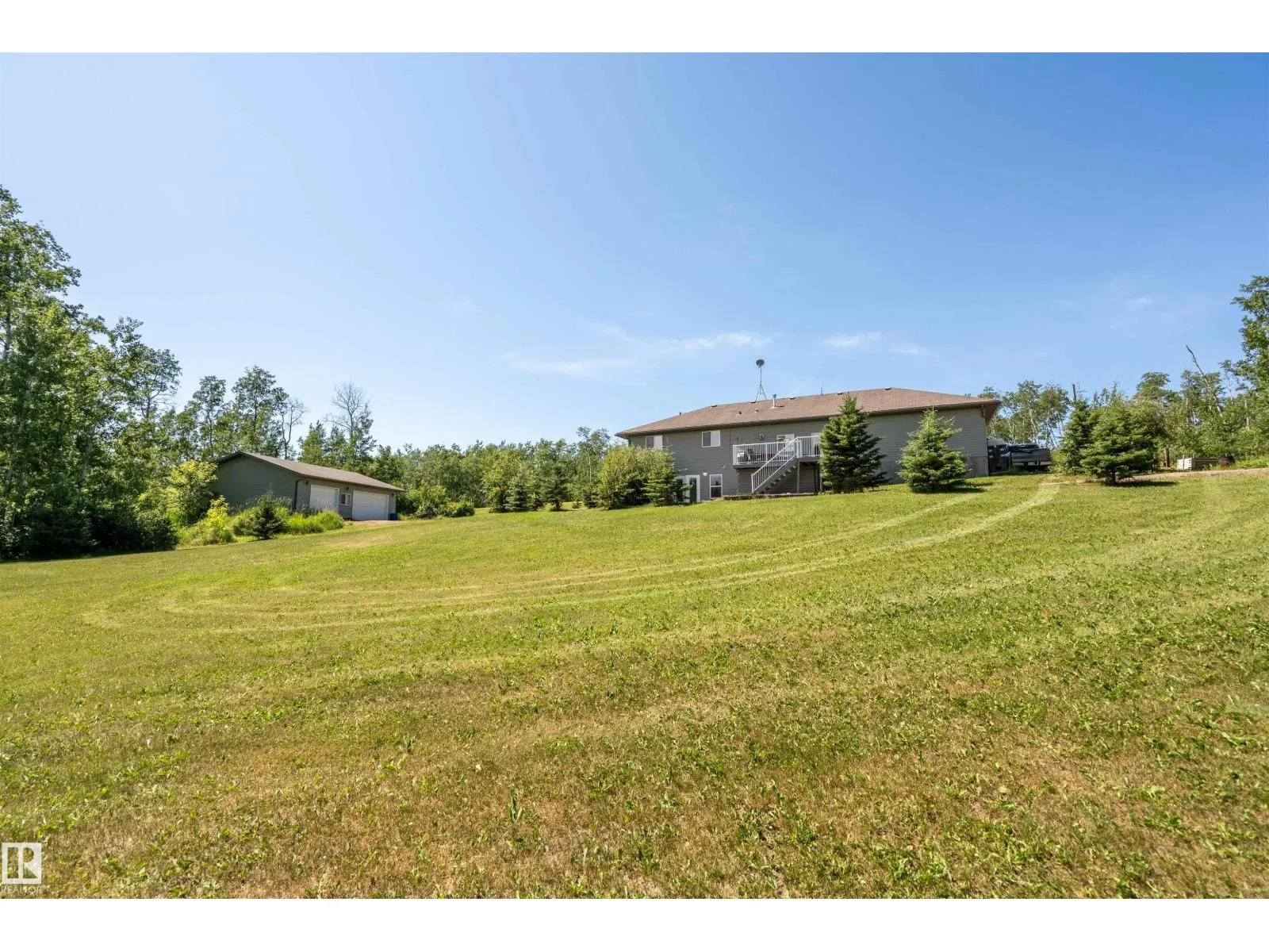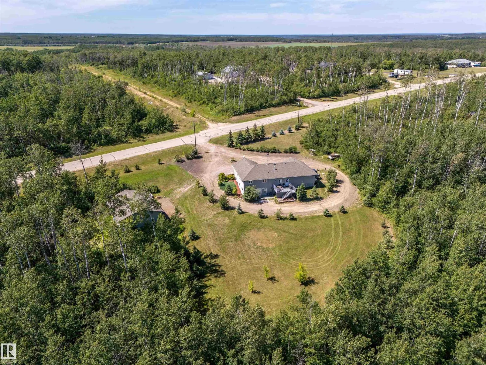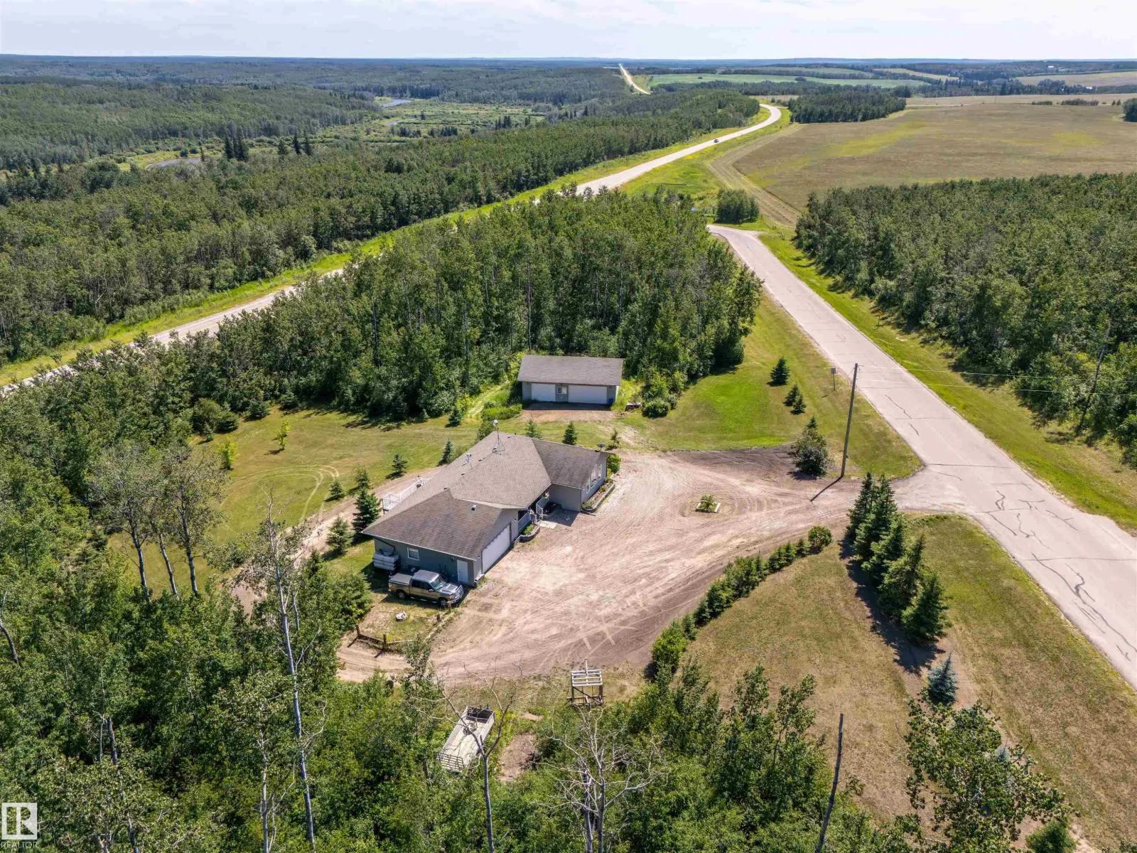 A custom-built original owner home, ideally located on 3.6 acres just a 10-minute drive from Cold Lake. As you enter, you have inviting hardwood floors that flow through the main level. The spacious living room features vaulted ceilings while seamlessly connecting to the open-concept dining and kitchen area. The kitchen showcases hickory cabinets and eat up area. The main floor provides practical living with three comfortable bedrooms, including a primary suite with a 4-piece ensuite, plus a second 4-piece bathroom. The walkout basement is a bright and welcoming space, offering a second kitchen, an additional bedroom, a dedicated office, a 3-piece bathroom, and a laundry area. There's in-floor heating throughout the basement, along with central air conditioning and efficient double-pane windows for the entire home. There's also an attached heated two-car garage, complemented by a detached triple-car garage (power but no heat) (id:27476)