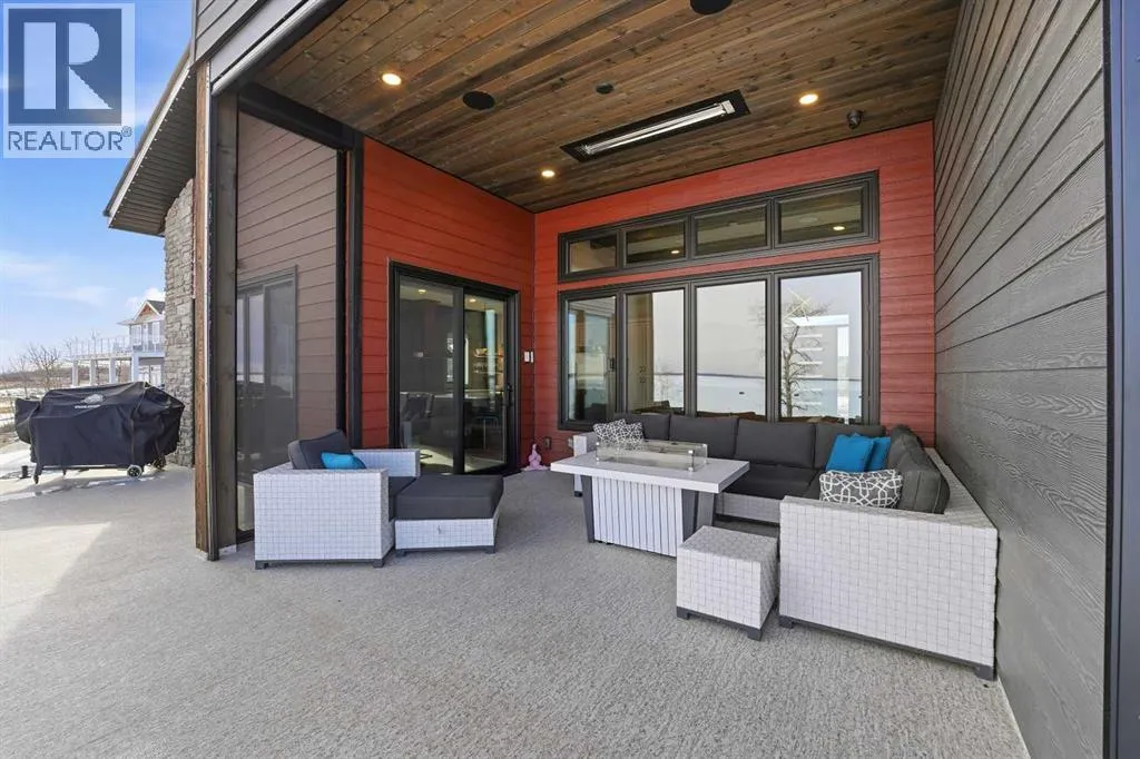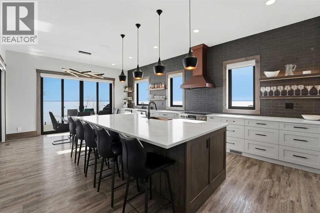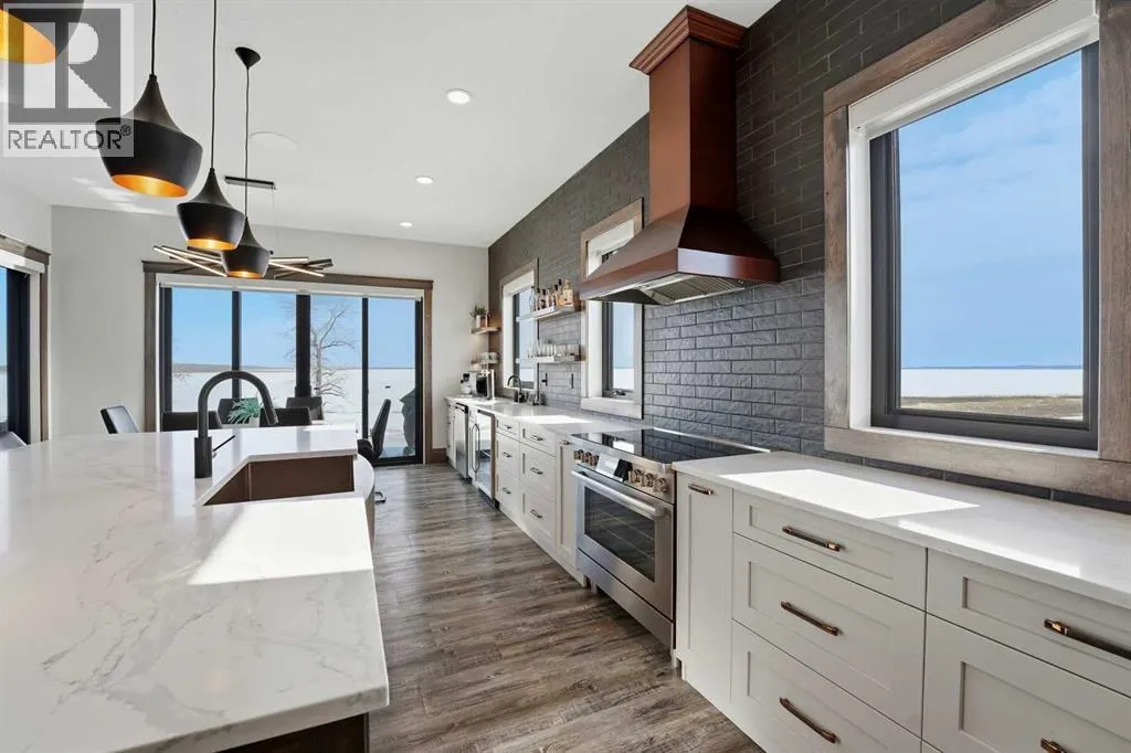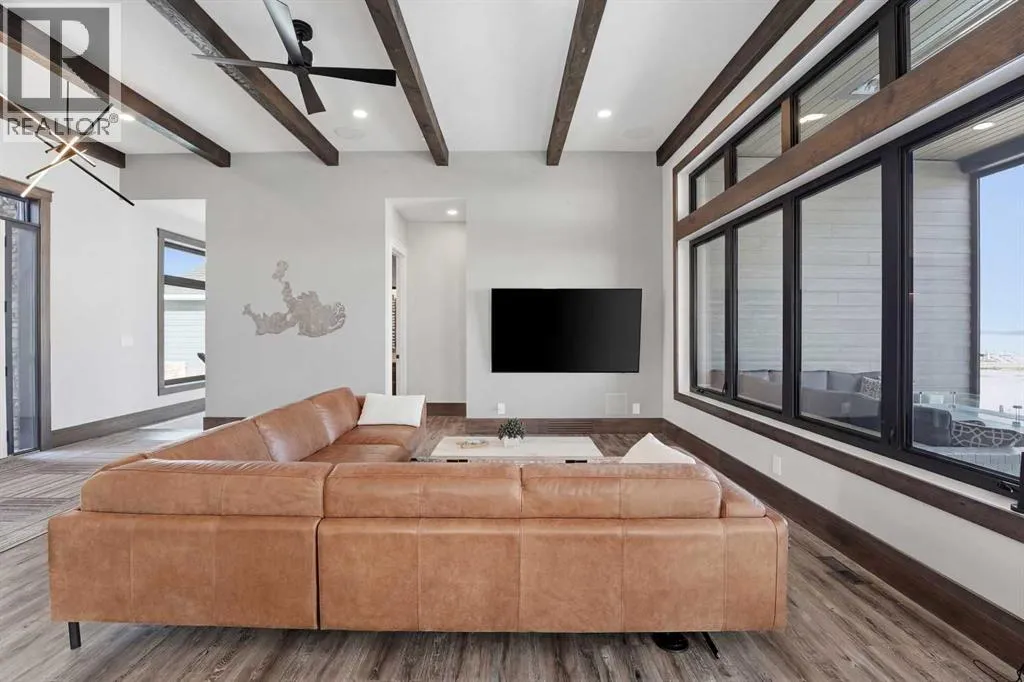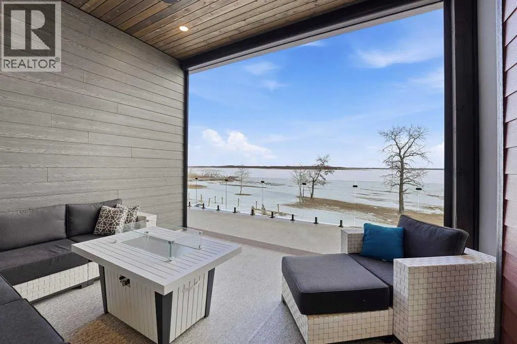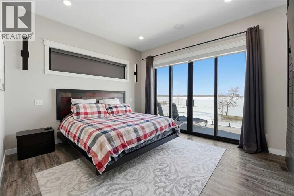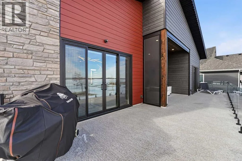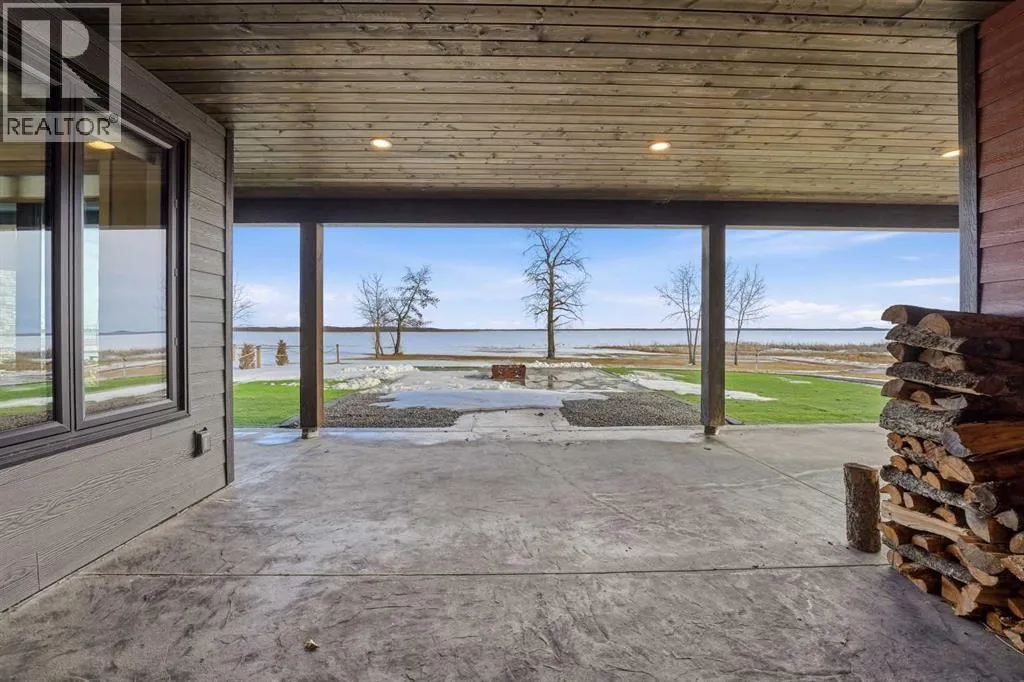 Be prepared to be impressed by this luxury lakefront home in Pelican View Estates offering nearly 3,400 sq ft of finished living space! From the moment you arrive, the curb appeal stands out with composite siding, stone accents, and an oversized stamped concrete driveway, along with additional paved parking beside the garage ideal for an RV or guests. Inside, the main living area features 10â ceilings, luxury vinyl plank flooring, upgraded thick hickory trim, and expansive lake views through the large triple-pane windows. The kitchen is a true showpiece with white cabinetry, expansive quartz countertops, and an upgraded stainless steel appliance package including a 36â induction cooktop, side-by-side fridge/freezer, beverage fridge, and a kegerator that can also be used for carbonated drinks, while the oversized island adds even more space with a huge quartz counter and stylish hickory cabinetry. The dining area is surrounded by windows with lake views, and the living room showcases a striking 12â ceiling with fir finished beams. Just off the entrance is a mudroom with hickory lockers and garage access. The primary bedroom offers lake views through the sliding doors to the deck, and a feature shiplap wall with an electric fireplace, along with an ensuite featuring dual sinks, a custom tiled steam shower, and access to a spacious walk-in closet. A 2-piece bathroom completes the main level. The walkout basement opens to a large family and games area with a wood stove and access to the outside stamped concrete patio. There is also two bedrooms, an office with included Murphy bed (or can be a third bedroom if desired), a 4-piece bathroom, laundry room, a cold storage room, and a dedicated home theatre with an included projector and screen. The theatre room also features a vault-style metal door, allowing the area to double as secure storage or a safe room, plus an additional 4-piece bathroom and storage room. The attached garage is heated, finished with Trusscore panels which are waterproof, includes hot and cold water taps, 8â overhead doors, and measures over 36â wide by 28â deep. The outdoor living is exceptional with a full-width deck accessible from the dining area and primary bedroom, finished with Duradek, frameless glass railing, a covered section with a built-in heater and a powered screen to enclose it, while below the deck is a stamped concrete walkout patio extending to a fire pit area and a low-maintenance artificial turf yard. Both the upper covered deck and lower patio feature tongue-and-groove pine ceilings. The home also includes permanent perimeter lighting. Another standout feature is the $80,000 Control4 system offering remote control of lighting, blinds, security cameras, HVAC and more. Pelican View Estates provides community trails, a shared dock with the option to own a boat slip (negotiable on this sale, with slips valued around $7,500), and raking of the beach making it one of the nicest beaches in central Alberta just steps from your back door! (id:27476)