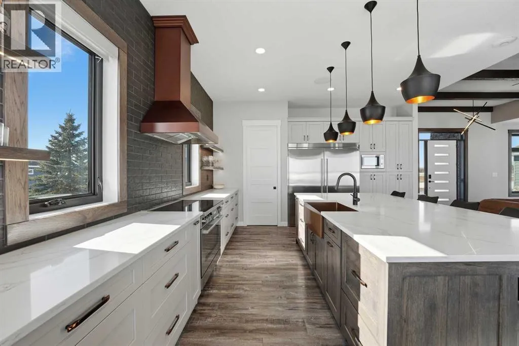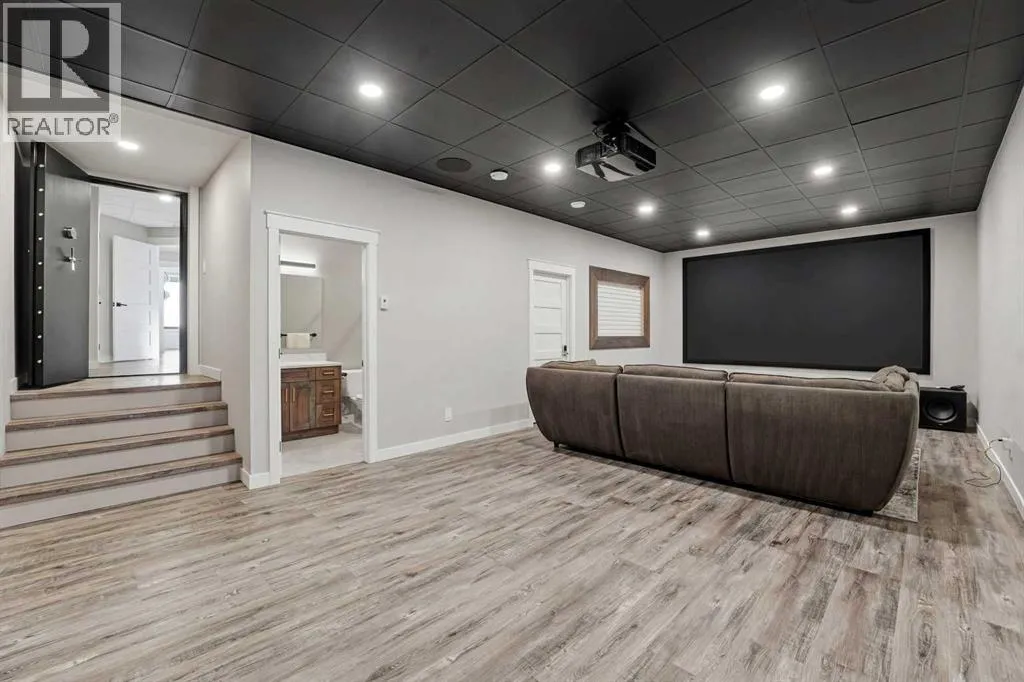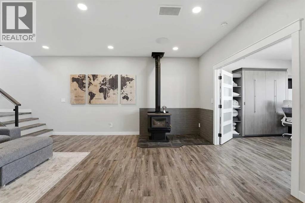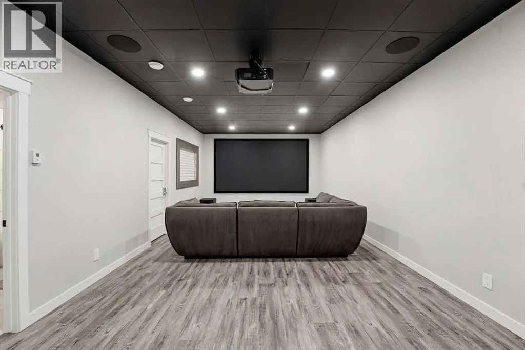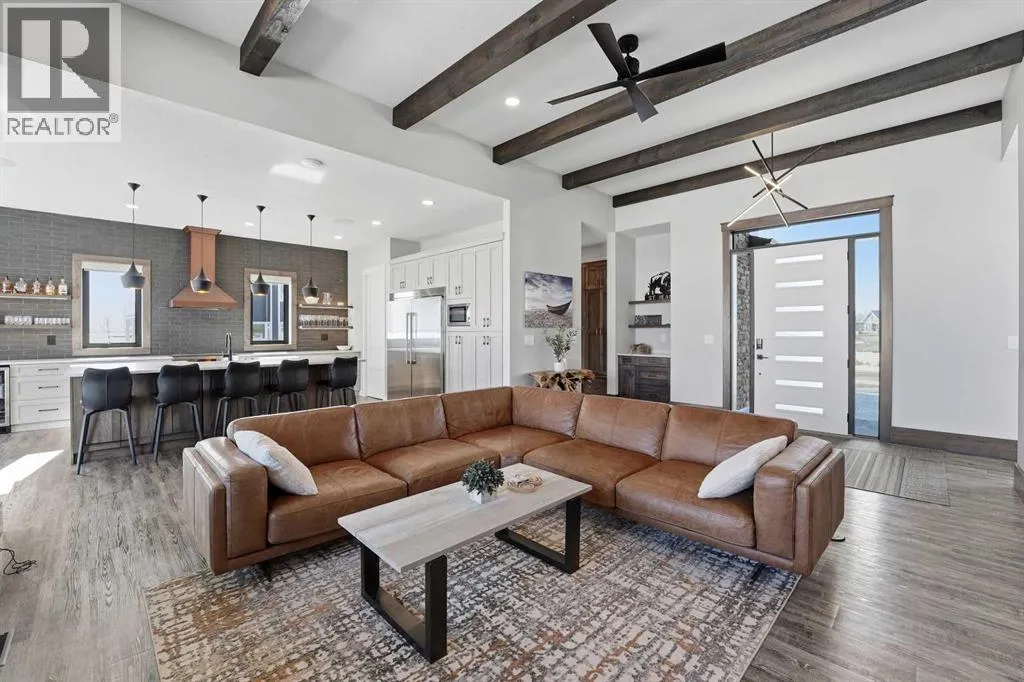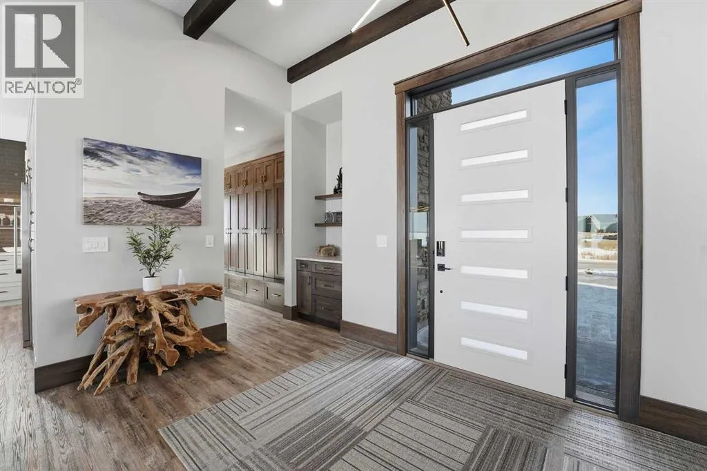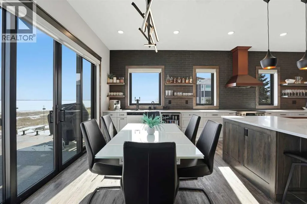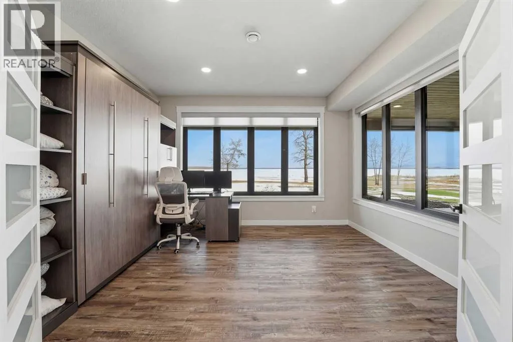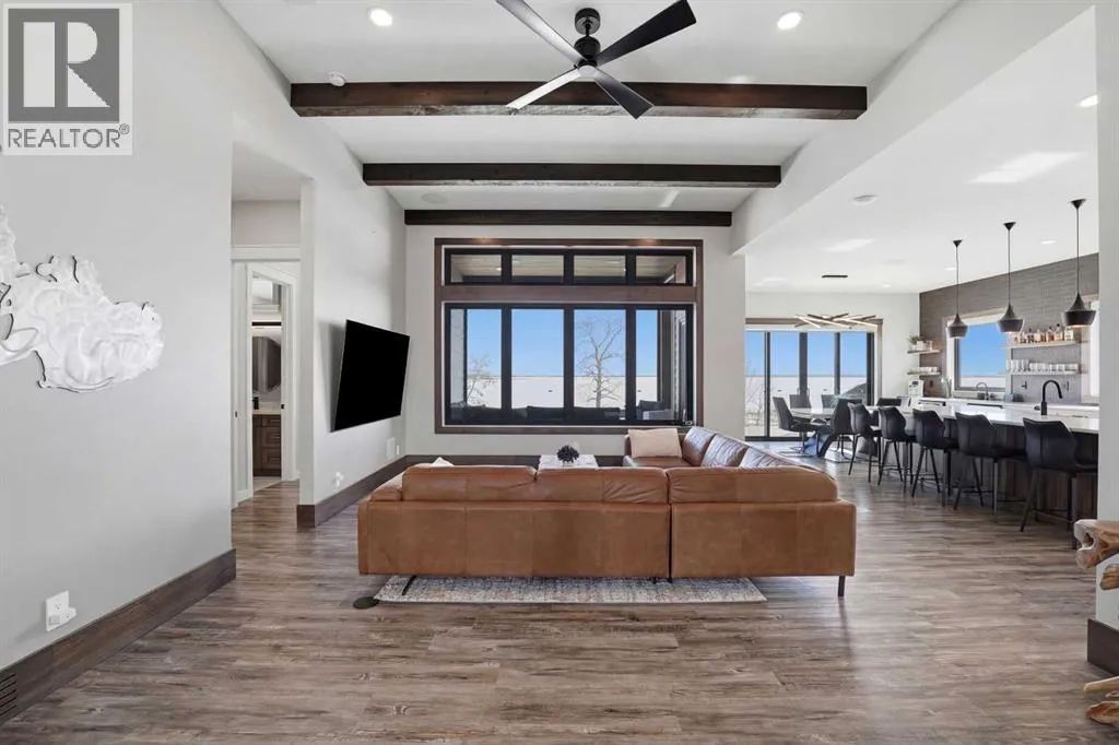 Be prepared to be impressed by this luxury lakefront home in Pelican View Estates offering nearly 3,400 sq ft of finished living space! From the moment you arrive, the curb appeal stands out with composite siding, stone accents, and an oversized stamped concrete driveway, along with additional paved parking beside the garage ideal for an RV or guests. Inside, the main living area features 10â ceilings, luxury vinyl plank flooring, upgraded thick hickory trim, and expansive lake views through the large triple-pane windows. The kitchen is a true showpiece with white cabinetry, expansive quartz countertops, and an upgraded stainless steel appliance package including a 36â induction cooktop, side-by-side fridge/freezer, beverage fridge, and a kegerator that can also be used for carbonated drinks, while the oversized island adds even more space with a huge quartz counter and stylish hickory cabinetry. The dining area is surrounded by windows with lake views, and the living room showcases a striking 12â ceiling with fir finished beams. Just off the entrance is a mudroom with hickory lockers and garage access. The primary bedroom offers lake views through the sliding doors to the deck, and a feature shiplap wall with an electric fireplace, along with an ensuite featuring dual sinks, a custom tiled steam shower, and access to a spacious walk-in closet. A 2-piece bathroom completes the main level. The walkout basement opens to a large family and games area with a wood stove and access to the outside stamped concrete patio. There is also two bedrooms, an office with included Murphy bed (or can be a third bedroom if desired), a 4-piece bathroom, laundry room, a cold storage room, and a dedicated home theatre with an included projector and screen. The theatre room also features a vault-style metal door, allowing the area to double as secure storage or a safe room, plus an additional 4-piece bathroom and storage room. The attached garage is heated, finished with Trusscore panels which are waterproof, includes hot and cold water taps, 8â overhead doors, and measures over 36â wide by 28â deep. The outdoor living is exceptional with a full-width deck accessible from the dining area and primary bedroom, finished with Duradek, frameless glass railing, a covered section with a built-in heater and a powered screen to enclose it, while below the deck is a stamped concrete walkout patio extending to a fire pit area and a low-maintenance artificial turf yard. Both the upper covered deck and lower patio feature tongue-and-groove pine ceilings. The home also includes permanent perimeter lighting. Another standout feature is the $80,000 Control4 system offering remote control of lighting, blinds, security cameras, HVAC and more. Pelican View Estates provides community trails, a shared dock with the option to own a boat slip (negotiable on this sale, with slips valued around $7,500), and raking of the beach making it one of the nicest beaches in central Alberta just steps from your back door! (id:27476)
