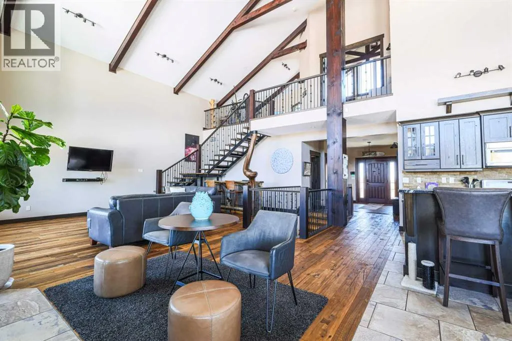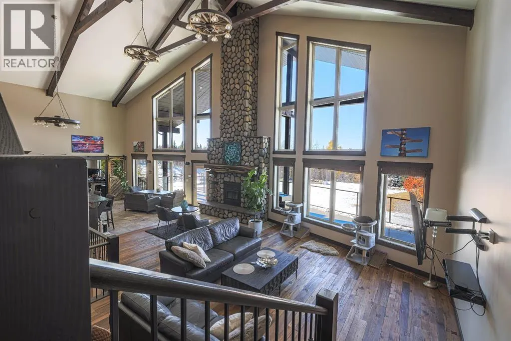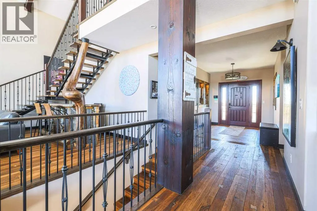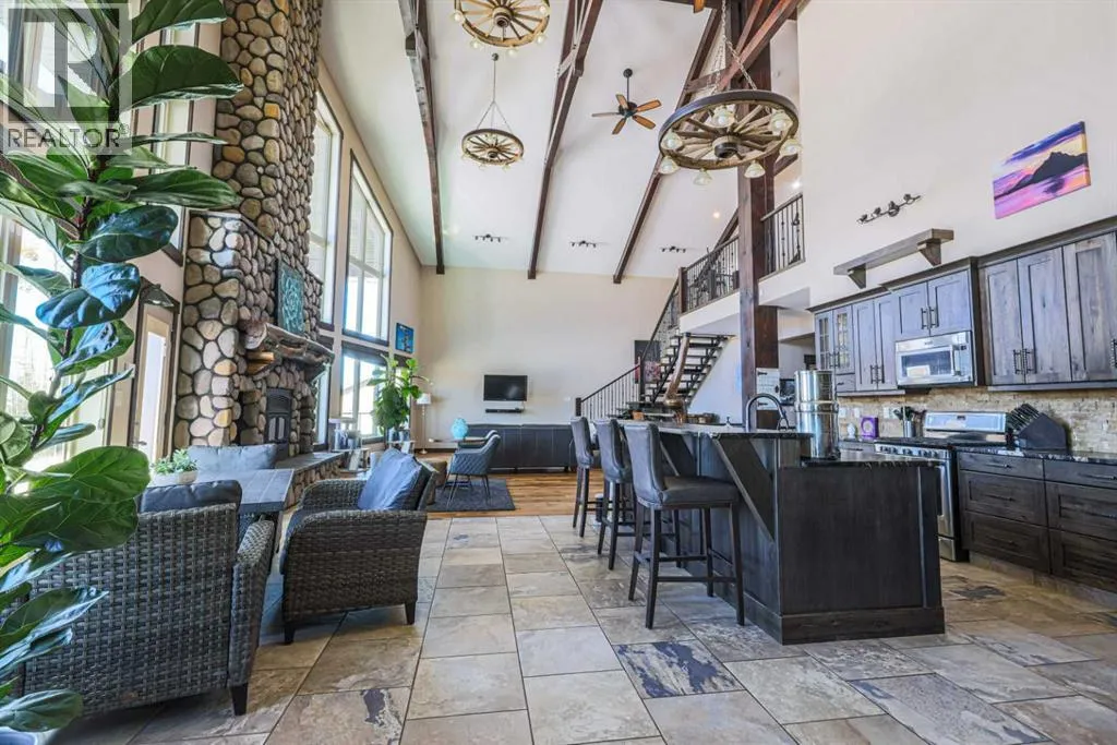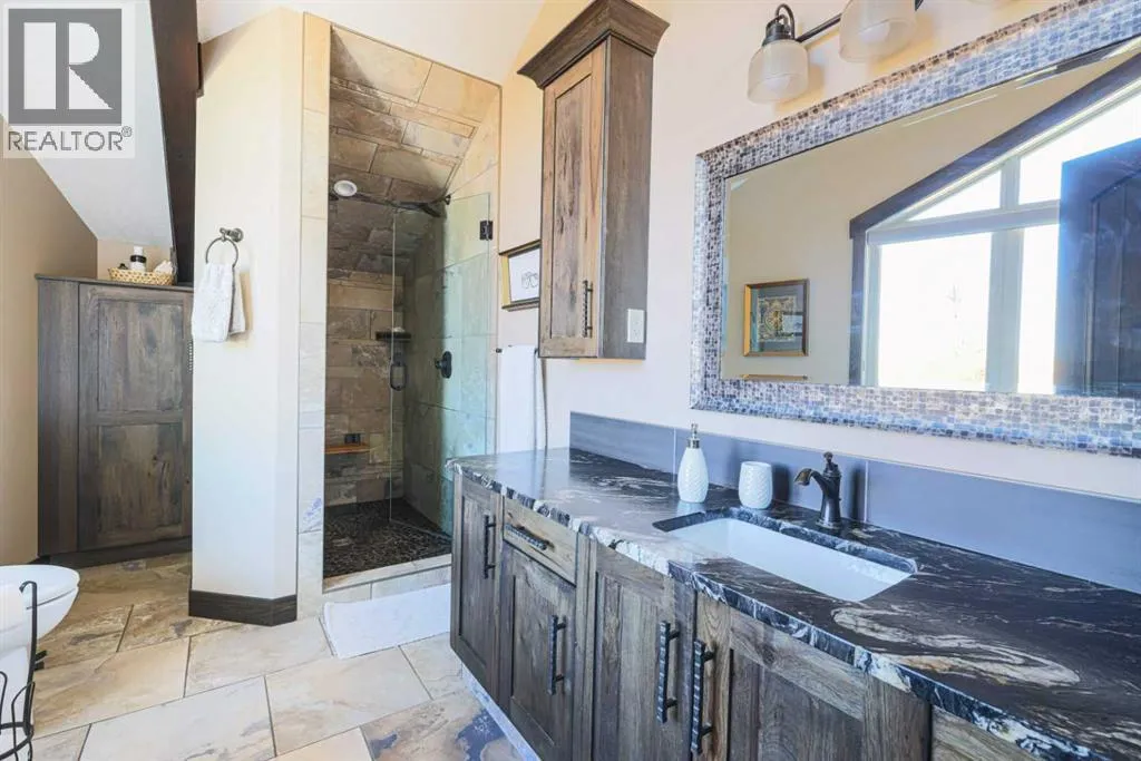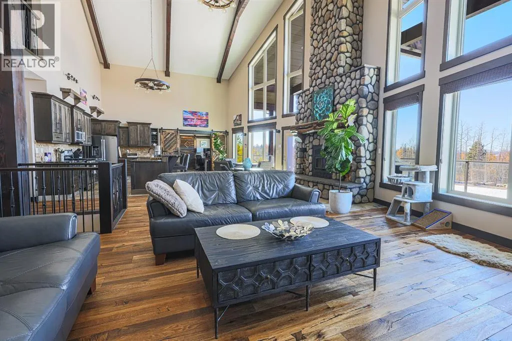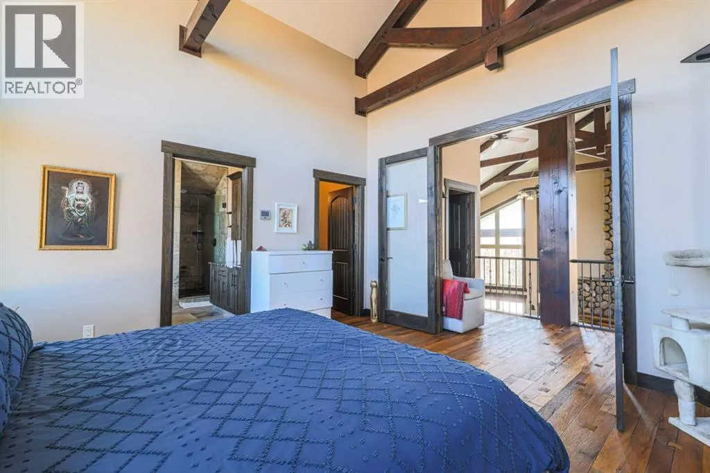 This custom built home offers acreage living at its finest. The moment you enter youâll see many unique features from the open floor plan, wooden beams and a floor to ceiling rustic stone fireplace that makes you feel warm, cozy and glad to be home. Natural light pours in from floor to ceiling windows where you can enjoy the sunsets in your living room or downstairs in the extra large hot tub. There's a self contained one bedroom legal suite with all appliances including washer and dryer and separate entry in the walk out basement. Quality abounds throughout this stylish home featuring leather granite counter tops, reclaimed hardwood and ceramic tiled flooring, interior walls insulated for sound barrier, in-floor heating, custom designed bar with wood detailing, Fir Timber Frame design and so much more. This home really needs to be seen to truly appreciate the craftsmanship throughout. The large workshop (46 x 54ft) has in-floor heating, a mezzanine for additional storage, 14' doors and a full 3 piece bath that includes a washer/dryer. This professionally landscaped property with a quiet parklike setting and beautiful view of the mountains has something to offer every family. (id:27476)