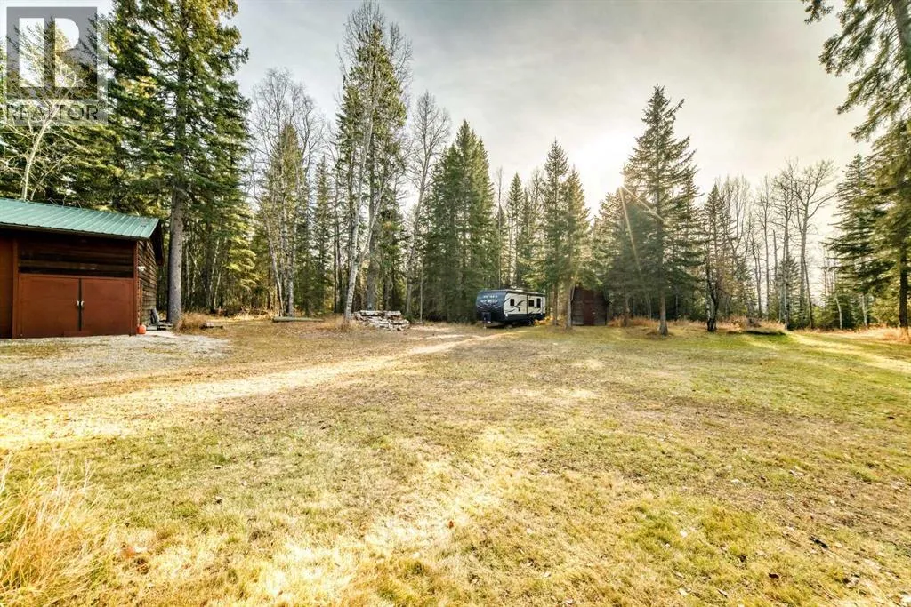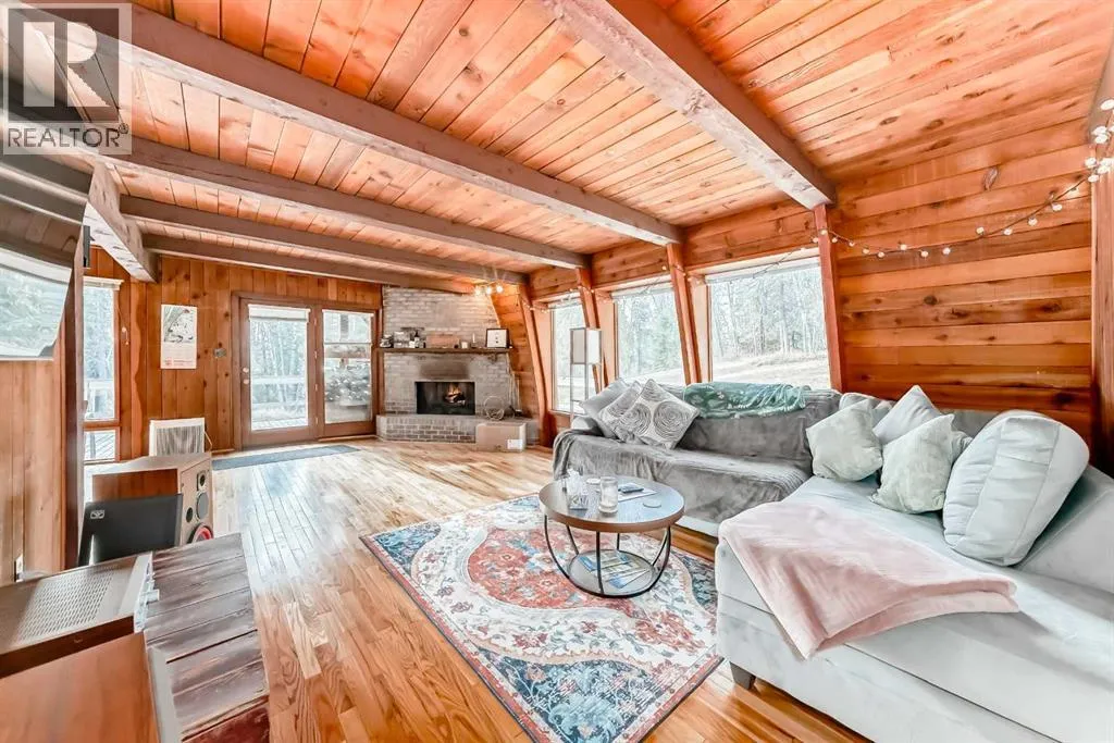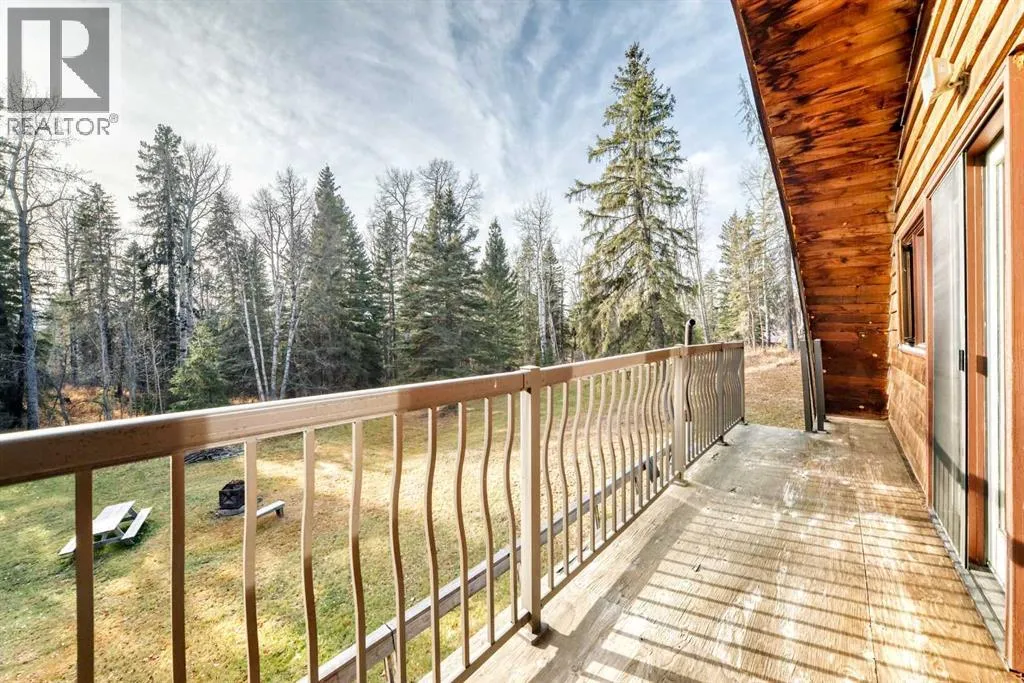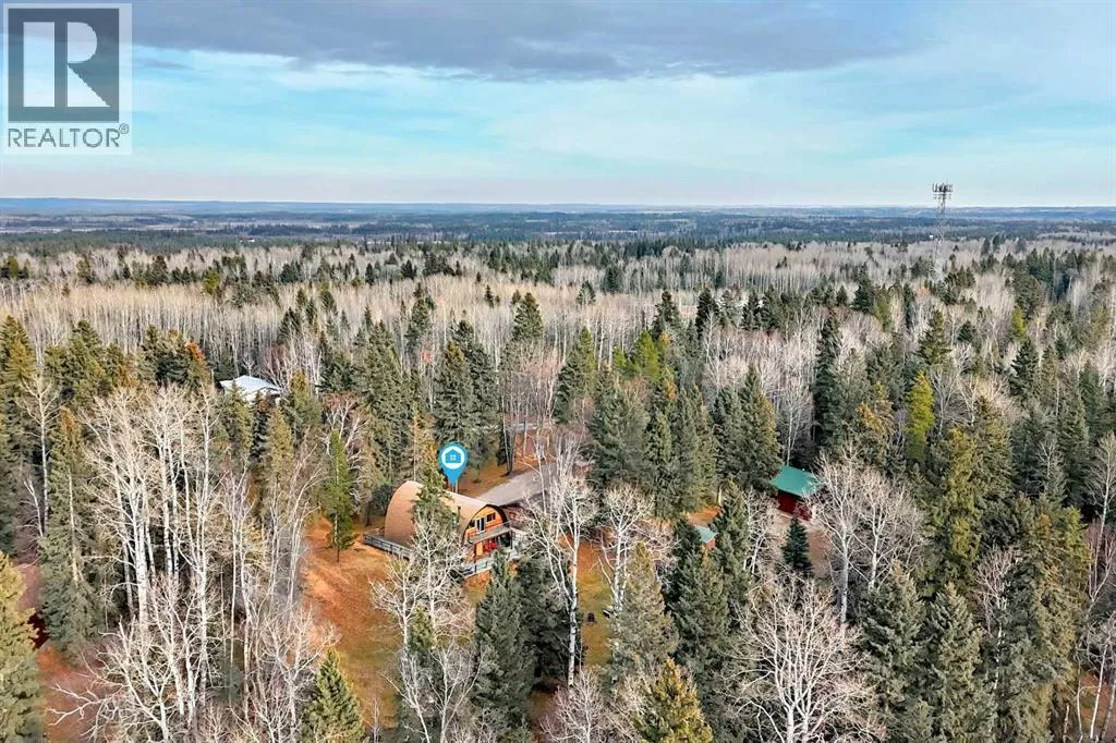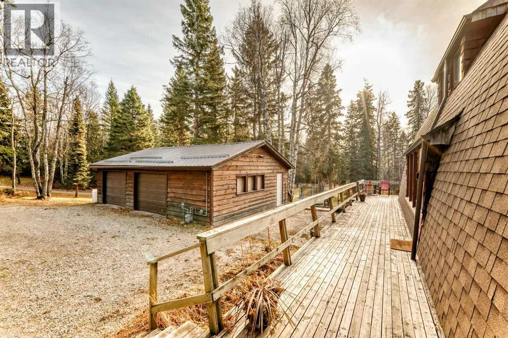 Just minutes west of Rocky, this charming arch-rib home is nestled among mature trees in a peaceful, park-like setting. Two levels of decking offer the perfect place to relax, unwind, and take in the beauty of the surrounding countryside. Inside, the main floor features a spacious kitchen that flows into the dining area and the cozy living room, complete with hardwood flooring and a wood-burning fireplace. A 3-piece bathroom, flex room, and laundry room add convenience to the main level. Upstairs, youâll find four comfortable bedrooms and a 5-piece bath. The primary bedroom is generously sized and includes a private balcony overlooking the acreageâideal for morning coffee or quiet evenings. The property also offers great utility with a double detached garage (31'5" x 23'7") and a well-sized shop with a wood stove (29'4" x 27'4"), perfect for projects, storage, or hobby space. A true country retreatâprivate, peaceful, and full of rustic charm. (id:27476)