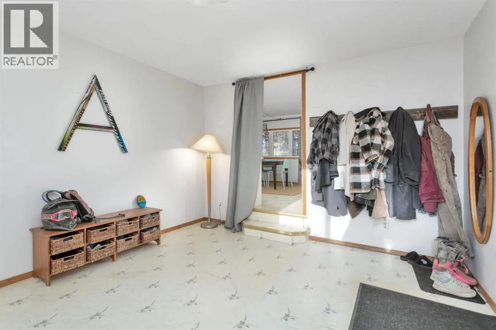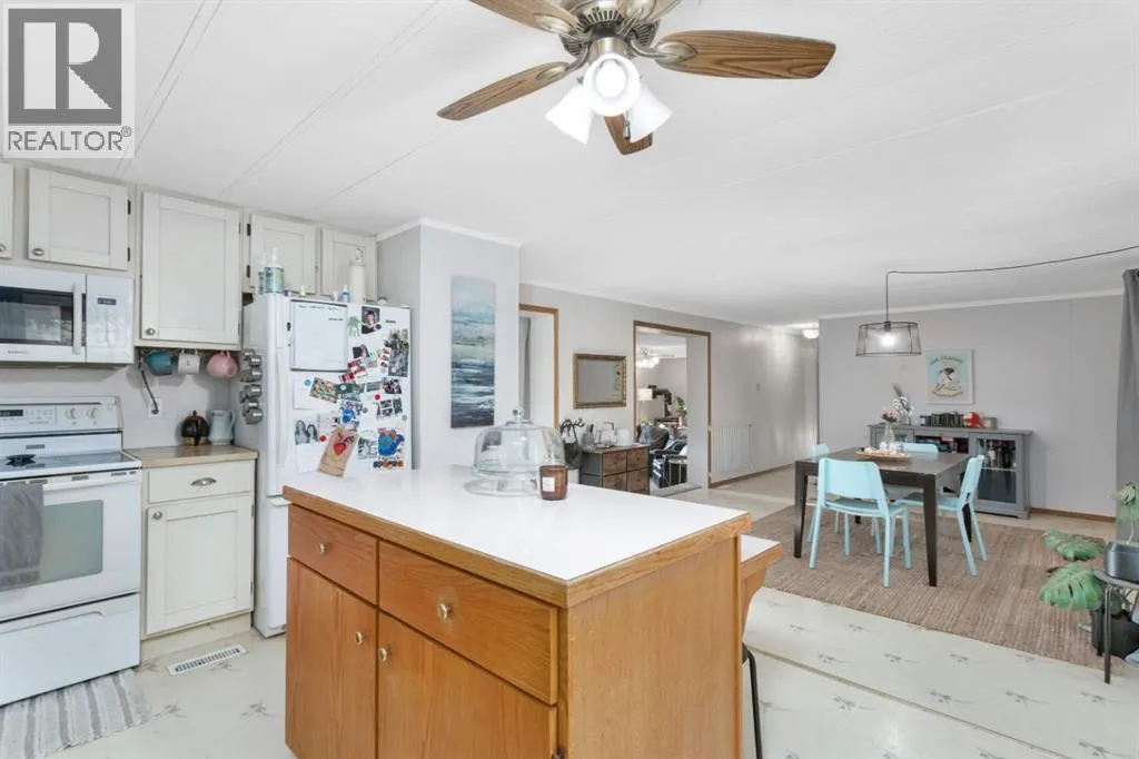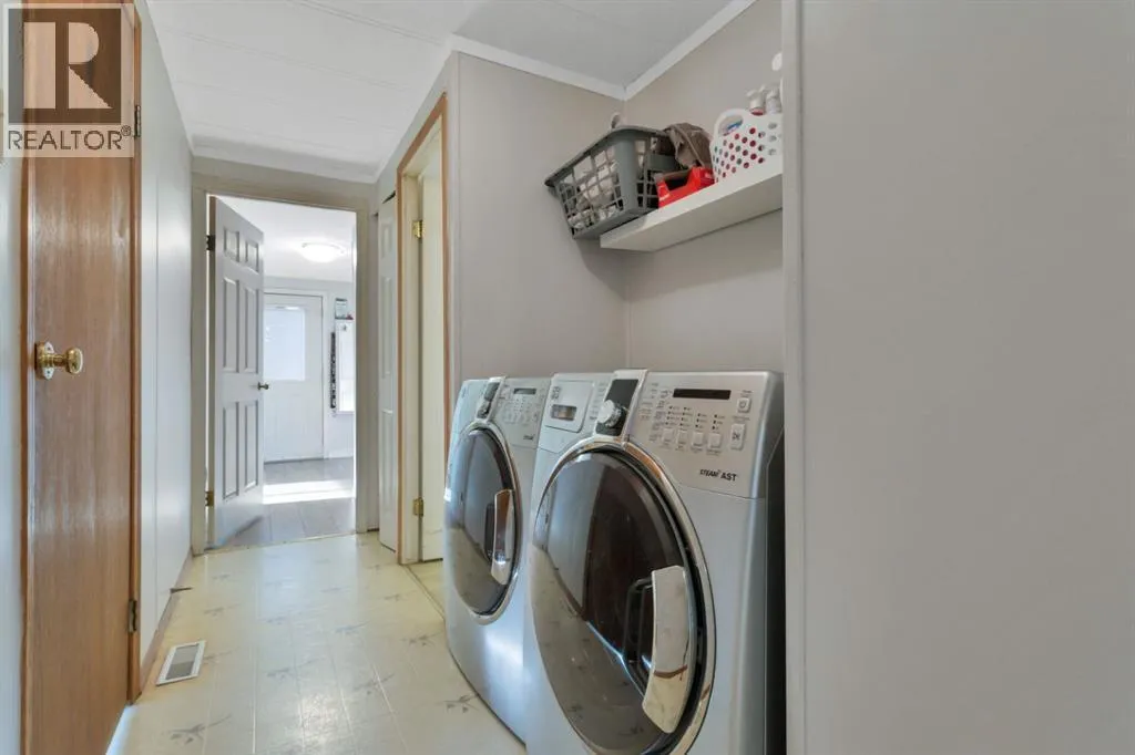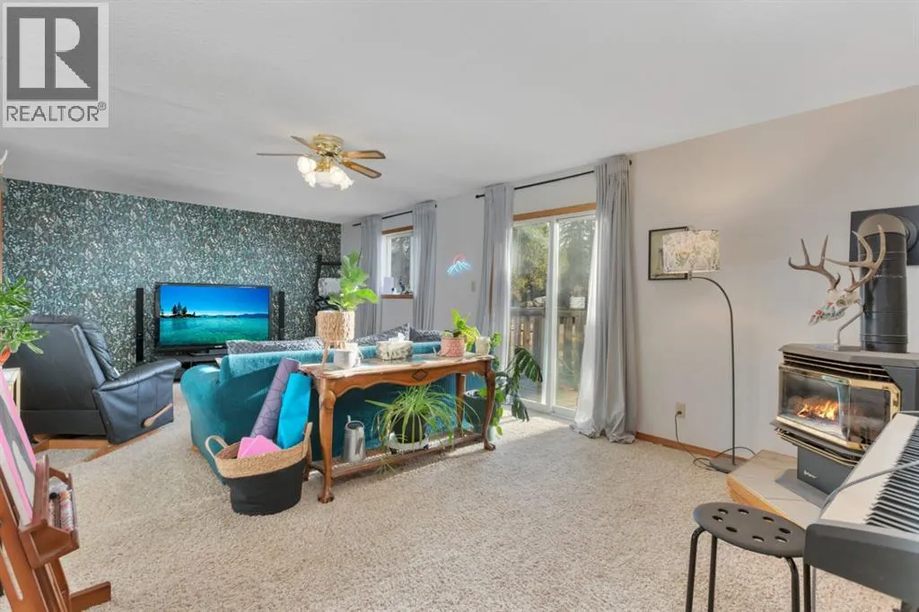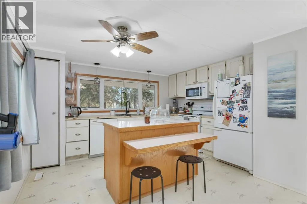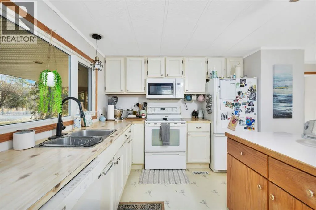 Discover a great blend of privacy and convenience nestled among mature trees yet only 3 km from Rocky. Set on just under 3 acres, this well-maintained mobile with a generous addition welcomes you with a spacious entryway leading into an open kitchen/dining area and a big, bright living room with a freestanding gas stove. This home offers 4 bedrooms, including a large primary with walk-in closet and 4-piece ensuite, plus a second 4-piece bathroom. Enjoy the outdoors on the covered deck with built-in seating and wheelchair access. Recent improvements include a new furnace and septic (2023), fresh paint and carpet, and a durable metal roof (2010). There's an older metal clad building for additional storage and the property is partially fenced providing plenty of cleared space for a future garage or shop, RV parking, and a garden. (id:27476)