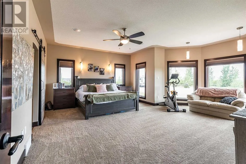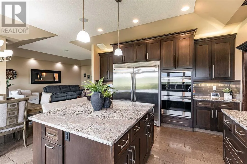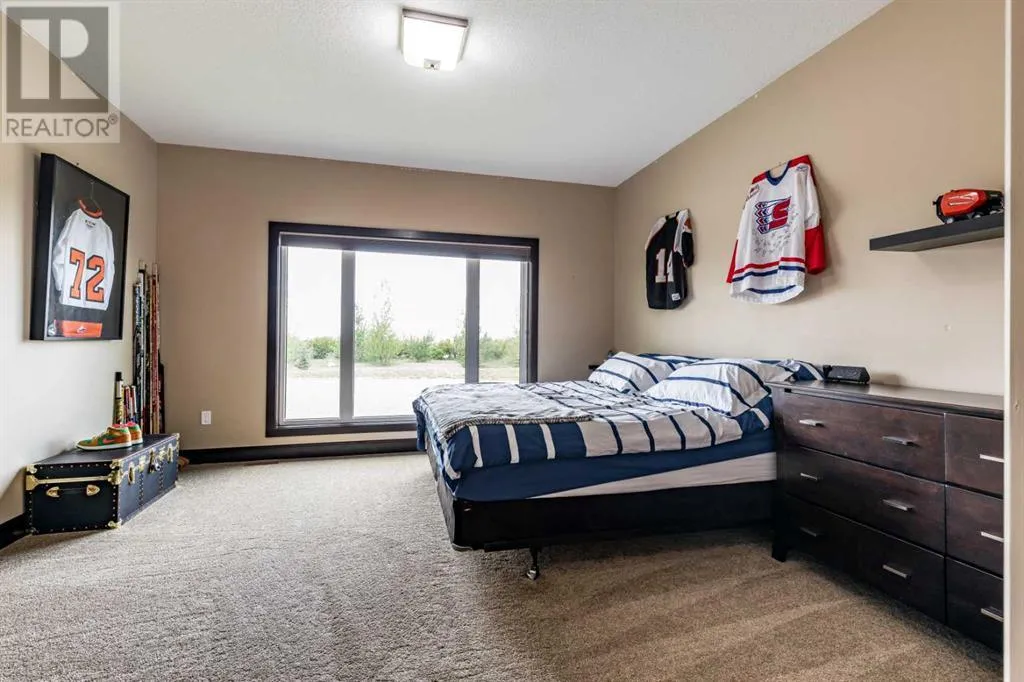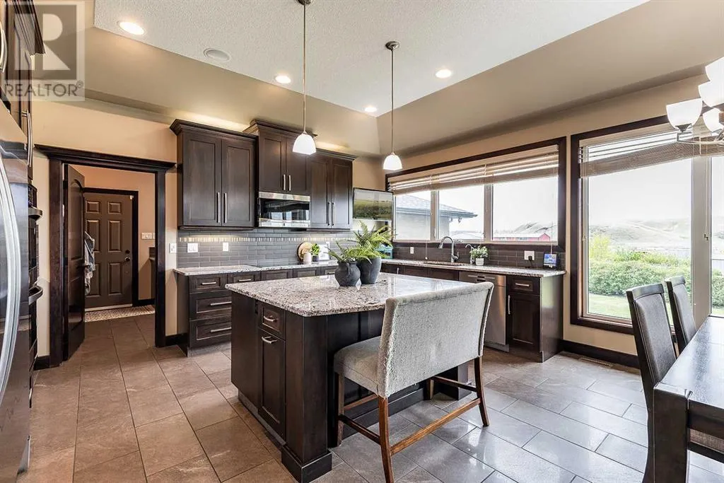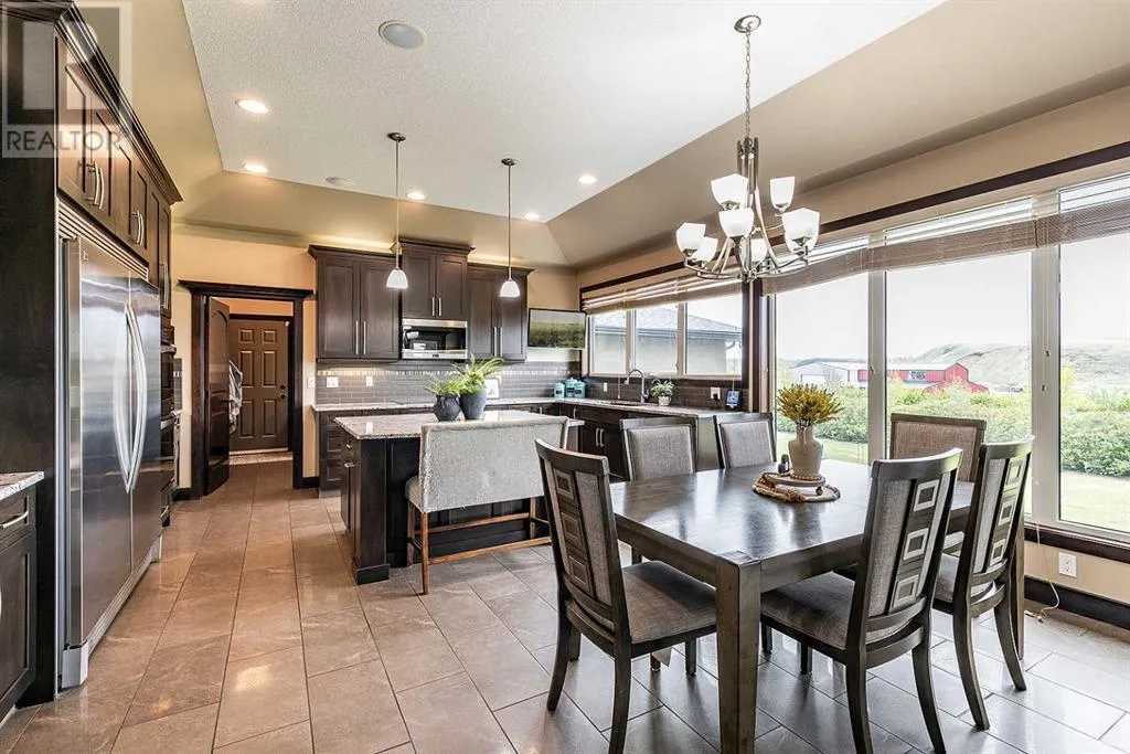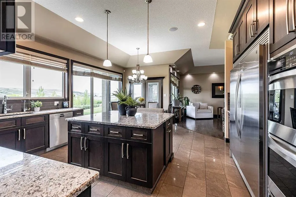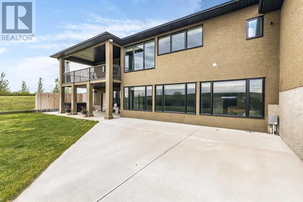 Welcome to a one-of-a-kind property just minutes from the city! This beautiful 2522 sqft walkout bungalow offers the perfect blend of rural serenity and refined living. The timeless home features 5 bedrooms plus an office, den, 4 full bathrooms, and a fully developed basement, all designed with thoughtful detail and quality finishes. Step into the bright, open concept living space with 9 ft ceilings, hardwood floors, a stone double sided fireplace, and expansive windows overlooking the private and dreamy outdoor space with incredible views. The chefâs kitchen features a double oven, oversized fridge/freezer, prep island, and ample cabinetry, flowing seamlessly into the dining area with access to a covered deck. Main floor convenience is maximized with a large laundry/mudroom connecting directly to the walk-through pantry as well as the 28x47 triple car garage. The Primary Suite is an expansive retreat, with generous space for a sitting area or exercise/yoga nook, a spa-like 4 pc ensuite featuring in-floor heating, a soaker tub, custom tile shower, and a walk-in closet with built-in cabinets. The walkout basement continues to impress with a large recreation room, wet bar with beverage fridge and dishwasher, two additional bedrooms, a den ideal for a gym, gaming room or playroom, a 4 pc bathroom with in-floor heating, a 3 pc bathroom with access to the patio and hot tub area, and plenty of storage. Additional features include blackout blinds in all bedrooms, zoned heating and A/C, a hot tub, and underground sprinklers. A huge perk of this incredible property is the three shops, measuring 80'x40', 50'x30', and 21'x26â: all with concrete floors, and durable tin exteriors, offering excellent flexibility for personal use or business needs. The animal lovers will enjoy the 36'x30' barn with heated tack room, concrete alley, five indoor pens, a 10'x10' overhead door, and two outdoor stock pens with shelters and an all-season watering bowl. Situated on a full 109.23 acres of pasture, reseeded grassland and total 39 acre water license. This standout property offers the best of both worlds: a luxurious home with high-end features and the infrastructure to support a rural lifestyle. Whether youâre looking to live, work, or invest in land, this is an incredible opportunity to own a high-value property close to city amenities. Floorplan/measurements and additional information attached. Drone photos available upon request. (id:27476)