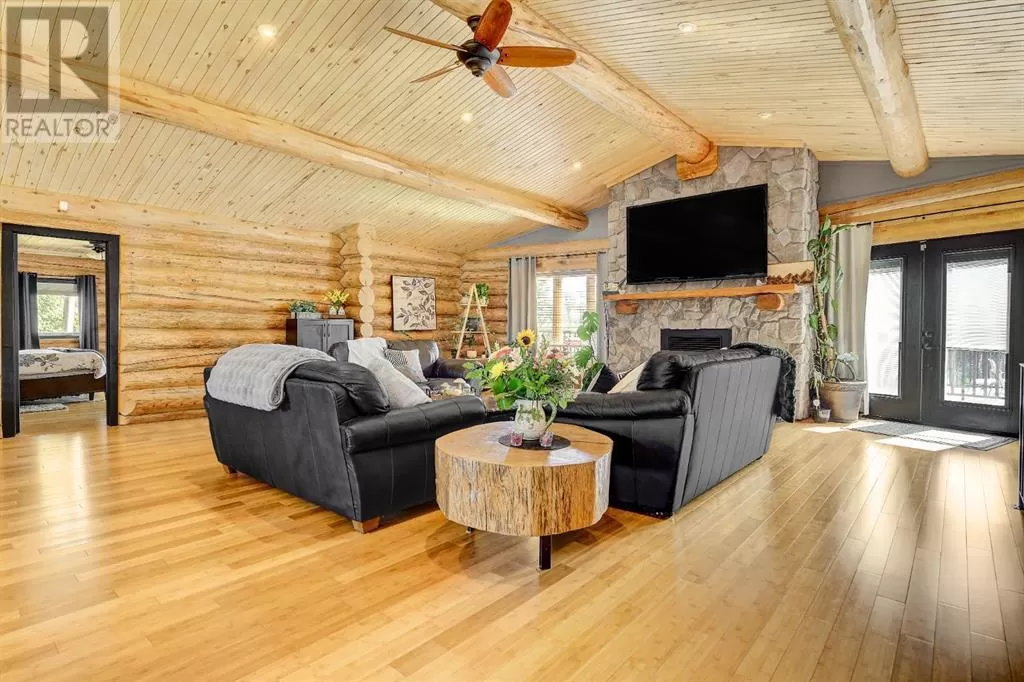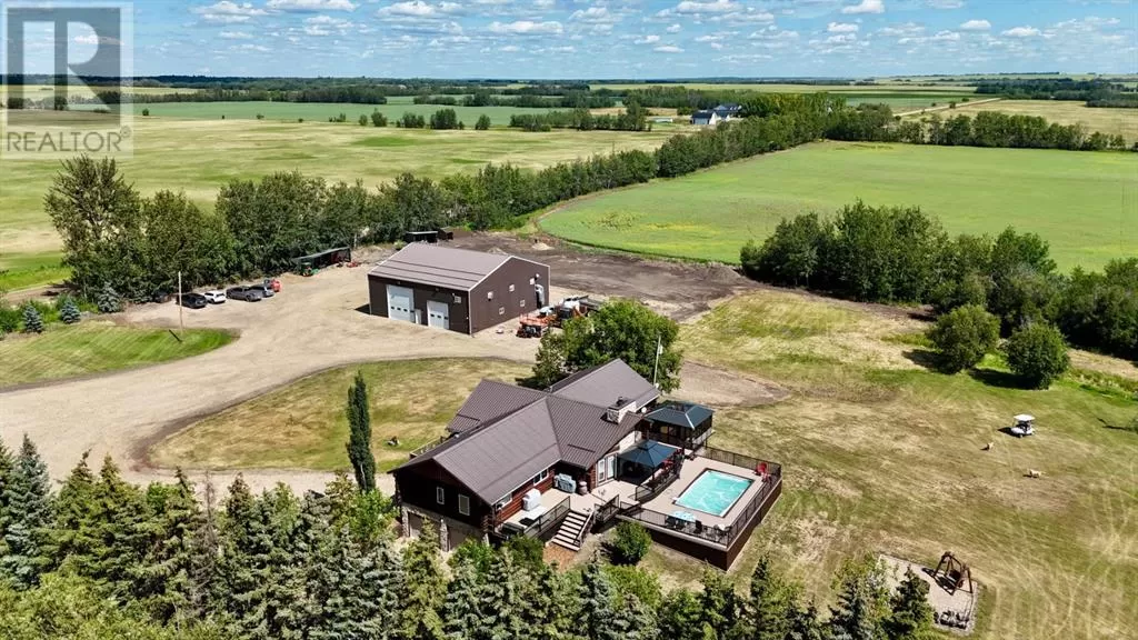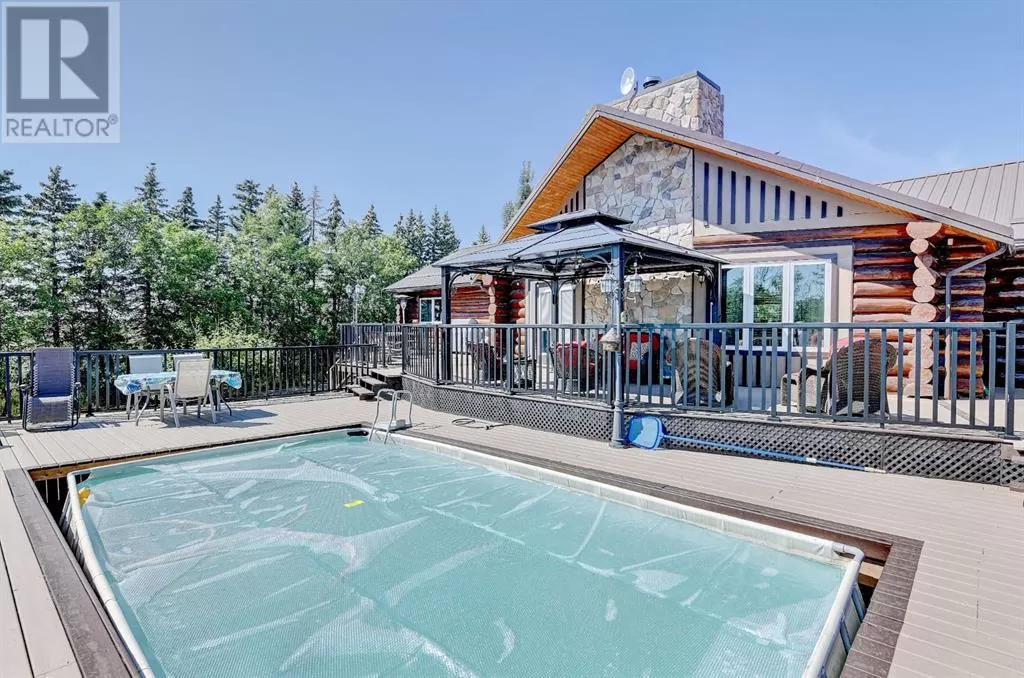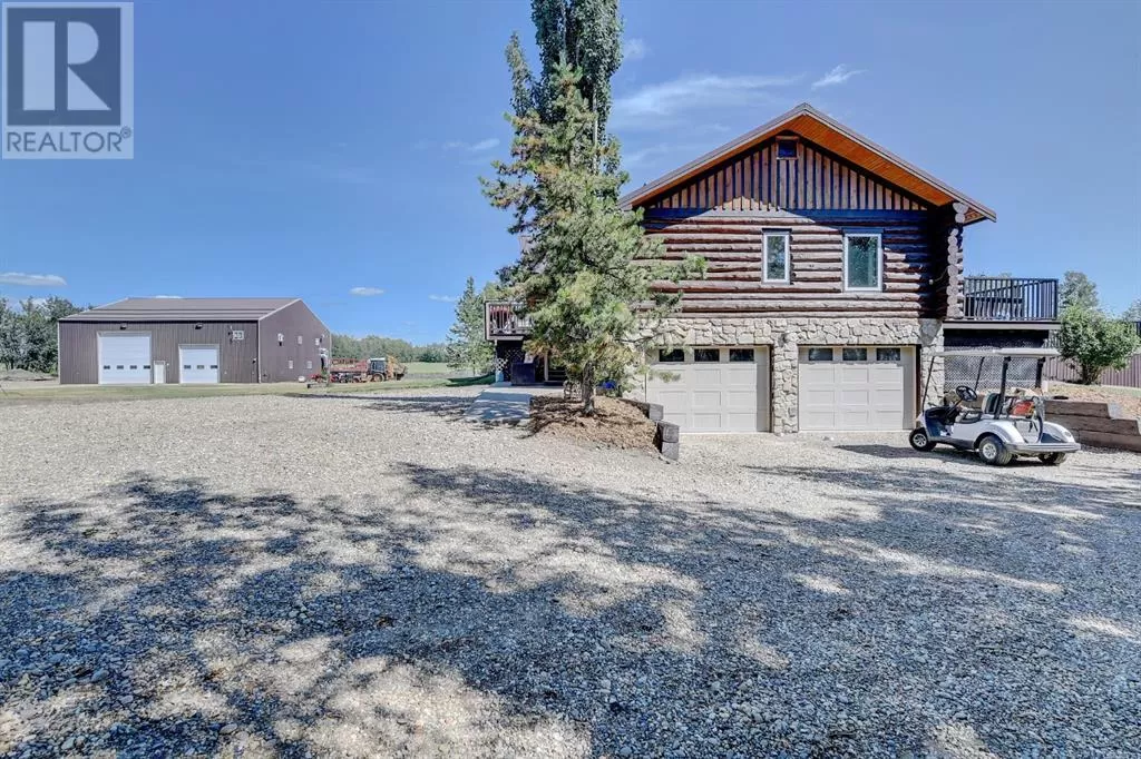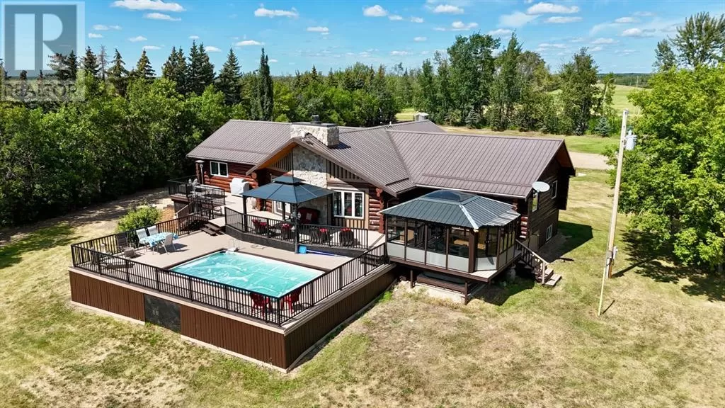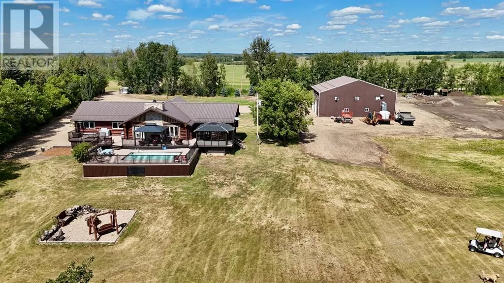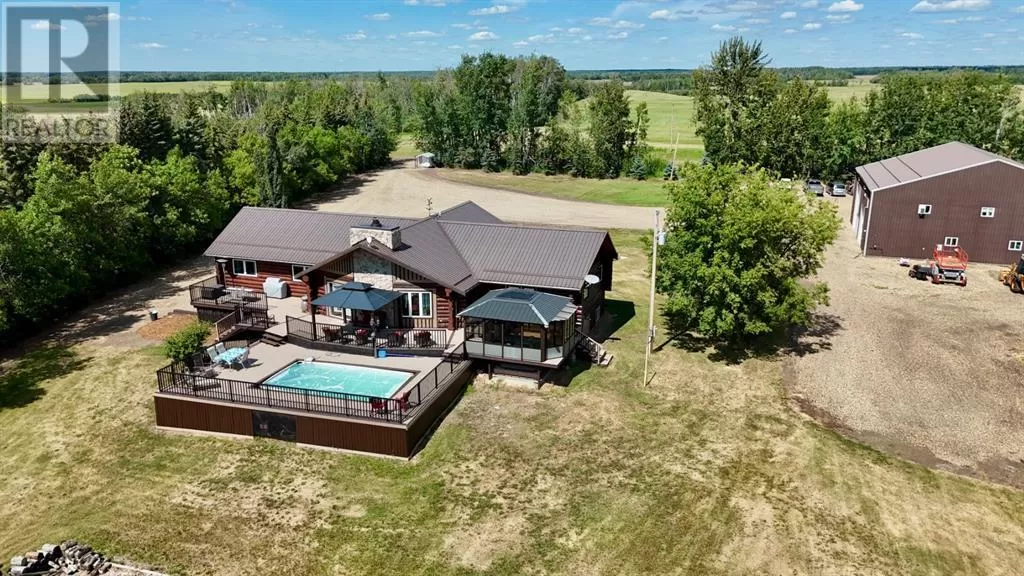 PRIVATE GATED 7-ACRE RETREAT WITH LUXURY LOG HOME AND 60âx60â HEATED SHOP!Welcome to this extraordinary 7-acre gated and fully fenced estate, showcasing a stunning 2,518 sq ft custom log home built in 2009. This one-of-a-kind property is the perfect blend of rustic elegance and modern comfort, featuring 4 spacious bedrooms, 3 luxurious bathrooms, and a heated 26â x 28â attached garage.Step into the open-concept main floor, where youâll find soaring ceilings, warm bamboo flooring, and a cozy wood-burning fireplace in the expansive living area. The chefâs kitchen is a true highlight with stainless steel appliances, a massive island with quartz counter tops, and ample cabinetryâperfect for entertaining. Enjoy ultimate relaxation in the massive primary suite complete with access to the private deck, pool, and hot tub. The ensuite boasts a steam shower and jetted jacuzzi tub.Three additional bedrooms, a full bathroom with charming clawfoot tub, main floor laundry, and deck access from both the primary and living areas complete the main floor.The fully finished basement features in-floor heating, a large craft room (easily converted back to a 5th bedroom), a gym area, a spacious theatre room, a third full bathroom, and a built-in sauna.Extensive Upgrades Include:â¢All exterior logs professionally refinished with premium log oil stainâ¢All surrounding decks refinished with high-quality productsâ¢New 200,000 BTU boilerâ¢New high-velocity air exchangerâ¢New Boiler Mate hot water systemâ¢Central A/Câ¢In-floor basement heat + forced air heating throughoutBackyard Oasis:â¢Above-ground pool with gas heaterâ¢Hot tub in enclosed gazeboâ¢3 natural gas BBQ hookupsâ¢Private powered entrance gateMassive 60â x 60â Heated Shop:â¢Fully finished with 11â x 48â mezzanine man caveâ¢In-floor heat with insulated floorâ¢Full-length radiant make-up heaterâ¢Dual stainless steel sink, shower, RV sewer dumpâ¢50-amp interior & exterior RV plugsâ¢Multi ple 20-amp plugs throughoutâ¢220V outlets for welder, air compressor, and pressure washer *. Dug out water source for water all outside areas and treesThis exceptional property offers peace, privacy, and high-end amenities rarely found together. Whether youâre seeking a luxurious family retreat or a hobbyistâs paradise, this property delivers it all. (id:27476)