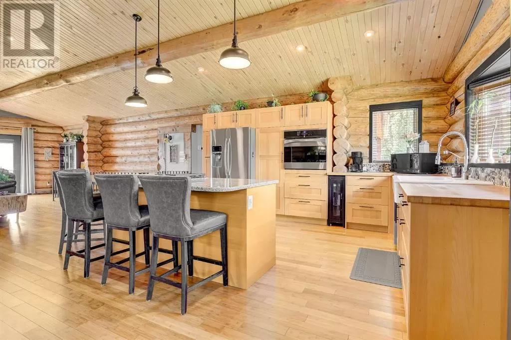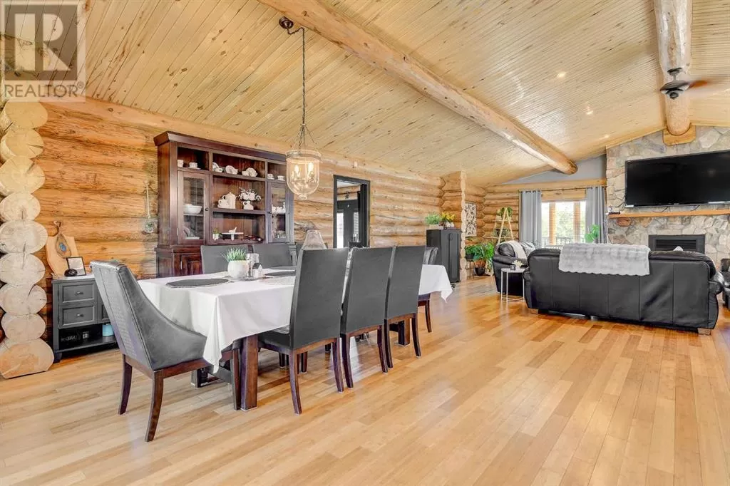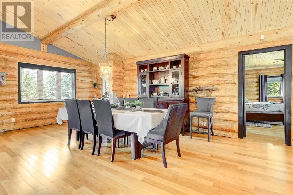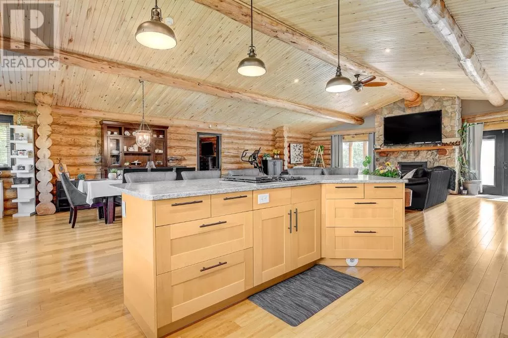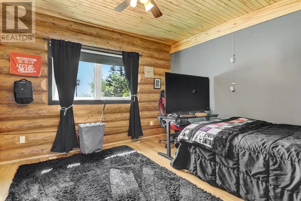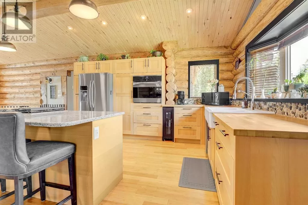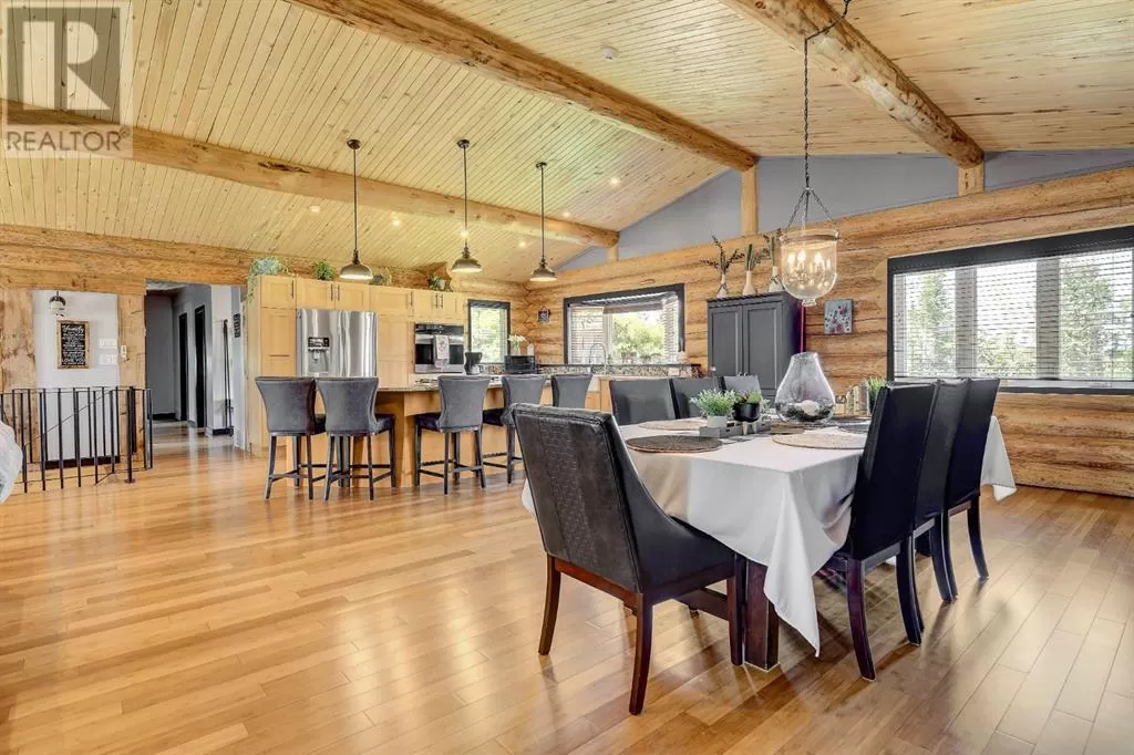 PRIVATE GATED 7-ACRE RETREAT WITH LUXURY LOG HOME AND 60âx60â HEATED SHOP!Welcome to this extraordinary 7-acre gated and fully fenced estate, showcasing a stunning 2,518 sq ft custom log home built in 2009. This one-of-a-kind property is the perfect blend of rustic elegance and modern comfort, featuring 4 spacious bedrooms, 3 luxurious bathrooms, and a heated 26â x 28â attached garage.Step into the open-concept main floor, where youâll find soaring ceilings, warm bamboo flooring, and a cozy wood-burning fireplace in the expansive living area. The chefâs kitchen is a true highlight with stainless steel appliances, a massive island with quartz counter tops, and ample cabinetryâperfect for entertaining. Enjoy ultimate relaxation in the massive primary suite complete with access to the private deck, pool, and hot tub. The ensuite boasts a steam shower and jetted jacuzzi tub.Three additional bedrooms, a full bathroom with charming clawfoot tub, main floor laundry, and deck access from both the primary and living areas complete the main floor.The fully finished basement features in-floor heating, a large craft room (easily converted back to a 5th bedroom), a gym area, a spacious theatre room, a third full bathroom, and a built-in sauna.Extensive Upgrades Include:â¢All exterior logs professionally refinished with premium log oil stainâ¢All surrounding decks refinished with high-quality productsâ¢New 200,000 BTU boilerâ¢New high-velocity air exchangerâ¢New Boiler Mate hot water systemâ¢Central A/Câ¢In-floor basement heat + forced air heating throughoutBackyard Oasis:â¢Above-ground pool with gas heaterâ¢Hot tub in enclosed gazeboâ¢3 natural gas BBQ hookupsâ¢Private powered entrance gateMassive 60â x 60â Heated Shop:â¢Fully finished with 11â x 48â mezzanine man caveâ¢In-floor heat with insulated floorâ¢Full-length radiant make-up heaterâ¢Dual stainless steel sink, shower, RV sewer dumpâ¢50-amp interior & exterior RV plugsâ¢Multi ple 20-amp plugs throughoutâ¢220V outlets for welder, air compressor, and pressure washer *. Dug out water source for water all outside areas and treesThis exceptional property offers peace, privacy, and high-end amenities rarely found together. Whether youâre seeking a luxurious family retreat or a hobbyistâs paradise, this property delivers it all. (id:27476)