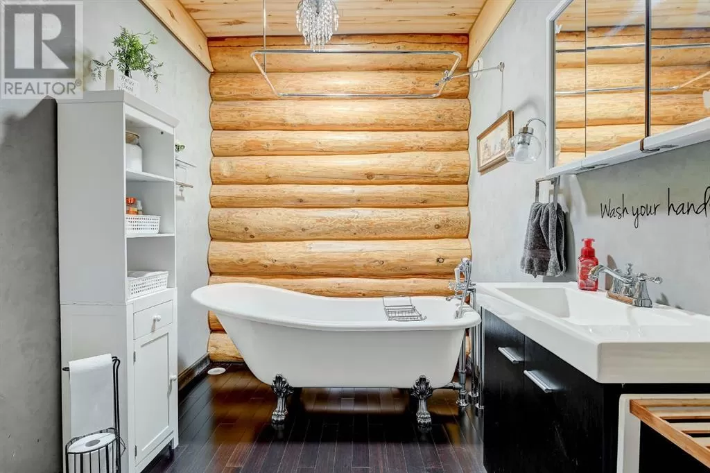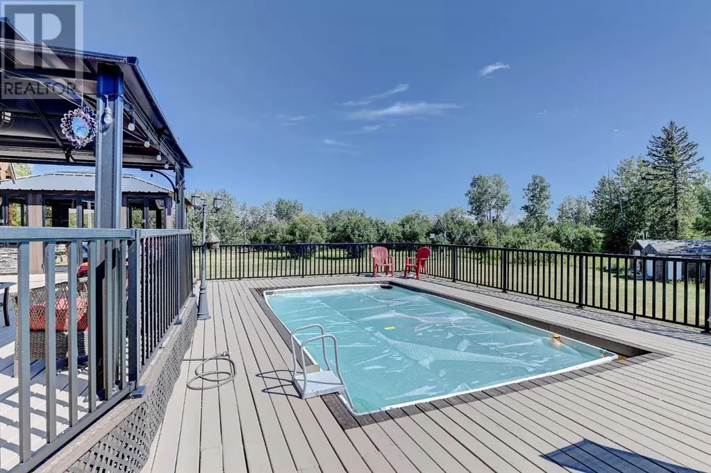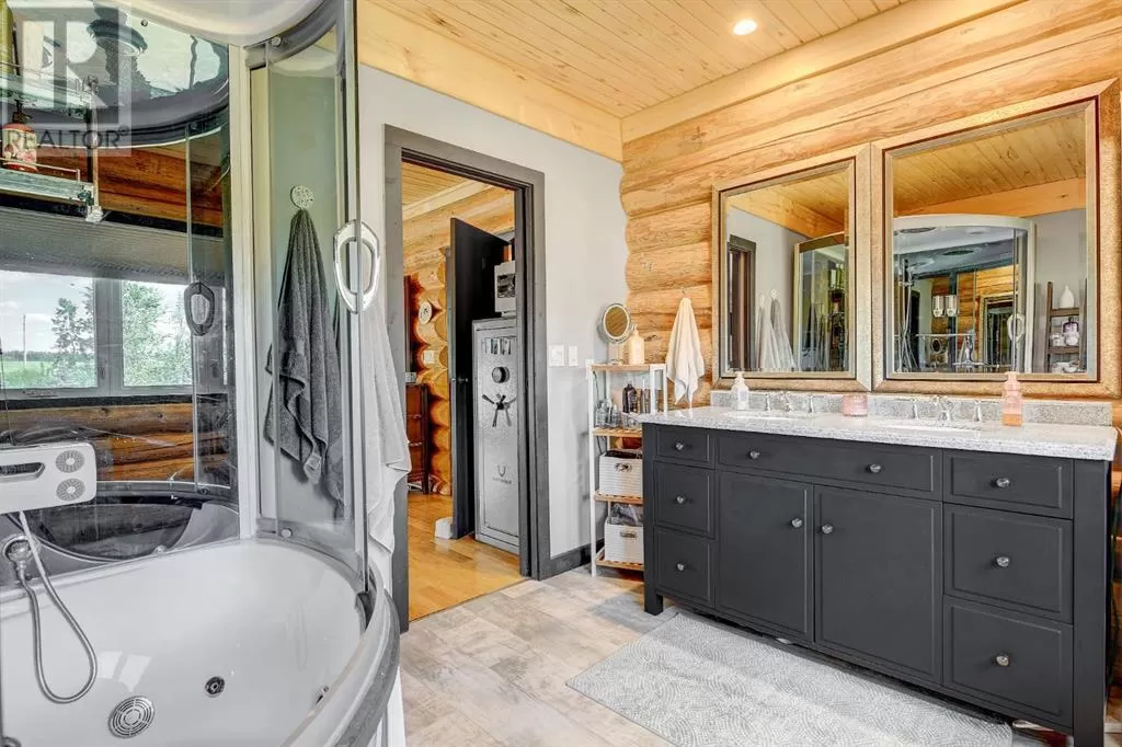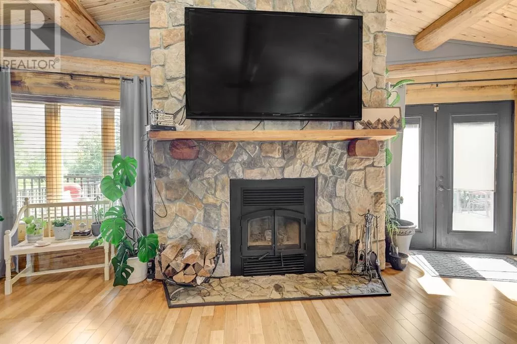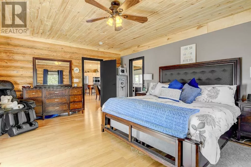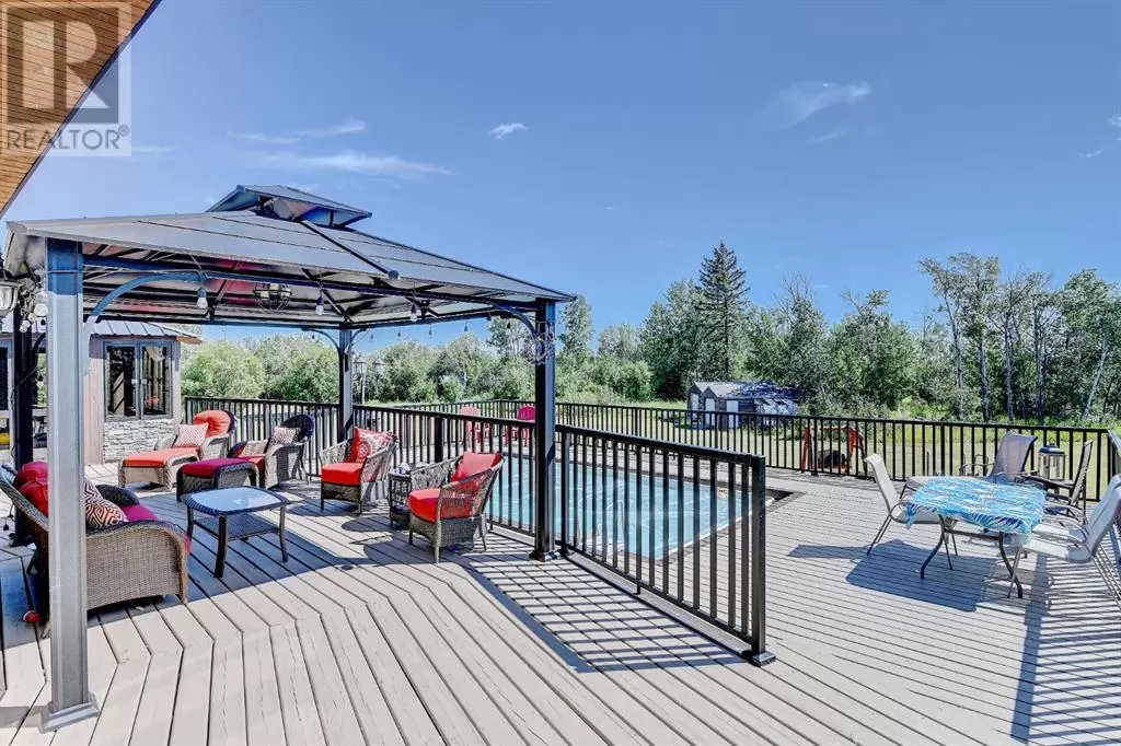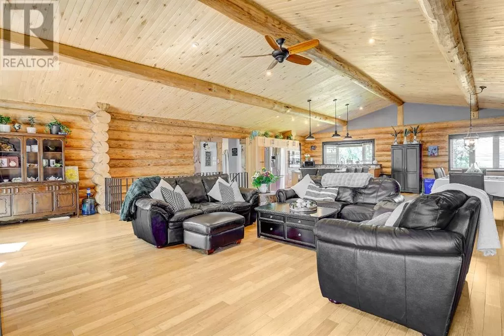 PRIVATE GATED 7-ACRE RETREAT WITH LUXURY LOG HOME AND 60âx60â HEATED SHOP!Welcome to this extraordinary 7-acre gated and fully fenced estate, showcasing a stunning 2,518 sq ft custom log home built in 2009. This one-of-a-kind property is the perfect blend of rustic elegance and modern comfort, featuring 4 spacious bedrooms, 3 luxurious bathrooms, and a heated 26â x 28â attached garage.Step into the open-concept main floor, where youâll find soaring ceilings, warm bamboo flooring, and a cozy wood-burning fireplace in the expansive living area. The chefâs kitchen is a true highlight with stainless steel appliances, a massive island with quartz counter tops, and ample cabinetryâperfect for entertaining. Enjoy ultimate relaxation in the massive primary suite complete with access to the private deck, pool, and hot tub. The ensuite boasts a steam shower and jetted jacuzzi tub.Three additional bedrooms, a full bathroom with charming clawfoot tub, main floor laundry, and deck access from both the primary and living areas complete the main floor.The fully finished basement features in-floor heating, a large craft room (easily converted back to a 5th bedroom), a gym area, a spacious theatre room, a third full bathroom, and a built-in sauna.Extensive Upgrades Include:â¢All exterior logs professionally refinished with premium log oil stainâ¢All surrounding decks refinished with high-quality productsâ¢New 200,000 BTU boilerâ¢New high-velocity air exchangerâ¢New Boiler Mate hot water systemâ¢Central A/Câ¢In-floor basement heat + forced air heating throughoutBackyard Oasis:â¢Above-ground pool with gas heaterâ¢Hot tub in enclosed gazeboâ¢3 natural gas BBQ hookupsâ¢Private powered entrance gateMassive 60â x 60â Heated Shop:â¢Fully finished with 11â x 48â mezzanine man caveâ¢In-floor heat with insulated floorâ¢Full-length radiant make-up heaterâ¢Dual stainless steel sink, shower, RV sewer dumpâ¢50-amp interior & exterior RV plugsâ¢Multi ple 20-amp plugs throughoutâ¢220V outlets for welder, air compressor, and pressure washer *. Dug out water source for water all outside areas and treesThis exceptional property offers peace, privacy, and high-end amenities rarely found together. Whether youâre seeking a luxurious family retreat or a hobbyistâs paradise, this property delivers it all. (id:27476)