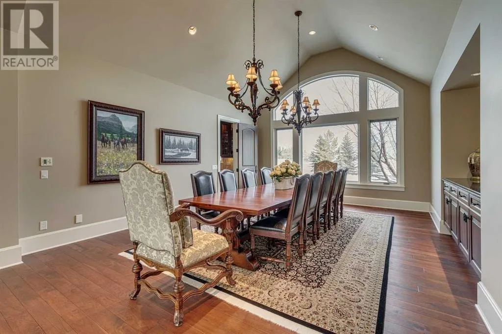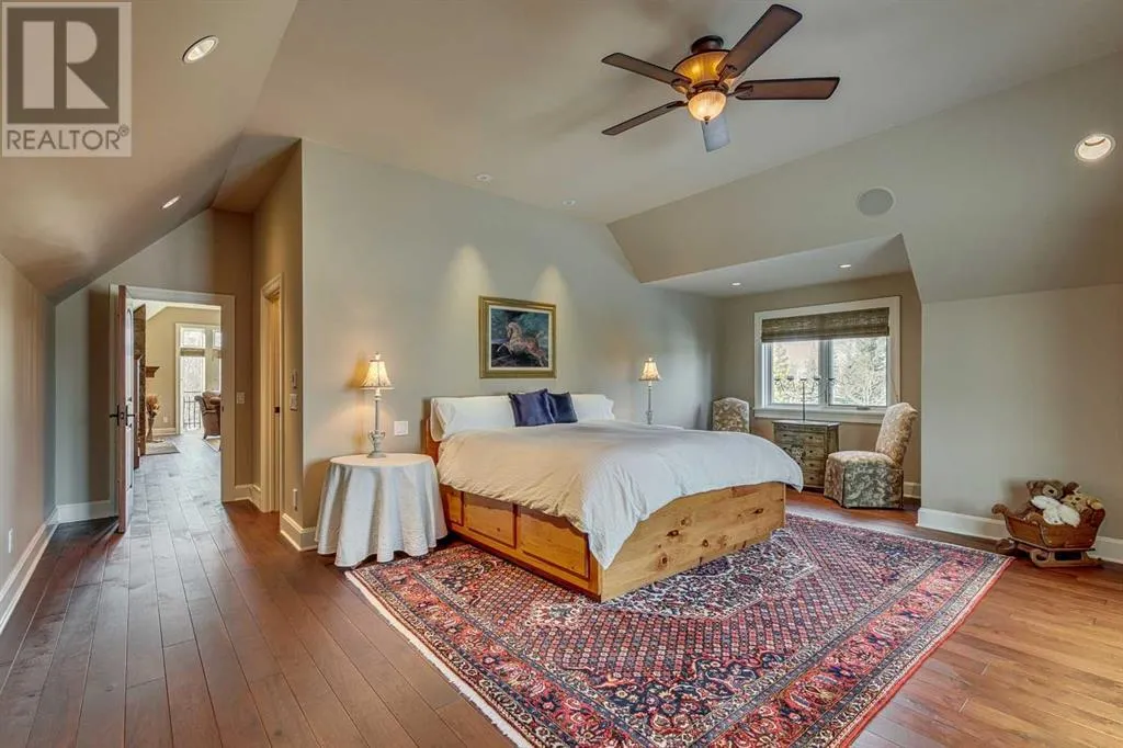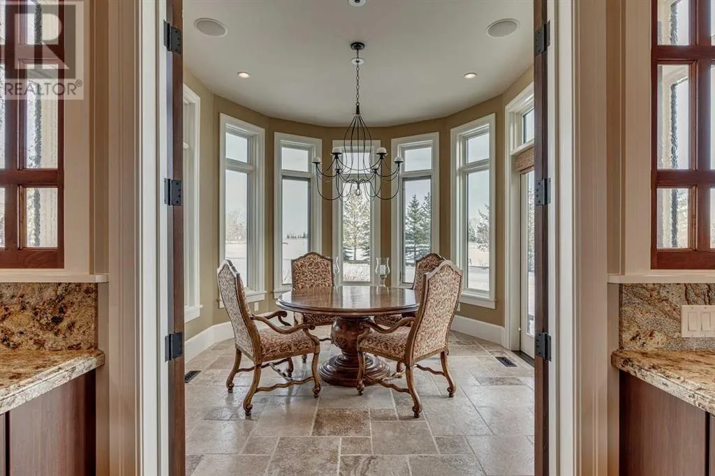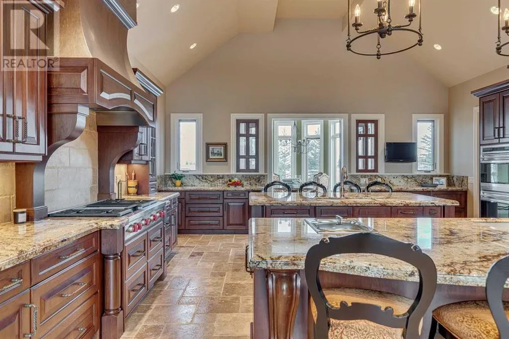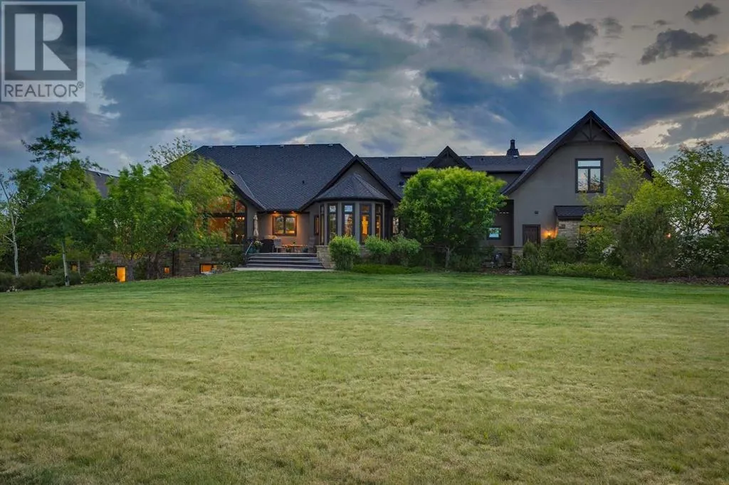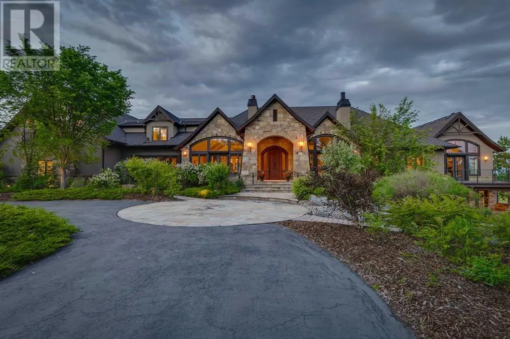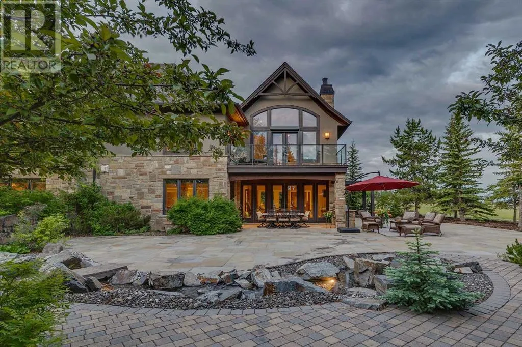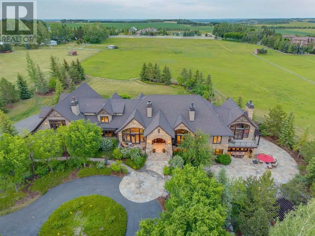 Nestled on 6.1 serene acres only 5 minutes to Calgary city limits, this exquisite French Country estate offers an unparalleled blend of luxury and elegance with a stunning mountain view. Culinary enthusiasts will love the chef-inspired kitchen, featuring two oversized islands and integrated built-in appliances. The home boasts a very large dining room, perfect for hosting grand gatherings, and a butlerâs pantry with a dumbwaiter for seamless service. The expansive primary suite is a true retreat, featuring a cozy fireplace and separate his-and-hers en suites, both with steam showers and spacious walk-in closets. A charming upstairs loft includes its own spacious bedroom, family room, laundry and a spa-like bathroom. The walk-out basement is an entertainerâs dream, complete with a wet bar, gym, wine room, and additional butlerâs pantry. Outdoors, unwind in a private oasis with a tranquil pond, cascading waterfall, and beautiful pergolas. A gated driveway and oversized quadruple garage complete this remarkable property, offering privacy and sophistication at every turn. (id:27476)