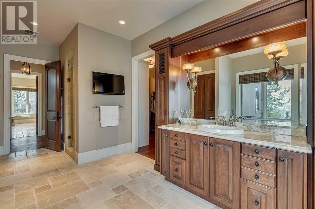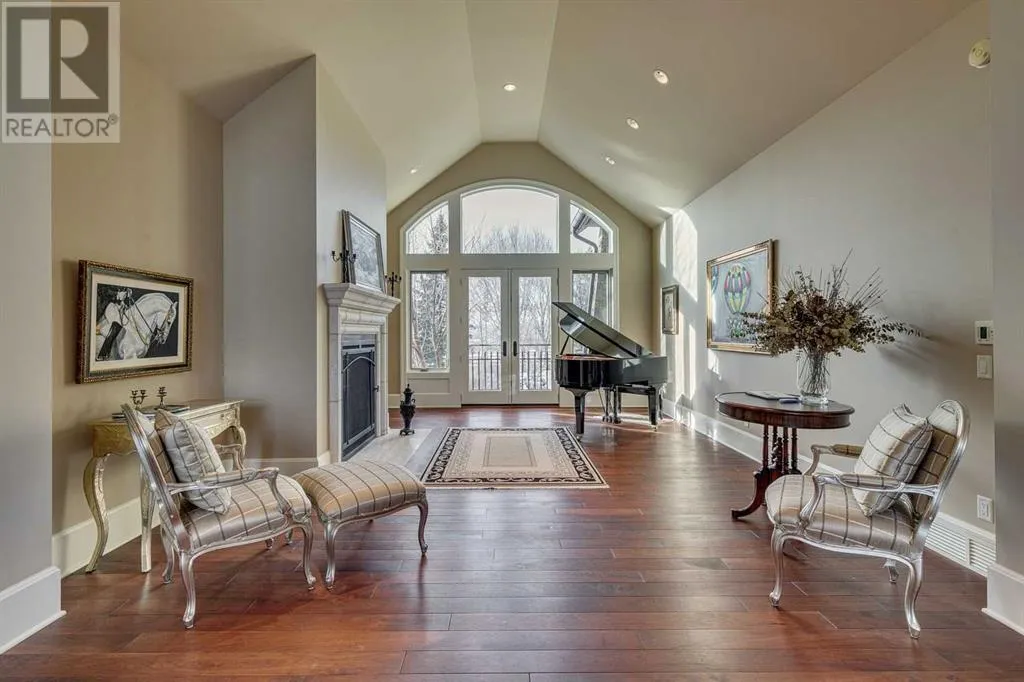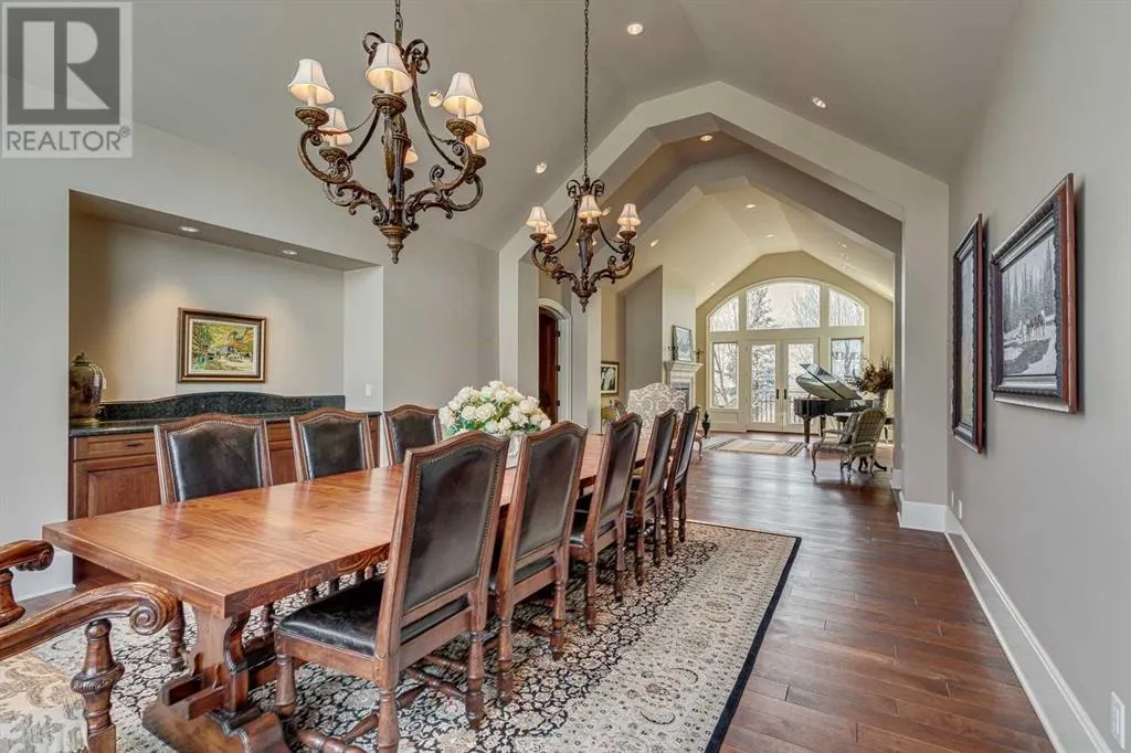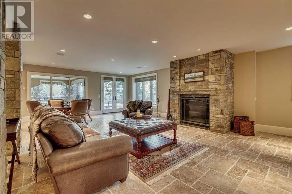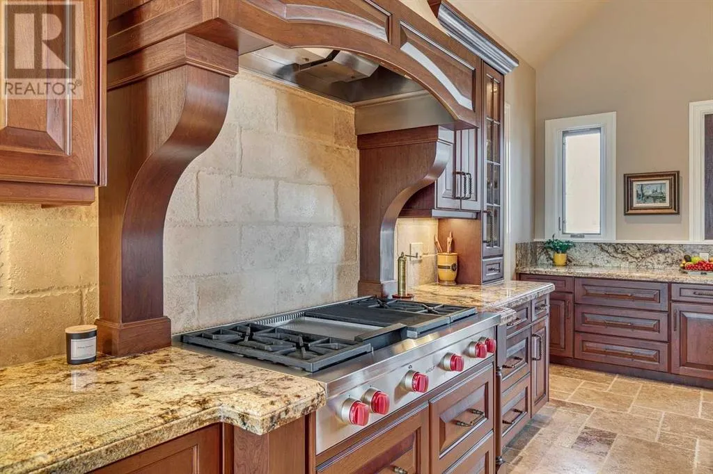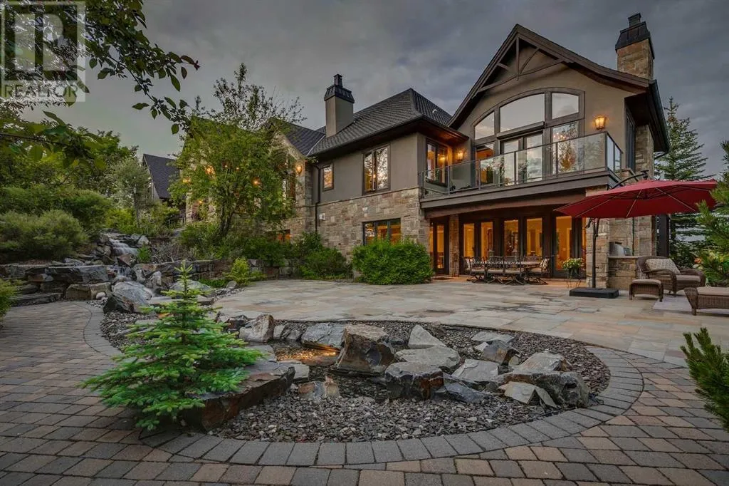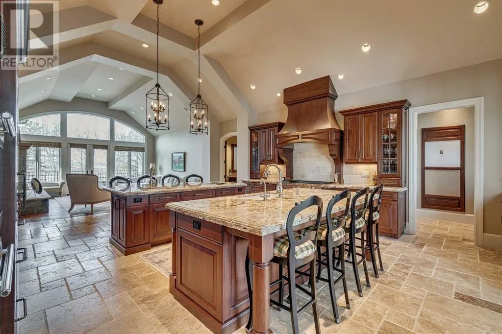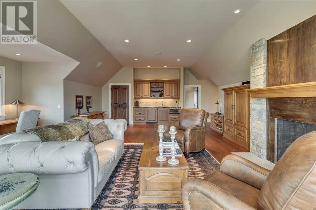 Nestled on 6.1 serene acres only 5 minutes to Calgary city limits, this exquisite French Country estate offers an unparalleled blend of luxury and elegance with a stunning mountain view. Culinary enthusiasts will love the chef-inspired kitchen, featuring two oversized islands and integrated built-in appliances. The home boasts a very large dining room, perfect for hosting grand gatherings, and a butlerâs pantry with a dumbwaiter for seamless service. The expansive primary suite is a true retreat, featuring a cozy fireplace and separate his-and-hers en suites, both with steam showers and spacious walk-in closets. A charming upstairs loft includes its own spacious bedroom, family room, laundry and a spa-like bathroom. The walk-out basement is an entertainerâs dream, complete with a wet bar, gym, wine room, and additional butlerâs pantry. Outdoors, unwind in a private oasis with a tranquil pond, cascading waterfall, and beautiful pergolas. A gated driveway and oversized quadruple garage complete this remarkable property, offering privacy and sophistication at every turn. (id:27476)