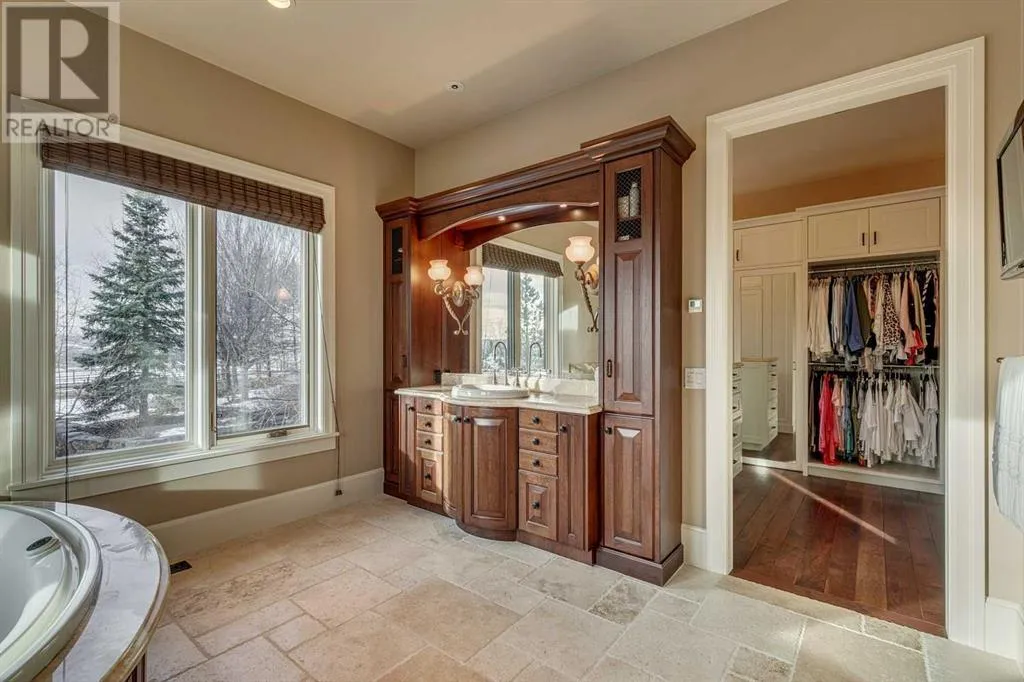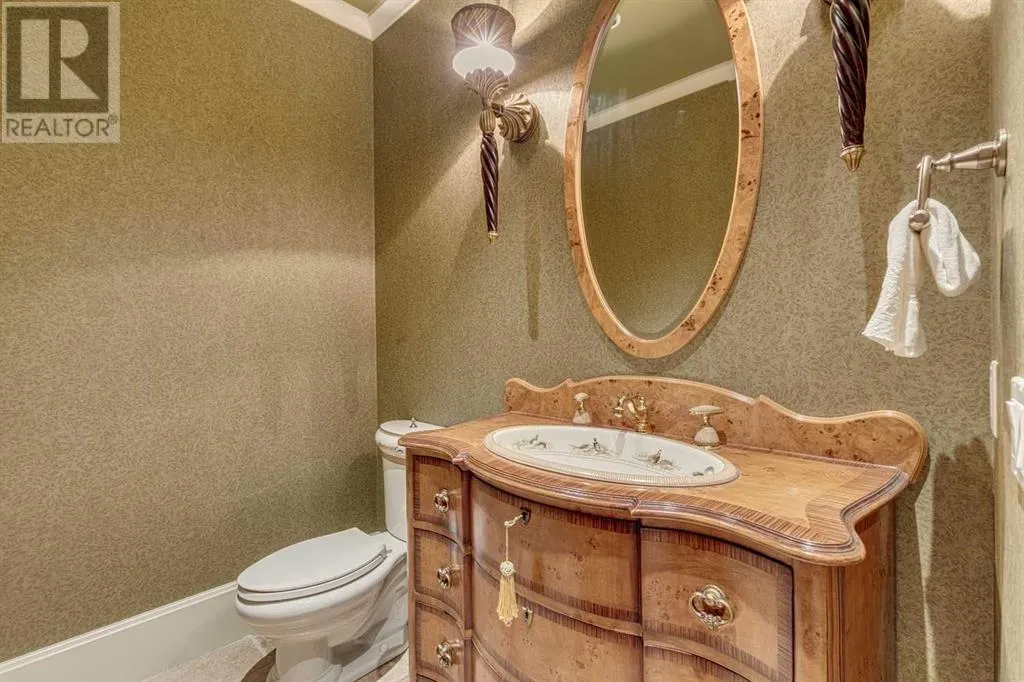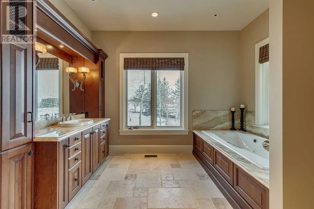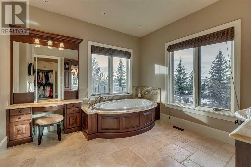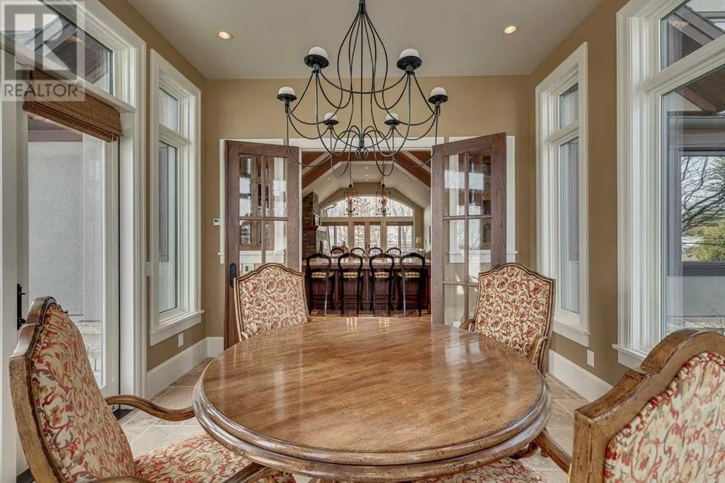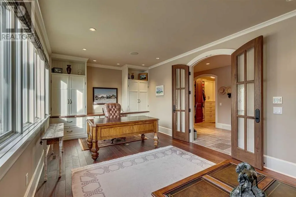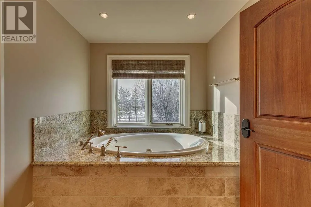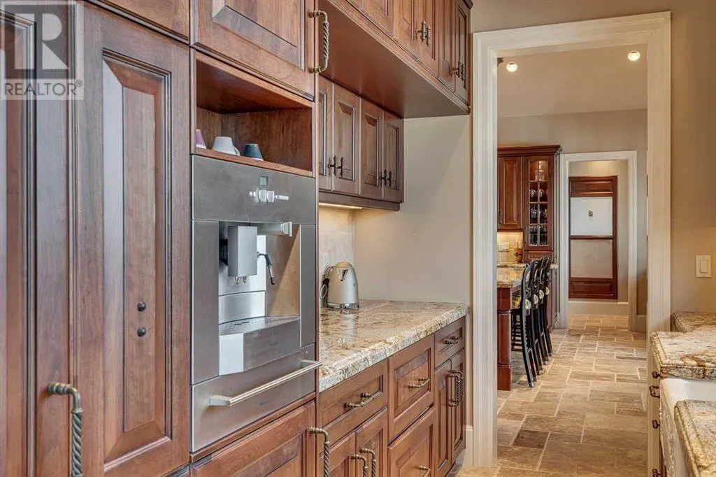 Nestled on 6.1 serene acres only 5 minutes to Calgary city limits, this exquisite French Country estate offers an unparalleled blend of luxury and elegance with a stunning mountain view. Culinary enthusiasts will love the chef-inspired kitchen, featuring two oversized islands and integrated built-in appliances. The home boasts a very large dining room, perfect for hosting grand gatherings, and a butlerâs pantry with a dumbwaiter for seamless service. The expansive primary suite is a true retreat, featuring a cozy fireplace and separate his-and-hers en suites, both with steam showers and spacious walk-in closets. A charming upstairs loft includes its own spacious bedroom, family room, laundry and a spa-like bathroom. The walk-out basement is an entertainerâs dream, complete with a wet bar, gym, wine room, and additional butlerâs pantry. Outdoors, unwind in a private oasis with a tranquil pond, cascading waterfall, and beautiful pergolas. A gated driveway and oversized quadruple garage complete this remarkable property, offering privacy and sophistication at every turn. (id:27476)