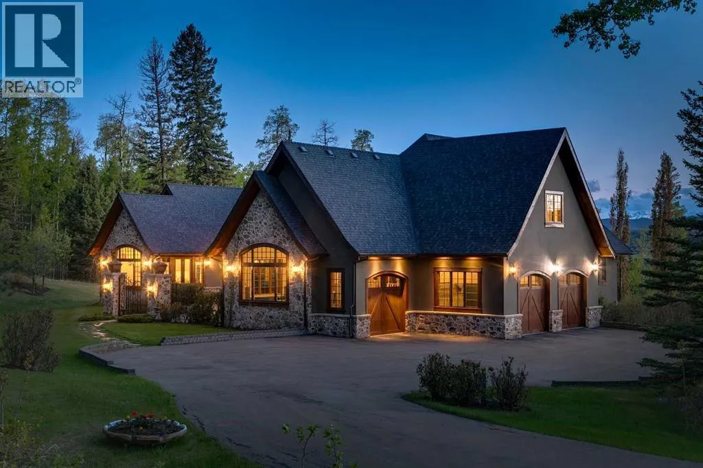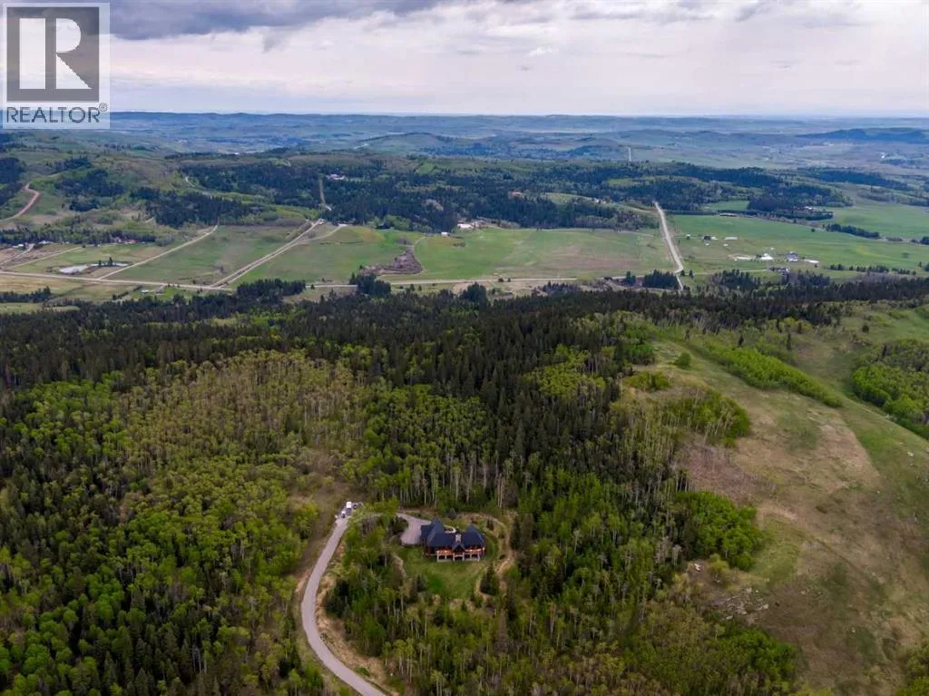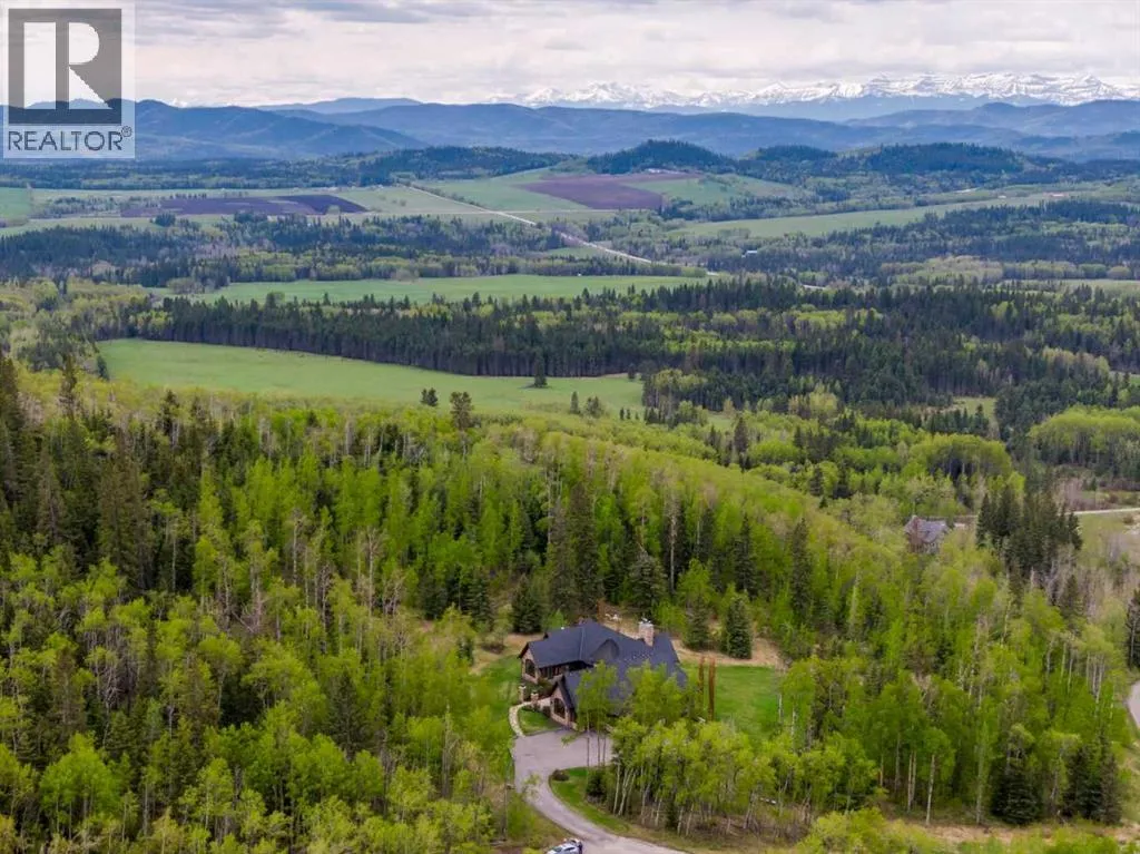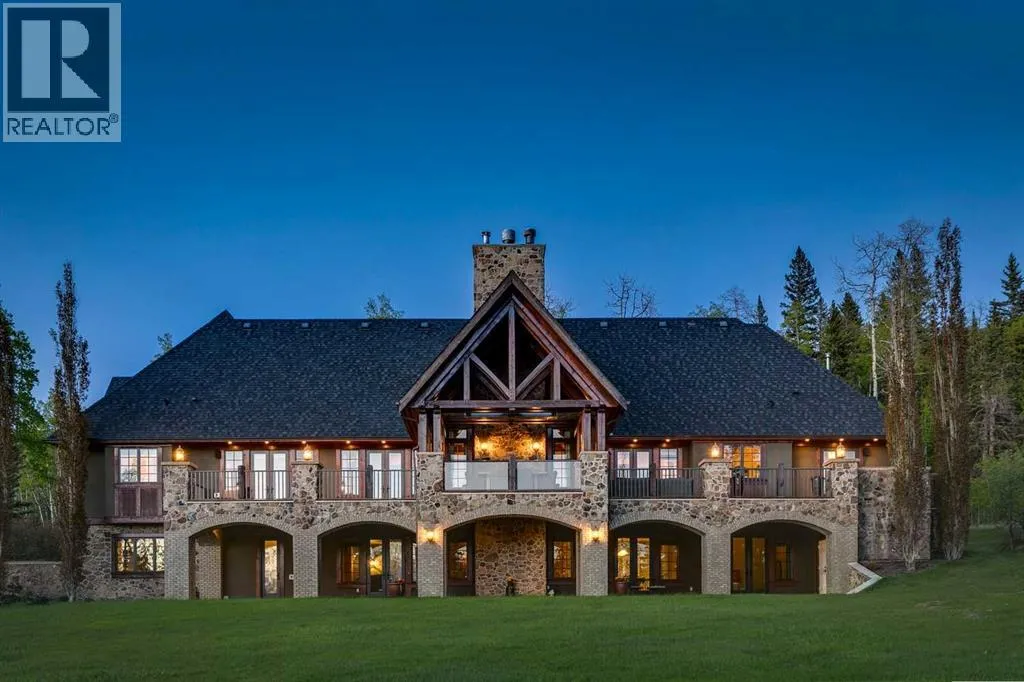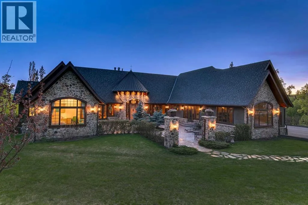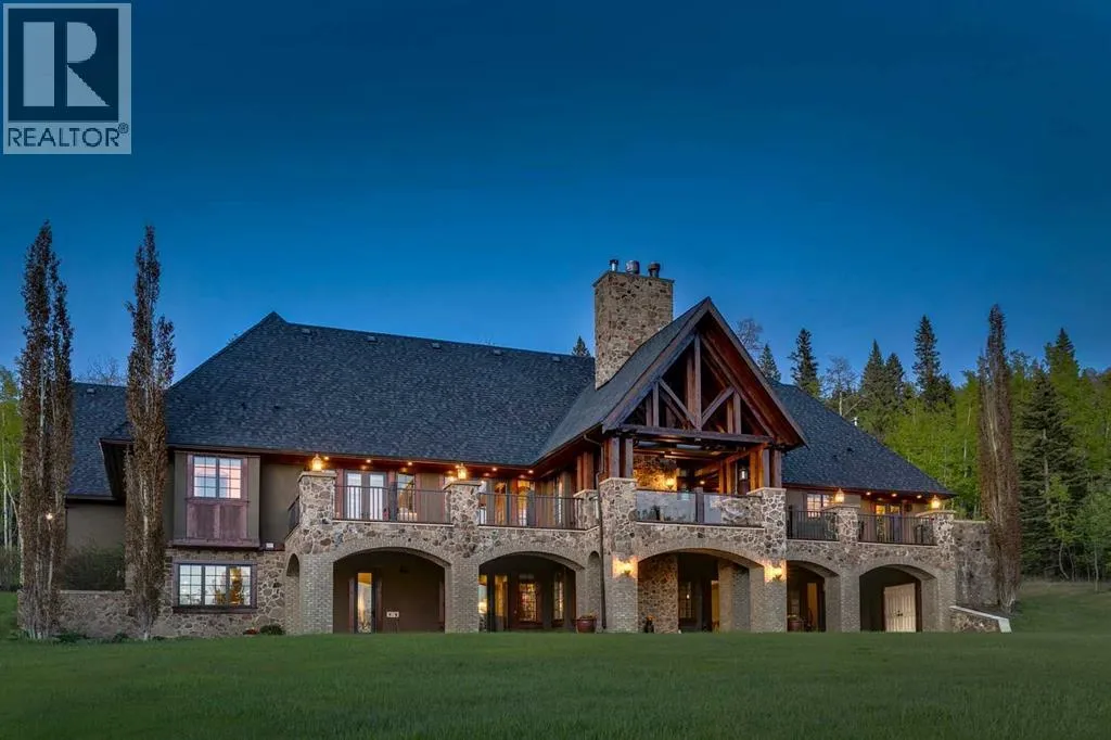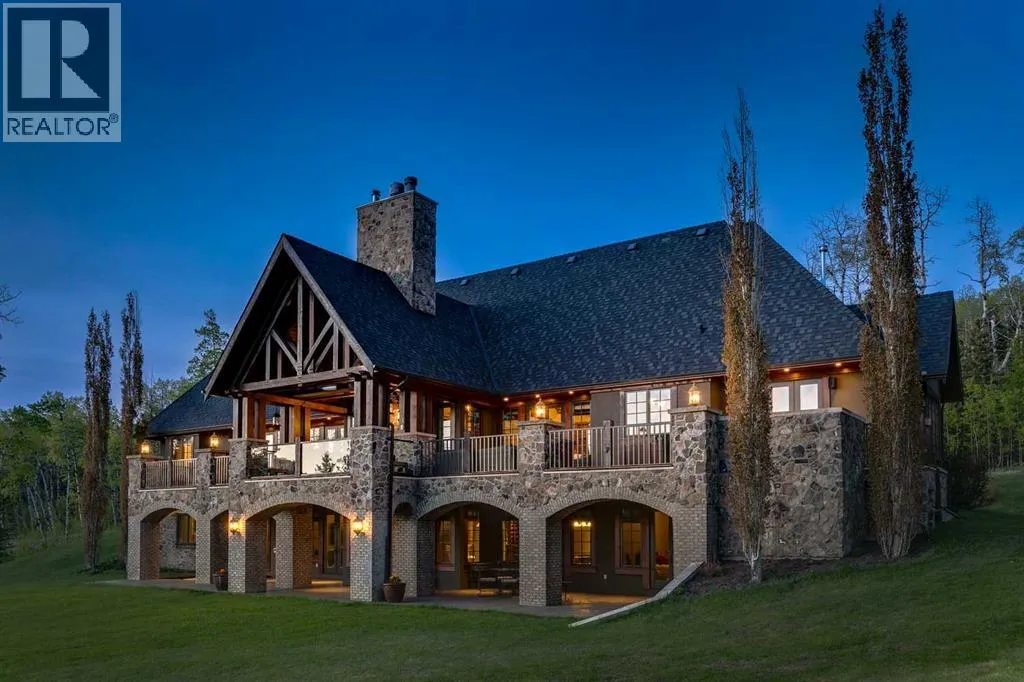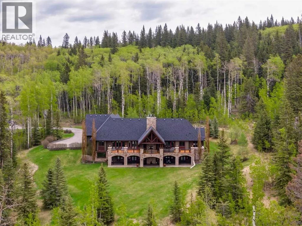25 minutes from southwest Calgary city limits, this timber and stone masterpiece is set against the backdrop of the majestic Rockies, embraced by rolling ranch lands that offer endless natural beauty. Nestled between Brown-Lowery Provincial Park and Kananaskis Forest Reserve the home promises a lifestyle rooted in nature and refined living . The nearby charming towns of Millarville, Black Diamond and Bragg Creek host festivals and markets year round along with access to esteemed schools, shopping, entertainment and medical facilities. This 2011 SAM AwardâBest New Custom Home-winning residence captivates with its stone fireplaces, exposed timber beams, tall French doors under vaulted ceilings. By design, mornings begin in a bright courtyard featuring a serene fountain, while evenings are reserved for unwinding on a west-facing deck that showcases sunsets and mountain vistas âas far as the eye can see.â With amenities like a built-in gas BBQ, an outdoor stone fireplace, and overhead heaters beneath the shelter of a timber truss roof, every season is met with inviting warmth and style. The homeâs seamless flow unites a one and half story main floor, a walkout lower level, and an upper loft that can be converted to feature a fourth bedroom, ensuite bath and private denâtotaling 6,561 square feet of thoughtfully planned living space. The chefâs kitchen is a dream come true, featuring custom-built alder cabinets, an Aga vented gas range, an integrated fridge and freezer, and a plumbed coffee maker. This culinary space adjoins rooms that facilitate both formal dining and casual family gatherings, ensuring that every meal becomes a shared experience. True to its natural spirit, the home is built almost entirely of organic materials. A copper-seamed Coppola roof crowns the exterior alongside natural stone and brick facades, while reclaimed hardwoods and honed stone floors lend an artisanal touch throughout. Metal-clad fir windows and oversized French doors open onto wood -planked decks that embrace the walkout patio and extend to the hot tub areaâperfect for relaxing or entertaining in style. A Scandinavian-inspired spa, a three-piece bath, and a dedicated gym further round out a suite of wellness-oriented features. Inside, vaulted ceilings accented by fir timber beam trusses create a grand yet inviting atmosphere. Stone and granite countertops provide a luxurious touch in every room. Additional highlights include a home theater, wine cellar, billiards room, and a striking Tulikivi fireplace that anchors memorable family moments. An ensuite bedroom on the lower level ensures comfort and privacy for guests or extended family. Modern living integrated with timeless design. State-of-the-art equipment all working together to keep the air, water, and environment healthy, clean, and comfortable year-round. This move-in ready estate awaits your private viewing. (id:27476)