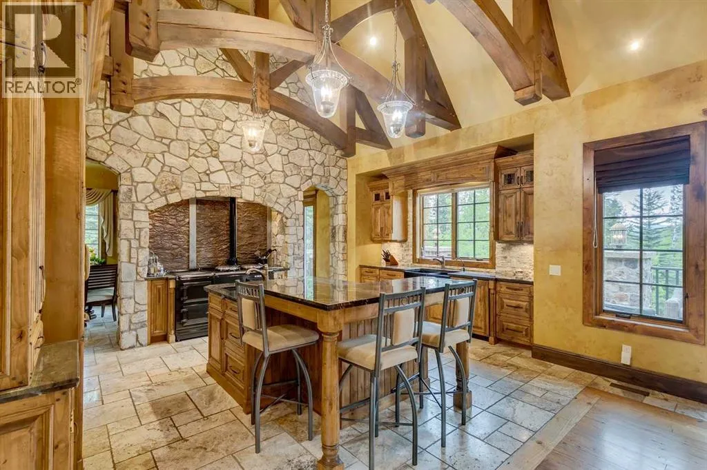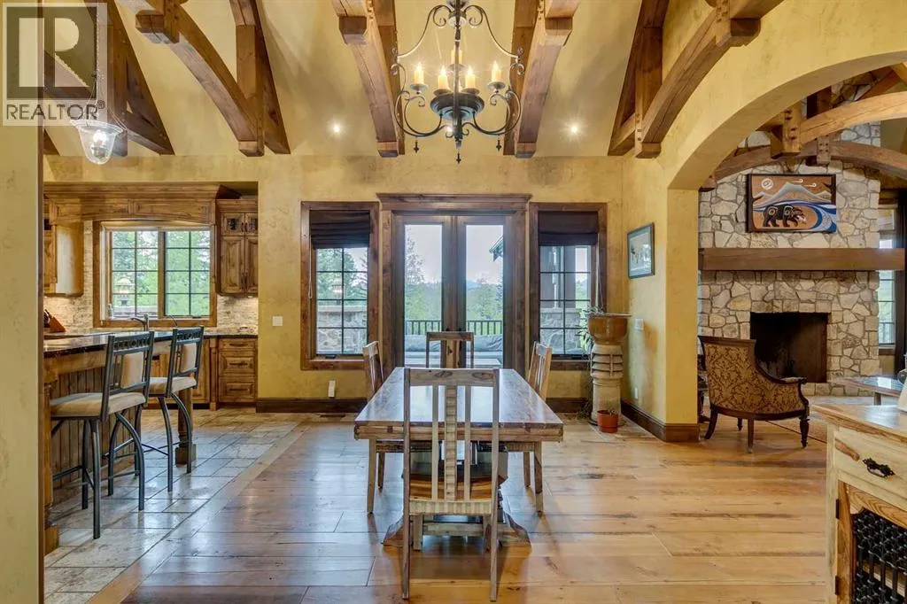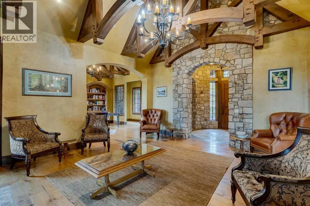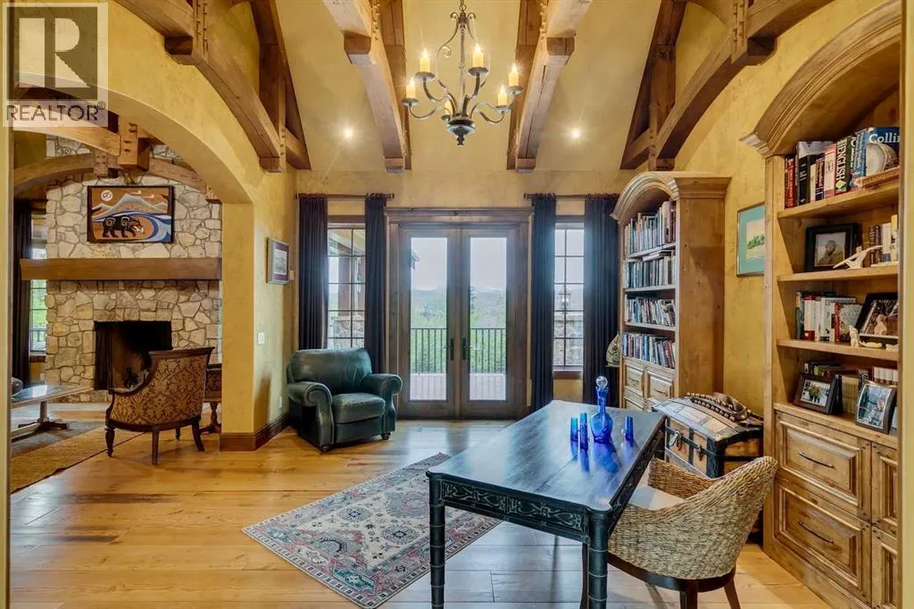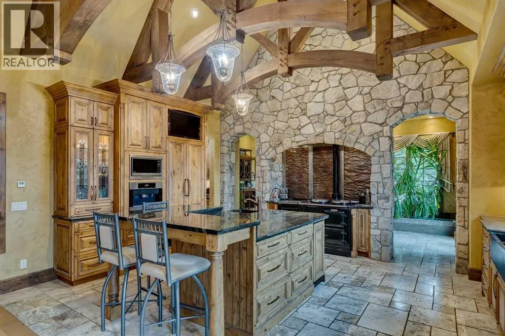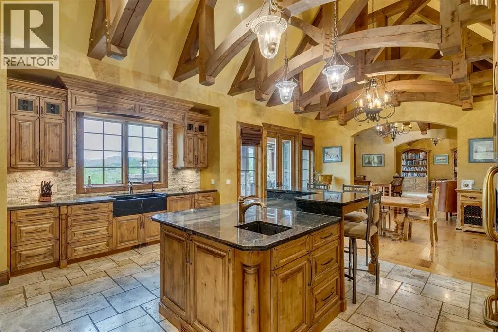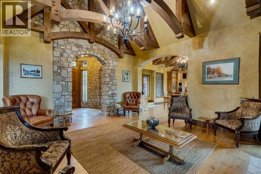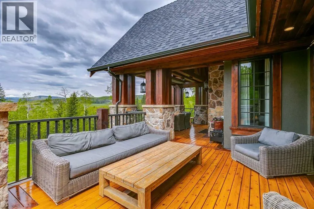 25 minutes from southwest Calgary city limits, this timber and stone masterpiece is set against the backdrop of the majestic Rockies, embraced by rolling ranch lands that offer endless natural beauty. Nestled between Brown-Lowery Provincial Park and Kananaskis Forest Reserve the home promises a lifestyle rooted in nature and refined living . The nearby charming towns of Millarville, Black Diamond and Bragg Creek host festivals and markets year round along with access to esteemed schools, shopping, entertainment and medical facilities. This 2011 SAM AwardâBest New Custom Home-winning residence captivates with its stone fireplaces, exposed timber beams, tall French doors under vaulted ceilings. By design, mornings begin in a bright courtyard featuring a serene fountain, while evenings are reserved for unwinding on a west-facing deck that showcases sunsets and mountain vistas âas far as the eye can see.â With amenities like a built-in gas BBQ, an outdoor stone fireplace, and overhead heaters beneath the shelter of a timber truss roof, every season is met with inviting warmth and style. The homeâs seamless flow unites a one and half story main floor, a walkout lower level, and an upper loft that can be converted to feature a fourth bedroom, ensuite bath and private denâtotaling 6,561 square feet of thoughtfully planned living space. The chefâs kitchen is a dream come true, featuring custom-built alder cabinets, an Aga vented gas range, an integrated fridge and freezer, and a plumbed coffee maker. This culinary space adjoins rooms that facilitate both formal dining and casual family gatherings, ensuring that every meal becomes a shared experience. True to its natural spirit, the home is built almost entirely of organic materials. A copper-seamed Coppola roof crowns the exterior alongside natural stone and brick facades, while reclaimed hardwoods and honed stone floors lend an artisanal touch throughout. Metal-clad fir windows and oversized French doors open onto wood -planked decks that embrace the walkout patio and extend to the hot tub areaâperfect for relaxing or entertaining in style. A Scandinavian-inspired spa, a three-piece bath, and a dedicated gym further round out a suite of wellness-oriented features. Inside, vaulted ceilings accented by fir timber beam trusses create a grand yet inviting atmosphere. Stone and granite countertops provide a luxurious touch in every room. Additional highlights include a home theater, wine cellar, billiards room, and a striking Tulikivi fireplace that anchors memorable family moments. An ensuite bedroom on the lower level ensures comfort and privacy for guests or extended family. Modern living integrated with timeless design. State-of-the-art equipment all working together to keep the air, water, and environment healthy, clean, and comfortable year-round. This move-in ready estate awaits your private viewing. (id:27476)