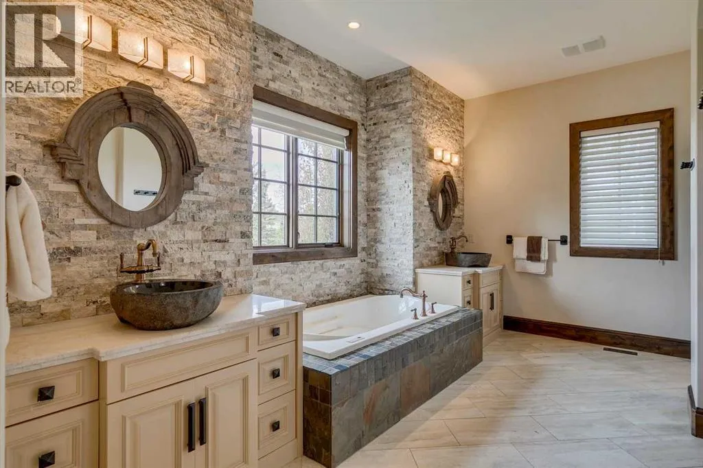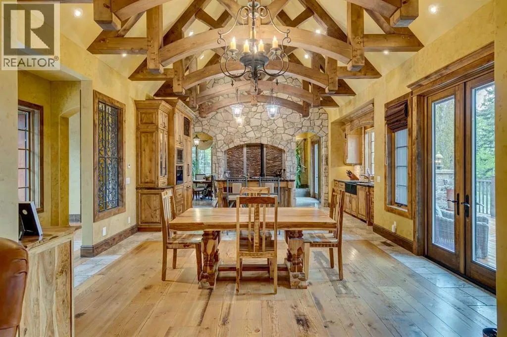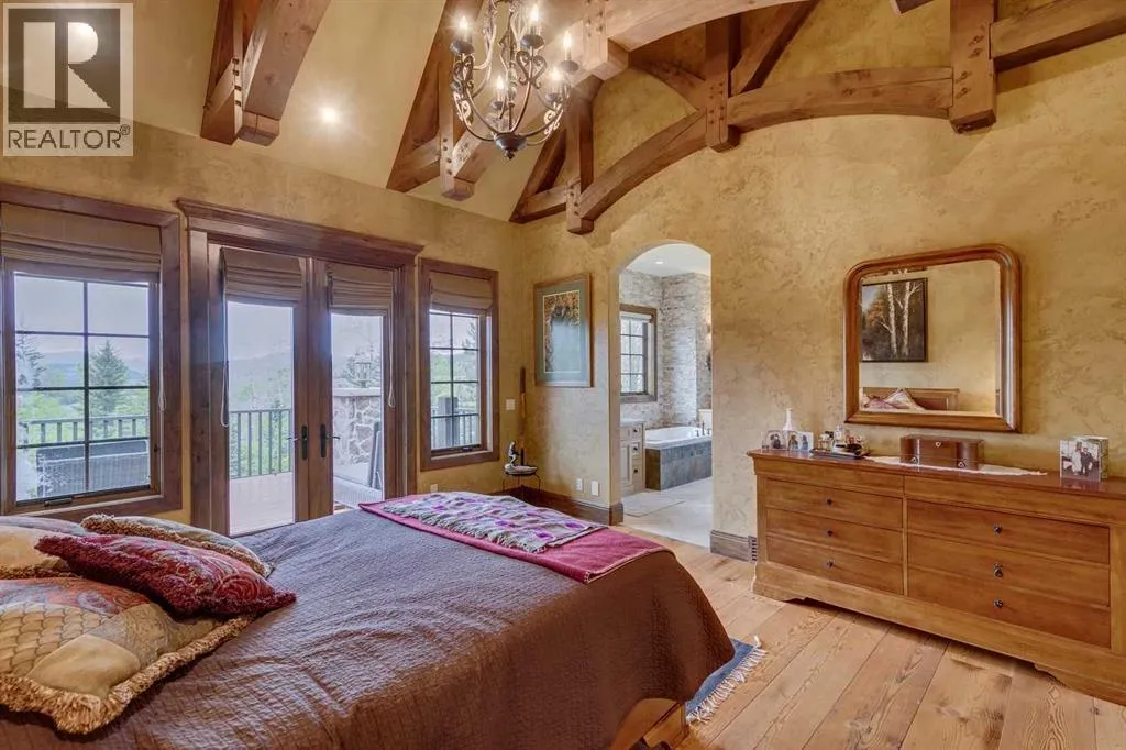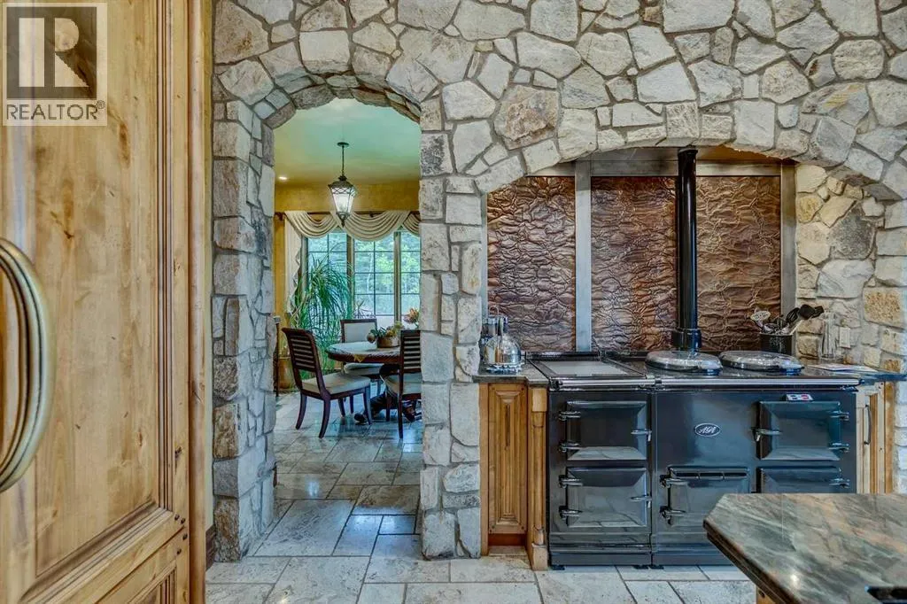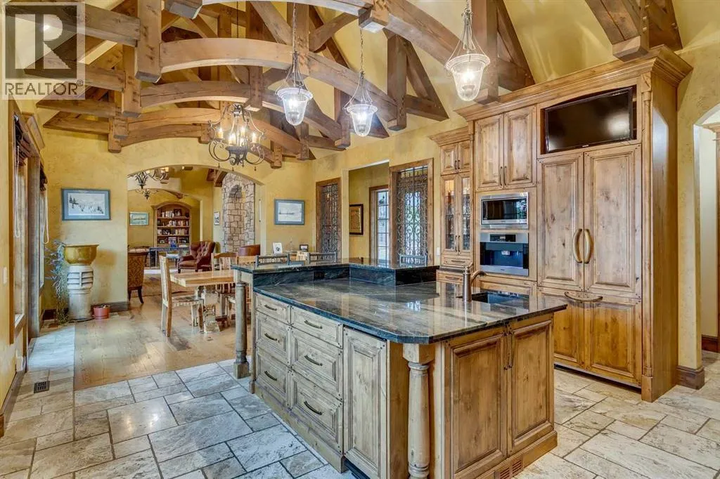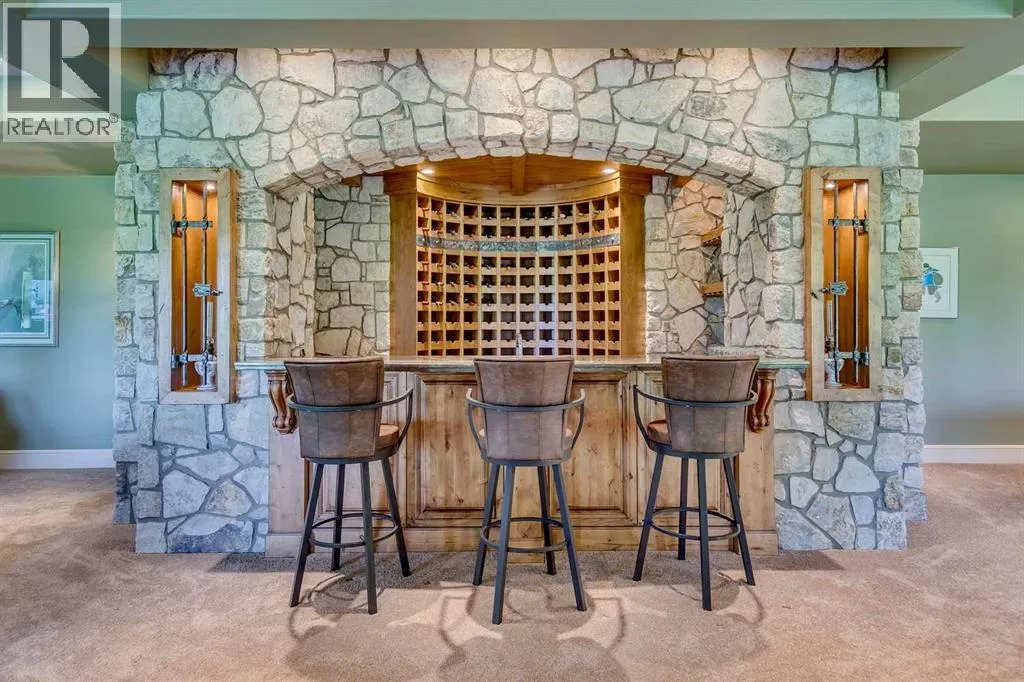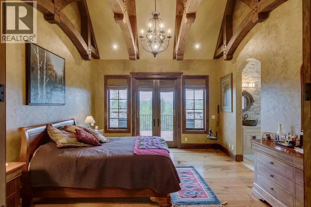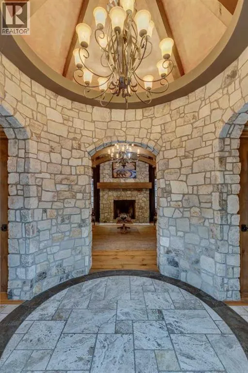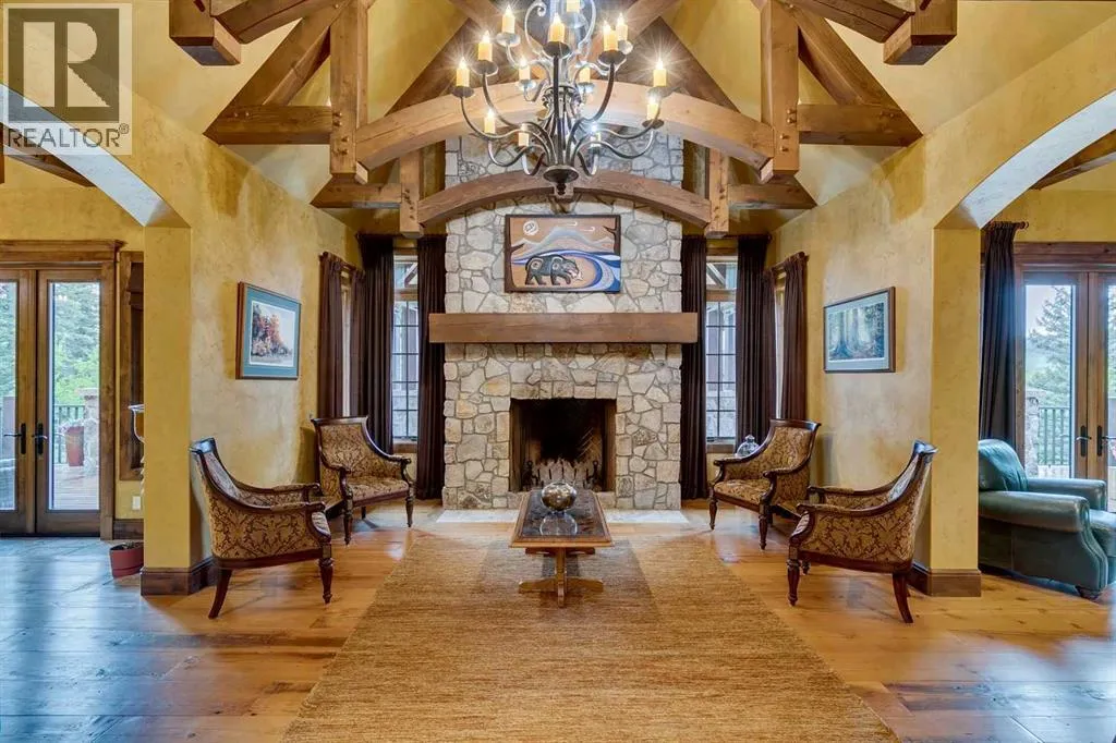 25 minutes from southwest Calgary city limits, this timber and stone masterpiece is set against the backdrop of the majestic Rockies, embraced by rolling ranch lands that offer endless natural beauty. Nestled between Brown-Lowery Provincial Park and Kananaskis Forest Reserve the home promises a lifestyle rooted in nature and refined living . The nearby charming towns of Millarville, Black Diamond and Bragg Creek host festivals and markets year round along with access to esteemed schools, shopping, entertainment and medical facilities. This 2011 SAM AwardâBest New Custom Home-winning residence captivates with its stone fireplaces, exposed timber beams, tall French doors under vaulted ceilings. By design, mornings begin in a bright courtyard featuring a serene fountain, while evenings are reserved for unwinding on a west-facing deck that showcases sunsets and mountain vistas âas far as the eye can see.â With amenities like a built-in gas BBQ, an outdoor stone fireplace, and overhead heaters beneath the shelter of a timber truss roof, every season is met with inviting warmth and style. The homeâs seamless flow unites a one and half story main floor, a walkout lower level, and an upper loft that can be converted to feature a fourth bedroom, ensuite bath and private denâtotaling 6,561 square feet of thoughtfully planned living space. The chefâs kitchen is a dream come true, featuring custom-built alder cabinets, an Aga vented gas range, an integrated fridge and freezer, and a plumbed coffee maker. This culinary space adjoins rooms that facilitate both formal dining and casual family gatherings, ensuring that every meal becomes a shared experience. True to its natural spirit, the home is built almost entirely of organic materials. A copper-seamed Coppola roof crowns the exterior alongside natural stone and brick facades, while reclaimed hardwoods and honed stone floors lend an artisanal touch throughout. Metal-clad fir windows and oversized French doors open onto wood -planked decks that embrace the walkout patio and extend to the hot tub areaâperfect for relaxing or entertaining in style. A Scandinavian-inspired spa, a three-piece bath, and a dedicated gym further round out a suite of wellness-oriented features. Inside, vaulted ceilings accented by fir timber beam trusses create a grand yet inviting atmosphere. Stone and granite countertops provide a luxurious touch in every room. Additional highlights include a home theater, wine cellar, billiards room, and a striking Tulikivi fireplace that anchors memorable family moments. An ensuite bedroom on the lower level ensures comfort and privacy for guests or extended family. Modern living integrated with timeless design. State-of-the-art equipment all working together to keep the air, water, and environment healthy, clean, and comfortable year-round. This move-in ready estate awaits your private viewing. (id:27476)