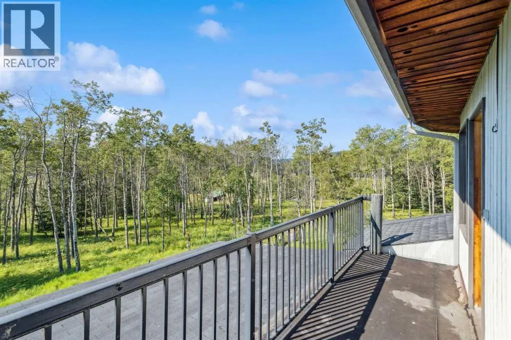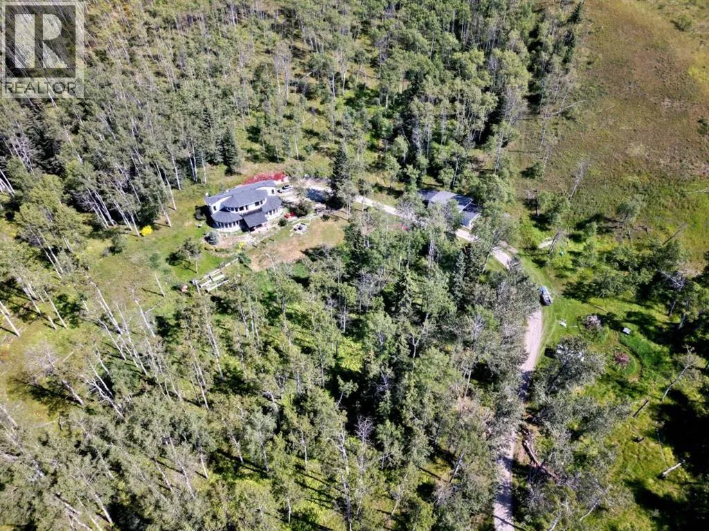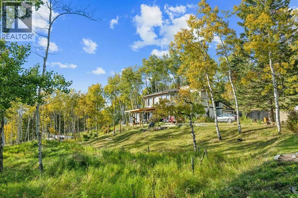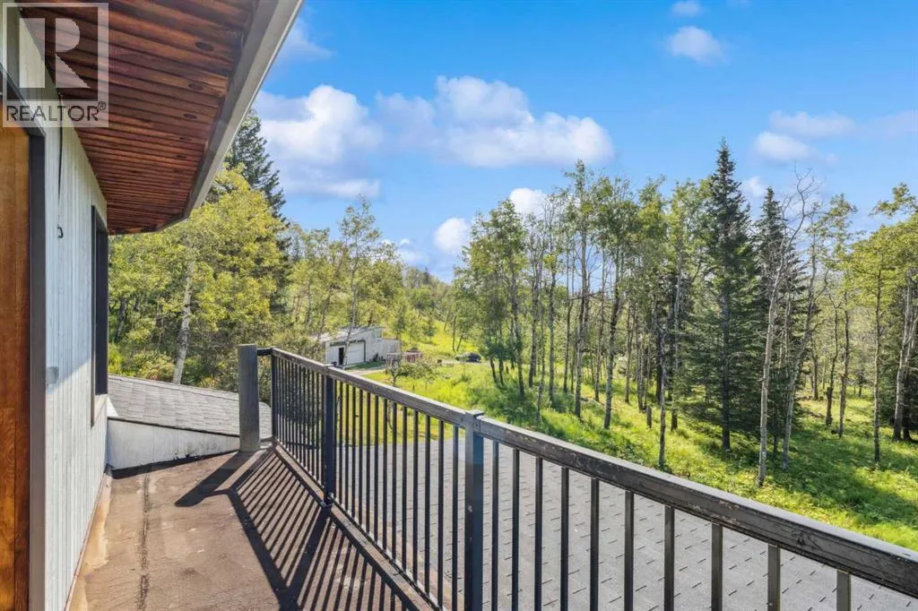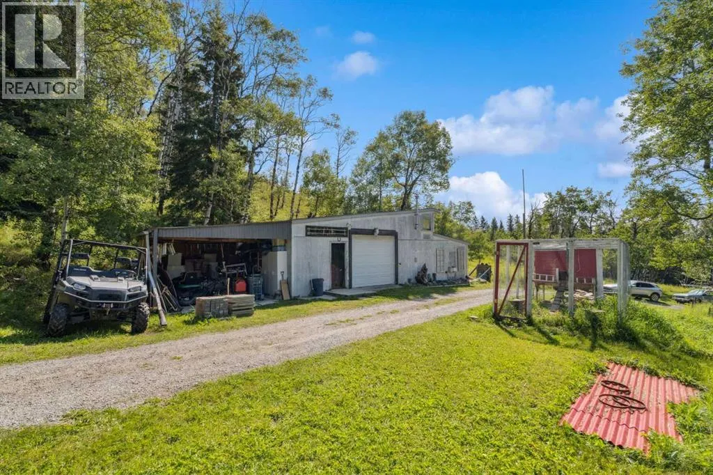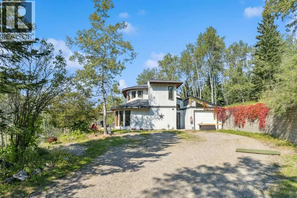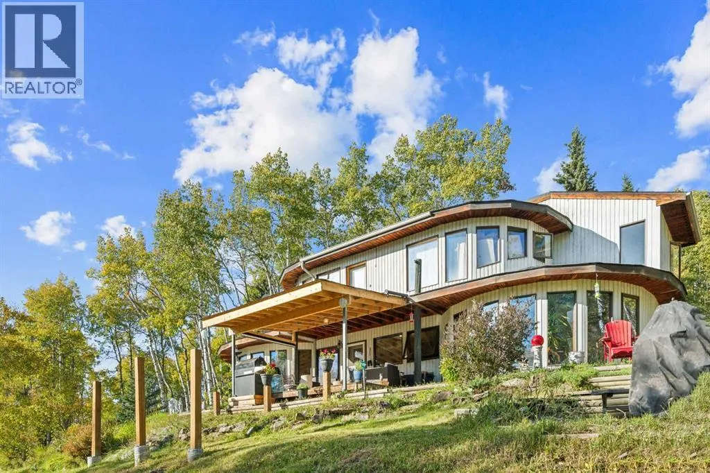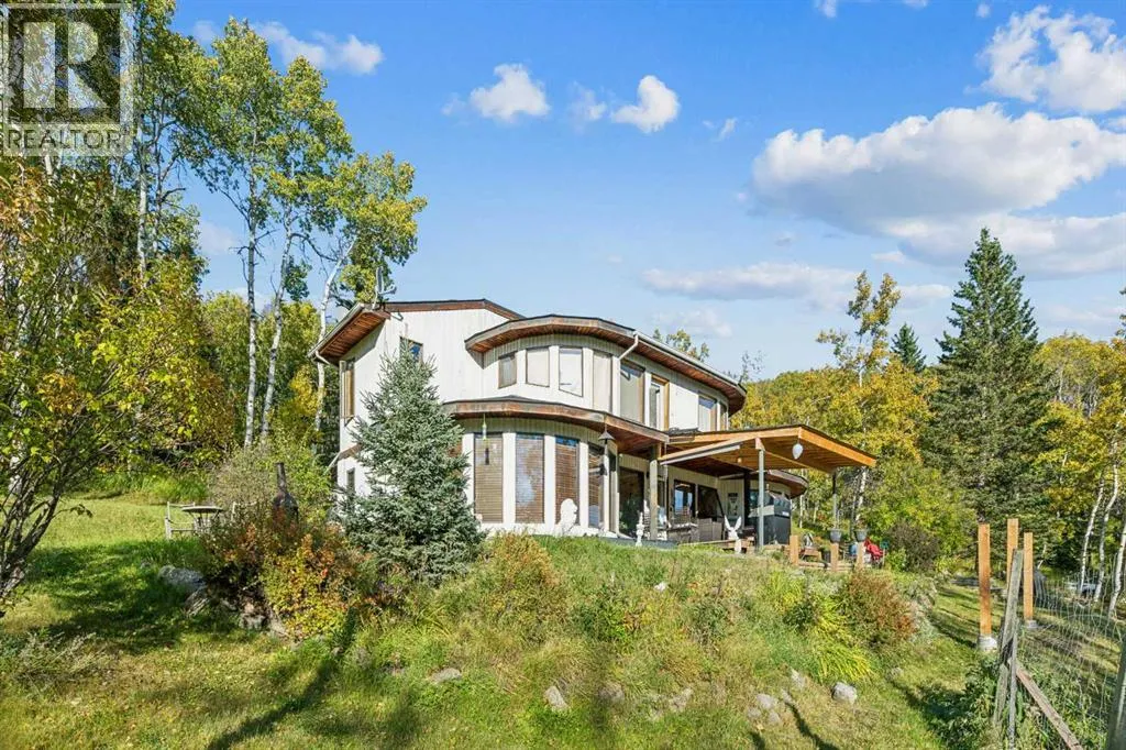 An acreage with so much potential! This property features a unique home, a great location, a large workshop, a pond, and a hilltop with amazing views of the foothills and 3 valleys that could be another building site. The 23 acre property is conveniently located 10 minutes south of Bragg Creek, and very close to 320 acres of crown land. The house features very unique architecture, with curved walls and lots of windows. The main floor has a recently built custom kitchen with large island, a living area wrapped around with a curved wall, an office (or study room), a recently refinished bathroom, and a large bedroom. The upper floor features a primary bedroom with en suite bathroom, a workout or seating area, access to two decks, and a large walk-in dressing area and closet. The house has a large single car garage currently being used for storage. The location is quite private with a long driveway that winds past a picturesque pond that would be great for skating in winter. The workshop is quite large and would be a great place for setting up any number of crafty activities or could be converted into a larger garage. One end of this workshop has an integrated studio & green house space. This home could be the coolest little weekend getaway or artist retreat, or could be a great second residence while you build a smaller house up on the ridge to take advantage of the amazing views. Come and picture the possibilities today! (id:27476)