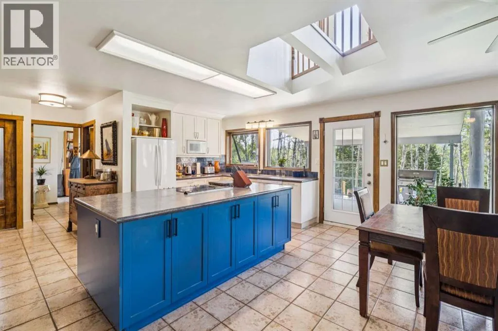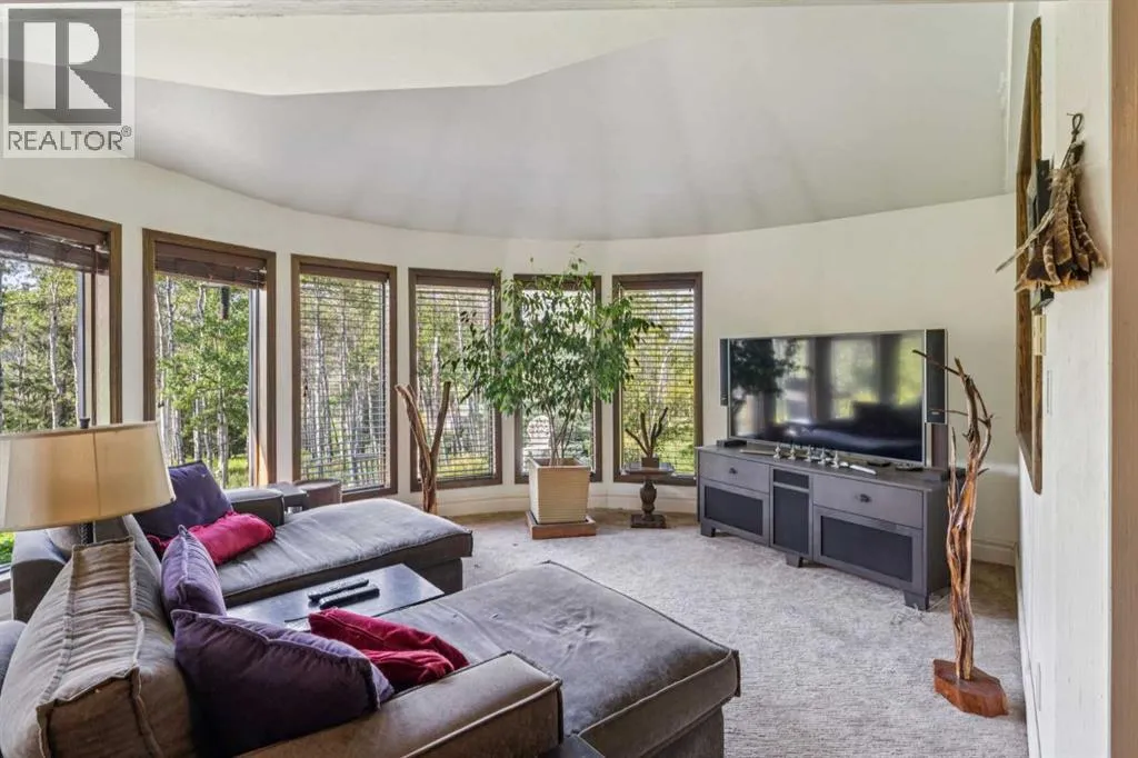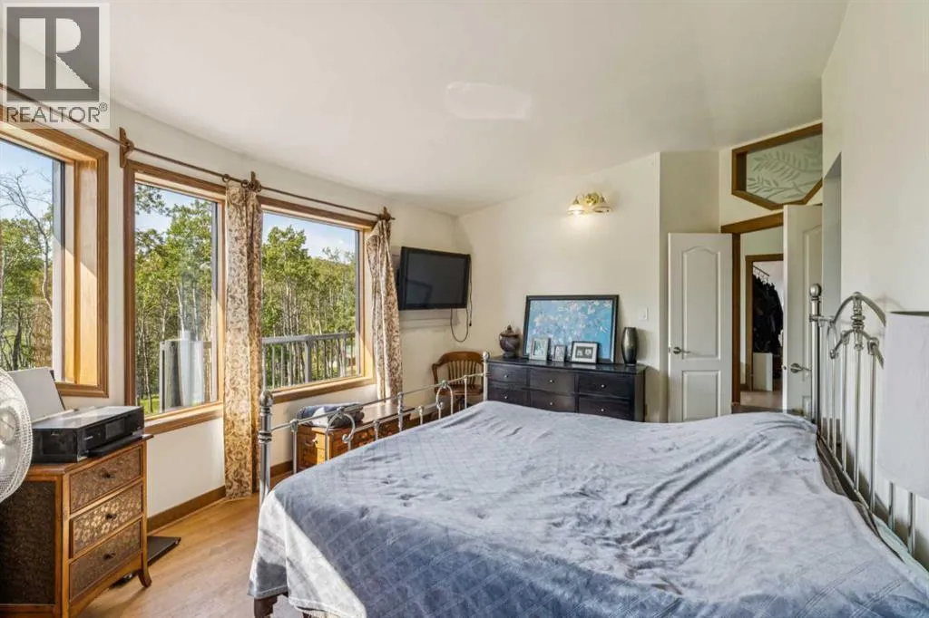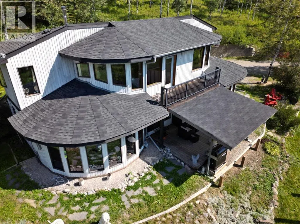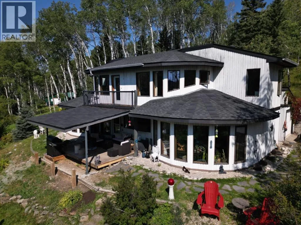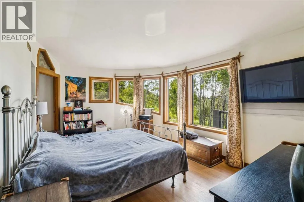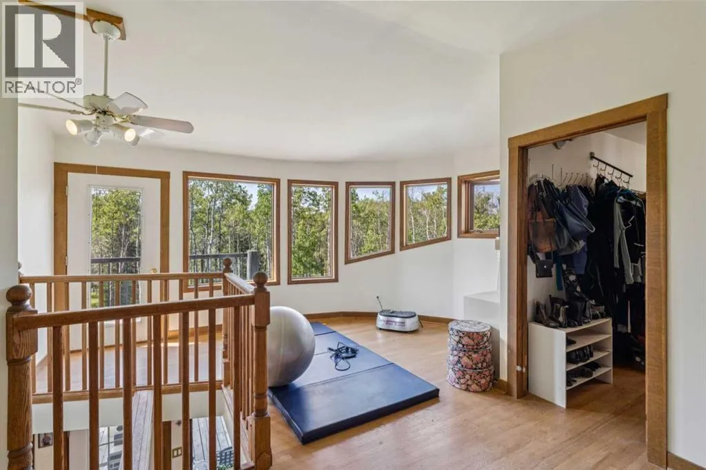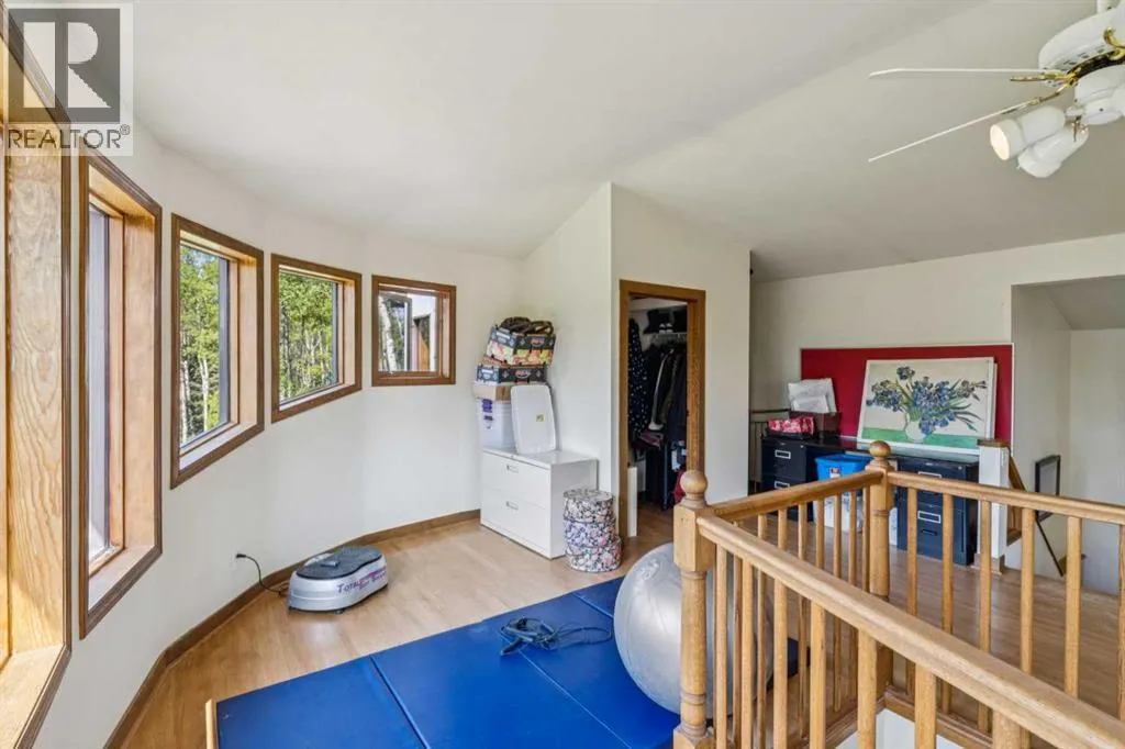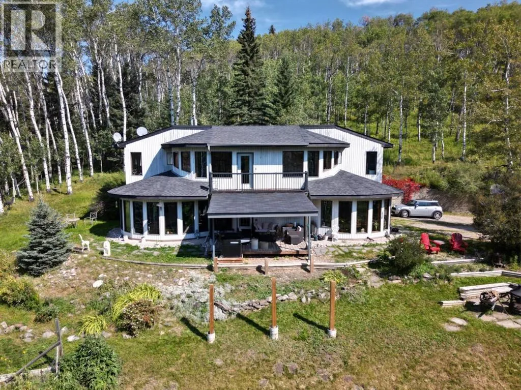 An acreage with so much potential! This property features a unique home, a great location, a large workshop, a pond, and a hilltop with amazing views of the foothills and 3 valleys that could be another building site. The 23 acre property is conveniently located 10 minutes south of Bragg Creek, and very close to 320 acres of crown land. The house features very unique architecture, with curved walls and lots of windows. The main floor has a recently built custom kitchen with large island, a living area wrapped around with a curved wall, an office (or study room), a recently refinished bathroom, and a large bedroom. The upper floor features a primary bedroom with en suite bathroom, a workout or seating area, access to two decks, and a large walk-in dressing area and closet. The house has a large single car garage currently being used for storage. The location is quite private with a long driveway that winds past a picturesque pond that would be great for skating in winter. The workshop is quite large and would be a great place for setting up any number of crafty activities or could be converted into a larger garage. One end of this workshop has an integrated studio & green house space. This home could be the coolest little weekend getaway or artist retreat, or could be a great second residence while you build a smaller house up on the ridge to take advantage of the amazing views. Come and picture the possibilities today! (id:27476)