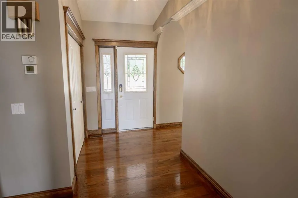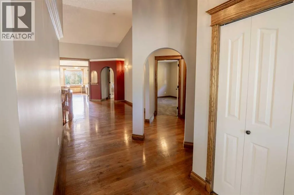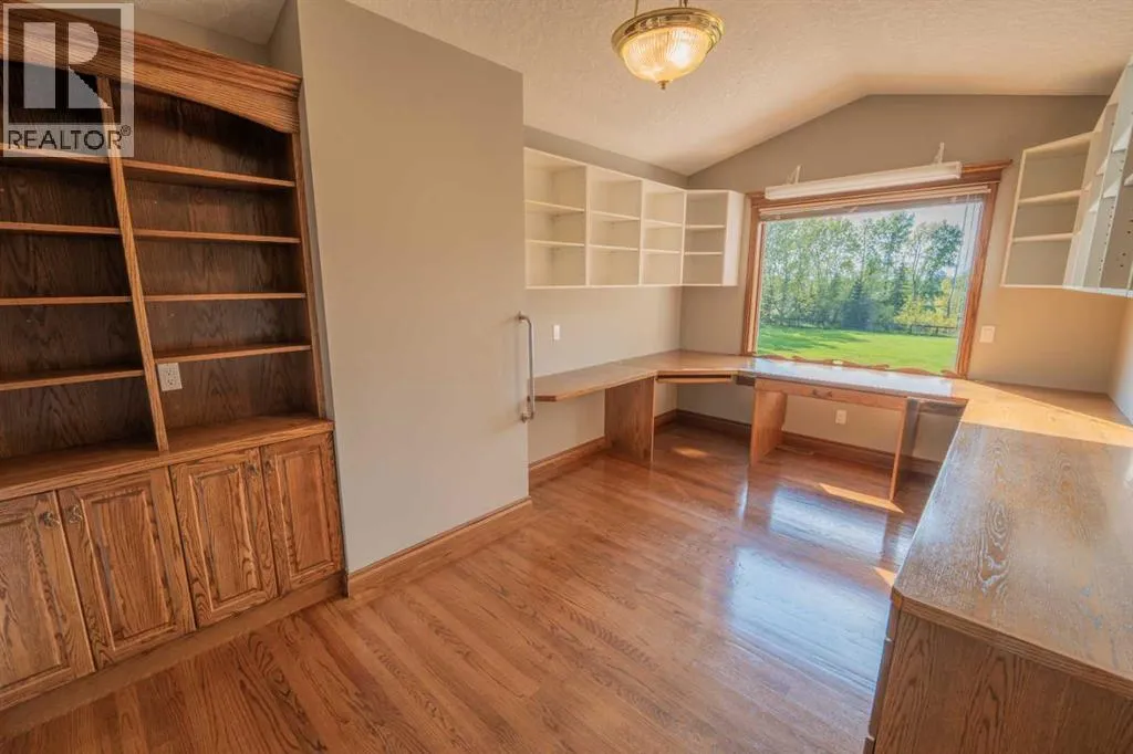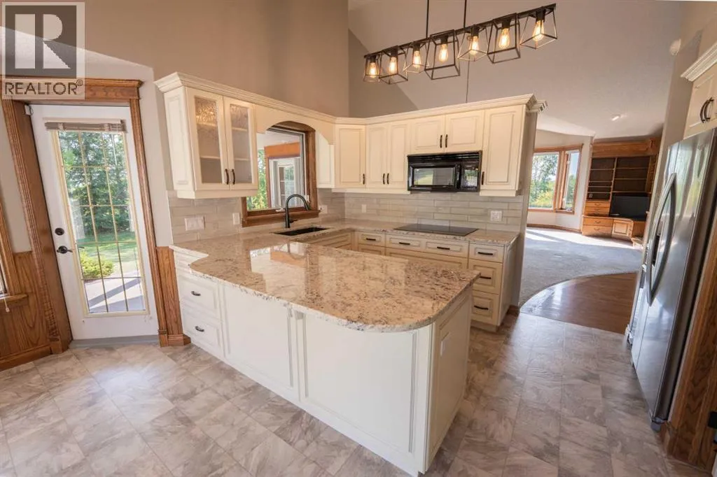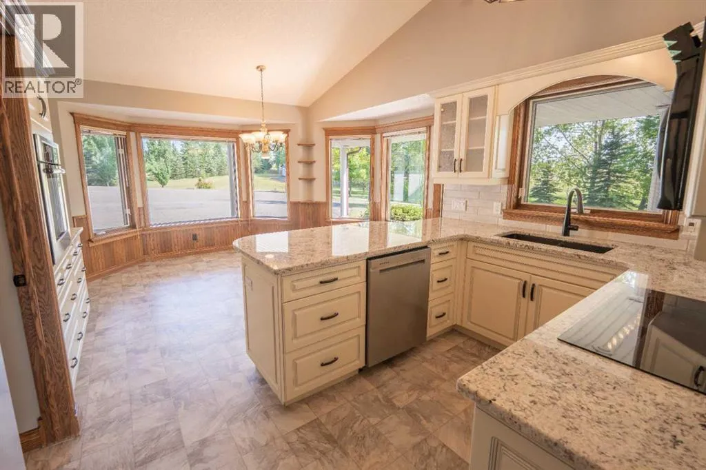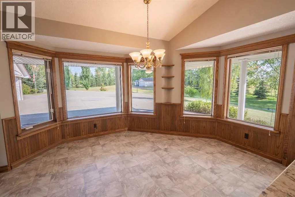 Nestled just north of Okotoks on just under four picturesque, park-like acres, this hillside bungalow offers an exceptional blend of privacy, tranquility, and convenienceâonly minutes from amenities, schools, and services.A gently curved driveway leads to the inviting wraparound front porch and ample guest parking. Inside, the spacious foyer opens to hardwood floors, soaring vaulted ceilings, and a beautifully designed living and dining area highlighted by a custom entertainment centre and a gas fireplace with mantle. The kitchen features a cozy breakfast nook, oversized pantry, and direct access to the wraparound deckâperfect for outdoor dining and barbecuing. An enclosed sunroom provides additional year-round enjoyment or the option of a greenhouse. The main level is complete with two generously sized bedrooms, including a comfortable primary retreat.The fully developed walkout lower level is designed for family living and entertaining. A curved staircase leads to the expansive billiard and family rooms, complemented by a guest bedroom with ensuite access to a five-piece bath, a hot tub room awaiting your finishing touches, plus an office, bar area, and mechanical room with convenient service access to the garage.Car enthusiasts and hobbyists will appreciate the heated, insulated four-car attached garage, offering abundant space and functionality. Outdoors, mature perimeter trees provide rare privacy, while the gently sloping landscape leads to private retreats, garden areas, and a water dugout that doubles as a charming skating rink in winter.This is a truly special property where peace, space, and nature come togetherâavailable for immediate possession. (id:27476)