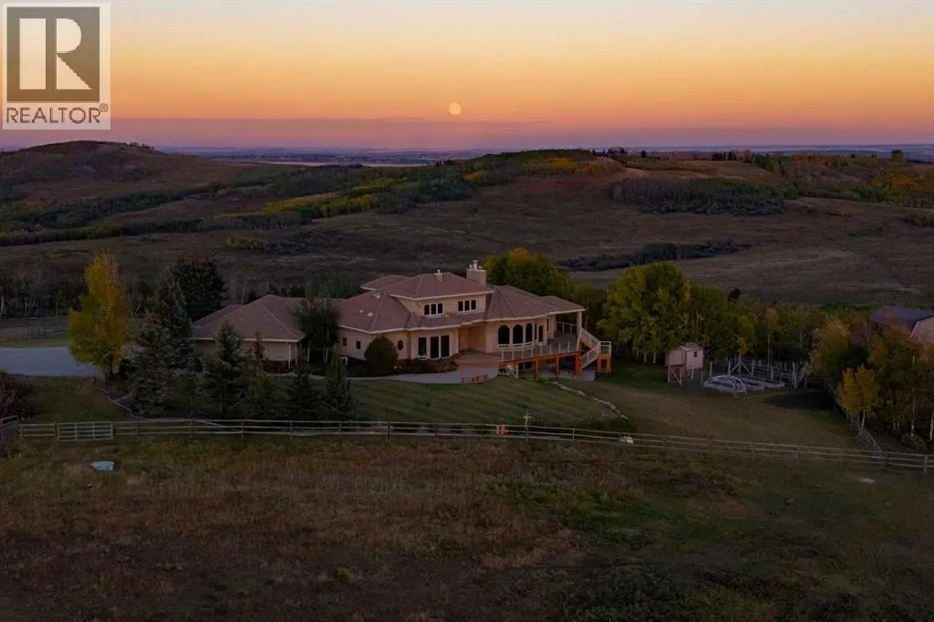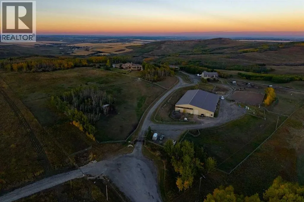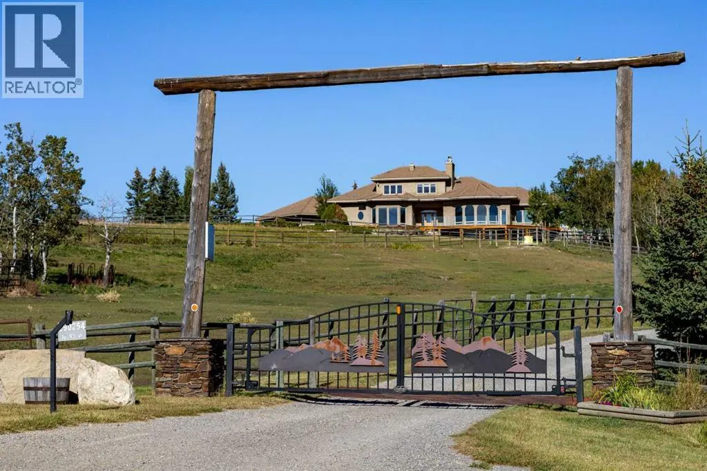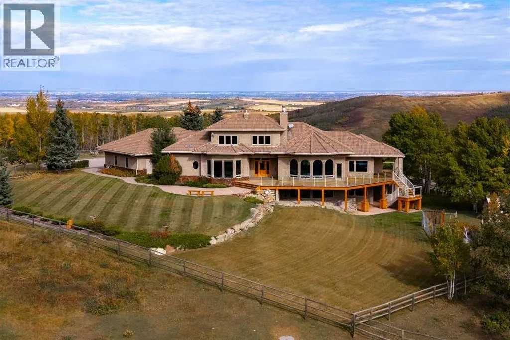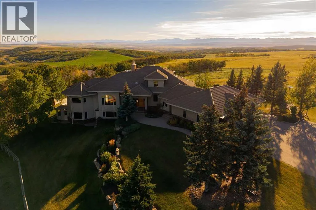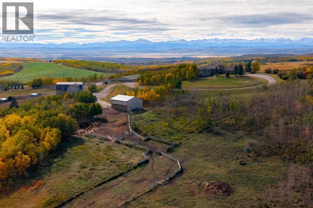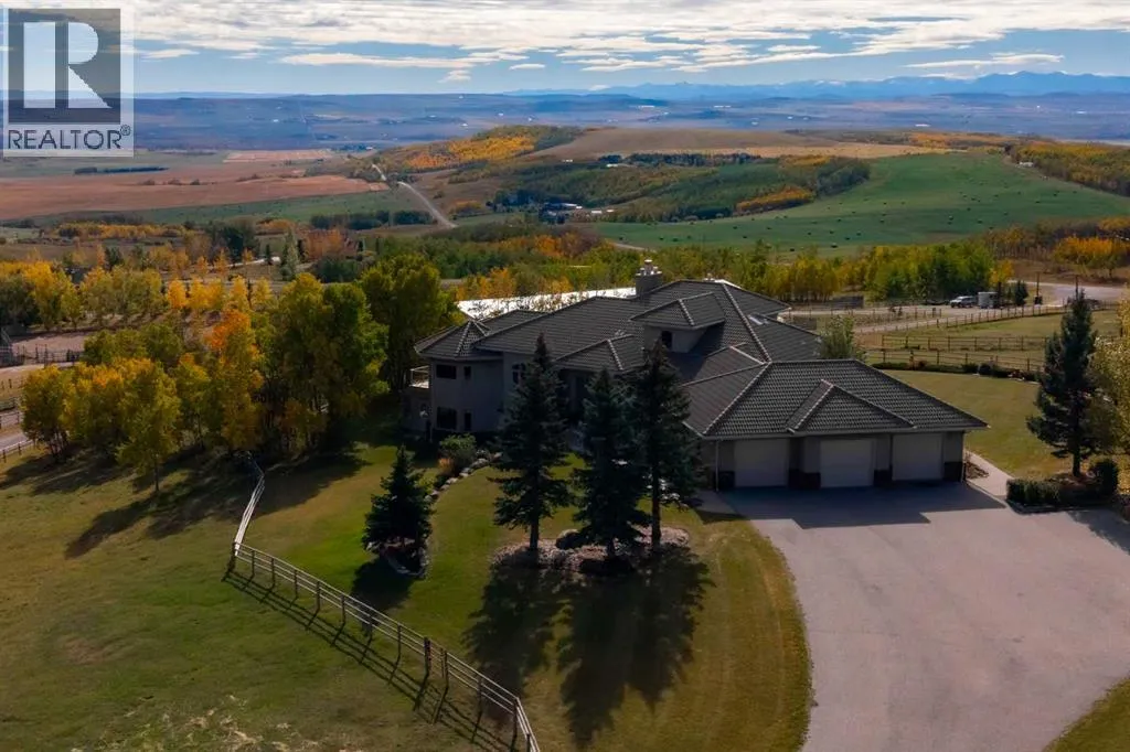 Welcome to an extraordinary 160-acre country estate where luxury, privacy, and equestrian excellence unite within a protected wildlife corridor. Panoramic views of the Rocky Mountains and Calgary skyline provide a breathtaking backdrop to this serene yet conveniently located property.A gated, rail-lined drive leads to a striking 3,483 sq.ft. custom walkout bungalow with over 6,200 sq.ft. of developed living space. Designed with light, proportion, and warmth in mind, this five-bedroom, five-bath residence features soaring ceilings, expansive windows, cherry hardwood floors, and handcrafted millwork. The flagstone foyer opens into a great room centered around a wood-burning stone fireplace that embodies both comfort and sophistication.The gourmet kitchen is a showpiece of design and function with granite countertops, birdâs-eye maple cabinetry, hand-forged hardware, high-end appliances, a copper hood fan, and cedar-lined vaulted ceiling. It flows seamlessly into the dining and living areas, extending to a wraparound cedar deck that frames sweeping mountain and pasture viewsâperfect for entertaining or quiet evenings outdoors.The spacious primary suite overlooks the Rocky Mountains and offers a private retreat with a gas adobe-style fireplace, deck access, walk-in closet, and spa-inspired ensuite. Thoughtful utility spaces include a custom mudroom, oversized pantry, and an exceptional laundry room. The fully developed walkout level provides a large recreation area with a second stone fireplace and abundant natural light.The homeâs timeless exterior features low-maintenance adobe-style stucco, natural stone accents, a clay tile roof, and covered verandas surrounded by professionally landscaped grounds with underground irrigation. Every element reflects an effortless blend of elegance, practicality, and connection to the land.Beyond the home lies a world-class equestrian facility designed for year-round enjoyment. A 70âx160â indoor riding arena with excellent footin g and natural light adjoins a main working barn featuring six box stalls, four tie stalls, a wash rack, heated tack room, and comfortable viewing lounge with full kitchen, laundry, and bathroom. A large garage bay provides ample room for trailers and equipment.A separate hip-roof barn includes 2,400 sq.ft. of inviting living quartersâideal for staff, guests, or extended familyâabove a fully insulated and heated shop with additional stalls. Outdoor amenities include a 100âx150â arena, multiple rail-lined paddocks, each with heated waterers and shelters and hay storage. A seasonal creek, rolling pasture, and aspen groves weave through private riding trails that invite exploration.A 3,000-gallon cistern, two wells, and a rainwater catch system support residential, agricultural, and equine needs, ensuring efficiency and sustainability.Only 28 minutes from South Calgary, 15 to Okotoks, 20 to Spruce Meadows, and 10 to Strathcona-Tweedsmuir School, this estate redefines country living. (id:27476)