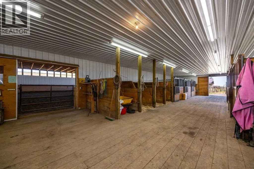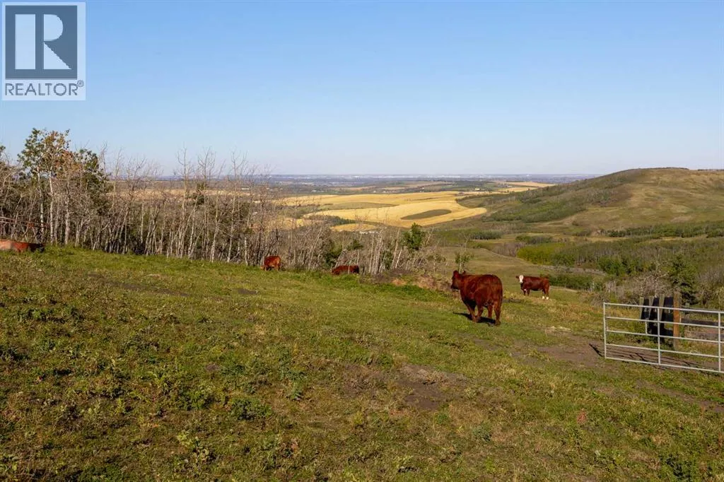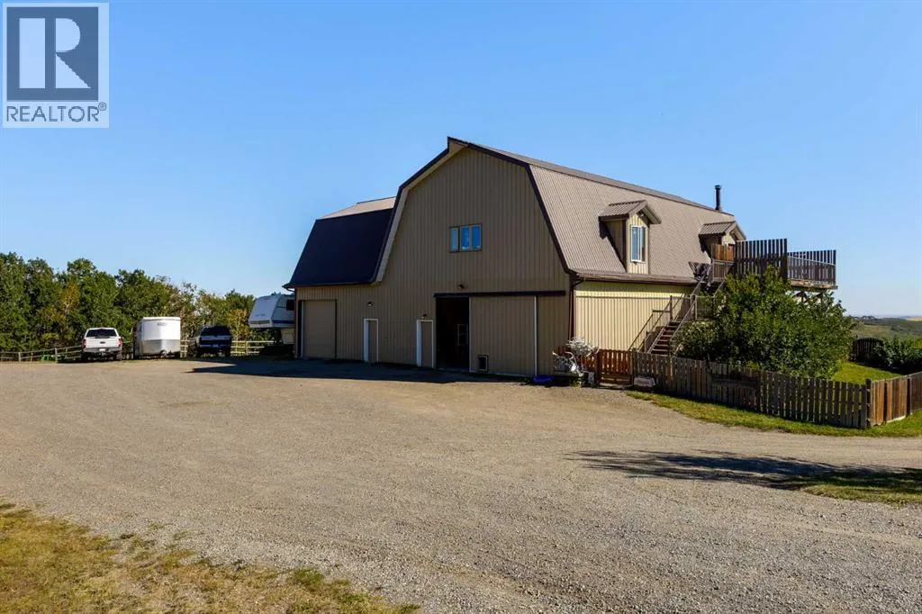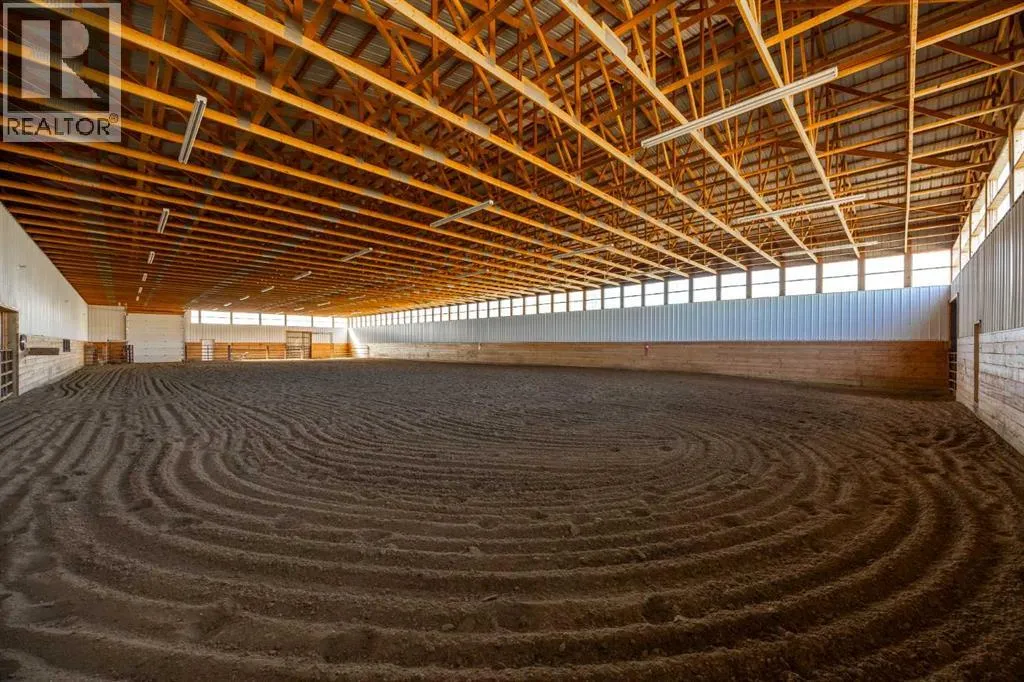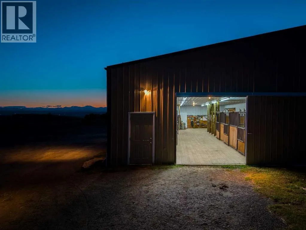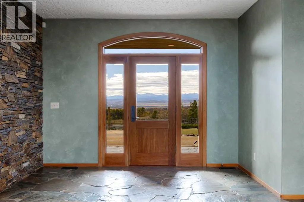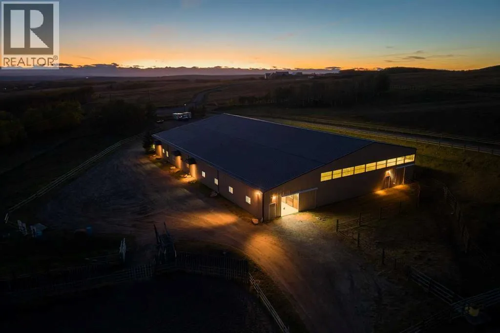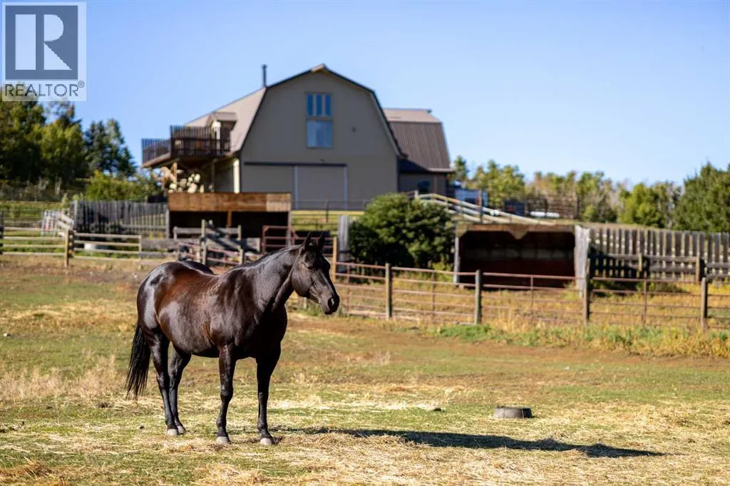 Welcome to an extraordinary 160-acre country estate where luxury, privacy, and equestrian excellence unite within a protected wildlife corridor. Panoramic views of the Rocky Mountains and Calgary skyline provide a breathtaking backdrop to this serene yet conveniently located property.A gated, rail-lined drive leads to a striking 3,483 sq.ft. custom walkout bungalow with over 6,200 sq.ft. of developed living space. Designed with light, proportion, and warmth in mind, this five-bedroom, five-bath residence features soaring ceilings, expansive windows, cherry hardwood floors, and handcrafted millwork. The flagstone foyer opens into a great room centered around a wood-burning stone fireplace that embodies both comfort and sophistication.The gourmet kitchen is a showpiece of design and function with granite countertops, birdâs-eye maple cabinetry, hand-forged hardware, high-end appliances, a copper hood fan, and cedar-lined vaulted ceiling. It flows seamlessly into the dining and living areas, extending to a wraparound cedar deck that frames sweeping mountain and pasture viewsâperfect for entertaining or quiet evenings outdoors.The spacious primary suite overlooks the Rocky Mountains and offers a private retreat with a gas adobe-style fireplace, deck access, walk-in closet, and spa-inspired ensuite. Thoughtful utility spaces include a custom mudroom, oversized pantry, and an exceptional laundry room. The fully developed walkout level provides a large recreation area with a second stone fireplace and abundant natural light.The homeâs timeless exterior features low-maintenance adobe-style stucco, natural stone accents, a clay tile roof, and covered verandas surrounded by professionally landscaped grounds with underground irrigation. Every element reflects an effortless blend of elegance, practicality, and connection to the land.Beyond the home lies a world-class equestrian facility designed for year-round enjoyment. A 70âx160â indoor riding arena with excellent footin g and natural light adjoins a main working barn featuring six box stalls, four tie stalls, a wash rack, heated tack room, and comfortable viewing lounge with full kitchen, laundry, and bathroom. A large garage bay provides ample room for trailers and equipment.A separate hip-roof barn includes 2,400 sq.ft. of inviting living quartersâideal for staff, guests, or extended familyâabove a fully insulated and heated shop with additional stalls. Outdoor amenities include a 100âx150â arena, multiple rail-lined paddocks, each with heated waterers and shelters and hay storage. A seasonal creek, rolling pasture, and aspen groves weave through private riding trails that invite exploration.A 3,000-gallon cistern, two wells, and a rainwater catch system support residential, agricultural, and equine needs, ensuring efficiency and sustainability.Only 28 minutes from South Calgary, 15 to Okotoks, 20 to Spruce Meadows, and 10 to Strathcona-Tweedsmuir School, this estate redefines country living. (id:27476)