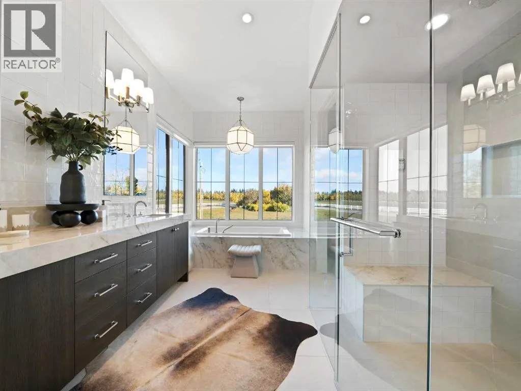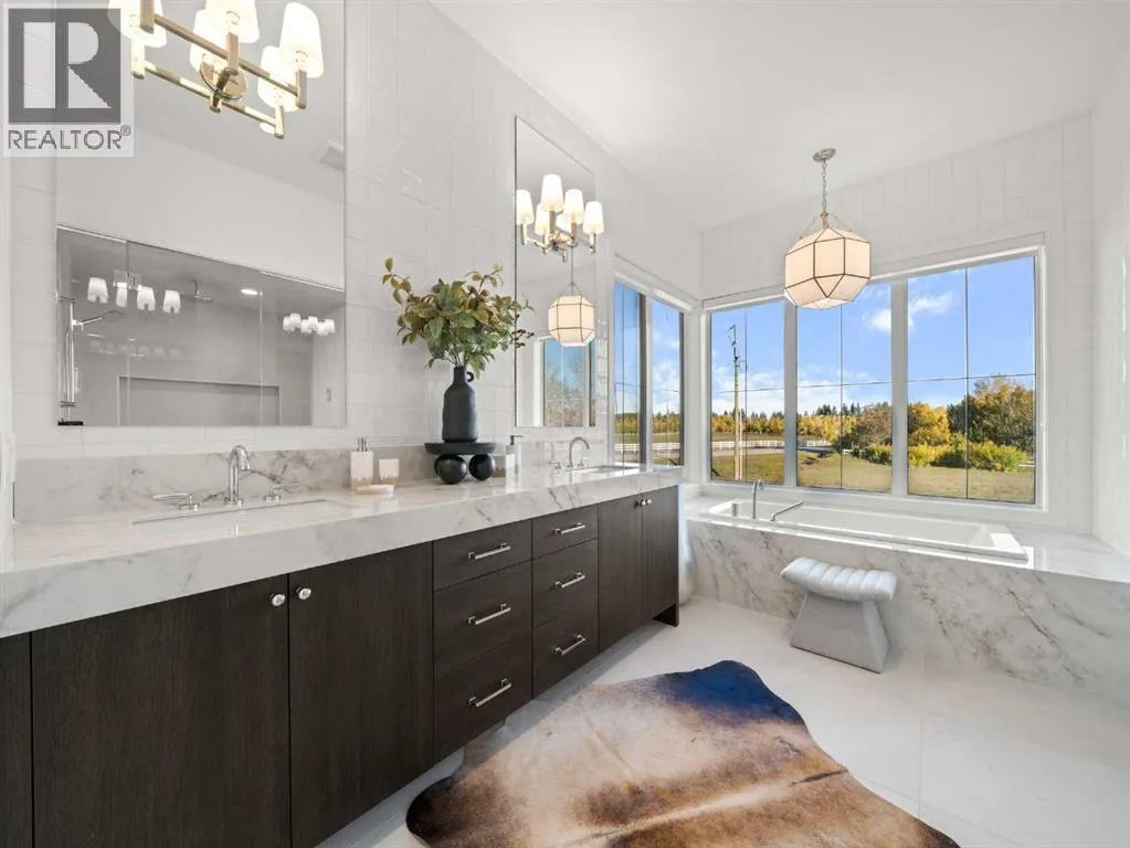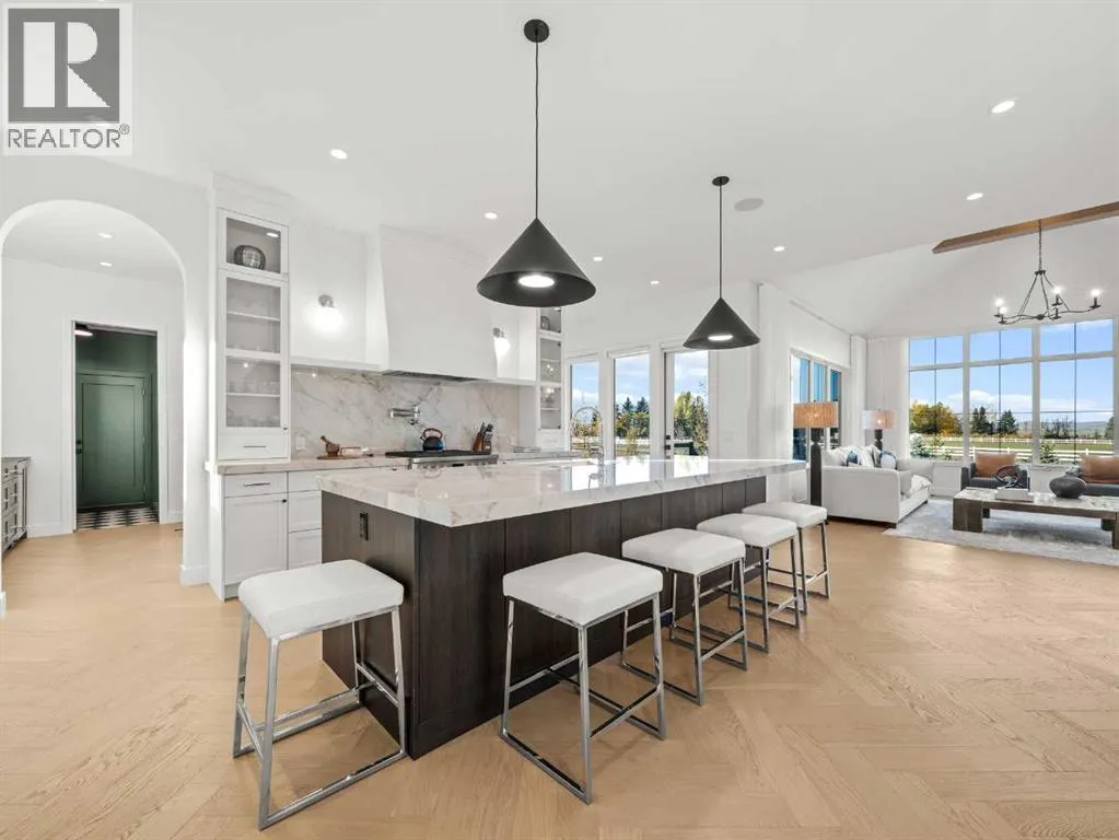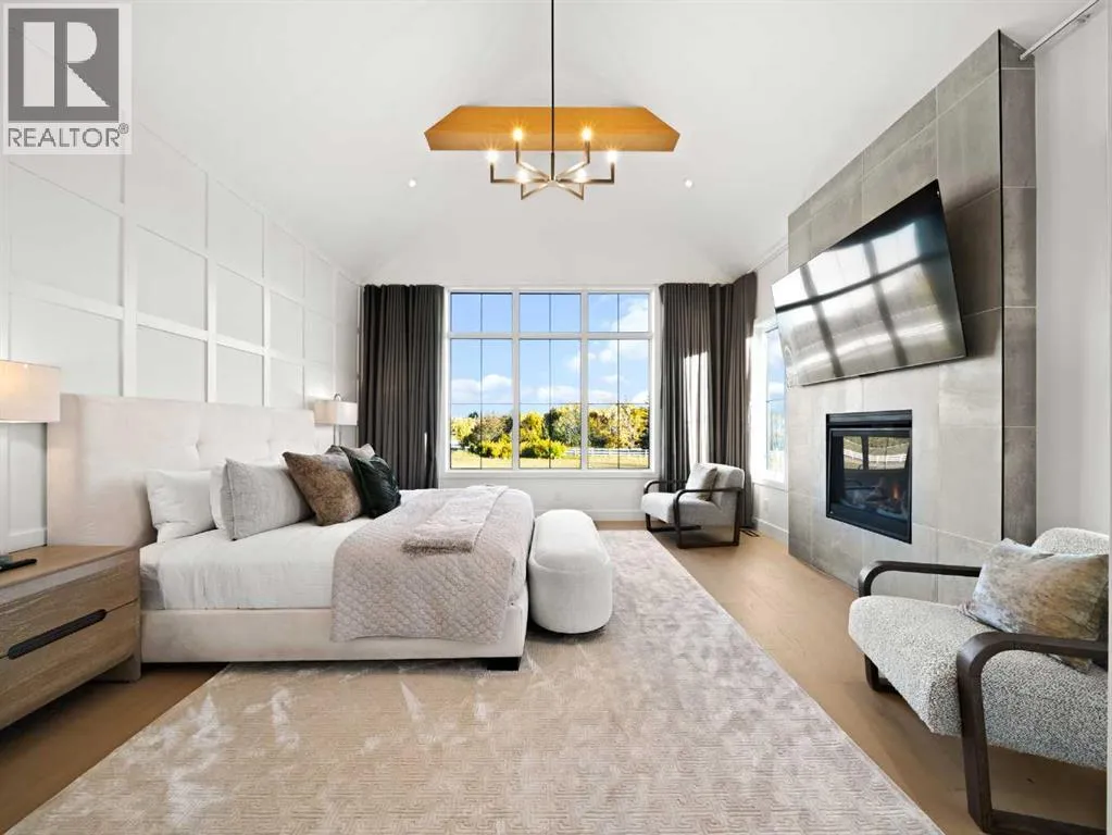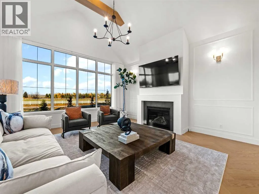 OPEN HOUSE - Sunday (November 2) from 1 pm till 3 pm! Nestled in the rolling landscapes just outside Southwest Calgary, this stunning custom-built luxury estate offers the perfect balance between serene country living and urban convenience. Located on a 2.4-acre private lot in a quiet cul-de-sac surrounded by other executive homes, this brand-new residence combines timeless craftsmanship, elegant design, and modern functionality, just 3 minutes from Spruce Meadows and 30 minutes from downtown Calgary.With over 5,500 sq. ft. of finished living space, this home was built with meticulous attention to detail. Step inside to discover a bright, open layout filled with natural light, soaring ceilings, and elegant arched doorways that bring classic charm into the modern design. The main living area features large picture windows with mountain views, a beautiful fireplace centrepiece, and seamless flow into the dining area and spacious terrace, perfect for entertaining or relaxing while enjoying the peaceful scenery.The chef-inspired kitchen is a true showpiece, boasting an oversized island, Brazilian porcelain countertops, custom cabinetry, and Italian Fulgor Milano appliances. A fully equipped butlerâs pantry adds functionality and extra storage, while the adjoining mudroom connects to a triple attached garage designed for convenience and versatility.The main-floor primary suite feels like a private retreat with vaulted ceilings, a fireplace, and a private covered deck for morning coffee or evening wine. The spa-like ensuite features a freestanding tub with mountain views, a glass-enclosed steam shower, and a massive walk-in closet with custom built-ins.Upstairs, a spectacular bonus room above the garage includes vaulted ceilings, a full bathroom, and a private west-facing balcony, ideal as a media room, guest suite, or entertainment area.The walkout basement offers incredible natural light and a flexible open layout, complete with a wet bar, a large family area, thre e spacious bedrooms (each with walk-in closets), and two full bathrooms. Step directly outside to a covered patio and your blank canvas backyard, ready for your dream landscape, pool, or outdoor kitchen.Every inch of this property reflects quality, craftsmanship, and thoughtful designâfrom heated tile floors and custom millwork to the seamless blend of comfort and sophistication throughout.If youâve been searching for a home that offers privacy, space, and elegance without sacrificing proximity to the city, this one-of-a-kind estate is it. (id:27476)