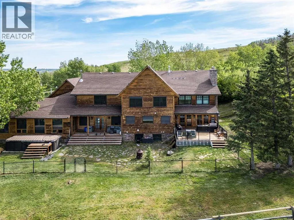 Discover the ultimate retreat at this secluded hilltop estate, boasting breathtaking mountain views and nestled on over 5 acres of lush land. YOU WILL NOT FIND A BETTER PRICE PER SQUARE FOOT HOME! This stunning cedar-wrapped residence features 8 spacious bedrooms and 8 bathrooms, offering nearly 8,200 square feet of beautifully developed space. Fully fenced and perfect for horses or family pets, this property provides ample room for a large family to thrive. Enjoy the serene surroundings, complete with mature trees and expansive views. The home includes two master bedrooms, a main floor bedroom, and a separate office space. A remarkable 1,363 square-foot recreation/flex room awaits, ideal for a dance or art studio, games room, or even converting back into an indoor pool. Step outside to unwind around the fire pit, take a dip in the new swim spa, or explore the picturesque walking and riding trails among the mature landscaping. With plenty of accommodations for out-of-town guests, including RV parking, this home is perfect for entertaining. Special features such as hand-scraped hardwood flooring throughout, granite countertops, upgraded appliances, a cozy wood-burning stove, and generously sized bedrooms and bathrooms enhance the appeal of this family haven. Conveniently located just a short 7-minute drive from Okotoks, this estate offers the perfect blend of privacy and accessibility. (id:27476)