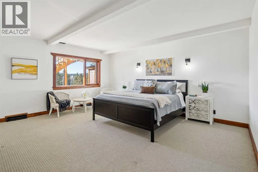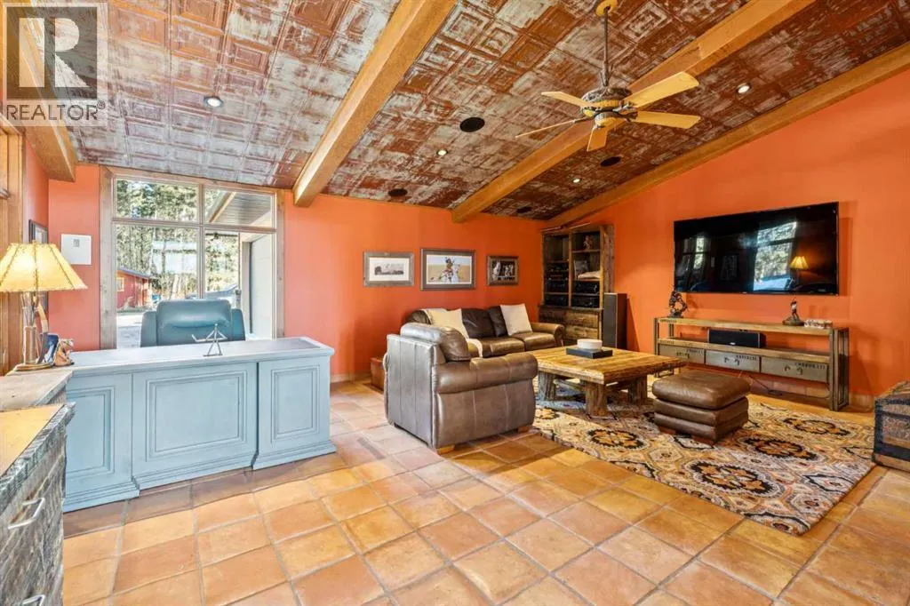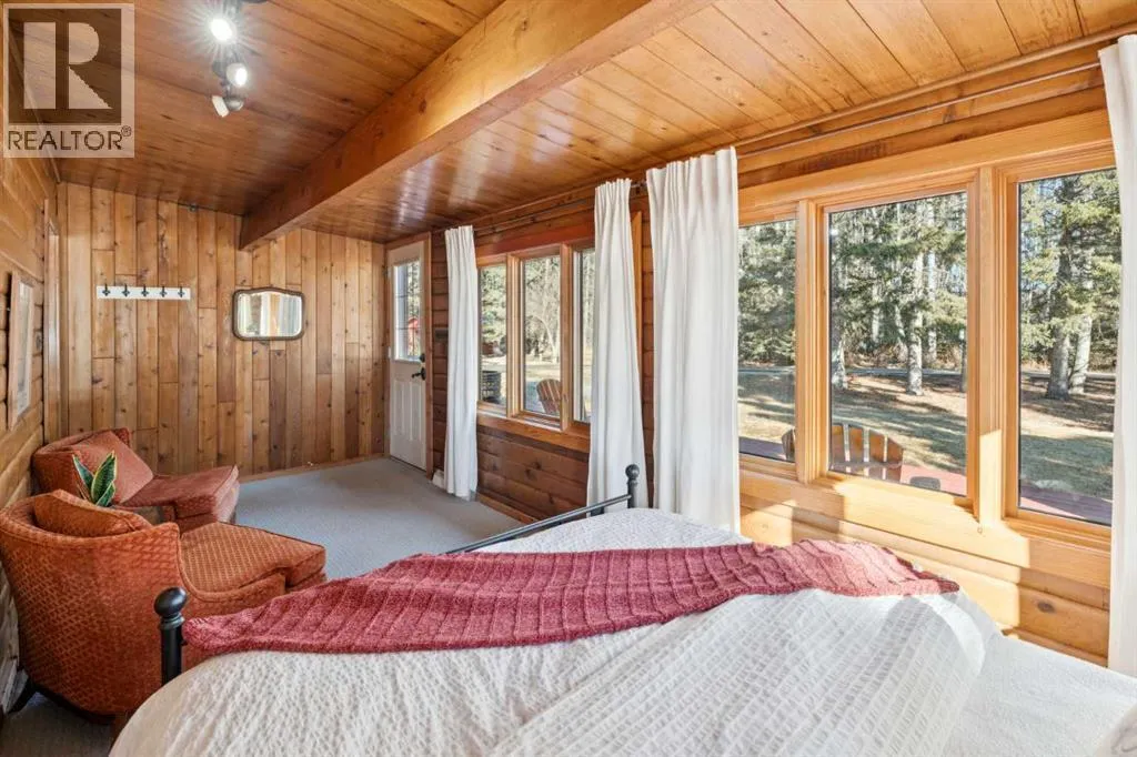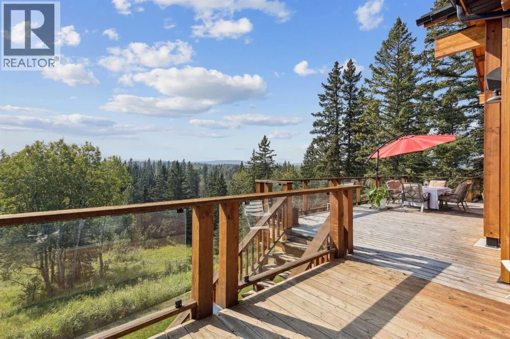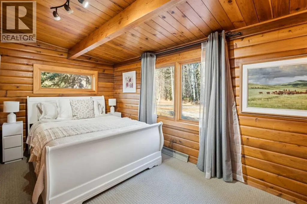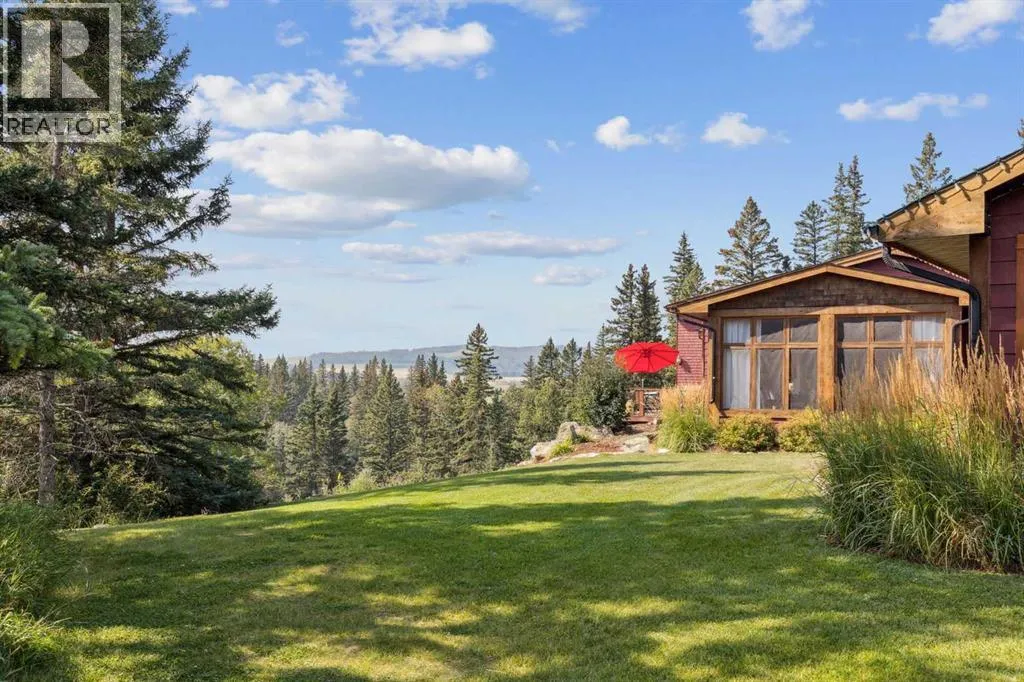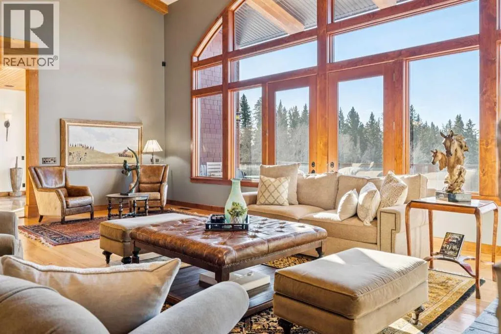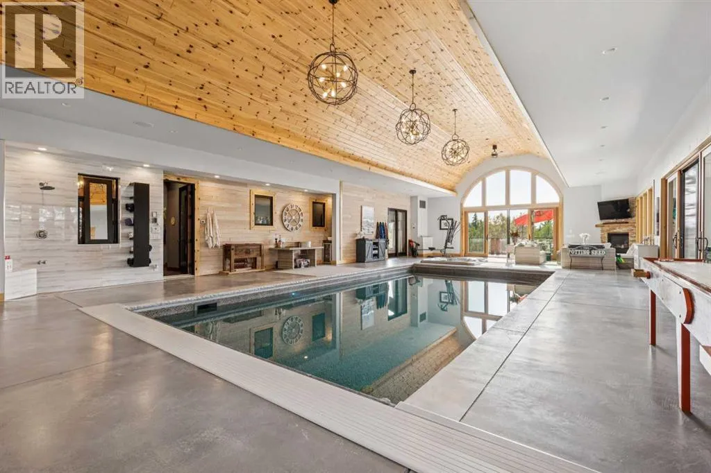 This is a property defined by lifestyle. From the moment you arrive at the secure electric gate and begin the gentle journey down the winding, tree-lined driveway, the outside world quietly fades away. Take a deep breathâwhat awaits is a rare sense of calm, privacy, and connection to nature. Perched above Fish Creek, this remarkable 7,222 sq. ft. bungalow commands breathtaking views of the creek below, open fields, rolling foothills, and distant mountain vistas. A wraparound deck spanning the south and west sides of the home invites you to fully embrace the outdoorsâwhether watching wildlife pass by, listening to the soft sounds of the creek, or enjoying sunsets that never disappoint. Step through the dramatic front entrance and you are immediately greeted by soaring vaulted ceilings, a stunning wall of windows, and uninterrupted views beyond. Custom stonework and timeless timber-frame construction define the homeâs architectural character, creating a seamless blend of natural materials and refined craftsmanship. The expansive living spaces are perfectly designed for entertainingâwhether hosting intimate gatherings or larger celebrations, indoors or out. This is a residence where the outdoors is intentionally brought in, offering warmth, scale, and a true sense of place. The gourmet kitchen features a generous dining area, an abundance of cabinetry and counter space, and a beautiful screened summer dining roomâideal for seasonal entertaining. Enhancing the lifestyle experience is an attached pool house complete with a 16' x 30' indoor heated pool, hot tub, games area, and a cozy sitting space with fireplace for year-round enjoyment. The primary retreat features soaring vaulted ceilings, a wood-burning fireplace, and two sets of patio doors leading to the deck and pool area. The luxurious ensuite offers a two-person air tub, double vanities, walk-in shower, and a spacious walk-in closet with floor-to-ceiling built-ins. The main floor office showcases distinctive copp er ceiling details, a charming pot-belly stove, and two sets of custom built-in drawers and cabinetry. An attached private cabin provides ideal accommodations for children, a nanny, or staff, complete with its own kitchen, two bedrooms, living area, and full bathroom. The fully developed lower level offers a spacious recreation room with wood-burning fireplace and walkout to a covered patio. Additional features include a wet bar, sauna, cedar closet, generous storage, a four-piece bathroom, and a large bedroom.For equestrian enthusiasts, the property is exceptionally well-appointed with a four-stall barn, multiple paddocks, open grass riding ring, open pasture, and a fenced in riding arena . The only thing missing? A one-way road sign at the entranceâbecause once you arrive, you may never want to leave. (id:27476)