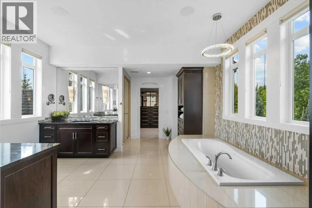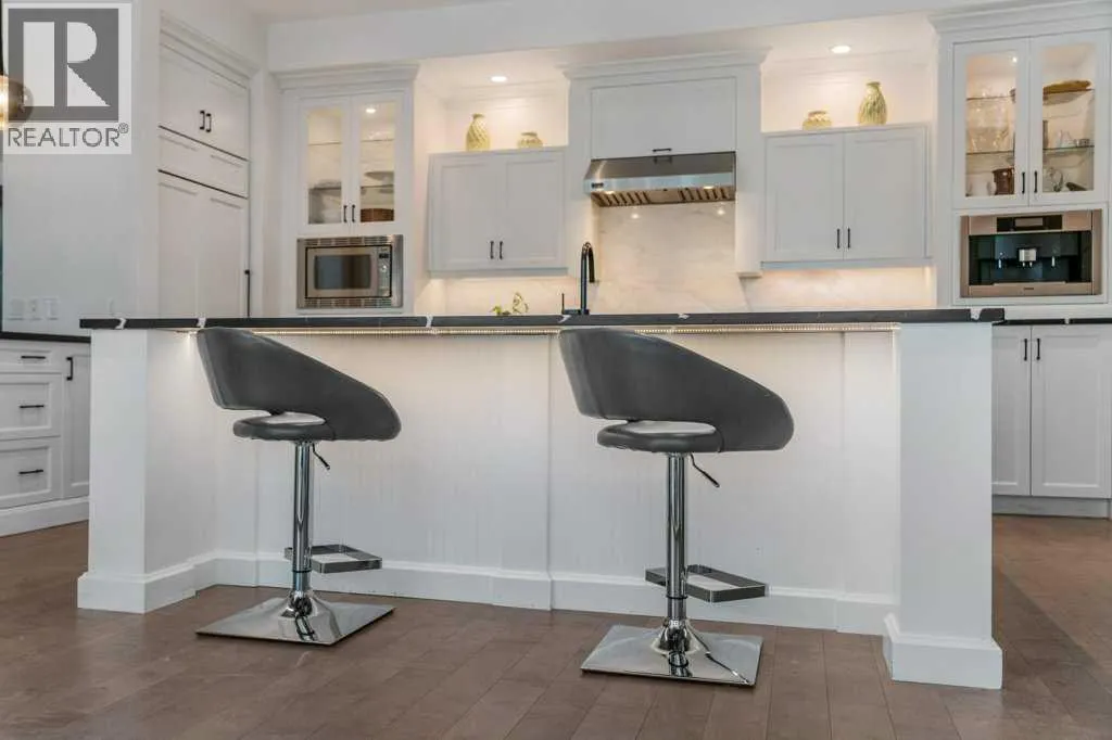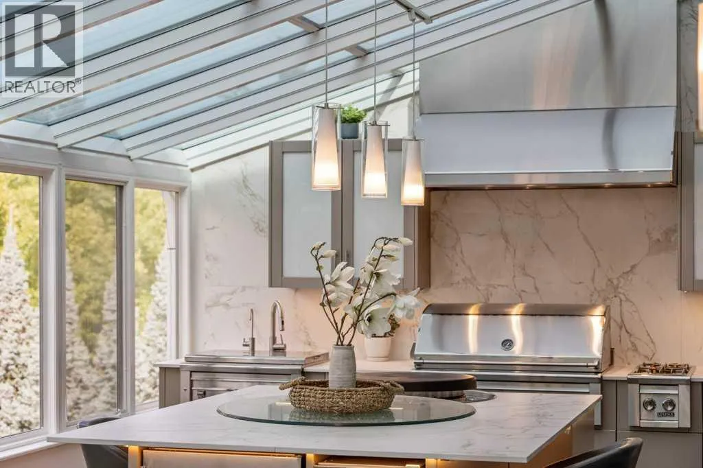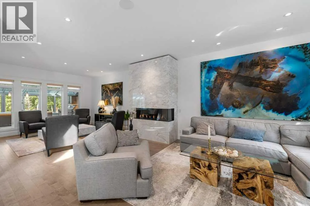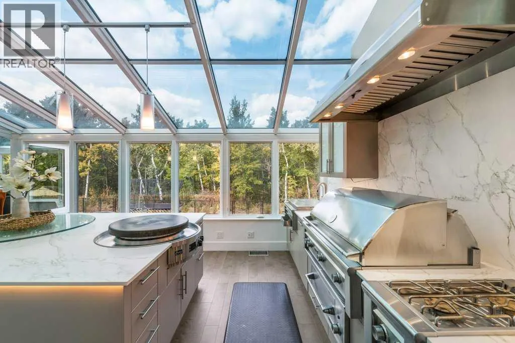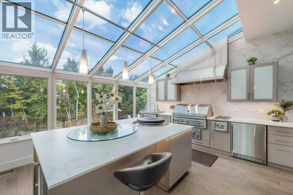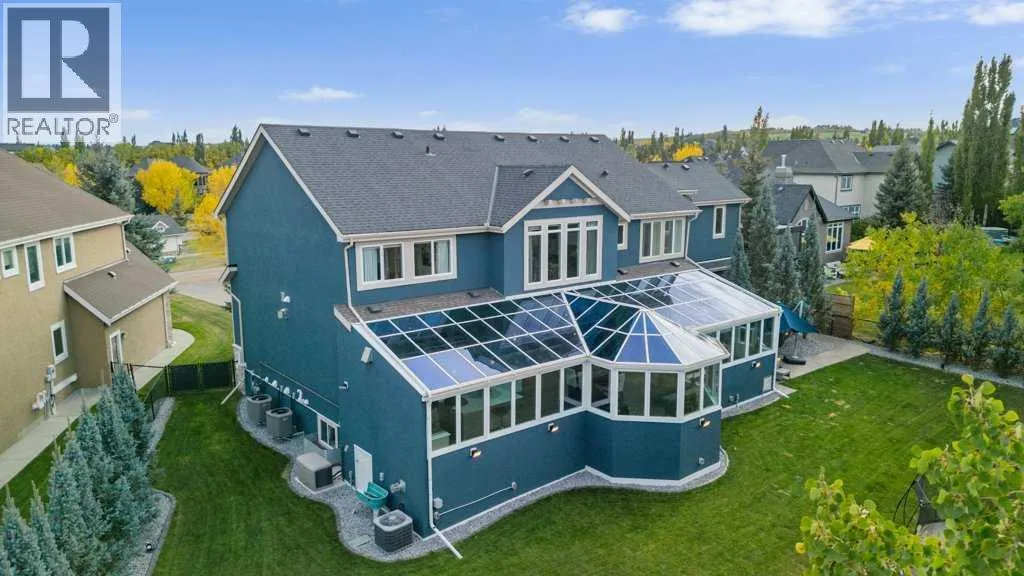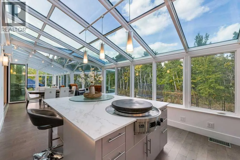 *Welcome to this extraordinary, fully renovated estate home in the prestigious community of Heritage Pointe, offering exclusive lake access and surrounded by natural forest beauty! Situated on a prime lot & backing onto a treed forest, the home has undergone a major renovation. It now features the addition of a spectacular 800 sq. ft. "entertainer's dream" 4 season sunroom (with new foundation and its own furnace/plumbing/air conditioning) - a true showpiece created for both relaxation and entertaining! Outfitted with premium appliances, the chef's kitchen serves large gatherings; a spacious dining room is adjacent, plus a living area for relaxation, where dual large-screen TV's seamlessly rise from the hardwood floors - at the touch of a button! The main home's central kitchen is renovated with new quartz counters/island, new appliances, marble backsplash, plus a newly reconfigured lighted pantry. With a living / dining room that has a new floor-to-ceiling feature "linear" fireplace, perfect ambience is createde. A stylish great room, also adjacent to the kitchen, provides built-in cabinetry with lighted accents. All new hardwood floors adorn the main level, new lighting, all solid interior doors, new carpets. A main floor office, half bath and mudroom complete the main level. The upper level currently features 4 bedrooms (could be bonus room with 3 bedrooms). The master suite showcases vaulted ceilings, a private sitting area overlooking the forest, spa-like 5 pc ensuite w/air jet tub, steam shower & large walk-in closet, heated floors! The professionally finished lower level features a 4th bedroom, bath, media area, games room w/expansive wine bar, fitness room w/cork flooring & 2nd laundry. Direct Connect networking throughout. Dual central air conditioners, gas generator and extensive solar system - serves entire home! The 4 car garages (two double garages) are separated by a breezeway. The rear yard showcases an 8 person "waterfall" mineral h ot tub with an adjacent fire pit gathering area - grounds with underground sprinklers systems. Whether hosting a gathering or hosting a quiet evening, the indoor/outdoor ambience and forested views create a resort-like view year-round! Experience the best of lake living, privacy, and modern sophistication, in one of Alberta's most sought-after communities. (id:27476)