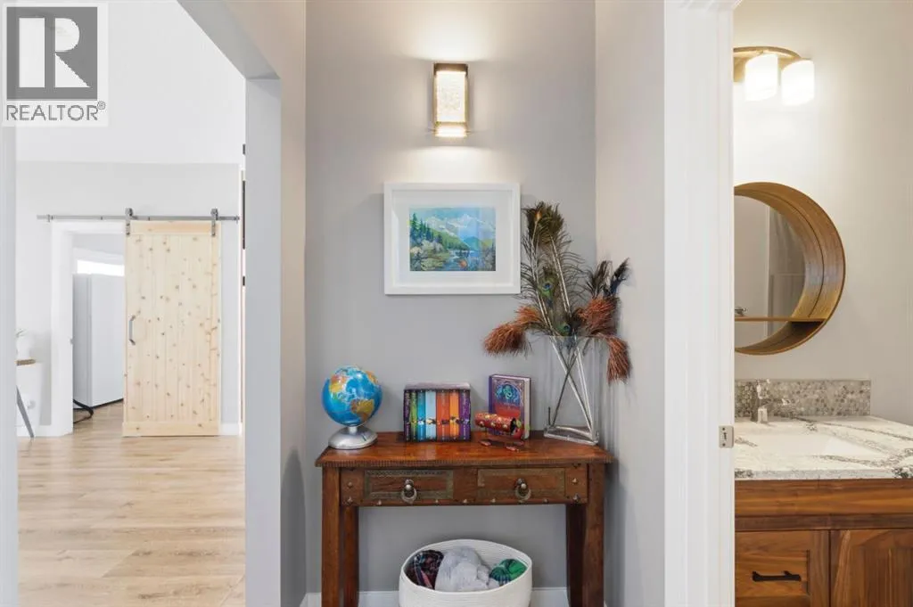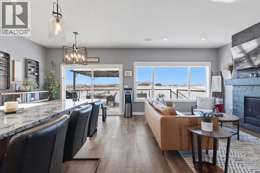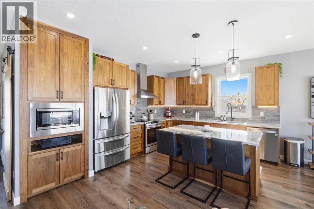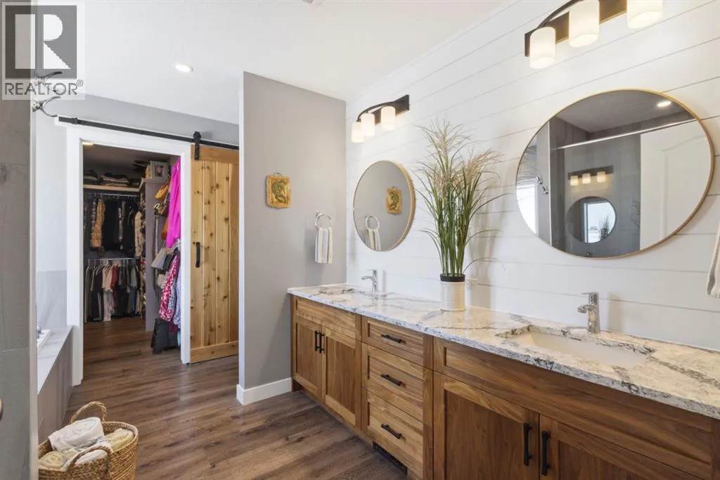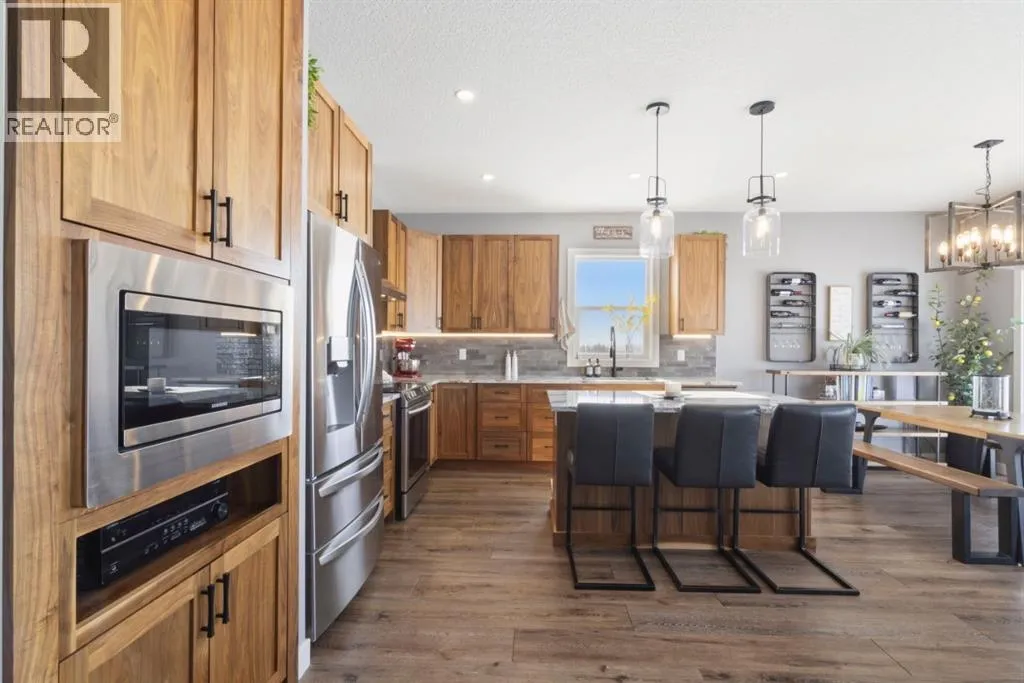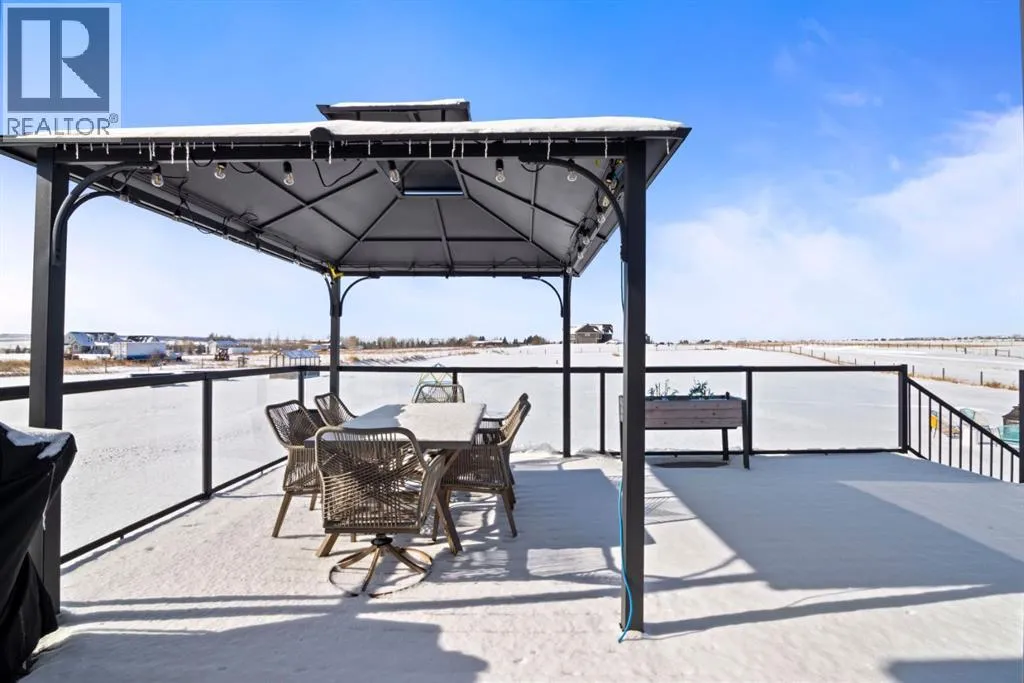 The perfect location for a city commuter or Okotoks resident! This home is situated just east of Okotoks and Green Haven and is also just a quick three minute drive to Highway 2 north which gets you to Calgary in less than 15 minutes! Drive into this 3 acre parcel and the first thing you notice to the west is the unobstructed skyline full of Rocky Mountains! The exposed aggregate front patio and staircase lead you up and into the home where at that point it is very evident that this house has been a meticulously maintained and upgraded since the year of purchase. With an office to your immediate right and the main floor, laundry and mudroom to your immediate left. Once a little deeper into the main floor the open concept that leads back to the great oversized windows again shows off those fabulous Mountain Viewâs. The Kitchen was completely redesigned and rebuilt with beautiful Walnut with custom built-ins for appliances and system for your in ceiling audio. The dining room leads out to a brand new, oversized, spectacular deck with glass railing, and pergola to shade you from the all day sun and sunsets you receive in the backyard. The main floor also hosts one bedroom and a fully remodeled, four piece bathroom. Now upstairs is what makes this home so unique in my mind! THE MASTER RETREAT! The whole second floor is all yours with a massive bedroom, stunning, remodeled, five piece en suite and a massive walk-in closet. One of the biggest highlights has to be the unrivalled Westerly view. The basement is also fully developed with another two bedrooms, four piece bathroom and the great size rec room. Head back outside to the garage or currently used shop that has a current sport court that could easily be converted into another fully enclosed garage. The garage is outfitted with 220 power, heat and water. You will certainly see the attention to detail and the extreme pride of ownership while viewing this property. Hope you enjoy. (id:27476)