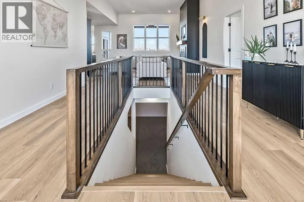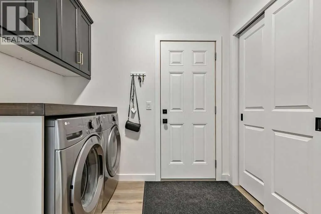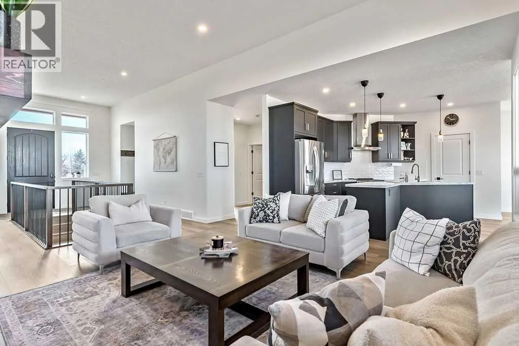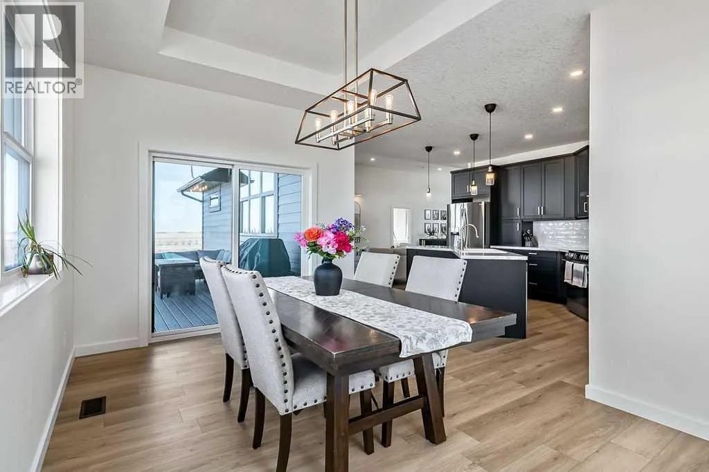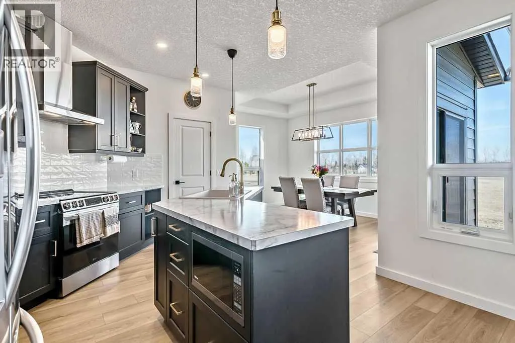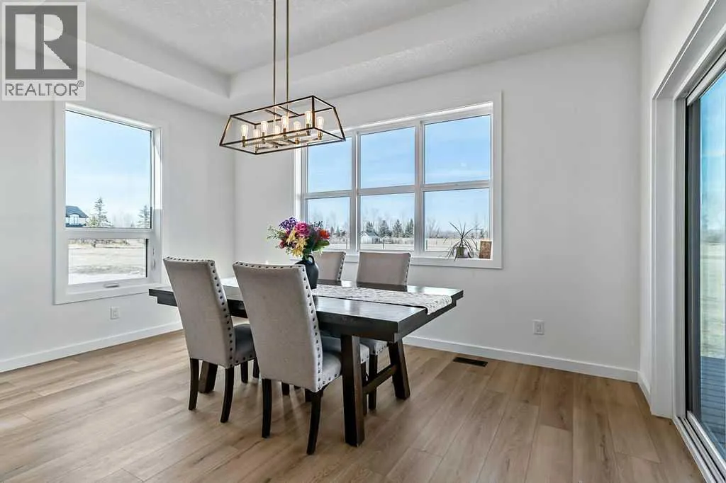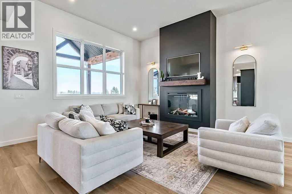 Welcome to your dream acreage in sought-after Foothills Countyâjust 5 minutes southwest of High Riverâwhere breathtaking mountain views meet the peace of country living with the convenience of town amenities nearby. Situated on 2.42 acres, this stunning custom-built (2025) bungalow offers over 5 bedrooms, 3 full bathrooms, and a beautifully designed, fully finished layout. From the moment you arrive, the striking Hardie board and stone exterior, large covered front porch, and clean contemporary lines set the tone. Step inside to a bright, welcoming foyer featuring a custom built-in bench and hooksâperfect for everyday functionality. The open-concept main floor showcases gorgeous vinyl plank flooring and a seamless flow between the living, kitchen, and dining spaces. The living room impresses with 11â ceilings, expansive north-facing windows, and a modern gas fireplaceâcreating a warm yet sophisticated gathering space. The chef-inspired kitchen is a showstopper, featuring sleek black cabinetry, white countertops and backsplash, and elegant gold accents, along with a large island (with sink and microwave), premium appliances, and a spacious walk-in pantry. The dining area comfortably accommodates large gatherings and is surrounded by west- and north-facing windows, with direct access to the expansive covered deckâprivate, sheltered, and ideal for year-round enjoyment. The primary retreat offers a peaceful escape with bright east-facing windows, a luxurious ensuite with double vanity, soaker tub, oversized walk-in shower, and an expansive walk-in closet conveniently connected. Thoughtful finishes of tile, wood, and stone elevate the space. The main level also includes a second bedroom (perfect as a home office or den), a full 4-piece bathroom, and a well-designed mudroom and laundry area with direct access to the oversized double garage. The fully finished lower level features three additional spacious bedrooms, a 4-piece bathroom, large windows for abundant natural li ght, and a versatile layout ideal for a recreation room, gym, home business, or media space. Ample storage completes the lower level. Outside, the property is ready for your visionâoffering endless potential for landscaping, outbuildings, and outdoor living. This home perfectly blends modern design, clean lines, and a neutral palette of white, black, wood, and natural textures, creating a space that feels both elevated and inviting. A rare opportunity to own a newly built home in an unbeatable locationâspace, style, and lifestyle all in one. (id:27476)