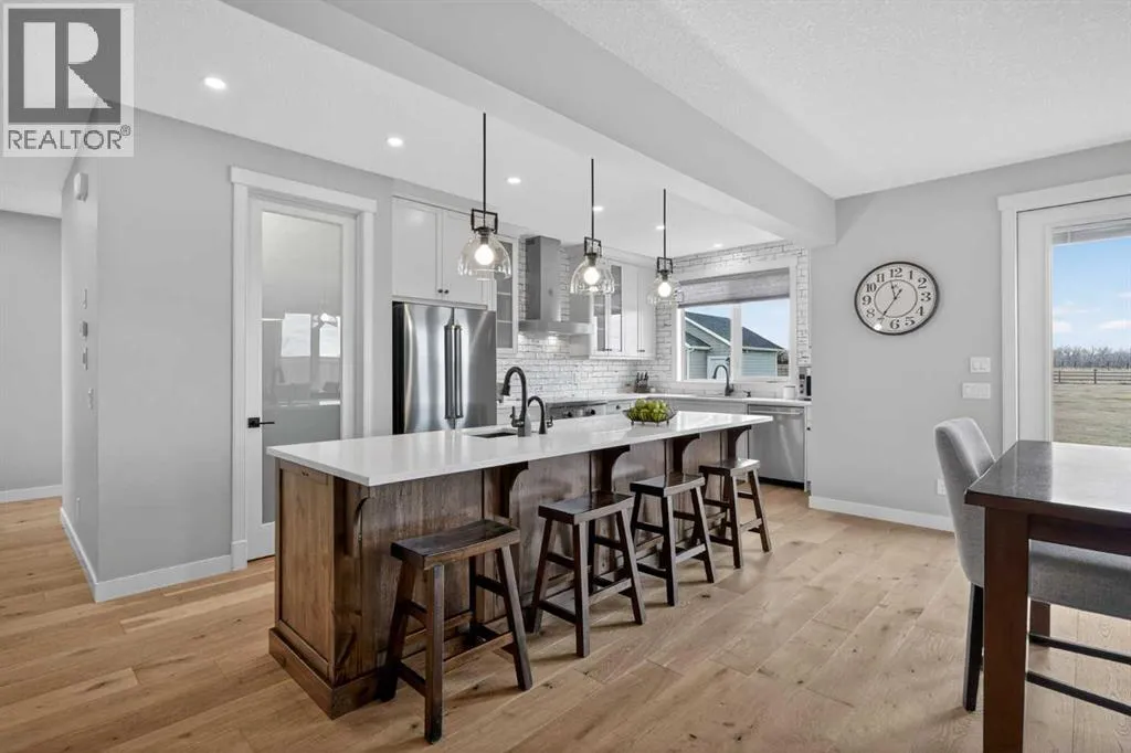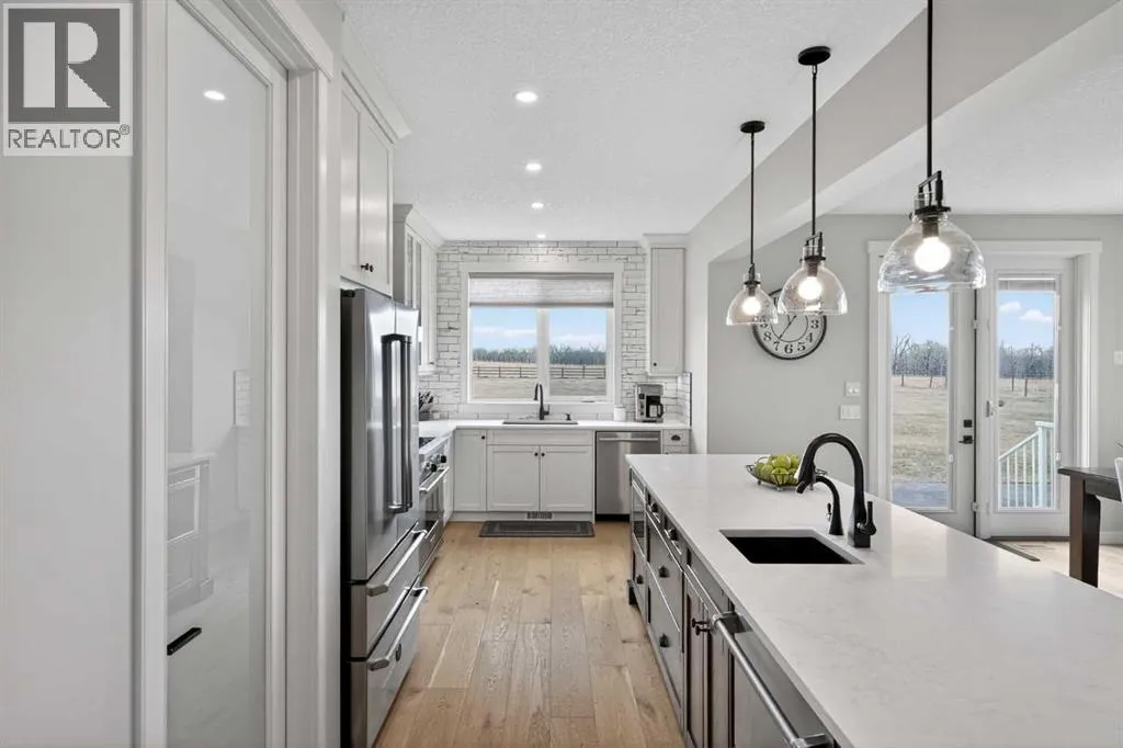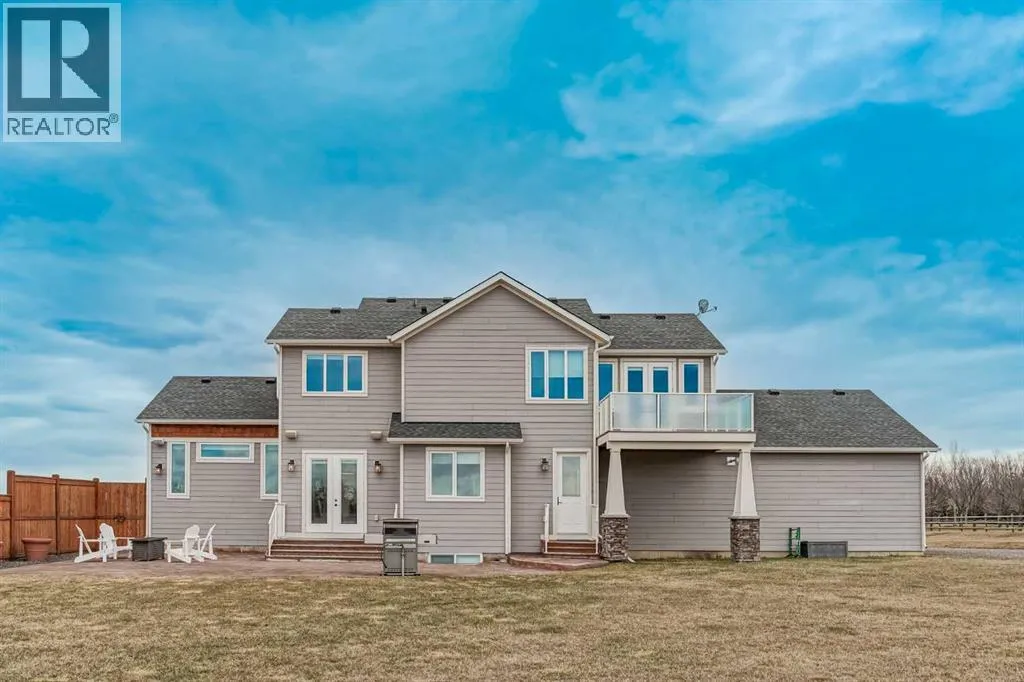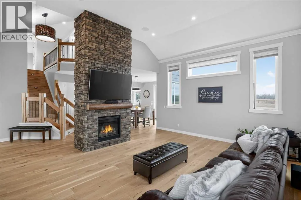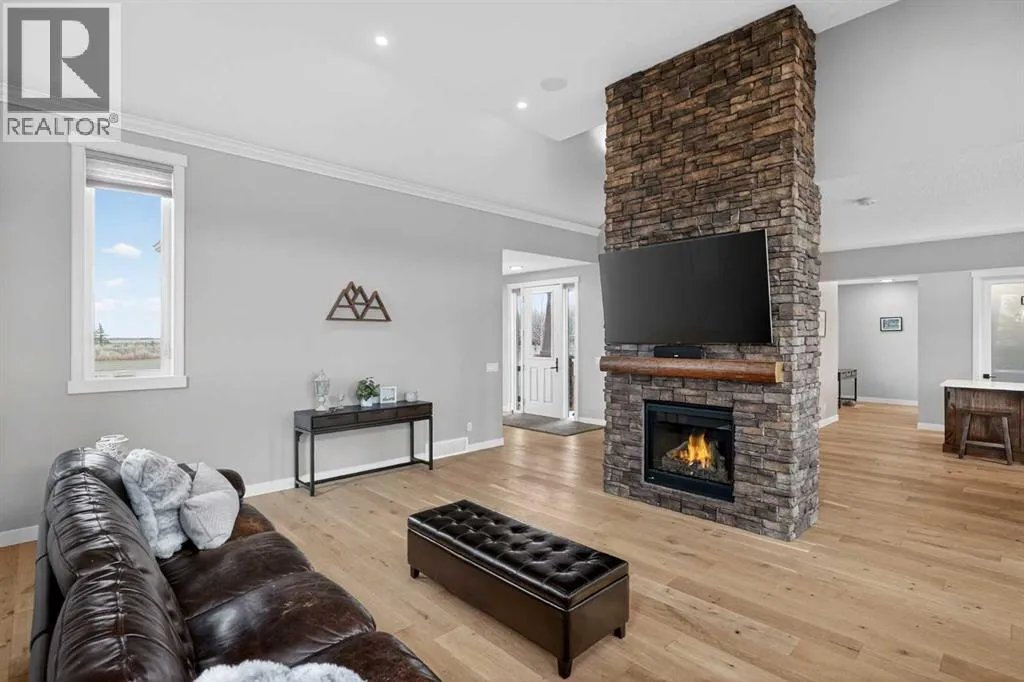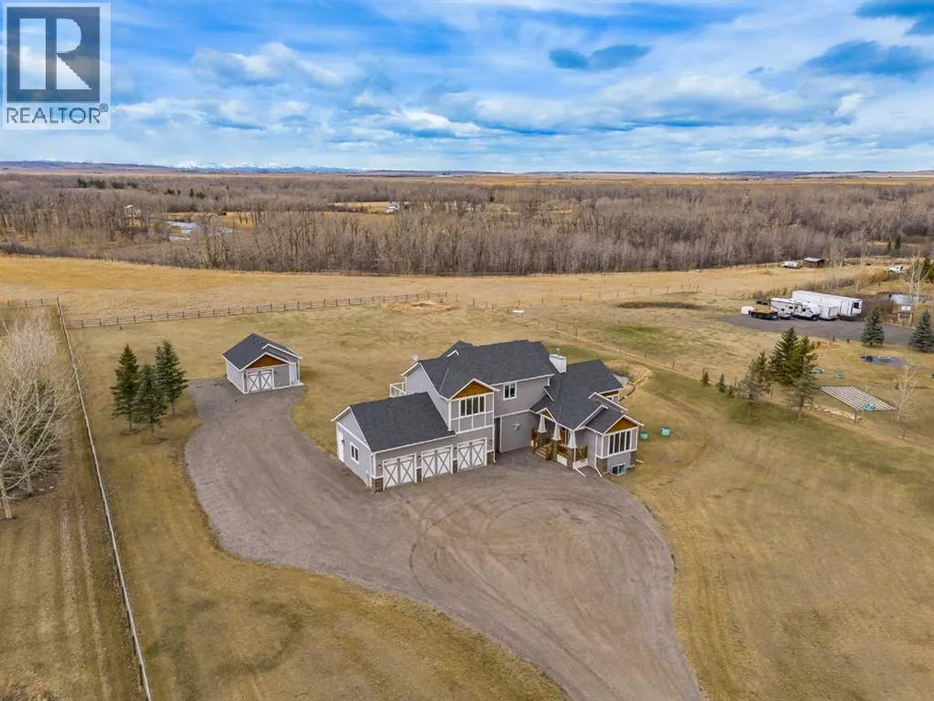 Set on just over 2 acres and only 5 minutes southwest of High River, this CUSTOM BUILT HOME offers nearly 4,000 sq ft of developed living space in a private setting backing onto an environmental reserve, giving you the space, privacy, and lifestyle people are searching for but rarely find this close to town. Step through the front door and you are immediately welcomed by an expansive open concept space, highlighted by soaring VAULTED ceilings, a stunning floor to ceiling BRICK GAS FIREPLACE, and a custom FIR WOOD staircase that acts as a true architectural feature. The kitchen is seamlessly integrated into this space and is built to stand out, featuring a large central island, custom cabinetry, premium appliances, including a 36 inch INDUCTION WOLF RANGE that brings both style and performance. The main floor is finished with wide plank white oak ENGINEERED HARDWOOD, along with 9 foot ceilings, and 8 foot doors. The layout is both practical and flexible, offering a main floor bedroom or office, a full bathroom, and laundry, all thoughtfully positioned to enhance how the home functions day to day. The upper level is highlighted by a stunning primary suite, complete with its own PRIVATE BALCONY showcasing west facing MOUNTAIN VIEWS, an ensuite featuring a dual vanity with quartz countertops, a freestanding tub, and a glass enclosed shower, along with a spacious walk in closet that creates a true retreat. Two additional bedrooms, a comfortable sitting area, and a custom designed staircase complete a second level that blends both function and style. The basement is fully finished and adds significant, well designed living space to the home. You will find two spacious bedrooms, a beautifully finished 3 piece bathroom, and a massive entertaining area that is enhanced by CUSTOM CABINENTRY, creating the perfect setup for a media room, games area, or extended family space. In floor heating runs throughout, adding a level of comfort that you will appreciate every single day. S tep outside, and you start to understand what truly sets this property apart. The set-back lot creates a level of privacy thatâs hard to find, giving you space to enjoy the outdoors the way itâs meant to be. Itâs built for both entertaining and everyday living, with a hot tub hookup already in place. A SECURITY GATE adds an extra layer of privacy and peace of mind. Stamped concrete patios at both the front and back create clean, functional spaces to relax and gather. You have a TRIPLE ATTACHED GARAGE plus a detached HEATED SHOP, giving you all the room you need for vehicles, storage, or a dedicated workspace without compromise. And itâs not just about the space, itâs how comfortably you live in it. With CENTRAL A/C and a 2-ZONED furnace, the home is designed to keep every level feeling just right, no matter the season. Every detail is designed for how the home lives day to day, with space to grow without losing connection. Opportunities like this, with this level of finish, space, and privacy, are rare! (id:27476)