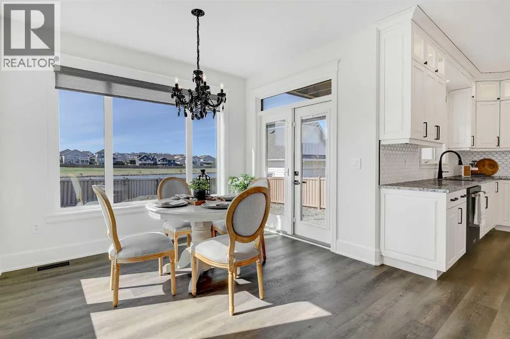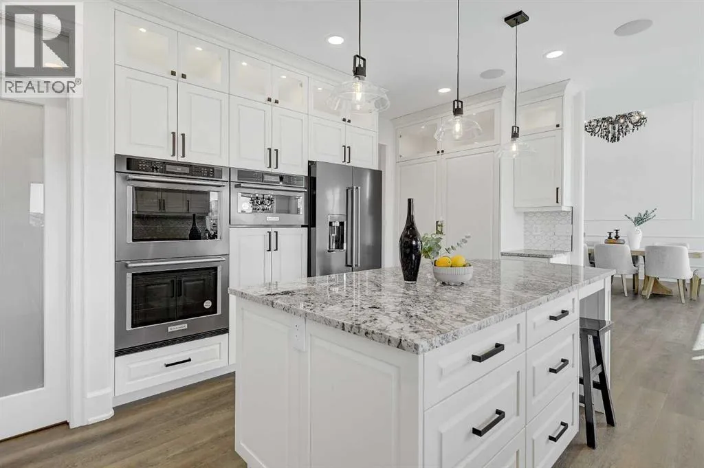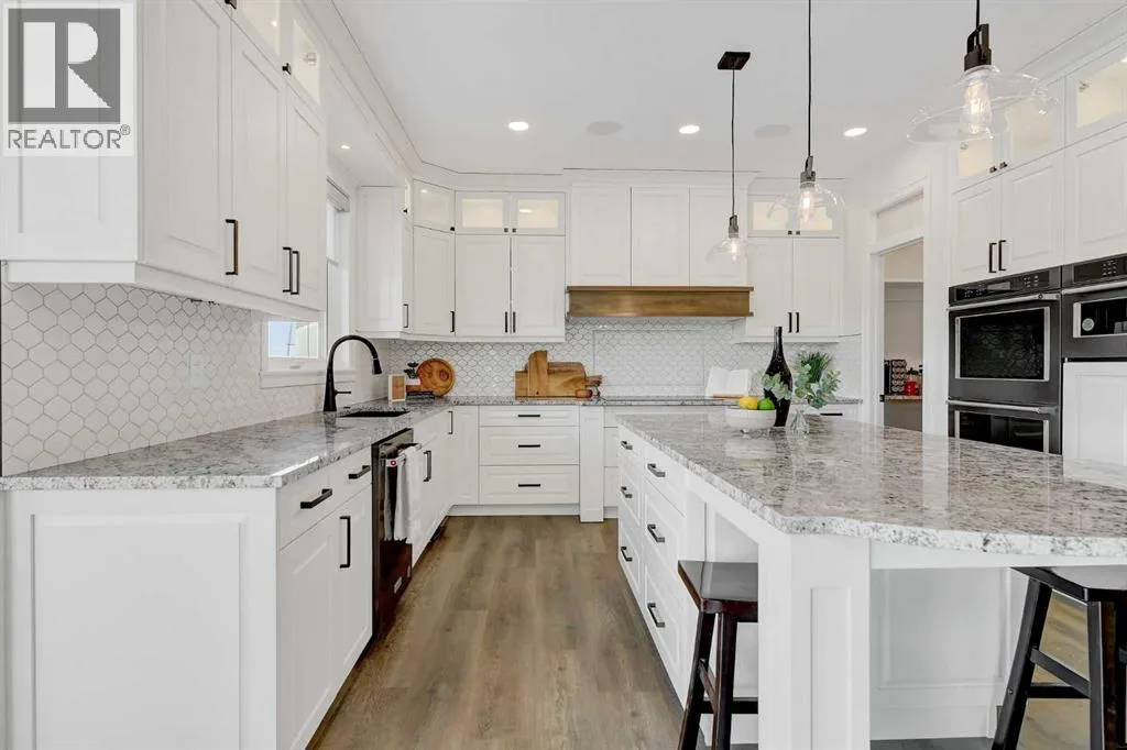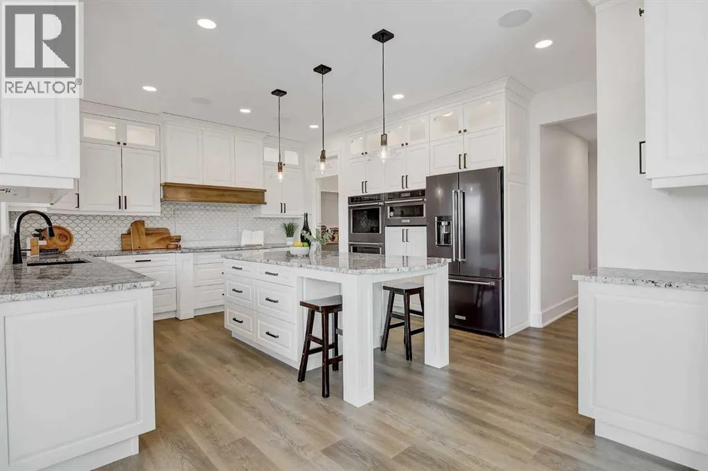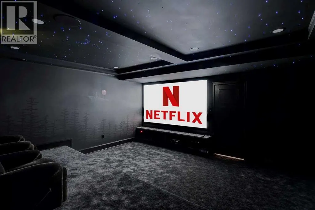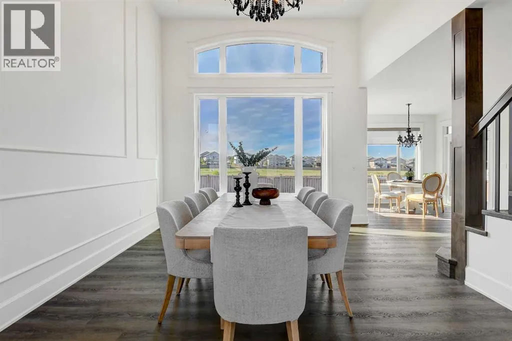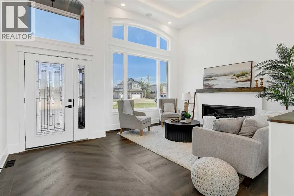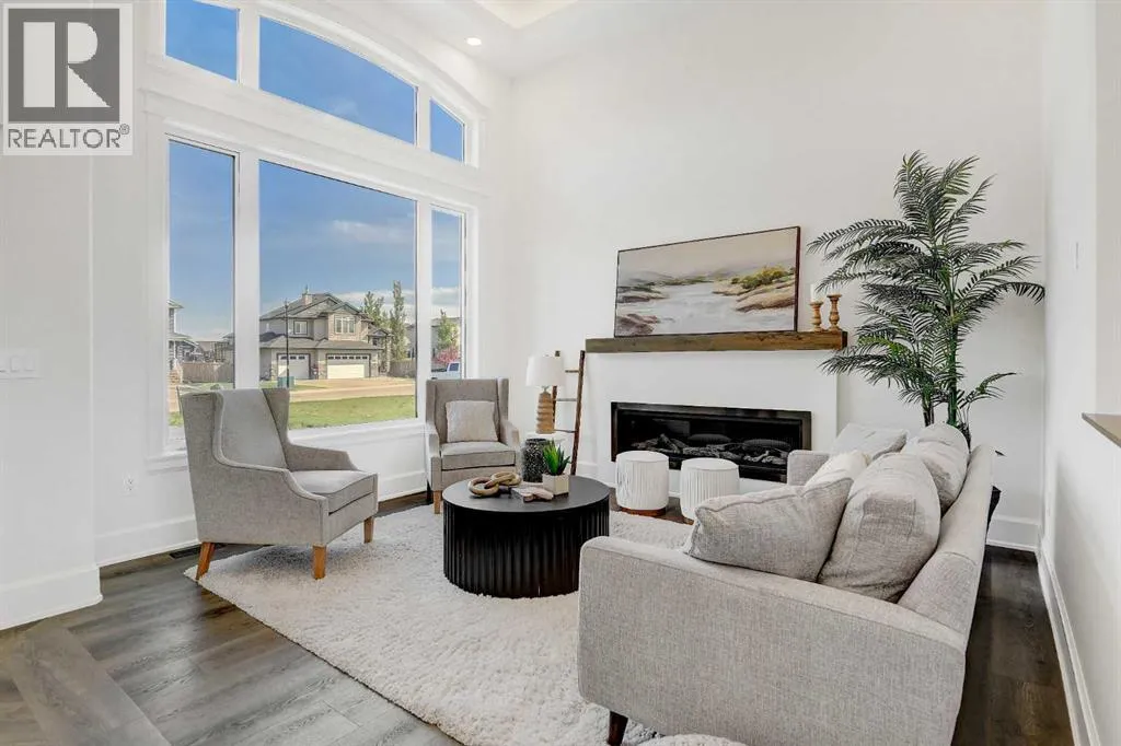 Every detail of this custom-built home in Whispering Ridge has been thoughtfully built to impress, and it does, from the moment you walk through the front door! Set on a 72' x 167' lot with no rear neighbours and county taxes,this property backs onto the pond and walking trails, offering privacy,beauty,and space to breathe.Coffered ceilings and a statement chandelier make an unforgettable first impression. The living room is bright and welcoming, with three large windows that fill the space with natural light.A gas fireplace with a custom maple mantle adds warmth and character,while the coffered ceilings with uplighting bring added dimension.From here,the formal dining room flows beautifully, a space that feels both elegant and inviting. Custom wall moulding, a striking chandelier, and oversized triple windows make it ideal for large gatherings. At the heart of the home, the refined kitchen brings together form and function with stunning results. Cream toned maple cabinetry, granite counters, and a truly massive island make it a natural gathering place. High end appliances include double ovens, an induction cooktop, and a built-in double freezer that blends seamlessly with the custom cabinetry. The butlerâs pantry keeps everything tucked away, and a casual dining nook surrounded by windows makes the most of the scenery, with a door leading to the back deck, made for summer meals outside (deck to be completed). A full bathroom with dual access connects to a spacious main floor bedroom â ideal for guests, multigenerational living, or a refined home office. The rear entry adds style and function with custom built lockers, shelving, and hooks. Upstairs, custom built newel posts lead to a primary suite that feels like a private retreat! The bedroom is generous in size, with a sitting area framed by three windows overlooking the pond and trails. Step out onto your private balcony, designed for a hot tub or morning coffee. The ensuite features heated tile floors, dual vani ties, custom storage towers, an air tub, water closet, and a massive tiled shower with rain head and body sprays. The walk-in closet includes built ins, an island, and a laundry chute. Upstairs also features two large bedrooms and a bath with dual sinks and cheater access. Downstairs, heated floors run throughout and the expansive family room is anchored by a wet bar. The custom theatre is a showstopper, with real constellations, tiered seating, and a mural by a local artist. Two bright bedrooms and a full bath complete the level. The backyard is made for summer evenings, with a stamped concrete fire pit pad and no rear neighbours, perfect for hosting friends! The finished triple garage is a true standout, with easy clean metal walls, epoxy floors, and floor drains in every bay. Triple-pane windows, dual furnaces, A/C, smart lighting, and custom finishes throughout â this home is luxurious, practical, and one-of-a-kind. Call your REALTOR® today to book your private showing. Ask your realtor for list! (id:27476)