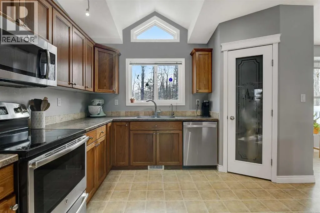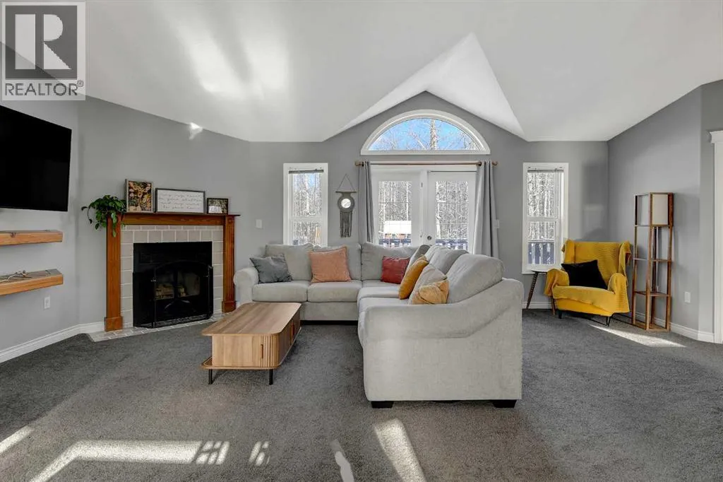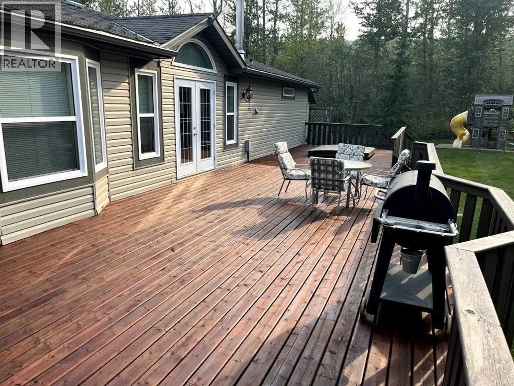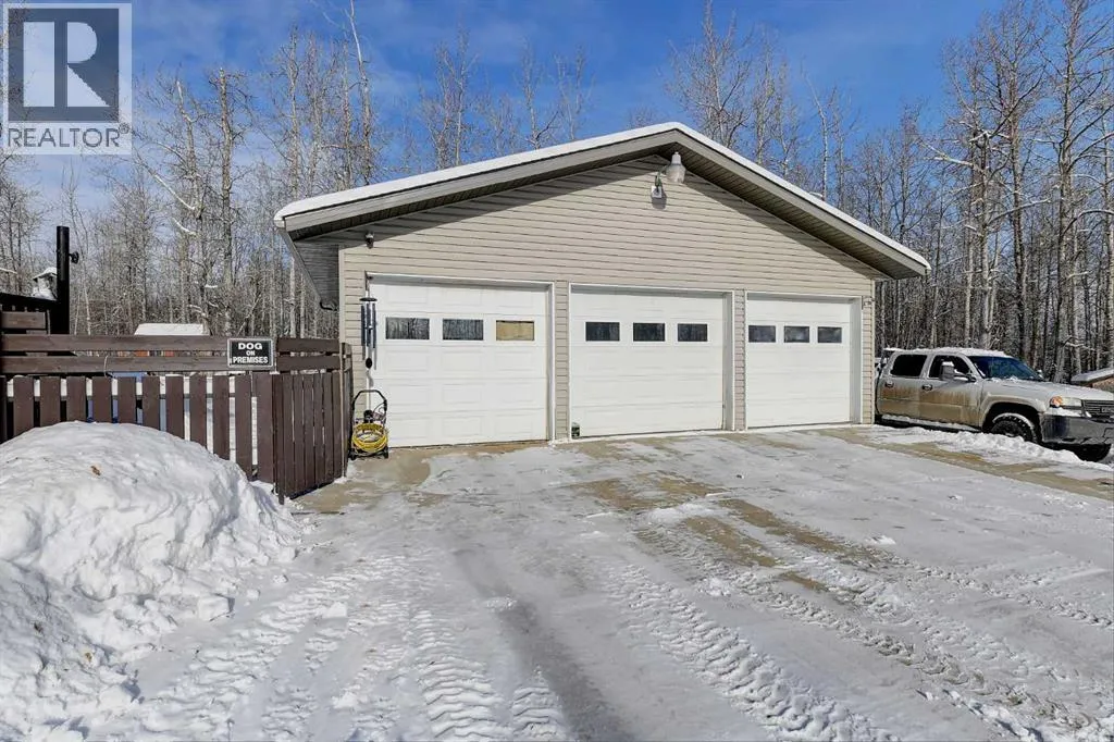 This exceptionally well-maintained 1736 sqft custom built modular home is situated on a gorgeous, private 4.27-acre treed setting in Saskatoon Mountain Acreages about 20 minutes west of Grande Prairie. This fine property offers nice curb appeal, 32 x 28 triple garage, concrete apron and abundant room and parking for all your toys. You can enjoy the peaceful country living surrounded by trees and take in the sunshine anytime of day from either the front deck with aluminum railing or the expansive 15 x 60 rear deck. The fully fenced backyard is the perfect setting for kids and pets, complete with a play center, shed and chicken coop. Yard also offers 5 raised garden beds. Inside, the freshly painted, open concept layout is bright and welcoming, highlighting vaulted ceilings, large windows, and a cozy wood fireplace. The spacious kitchen boasts plenty of cabinets, eating bar, and modern stainless-steel appliances. You will love the impressive primary bedroom, which offers a huge walk-in closet and a luxurious ensuite featuring a two-person jetted tub, separate shower, and his-and-her sinks. The layout features 2 large bedrooms and a 3rd room which could be an office, playroom, nursery, or potential 3rd bedroom. The 32 x 28 heated garage features 3 overhead doors, floor drain, shelving and workbench and a lean-to off the back perfect for extra storage. Other great features include custom blinds, reverse osmosis to fridge and kitchen tap, new hot water tank and new washer and dryer. This scenic property offers a rare combination of modern open concept floor plan, private treed setting and a massive garage all at an attractive price so book your showing soon. (id:27476)
