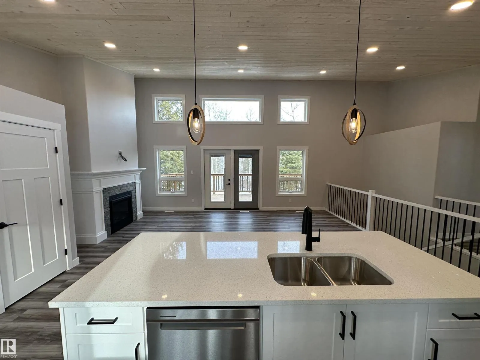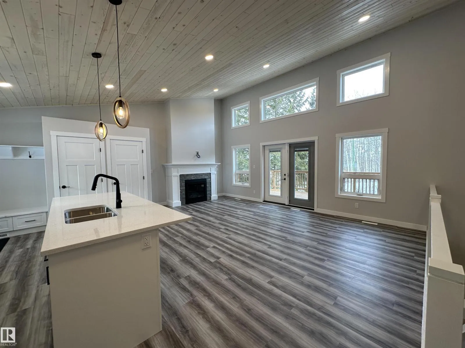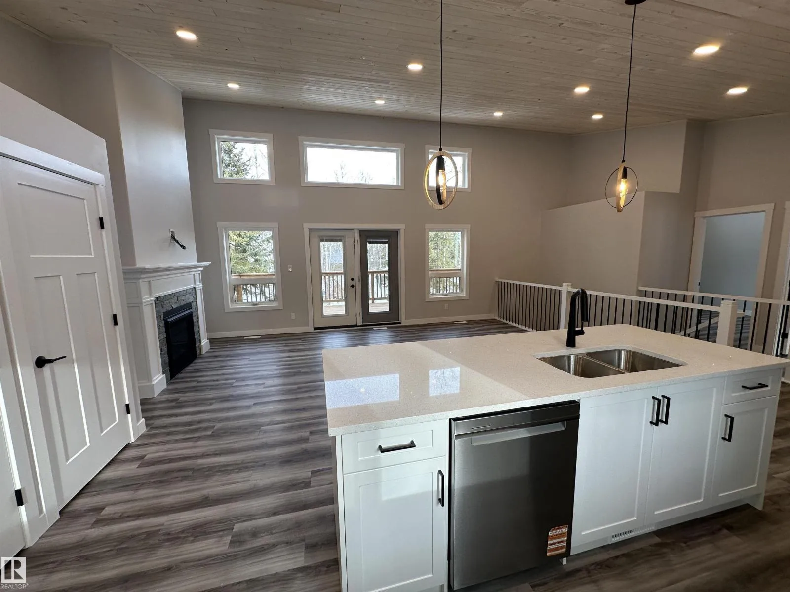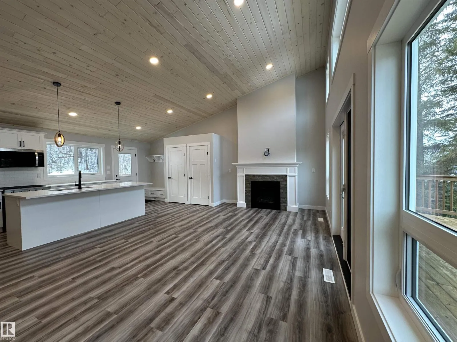 WOW THIS PROPERTY IS AMAZING! Wide open design, soaring 14' vaulted ceilings throughout the entire main floor, big windows w/loads of natural light, 8' quartz topped peninsula island, shaker style kitchen cabinets, 4 pce stainless steel appliance pkg w/gas range, walk in pantry, luxury vinyl plank flooring, fireplace, 2 bedrooms up & 4 pce main bath. Stepping out of the vaulted great room, you're immersed in the peaceful sights and sounds of nature off your huge wrap around deck w/the kitchen opening to the back deck & your own private treed oasis. The finished walkout basement has in-floor heat, 9' ceilings, primary suite w/ 4 pce ensuite, laundry/utility rm w/washer&dryer and a 21x24 drywalled, taped & painted garage. 100 AMP power service, drilled well & a 2800 gallon septic holding tank. Tucked on a private, pie shaped lot surrounded by mature trees. Close to the shores of Isle Lake, the beach, boat launch & only 45 min west of Edmonton. Price includes GST, with rebate assigned back to the builder. (id:27476)
