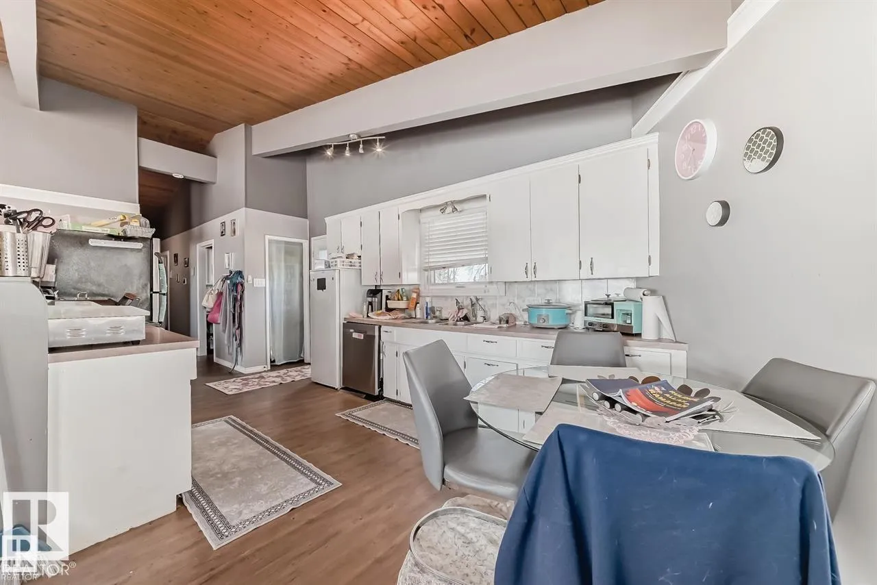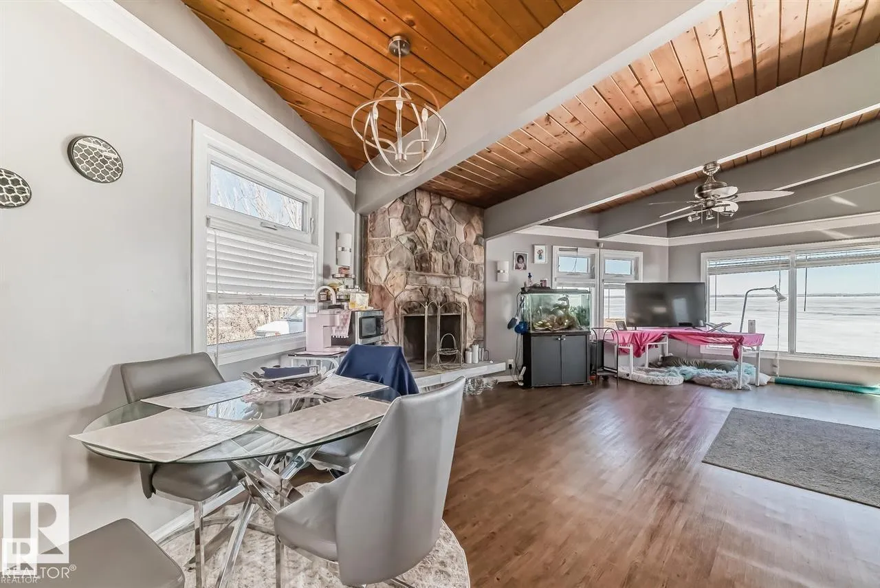 UPGRADEDED CEDAR VAULTED CEILING 1200 SQ/Ft 2 BEDROOM BUNGALOW YOU CAN ENJOY YEAR ROUND! AMAZING WATERFRONT VIEWS. OPEN CONCEPT LIVING ROOM WITH AN AMAZING STONE WALL WOOD BURNING FIREPLACE, DINING ROOM, WITH PATIO DOORS TO A NEWER DECK. LAMINATE FLOORING THROUGH OUT. 4 PCE BATHROOM WITH JACUZZI TUB! FENCED YARD, WITH LARGE STORAGE SHED, AND PLENTY OF PARKING ROOM TO PARK AN RV. UPGRADES INCLUDE NEW WINDOWS, NEW SIDING, NEW METAL ROOF, AND NEW BATHROOM. NEW HOT WATER SYSTEM. LOCATED AT THE VERY END OF THE QUIET COMMUNITY OF VAL QUENTIN, OFF THE SHORES OF LAC STE ANNE, AND DIRECTLY BESIDE IS MUNICIPAL RESERVE FOR ADDED PRIVACY. THE DOCK IS INCLUDED. AMAZING SUNSETS AND BACK YARD FIRE PITS AWAITS AT YOUR HOME AT THE LAKE! GOLF NEARBY, SCHOOL IS SUPER CLOSE TO GAS STATION, GROCERY STORE, LIBRARY DRUG STORE, BANK, PUB AND MUCH MORE! 40 MINUTES TO WEST EDMONTON, CLOSER TO STONY PLAIN AND SPRUCE GROVE AND SUPER CLOSE TO ONOWAY. YOU WILL LOVE THE SANDY BEACHES AT ALBERTA BEACH!! (id:27476)