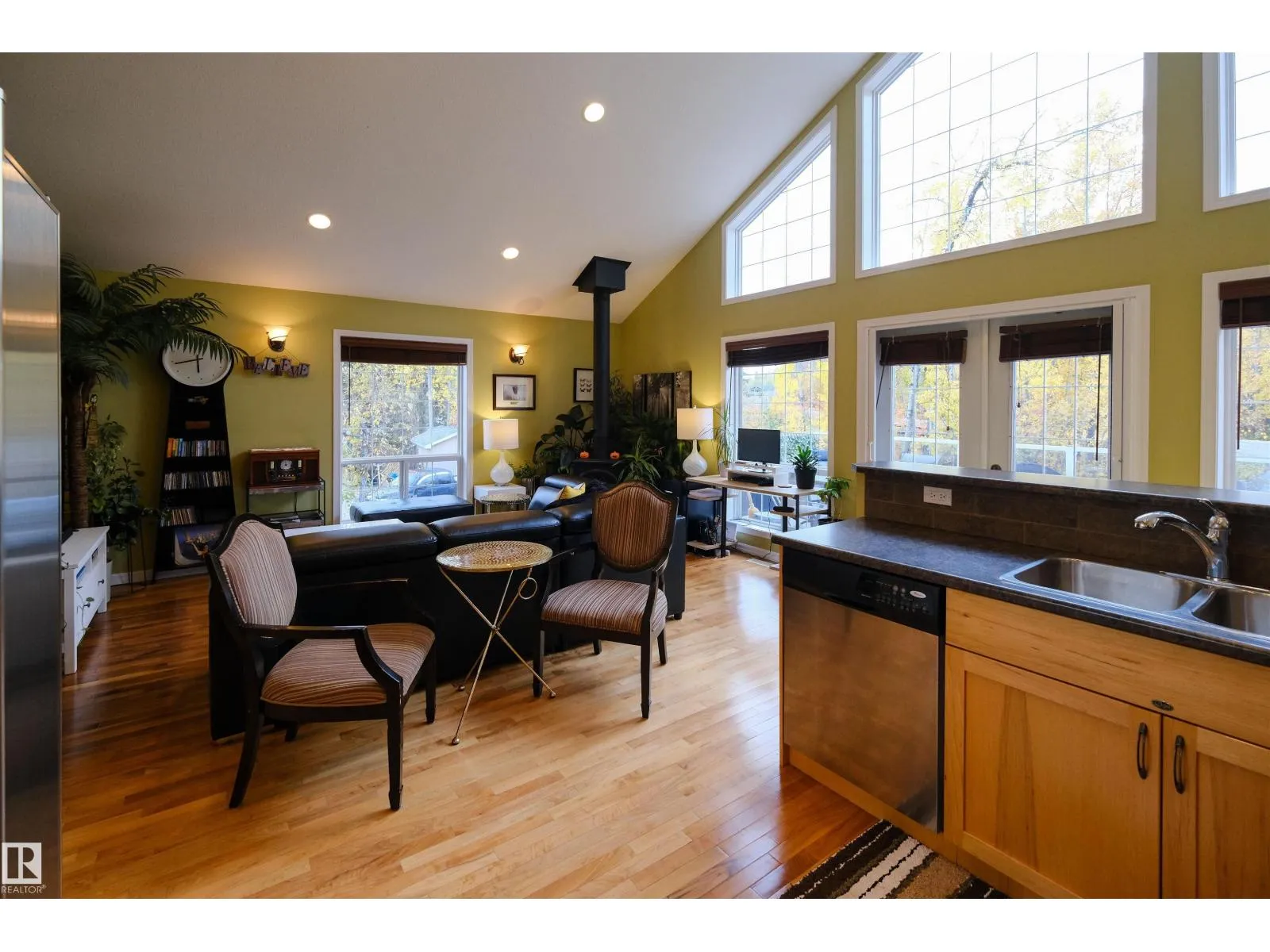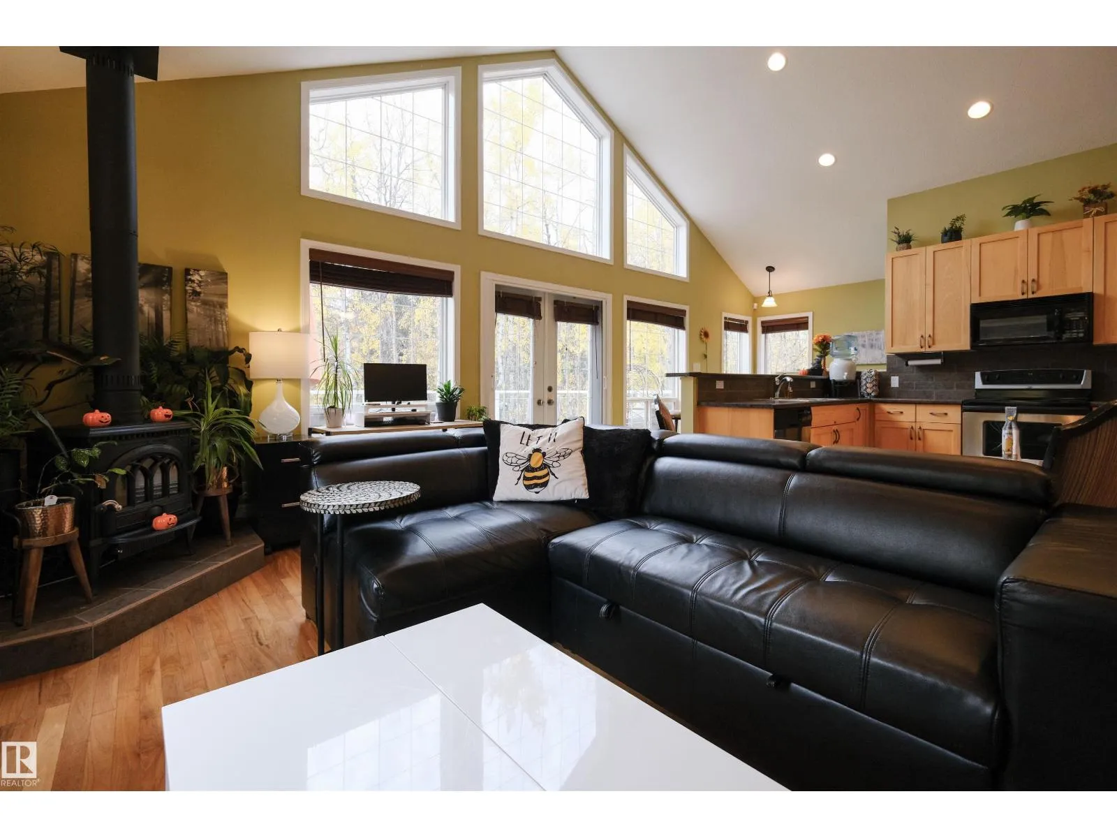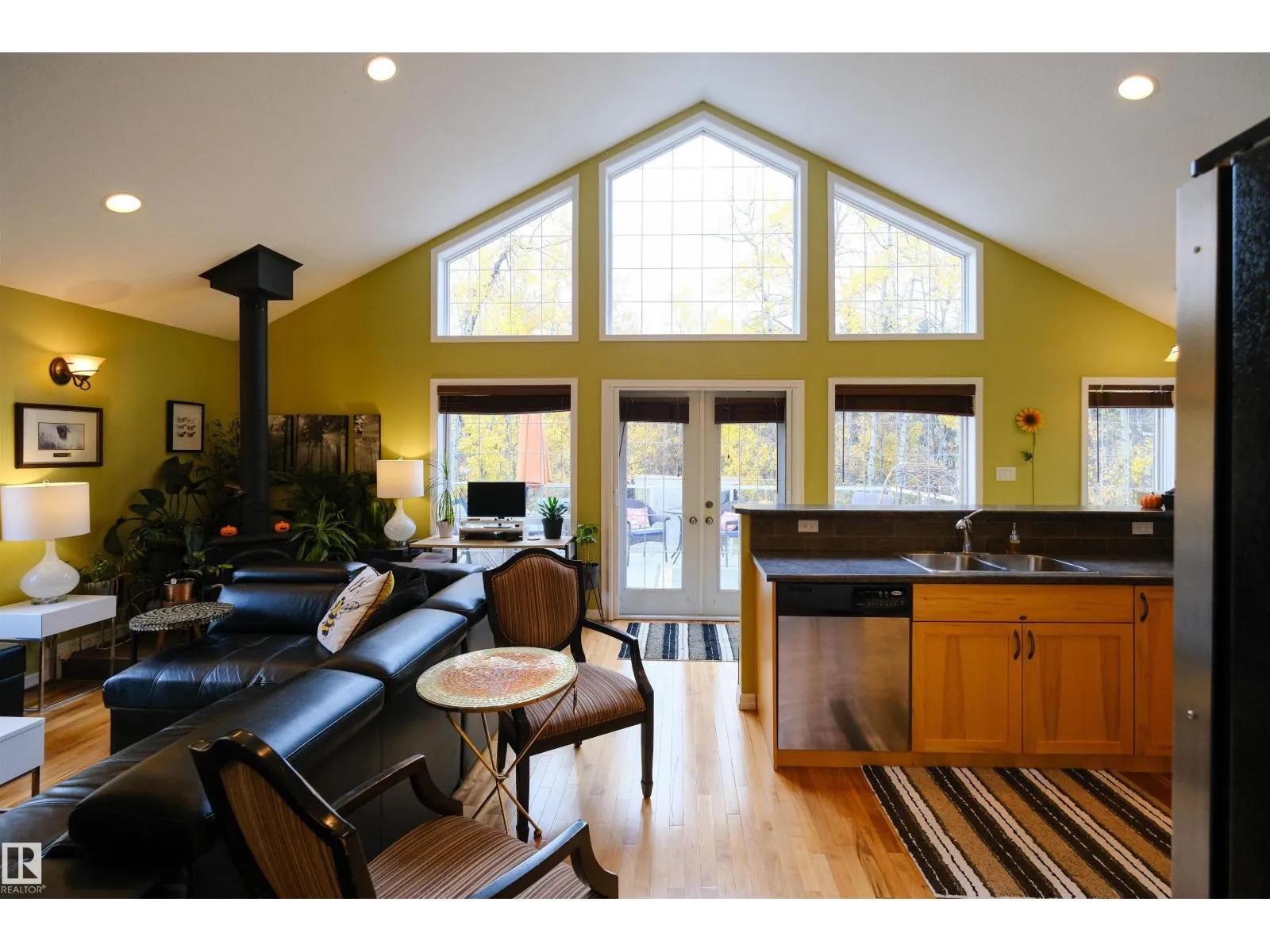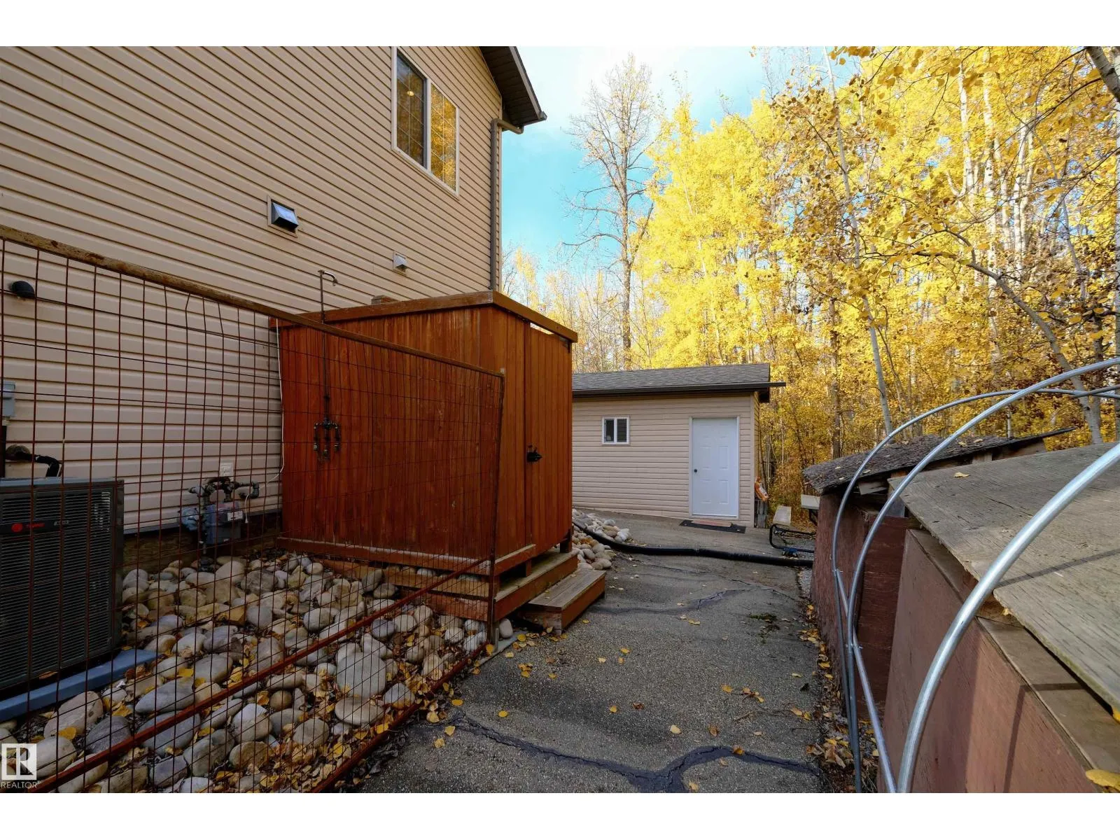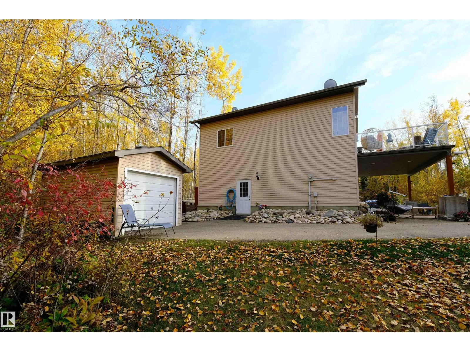 This quality-built retreat sits on a beautifully landscaped half-acre featuring a fully paved driveway. Enjoy quiet afternoons with stunning views through soaring vaulted ceilings and large windows that flood the space with light. The heated, oversized double garage is fully finished with drywall and features 8' garage doors to fit a larger vehicle or pickup. A 4-piece bathroom completes this level. Upstairs features gleaming hardwood floors, a spacious open kitchen, cozy wood-burning fireplace, two bedrooms and a full bath. A gate plus brand new chainlink fence encloses the entire property making it perfect for privacy and pets, plus there's a fire pit area. A detached shed perfect for all your toys or a workshop waiting to happen. A one-of-a-kind homestead in a welcoming rural community. Carefree country living starts here! (id:27476)