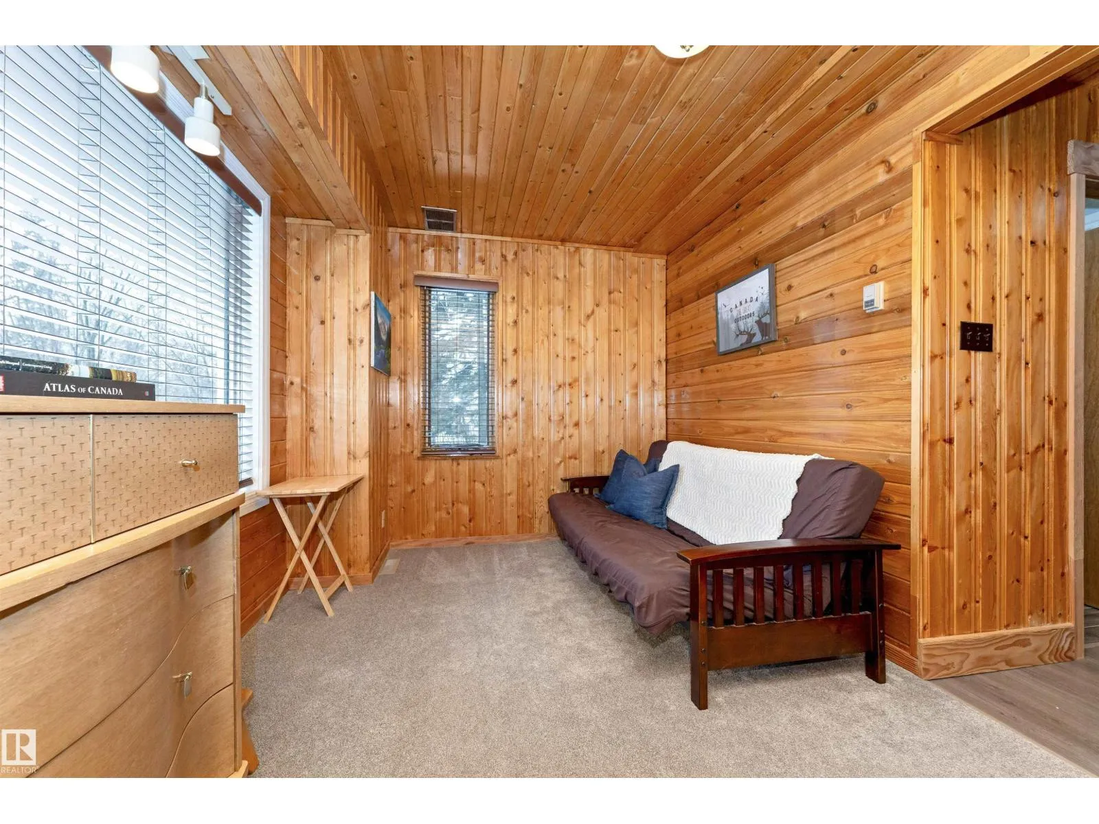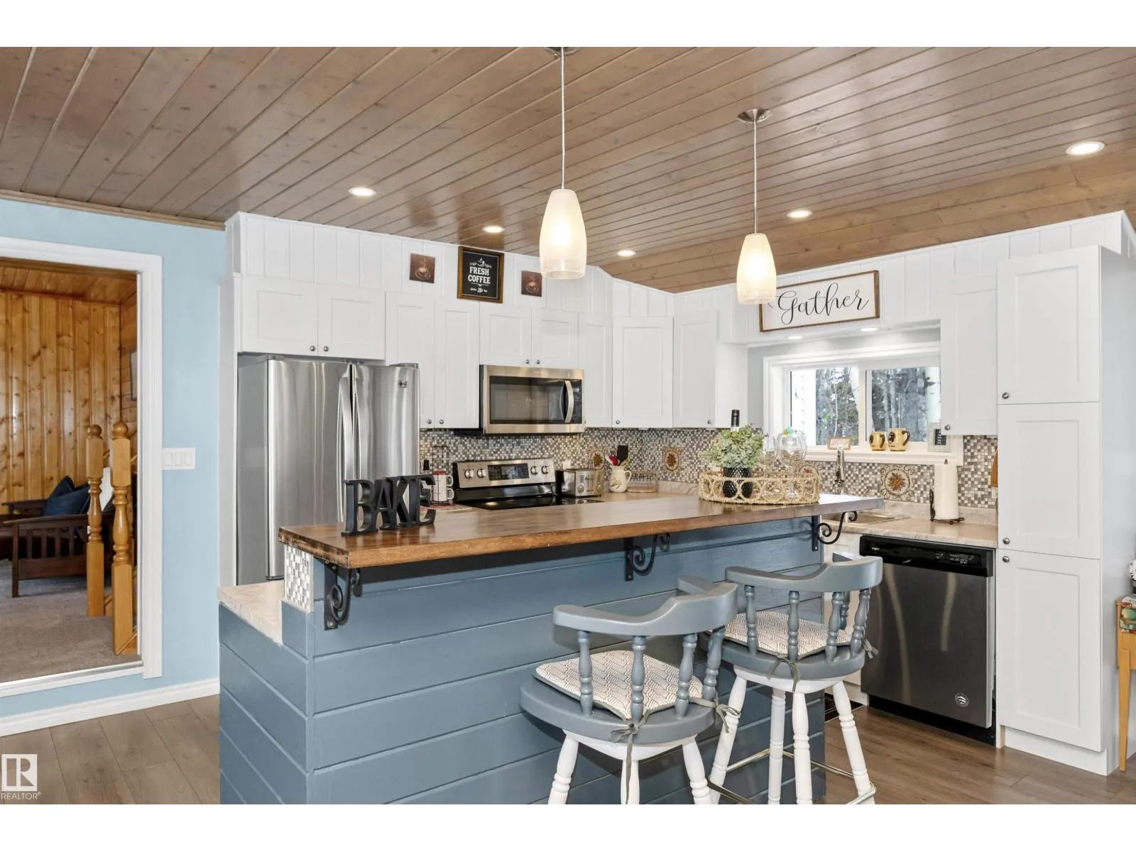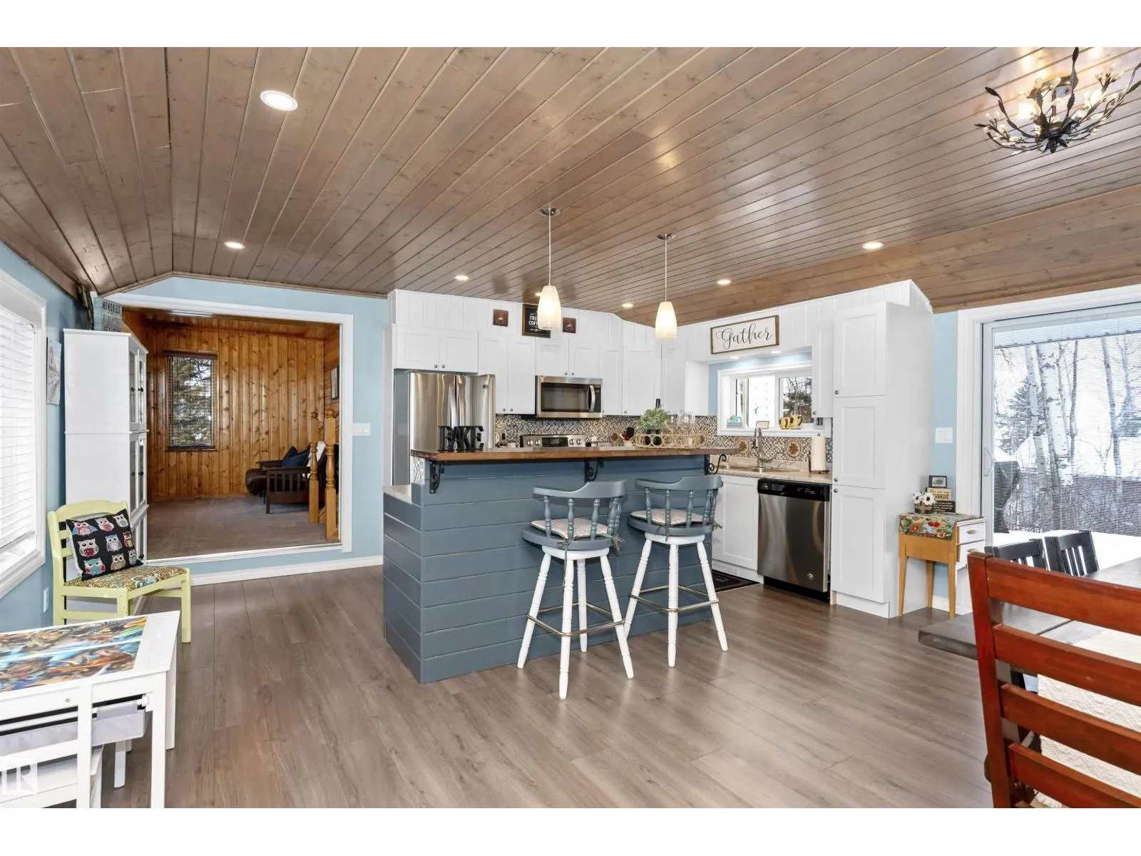 Find your year round home or relaxing get-away in your fully furnished lakeside abode. Warm inviting wood and plenty of sunshine through the numerous windows welcomes as you enter. The Living room is anchored by a stone gas fireplace that blends in with the woodsy feel. The kitchen has been redone with lots of counter space, white cupboards, S/S appliances & generous breakfast bar. Large dining area with plenty of room to entertain. One bedroom on the main level with sliding doors to the large deck. The primary bedroom has its own level with a large ensuite complete with deep tub. There is a separate den area with futon for further guests who come to visit. The home is fully emcompassed by greenery on all four sides. Tons of exterior storage & parking. This home is approx 100 meters to the lake with a dock, and boat launch! The property includes furniture, boat lift & docks. Located in the quiet community of West Cove, just 8 minutes to Darwell or 15 mins to Alberta Beach. (id:27476)