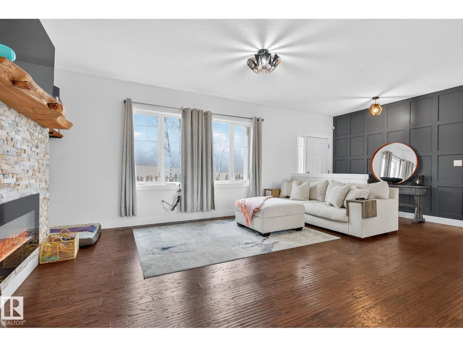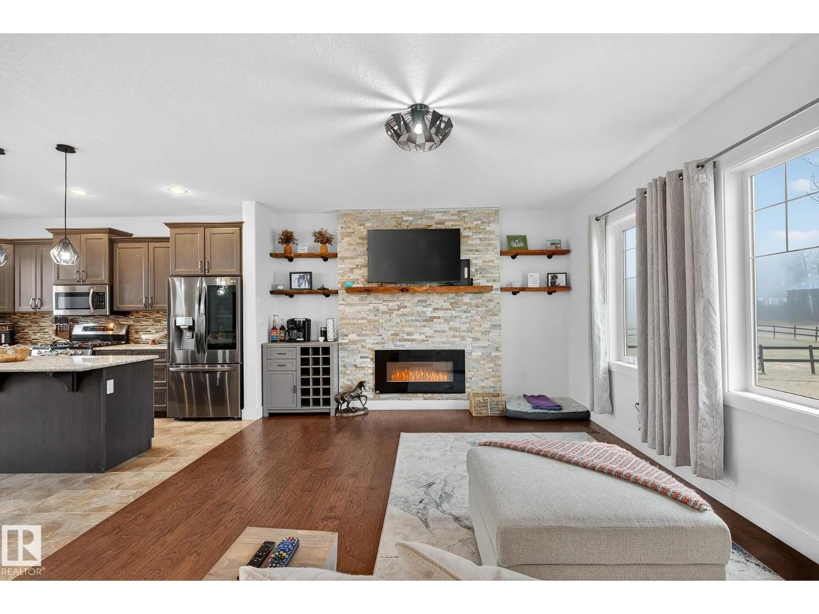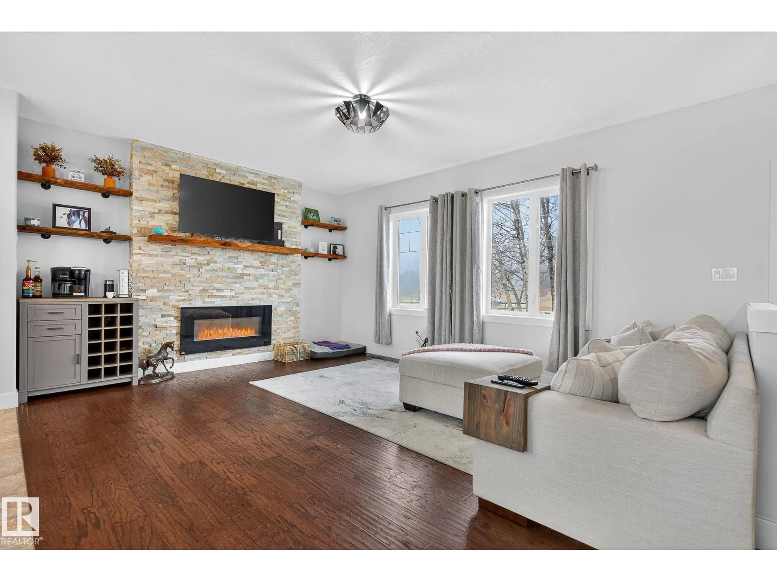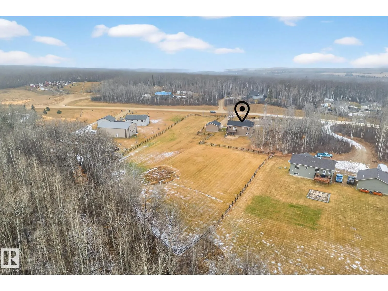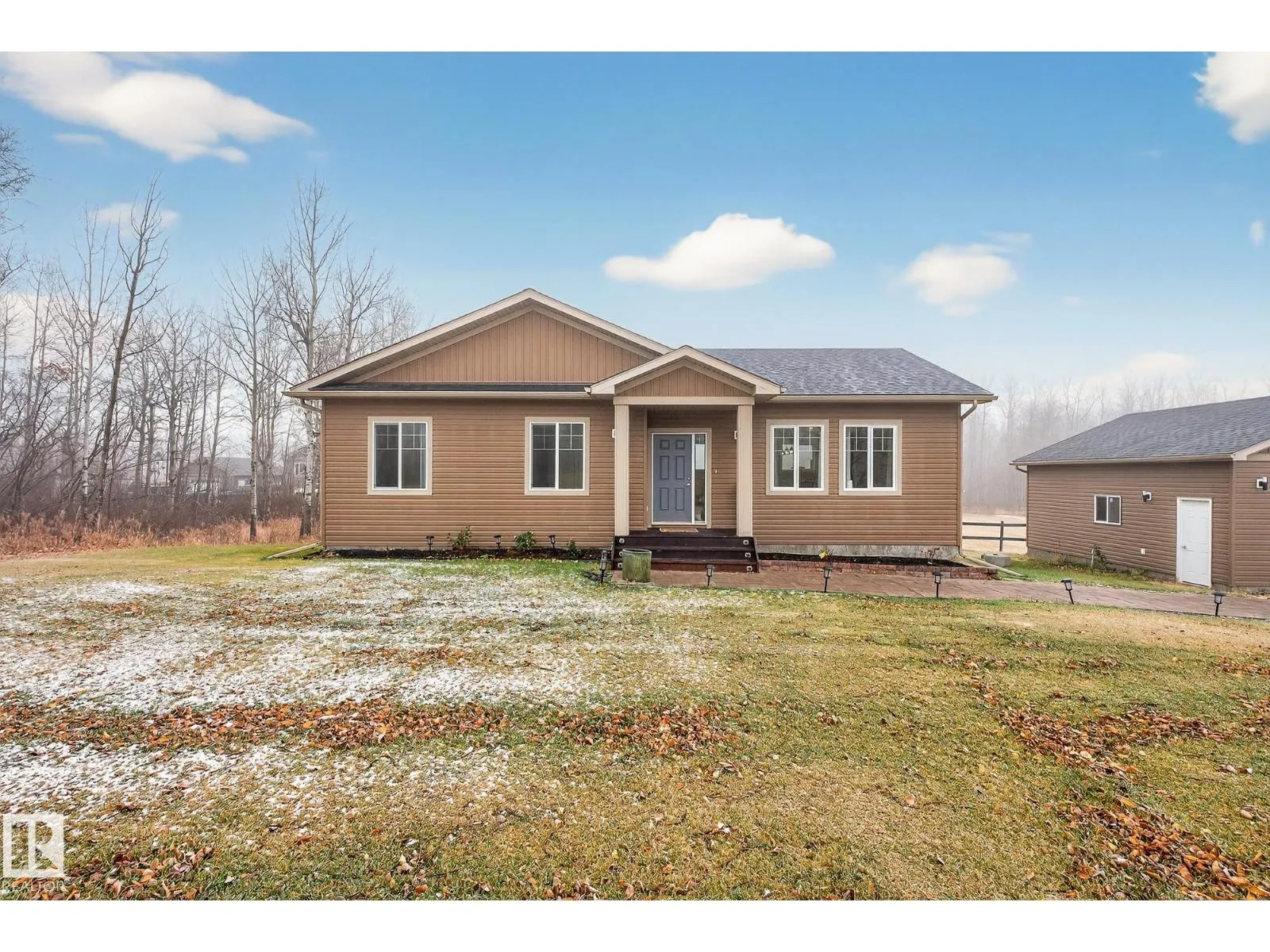 Enjoy tranquility only 10 minutes east of Onoway and 20 minutes northwest of Stony Plain with this fully finished walkout bungalow on 2+ treed acres, perfectly set up for horses. With over 2,600 sq ft of living space, this open-concept home offers 5 bedrooms, 3 full baths, a living room with stone feature wall, and a huge family room with patio doors to the walkout basement. Modern finishes include 9 ft ceilings, hand-scraped hardwood, ceramic tile, granite counters, S/S appliances, maple cabinets, and updated lighting. Upgrades include new fencing and beautiful custom gate, fridge and dishwasher, A/C and carpet (2020), new faucets, rustic shelving, fully finished basement (2023) with laminate, electric fireplace, stone accents and dimmable lighting, newer furnace (2023), washer/dryer (2021), solar exterior lights, security system, new CO2/smoke alarms, remote thermostat, south-facing yard, deck with privacy screen, new vents, fresh paint (2025), and new roof and siding on house and garage (2023). (id:27476)