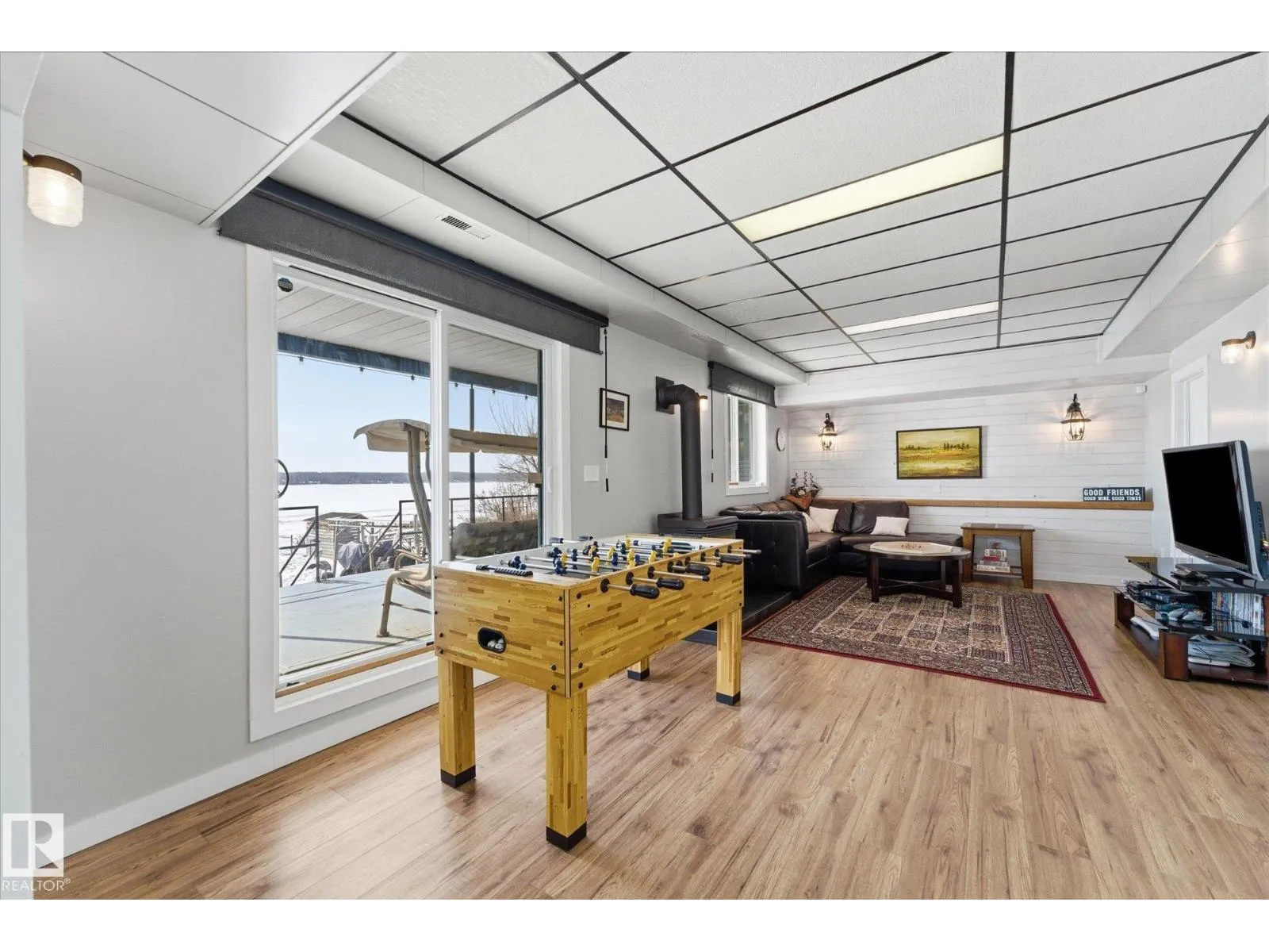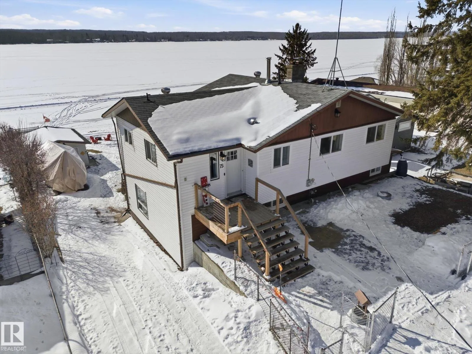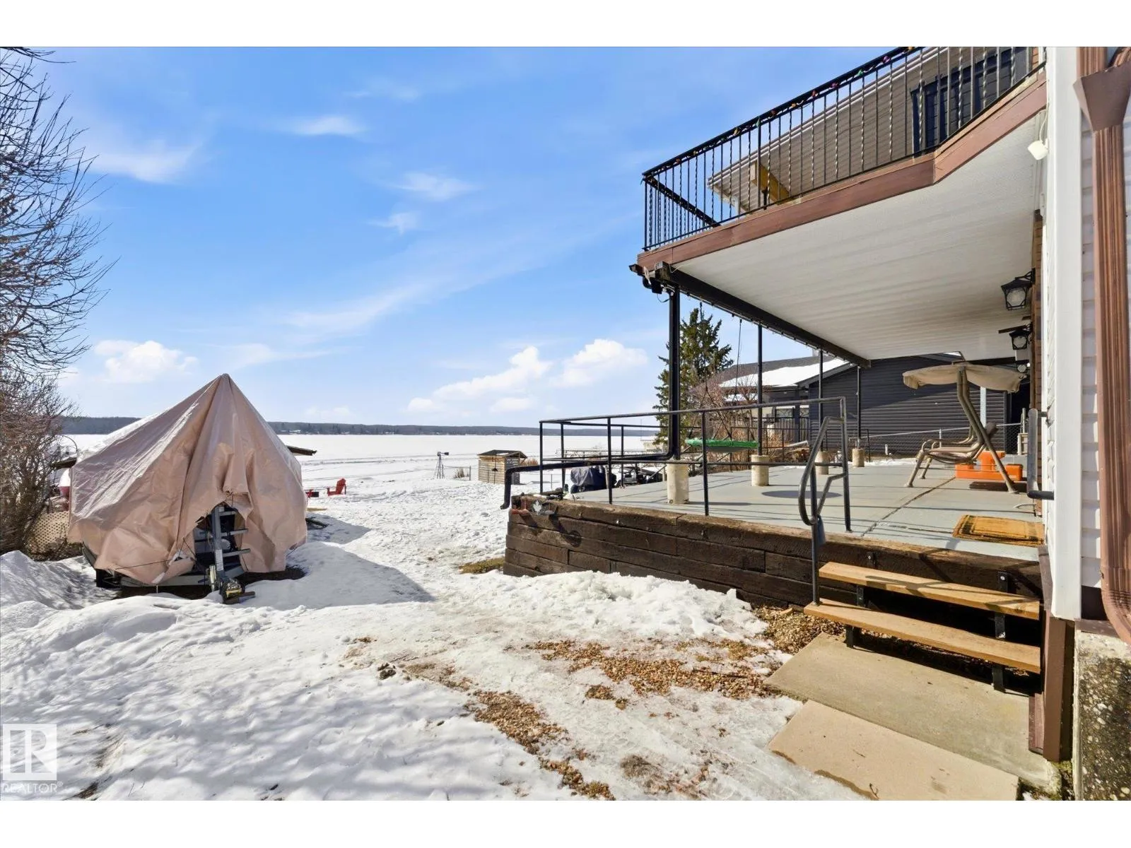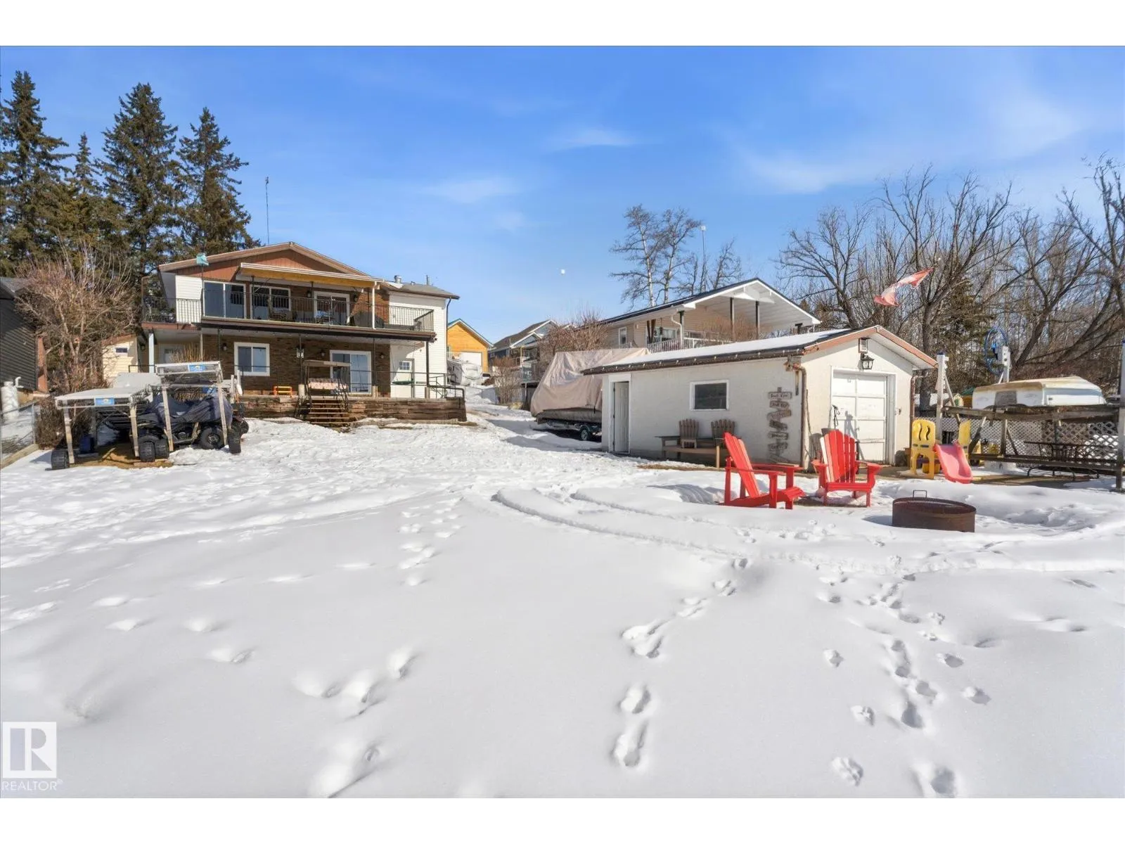 The lake place everyone wants to come back to. Full lakefront walkout bungalow on Isle Lake, set on a quiet no-through road in the Summer Village of South View. Built in 2010, the home offers two bright, lake-facing gathering areas with large windows, giving extended family & guests both connection & separation. With three bedrooms plus a separate four-season flex room (approx. 110â120 sq. ft. with its own exterior access), thereâs room for family & guests. Covered outdoor spaces on both levelsâa spacious upper deck & fully covered lower patioâextend your time outside in changing weather, while the walkout basement provides direct lake access. The fenced yard adds peace of mind, & the detached drive-through garage functions as a boathouse with overhead doors at both ends. An improved shoreline enhances usability & long-term enjoyment. Located in a well-run community with a park, playground, & boat launch, where lake life stretches from summer days on the water to winter skating & sunset evenings. (id:27476)