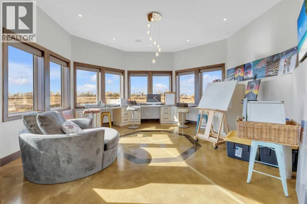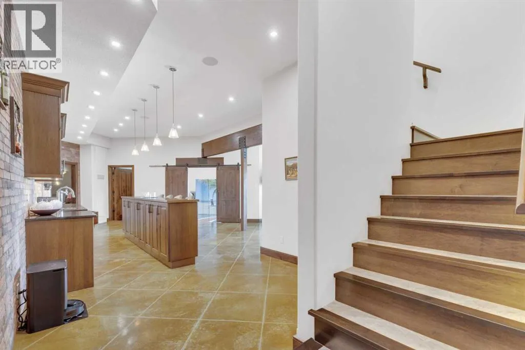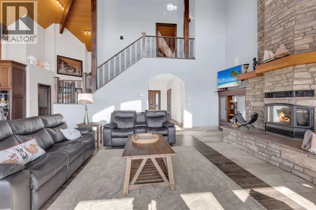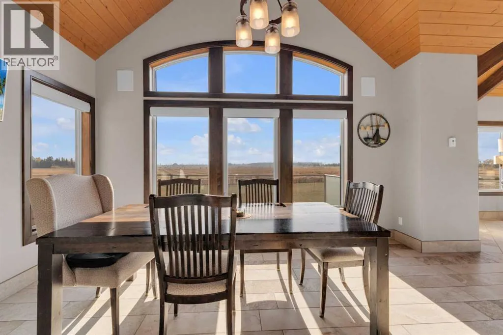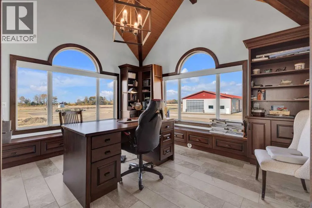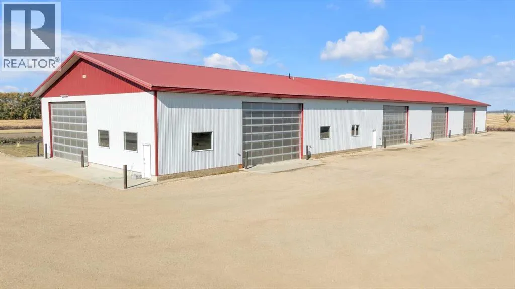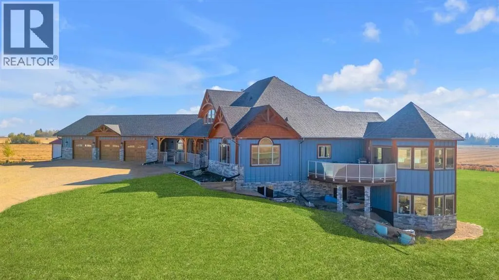 This estate presents the rare combination every buyer hopes to find: an architecturally stunning home, a fully equipped commercial grade shop, and nearly 100 acres of productive farmland, all crafted to exceptional standards. Construction began in 2014, with the home progressing through a meticulous multi year build and receiving full compliance and occupancy approval in 2017. Offering over 6,850 sq ft of refined living space (3,687 sq ft above grade + 3,163 sq ft below), this custom Linwood Homes estate provides privacy, accessibility, and rural serenity just minutes from Red Deer, Lacombe, Sylvan Lake, and the QE2. Inside, rich cherrywood cabinetry, beams, intricate tilework, and 27 foot vaulted ceilings define the warm, luxurious atmosphere. The gourmet kitchen offers quartz counters, built in Miele appliances, LED lighting, and a large walk in pantry. Triple pane windows frame expansive views, while the living roomâs stone surrounded woodstove and the family roomâs gas fireplace create inviting gathering spaces. The primary suite features a spa inspired ensuite with steam shower, infrared sauna, dual sinks, and a large walk in closet. Additional bedrooms, a den, and a walkout basement with theater room and gym enhanced by fully insulated interior walls offer exceptional versatility. The lower level showcases polished concrete floors and a custom bar with cooled wine storage and beer tap, flowing to a lounge with gas fireplace and a covered patio. Two offices, a luxury laundry room, and a second garage entry laundry add convenience. The newly resurfaced main deck (2025; $23,500) and infinity swim spa maximize outdoor enjoyment. Comfort is ensured with three A/C units, two boilers, forced air, in floor heat, RO water system, spray foam insulation, and full weeping tile. Exterior features include cedar soffits and beams, board and batten siding, and Lindab steel eavestroughs. A 19 kW solar array (47 panels) significantly offsets utility costs. The heated 45'Ã29' at tached garage provides ample space. The 250'Ã60' industrial grade shop offers 18 ft ceilings, reinforced concrete, a 72 ft heated section with in floor heat, 2 post lift, five 16'Ã24' doors, an 18'Ã40' hangar door, full kitchen/staff room, sump, LED lighting, filtration, R60 insulation, and buried air and water lines. Set on 98.28± acres with 86± acres of #2 cropland, the property also includes a 1.42 acre surface lease ($3,900/yr), six 5,000 bushel grain bins, four hydrants, separate septic systems for the house and shop, and a second serviced homesite, an exceptional blend of beauty, function, and long term legacy. (id:27476)