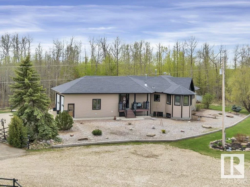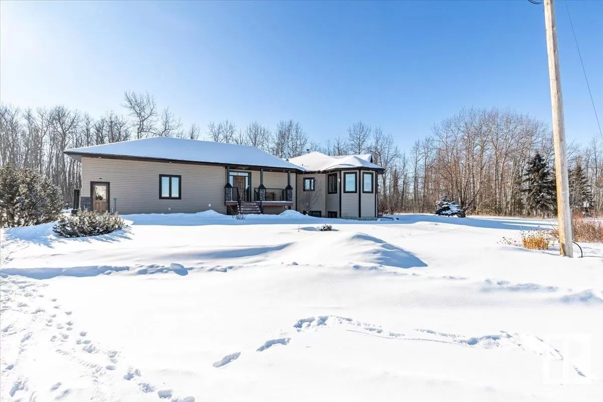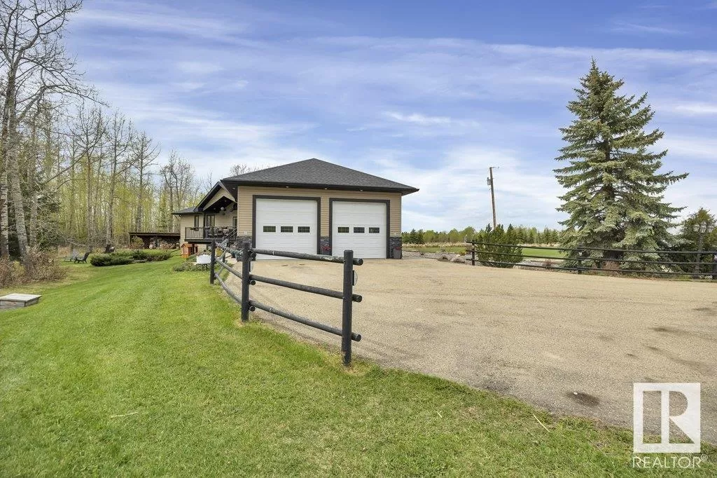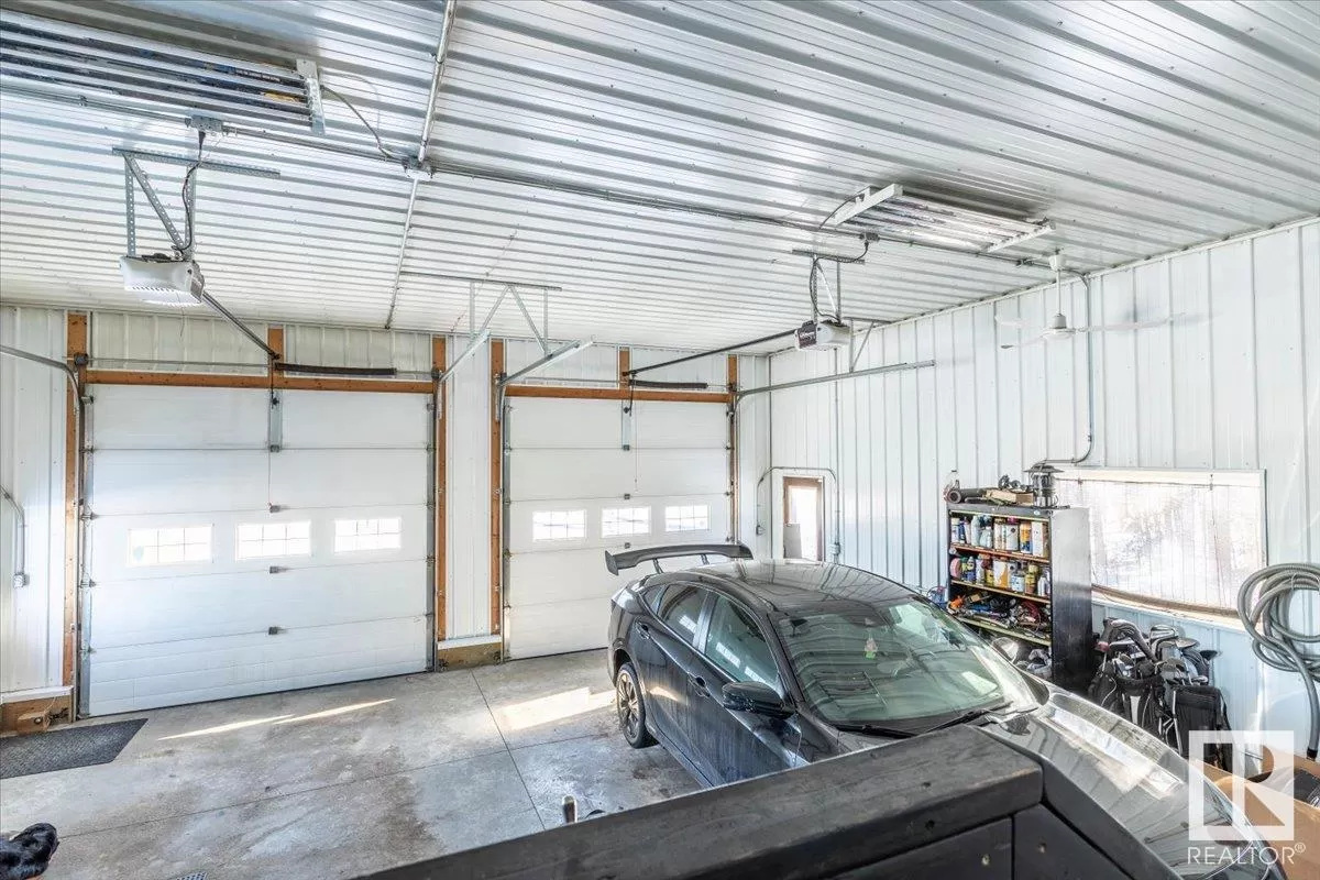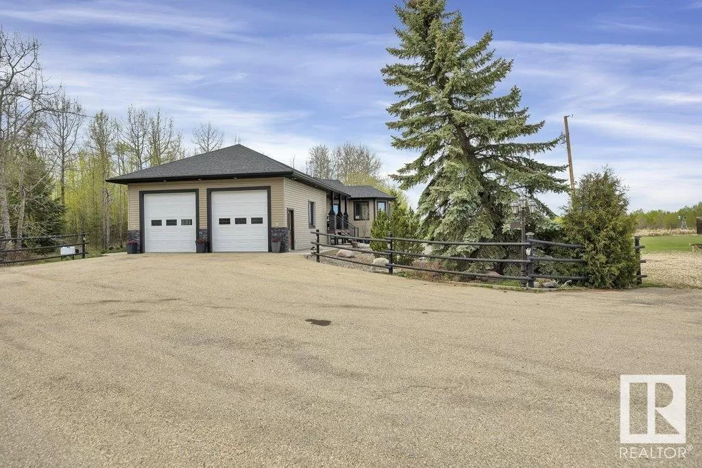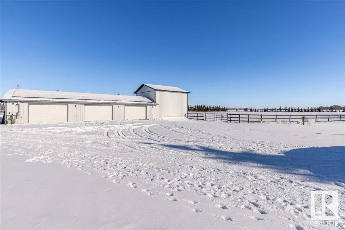 70.36 acres with a Gorgeous custom built 2088sq/ft home. ICF construction from basement to roof. Power gate at the entrance with trees along the driveway keeping the property private. The house has a Double Attached Garage that is metal cladded inside, tall ceilings, cement floor, and in-floor heat. The main floor has an open concept Kitchen, Living Room, and Dining Room with beautiful pine log finishing, vaulted ceiling, and lots of windows for natural light. Two bedrooms are also on the main floor, including the primary with its own 5 piece ensuite bathroom and walk-in closet. A Den/Office, 4 piece bathroom, Pantry, and Laundry room conclude the Main floor. The basement has in-floor heat, 3 bedrooms, a rec room, gym, 3 piece bathroom, storage room, and a family room with a wet bar. Also on the property is a fully finished workshop with 3 overhead doors, in-floor heat, and has solar panels. Fenced and cross fenced with water and shelter for animals. Good farmland currently in hay. (id:27476)