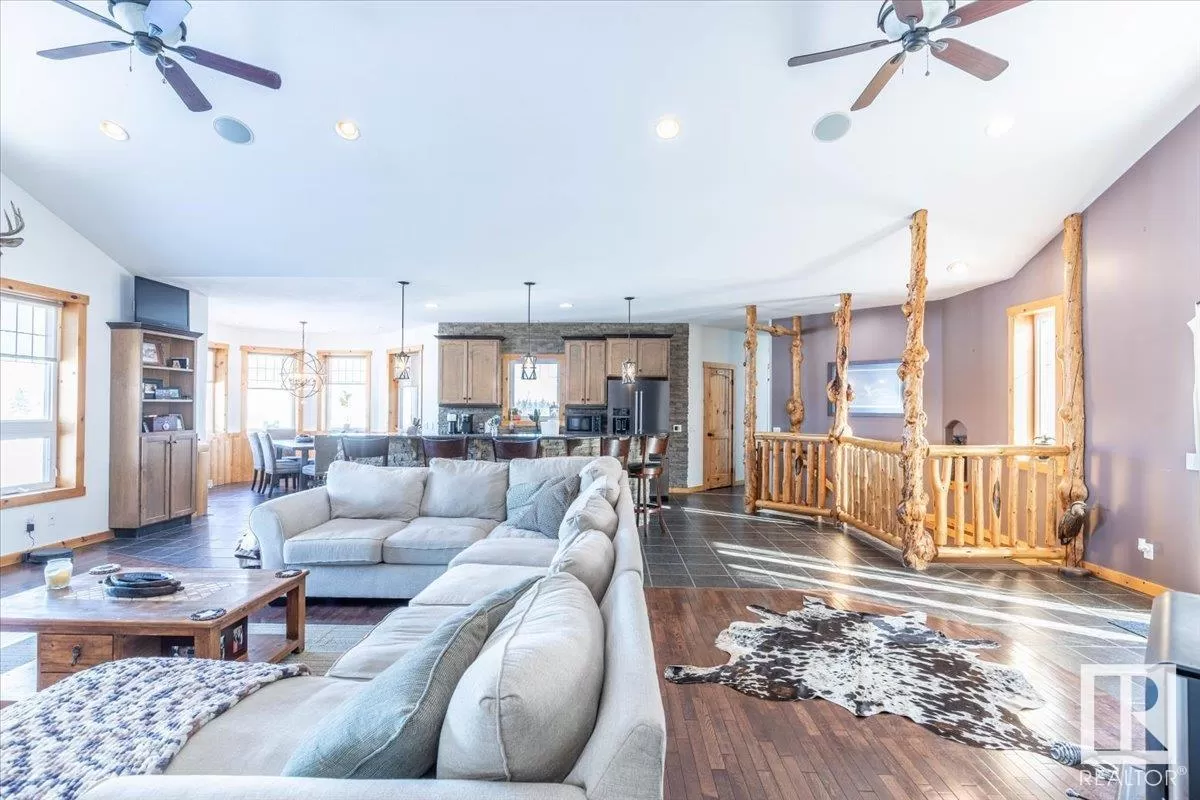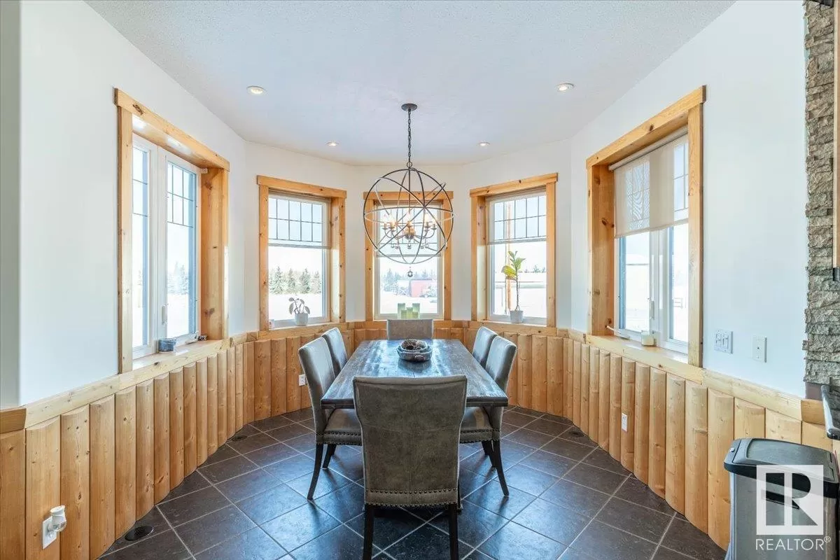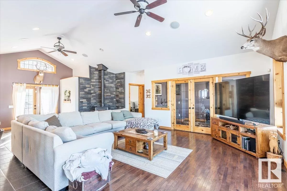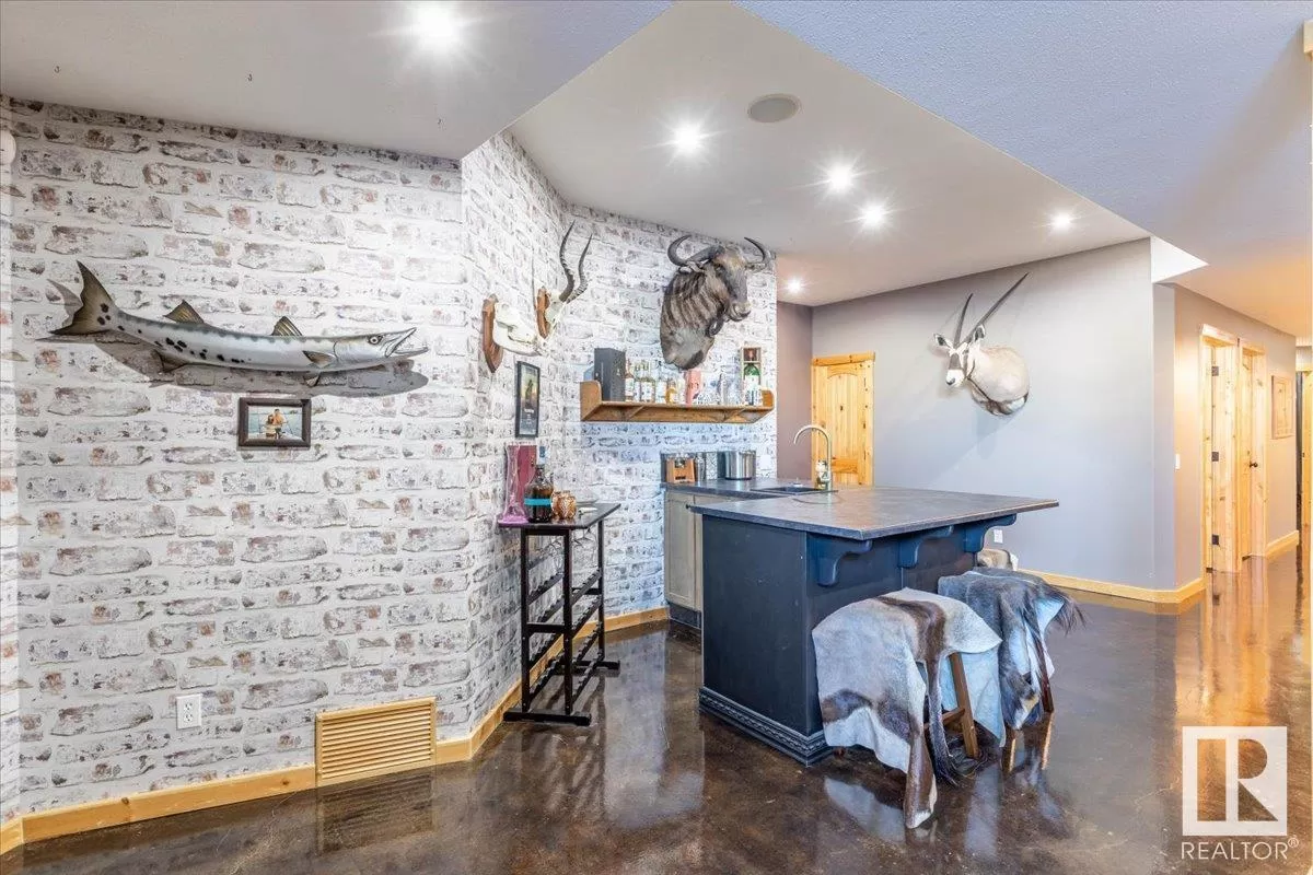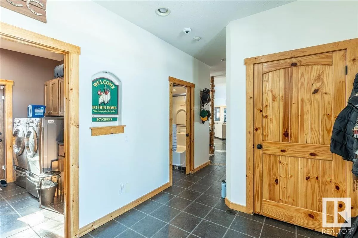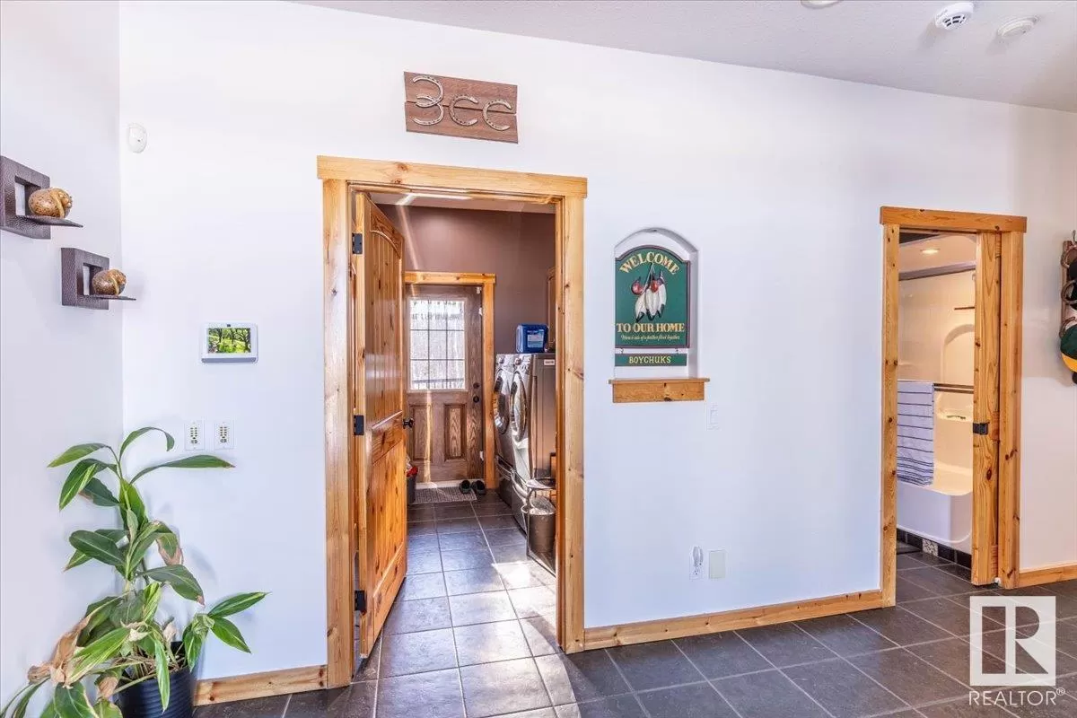 70.36 acres with a Gorgeous custom built 2088sq/ft home. ICF construction from basement to roof. Power gate at the entrance with trees along the driveway keeping the property private. The house has a Double Attached Garage that is metal cladded inside, tall ceilings, cement floor, and in-floor heat. The main floor has an open concept Kitchen, Living Room, and Dining Room with beautiful pine log finishing, vaulted ceiling, and lots of windows for natural light. Two bedrooms are also on the main floor, including the primary with its own 5 piece ensuite bathroom and walk-in closet. A Den/Office, 4 piece bathroom, Pantry, and Laundry room conclude the Main floor. The basement has in-floor heat, 3 bedrooms, a rec room, gym, 3 piece bathroom, storage room, and a family room with a wet bar. Also on the property is a fully finished workshop with 3 overhead doors, in-floor heat, and has solar panels. Fenced and cross fenced with water and shelter for animals. Good farmland currently in hay. (id:27476)