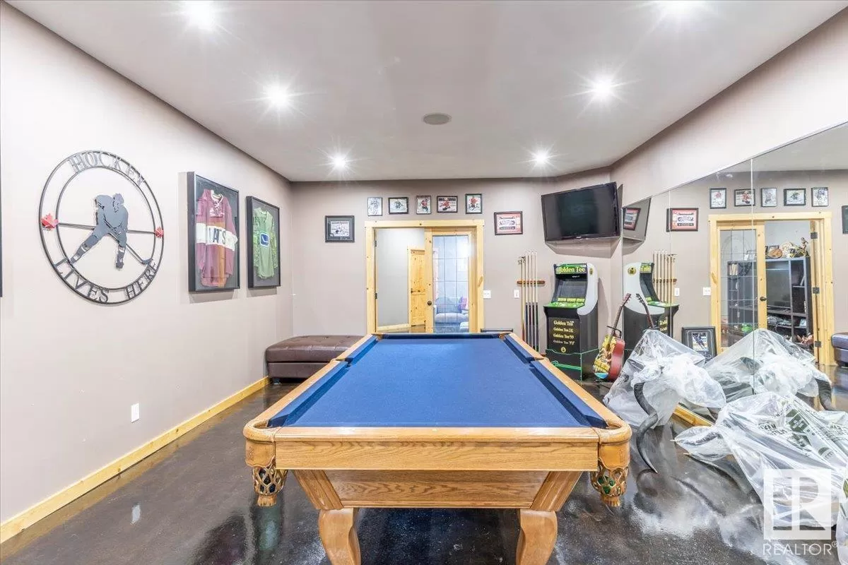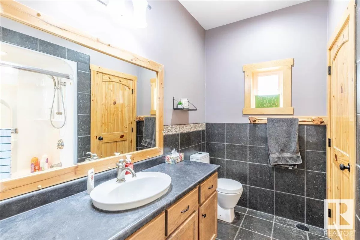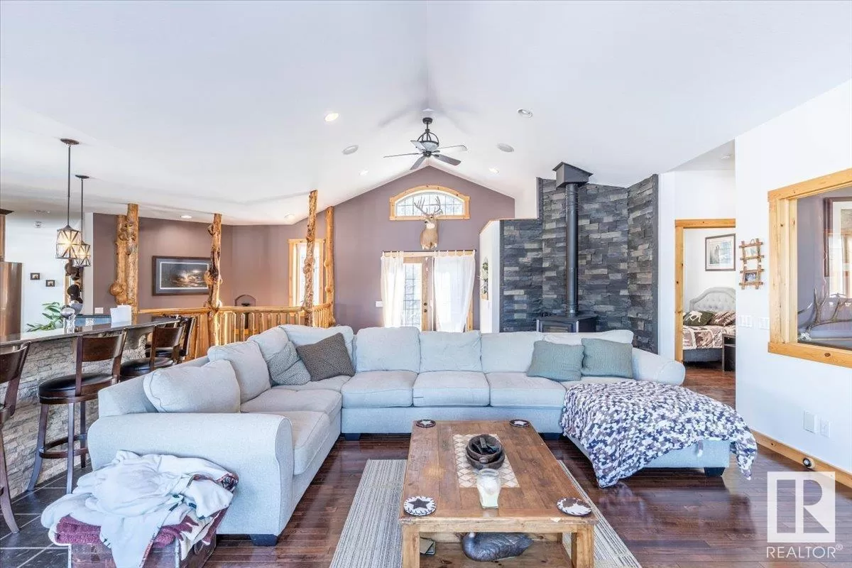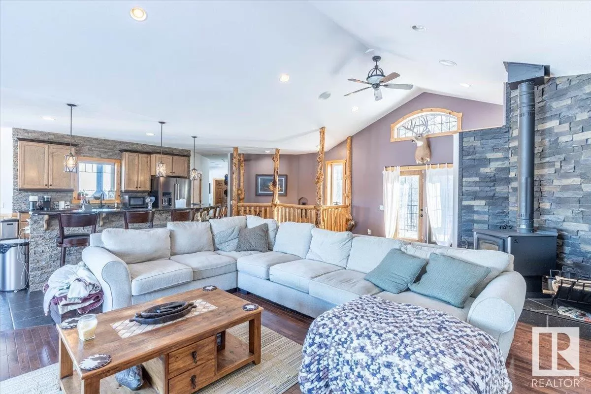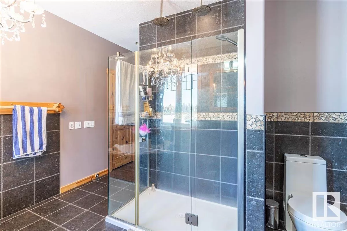 70.36 acres with a Gorgeous custom built 2088sq/ft home. ICF construction from basement to roof. Power gate at the entrance with trees along the driveway keeping the property private. The house has a Double Attached Garage that is metal cladded inside, tall ceilings, cement floor, and in-floor heat. The main floor has an open concept Kitchen, Living Room, and Dining Room with beautiful pine log finishing, vaulted ceiling, and lots of windows for natural light. Two bedrooms are also on the main floor, including the primary with its own 5 piece ensuite bathroom and walk-in closet. A Den/Office, 4 piece bathroom, Pantry, and Laundry room conclude the Main floor. The basement has in-floor heat, 3 bedrooms, a rec room, gym, 3 piece bathroom, storage room, and a family room with a wet bar. Also on the property is a fully finished workshop with 3 overhead doors, in-floor heat, and has solar panels. Fenced and cross fenced with water and shelter for animals. Good farmland currently in hay. (id:27476)