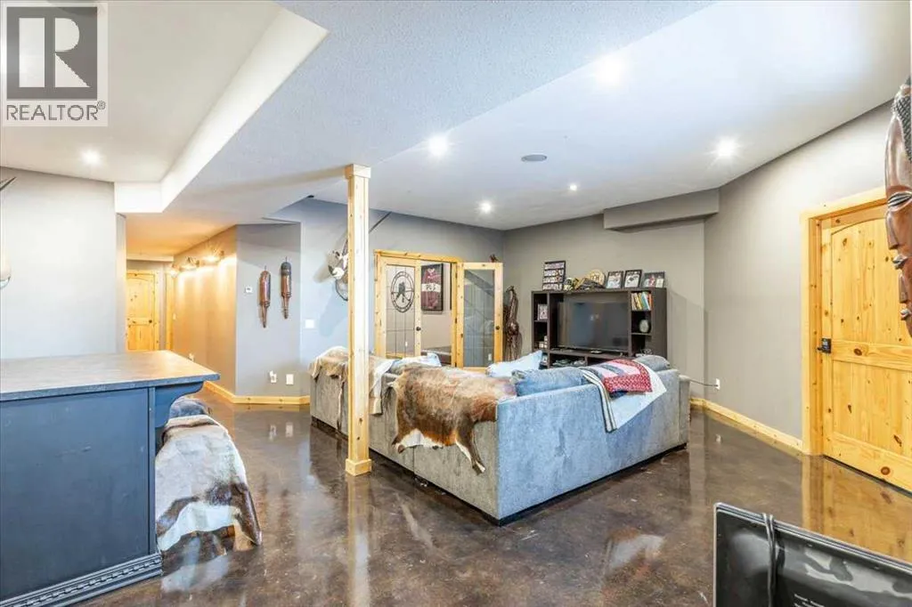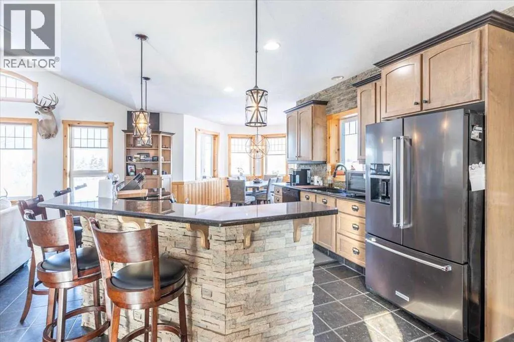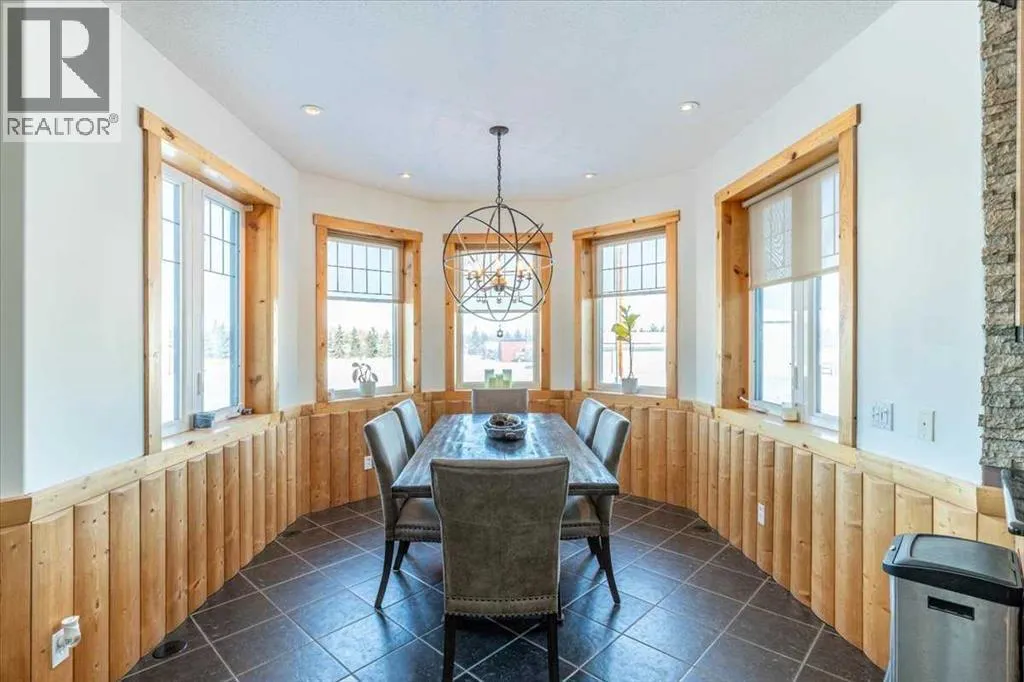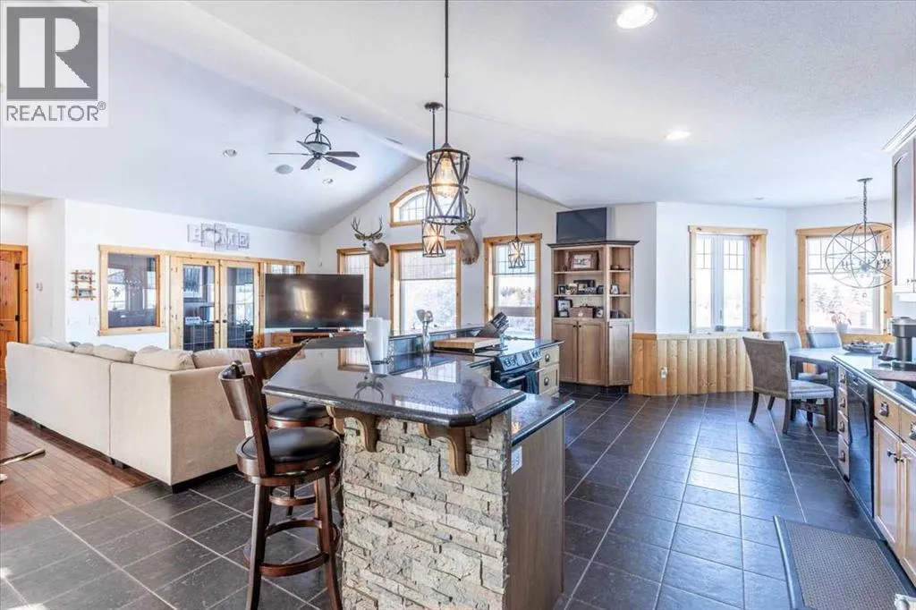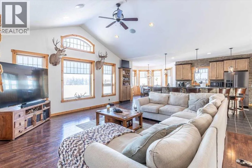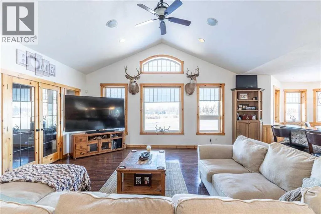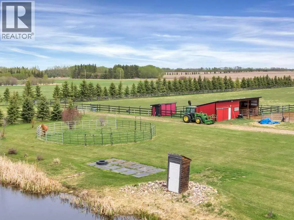 70.36 acres with a Gorgeous custom built 2088sq/ft home. ICF construction from basement to roof. Power gate at the entrance with trees along the driveway keeping the property private. The house has a Double Attached Garage that is metal cladded inside, tall ceilings, cement floor, and in-floor heat. The main floor has an open concept Kitchen, Living Room, and Dining Room with beautiful pine log finishing, vaulted ceiling, and lots of windows for natural light. Two bedrooms are also on the main floor, including the primary with its own 5 piece ensuite bathroom and walk-in closet. A Den/Office, 4 piece bathroom, Pantry, and Laundry room conclude the Main floor. The basement has in-floor heat, 3 bedrooms, a rec room, gym, 3 piece bathroom, storage room, and a family room with a wet bar. Also on the property is a fully finished workshop with 3 overhead doors, in-floor heat, and has solar panels. Fenced and cross fenced with water and shelter for animals. Good farmland currently in hay. (id:27476)