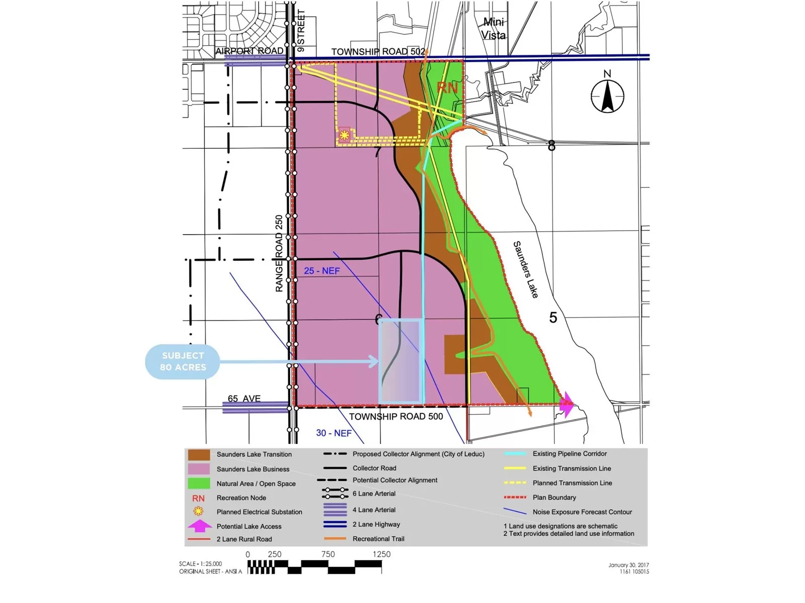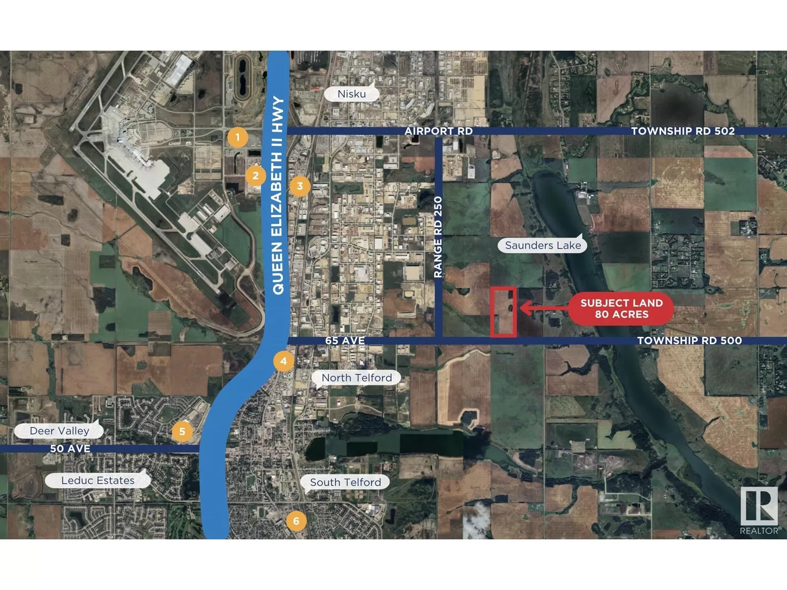 80 Acres. Located in the Northwest Saunders Lake Local Area Structure Plan (LASP).Great proximity to water pipeline, 240V Transmission Lines and three (3) phase power. Artificial Intelligence, Datacentre, Crypto Mining potential with possible access to nearby transmission lines. Located south of Nisku Business Park Five minute drive to Edmonton International Airport, and adjacent to Leduc city limits. Municipality: Leduc County, Alberta, Short Legal: 4,24,50,6 SE: Zoning: AG (Agriculture). Selling land value only. Buyer's to confirm information during their due diligence. (id:27476)