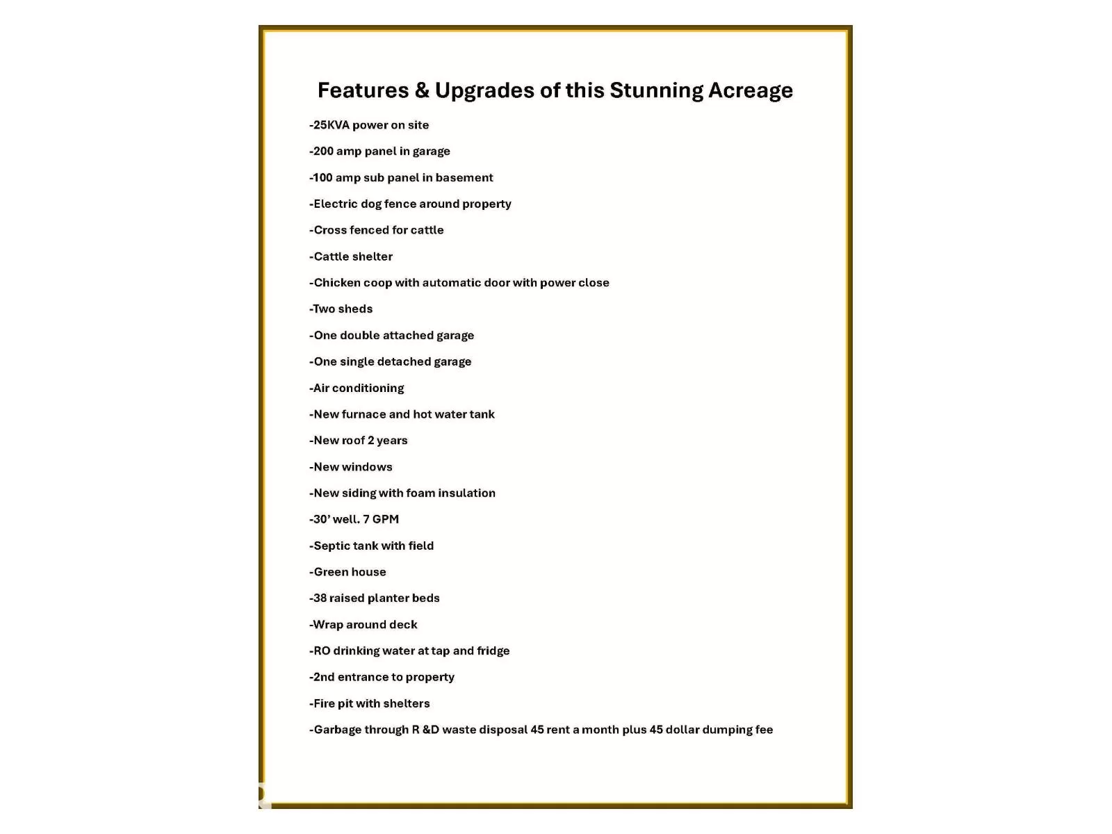 Beautifully renovated home on 6.57 acres with all paved roads leading to this amazing location. This home features 3 bedrooms on main floor and 1 in the basement. The bright kitchen flows into the dining room and up to the spacious living room. This home has many features and upgrades, 25KVA transformer on site, 200 amp panel in garage, cross fenced for cattle and horses, chicken coop automatic door, air conditioning, new furnace, new hot water tank, new roof, new windows, siding with foam insulation, 30' well, 7GPM septic tank with field, RO drinking water at tap and fridge. Outside garden has 30+ raised planter boxes, 2 sheds and so much more. Many mature trees that offer privacy and shade. This is country living at its finest (id:27476)