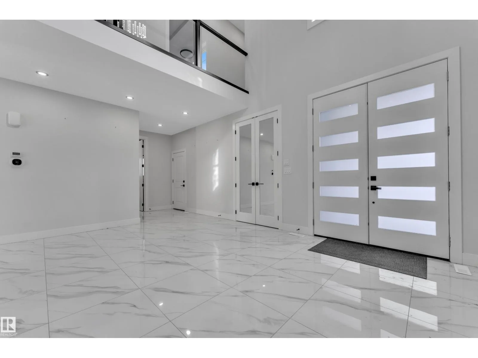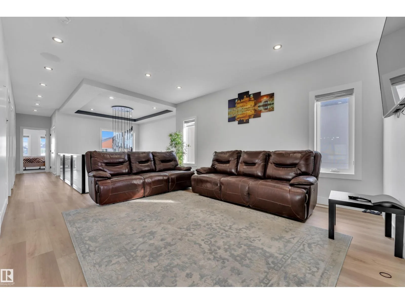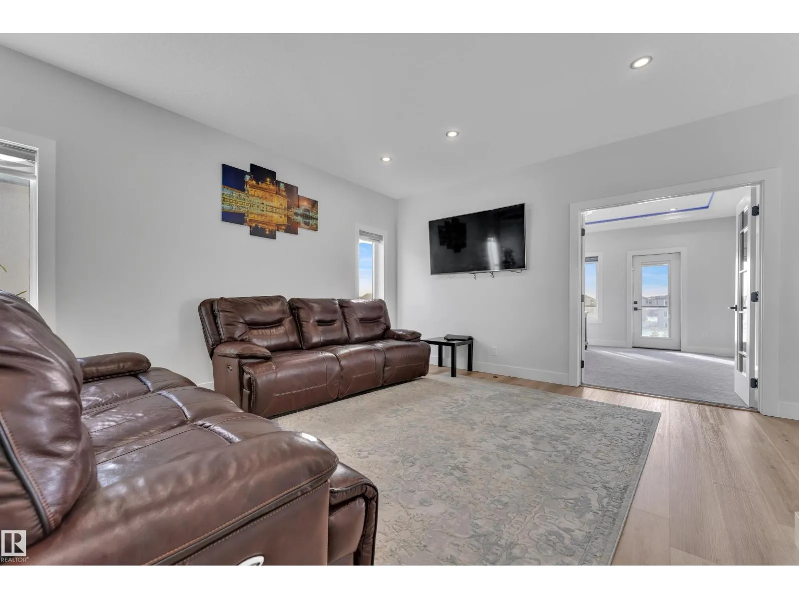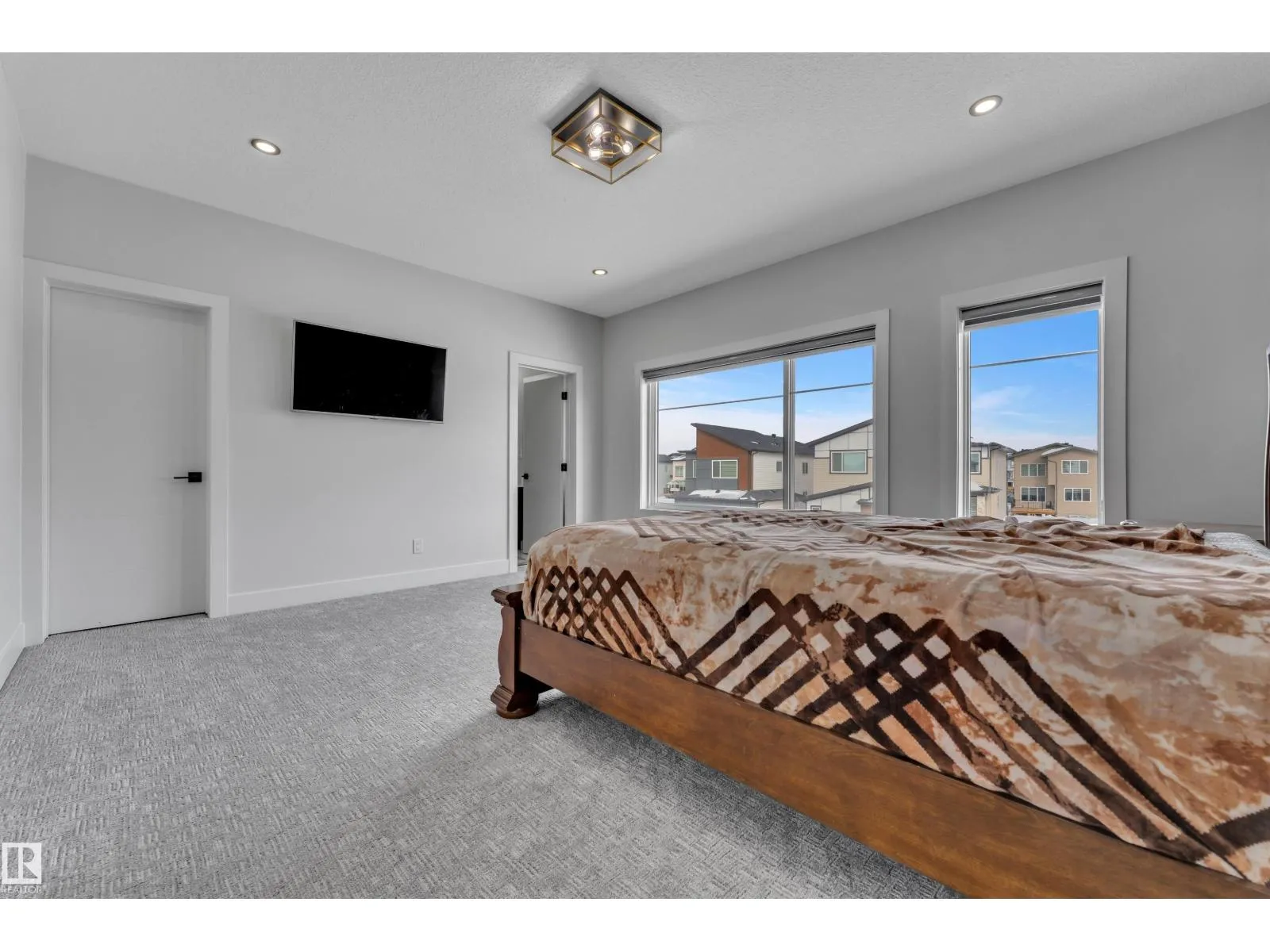 This stunning triple-car garage home sits on a premium 34 ft pocket lot with an exposed driveway. This impressive residence showcases a bright and functional layout designed for modern living.Step through the grand double-door entry into a breathtaking open-to-above foyer that flows into a spacious living area featuring a sleek fireplace and large windows that capture picturesque pond views. The chef-inspired kitchen is beautifully appointed with stainless steel appliances, granite countertops, a central island, and a separate spice kitchen, perfect for everyday cooking and entertaining.The main floor bedroom with a full bath provides a convenient space for guests or extended family. Upstairs, youâll find two luxurious primary suites with private ensuites, along with two additional bedrooms connected by a shared bath and a versatile bonus room ideal for a family lounge, office, or play area. A private balcony off the primary suite overlooks the tranquil pond, creating the perfect retreat. (id:27476)